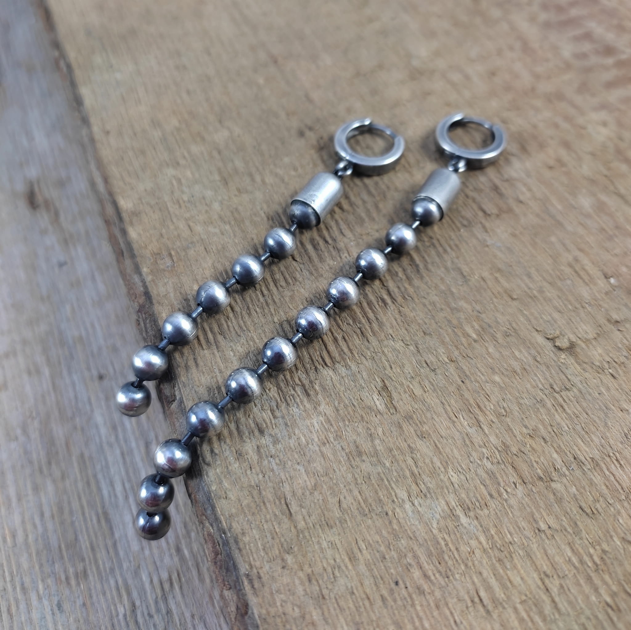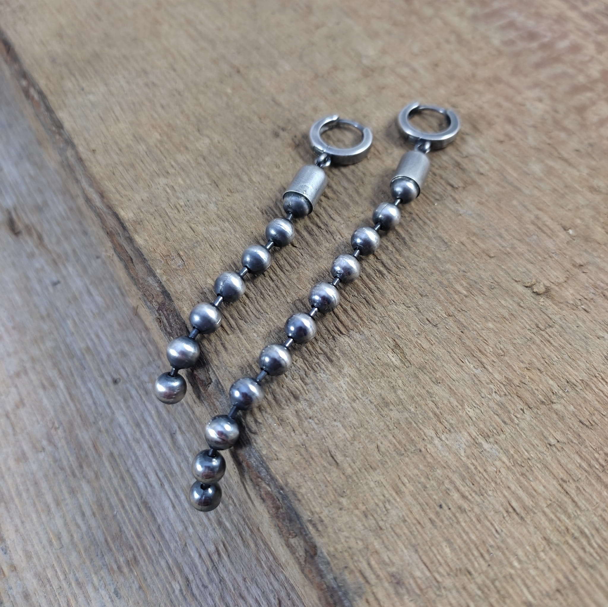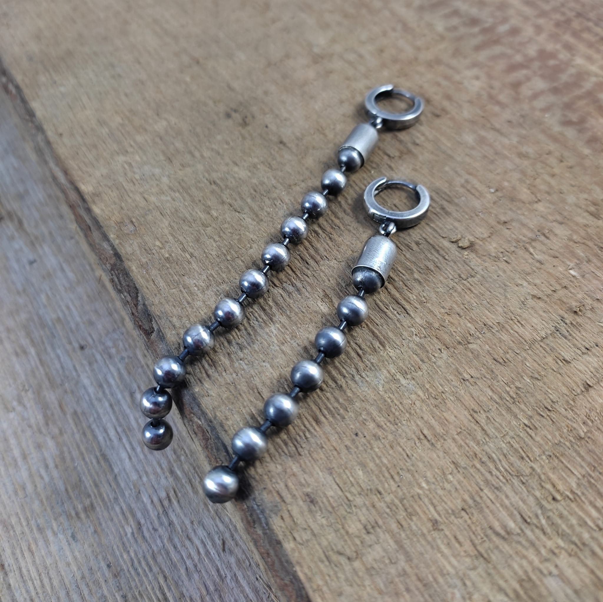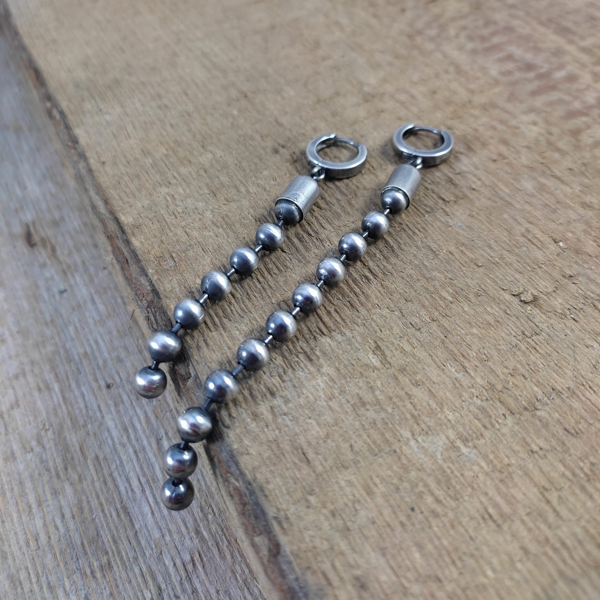 Kolczyki wykonane ze srebra 925, oksydowanego i wypolerowanego. Całkowita długość kolczyków wynosi ok. 7 oraz 9,5 cm (asymetryczne). Wielkość kul 5 mm.