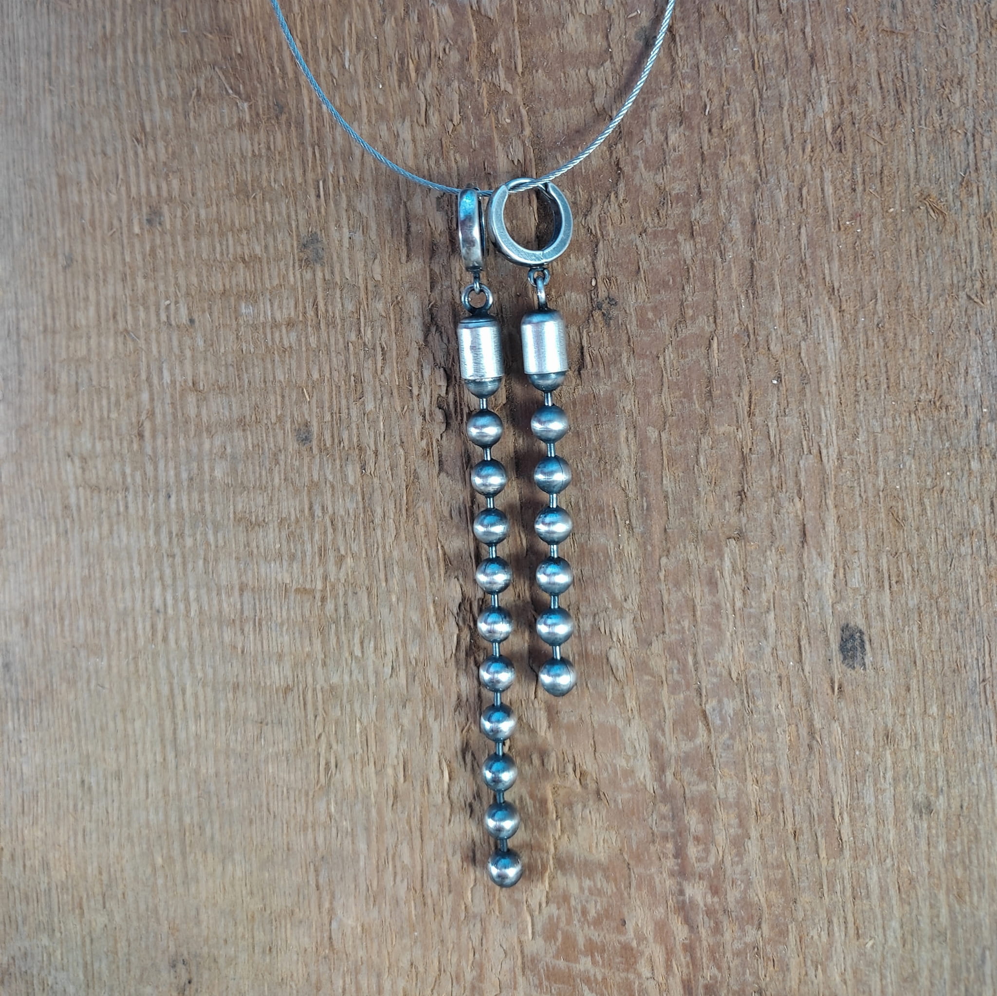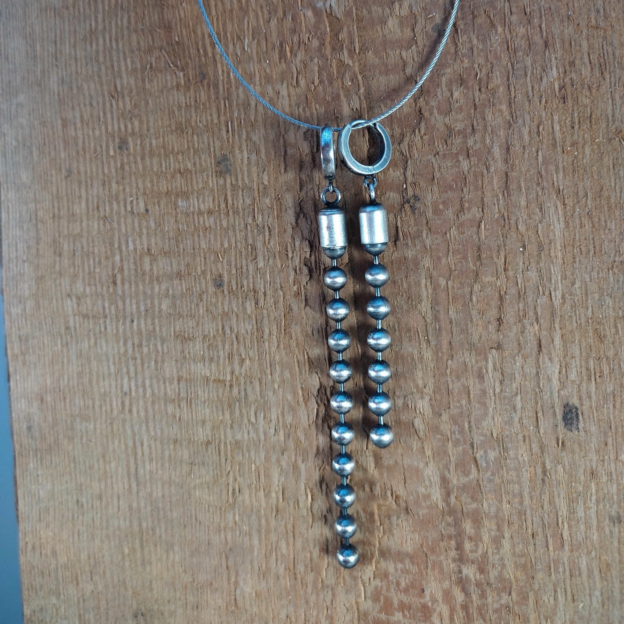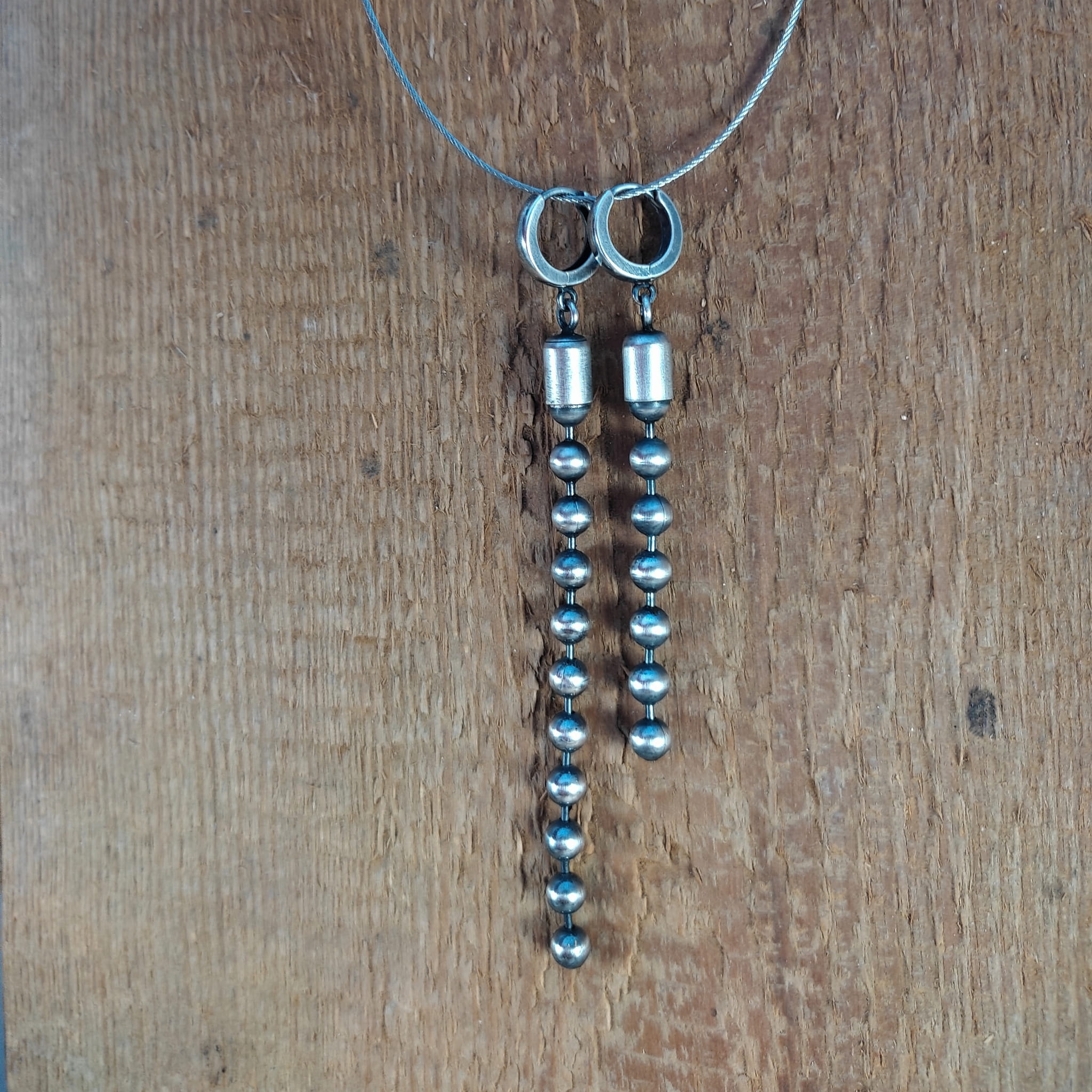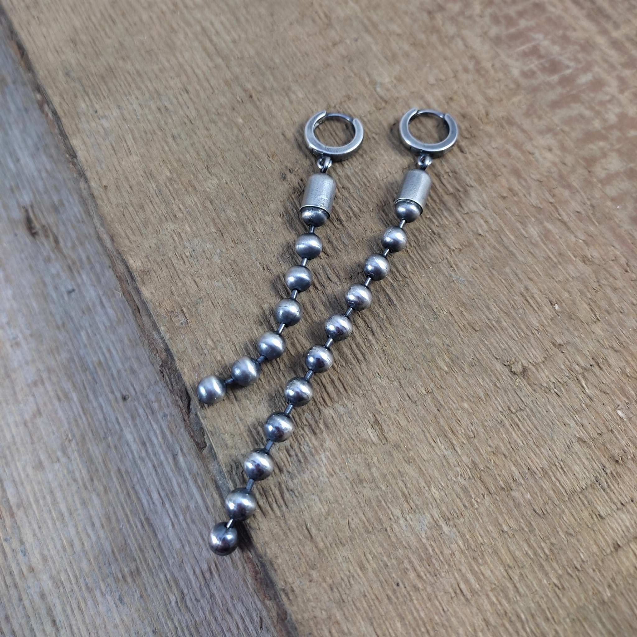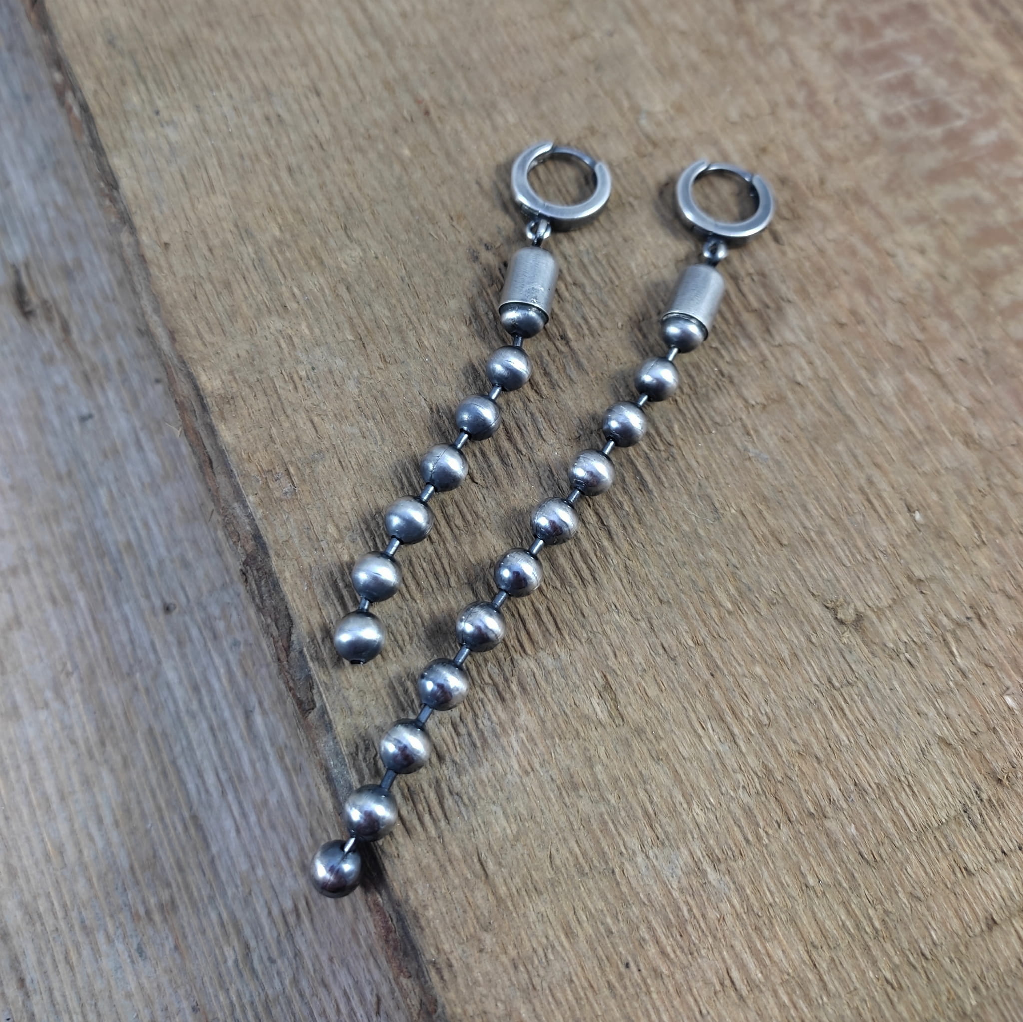 Kolczyki wykonane ze srebra 925, oksydowanego i wypolerowanego. Całkowita długość kolczyków wynosi ok. 7 oraz 9,5 cm (asymetryczne). Wielkość kul 5 mm.