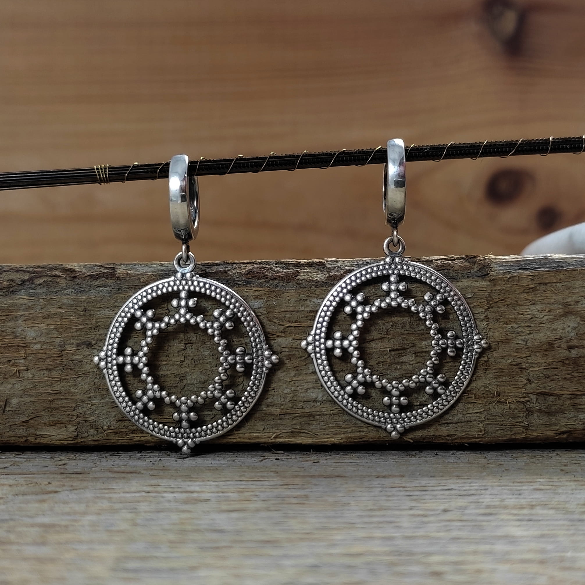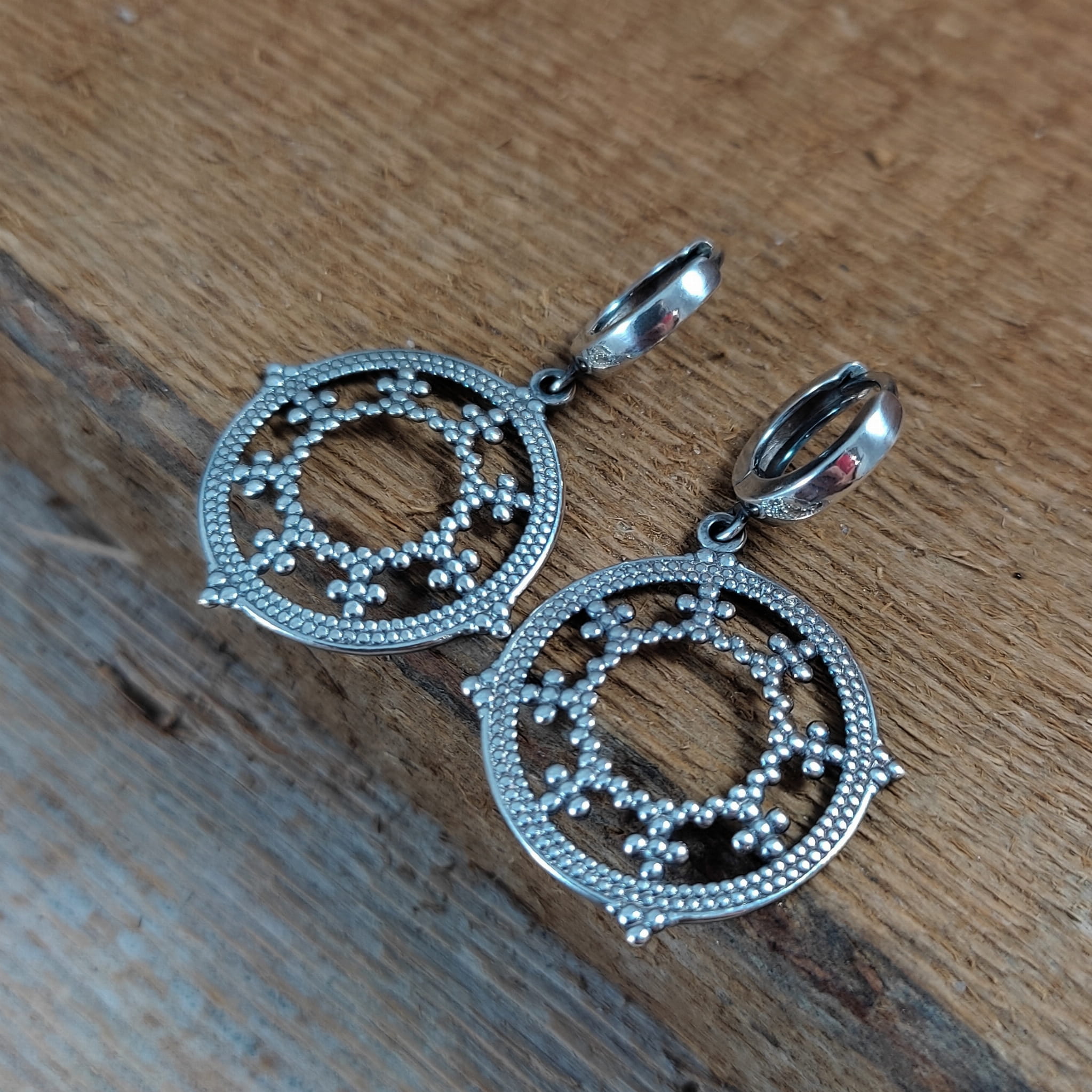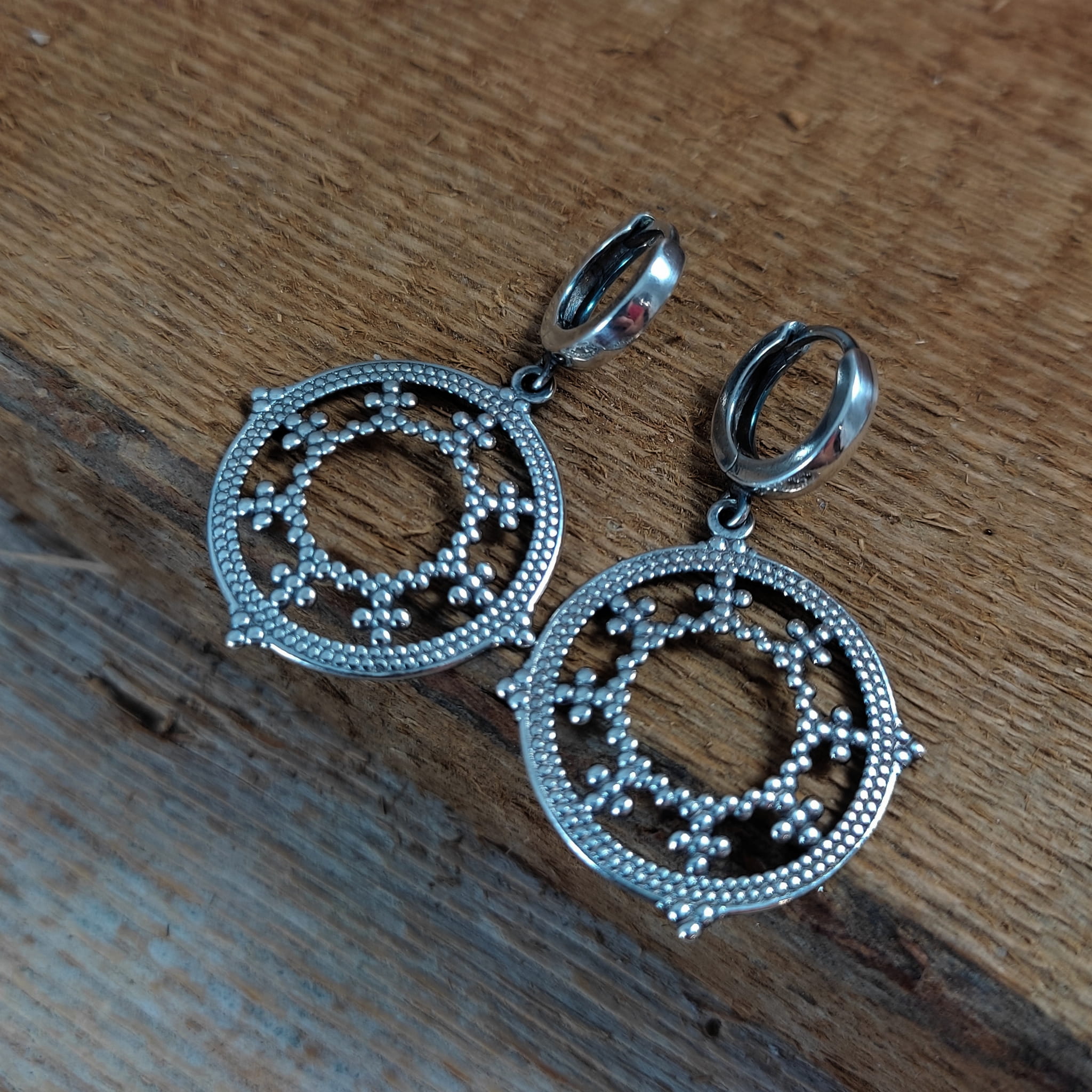 Kolczyki wykonane ze srebra 925, oksydowanego i wypolerowanego. Długość całkowita kolczyków wynosi ok. 4 cm. Wielkość blaszki ażurowej 26,0/24,7/0,7 mm. Elegancko zapakowane.