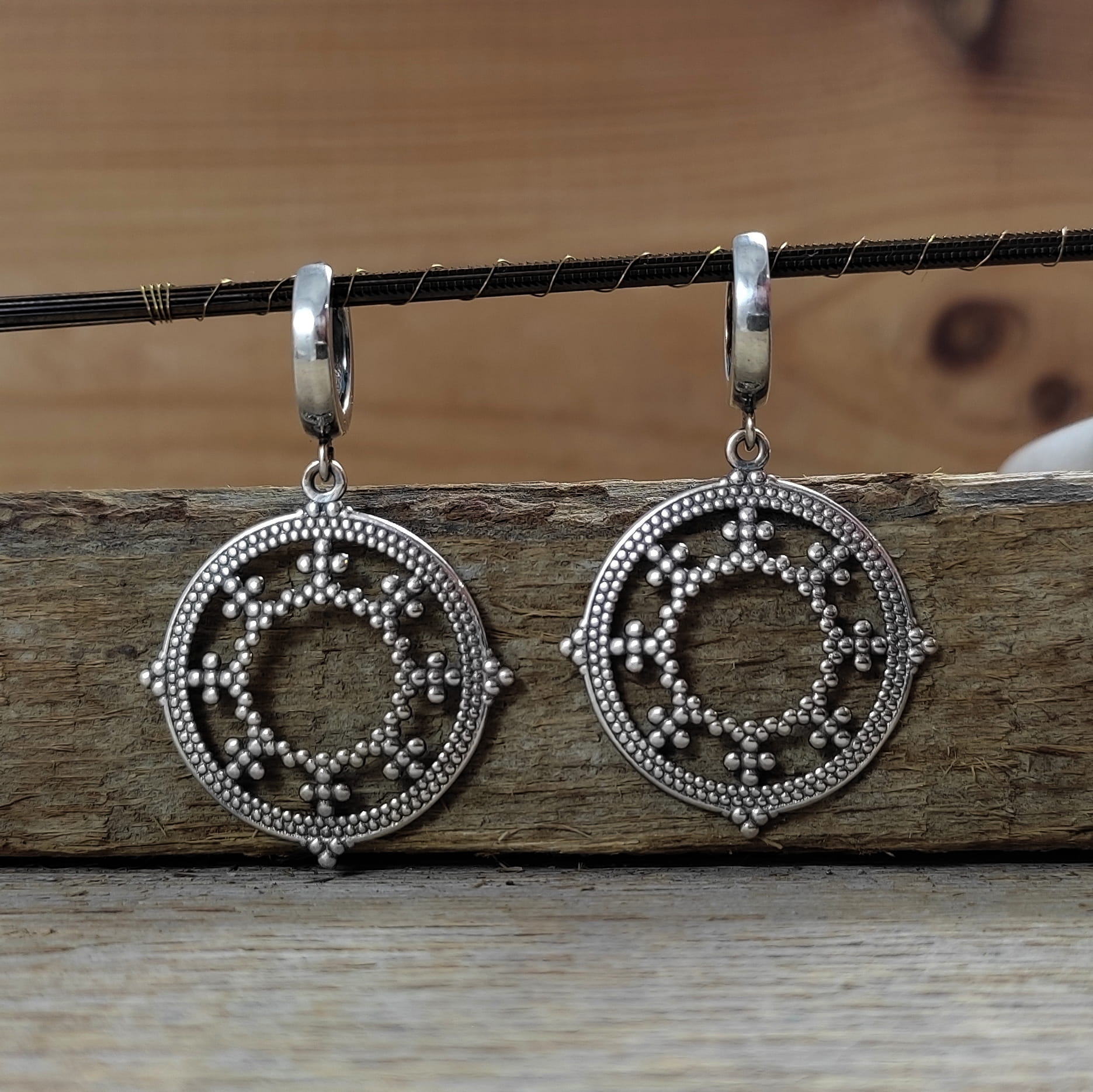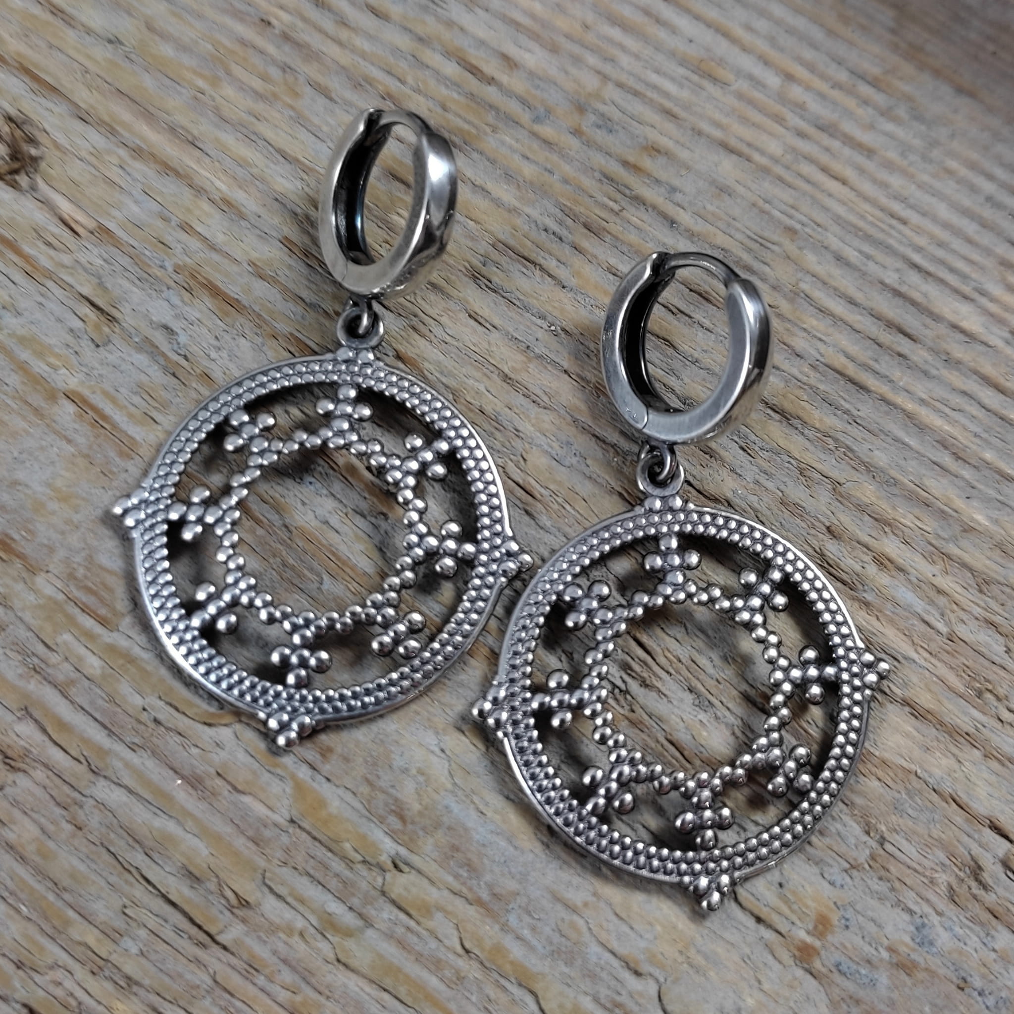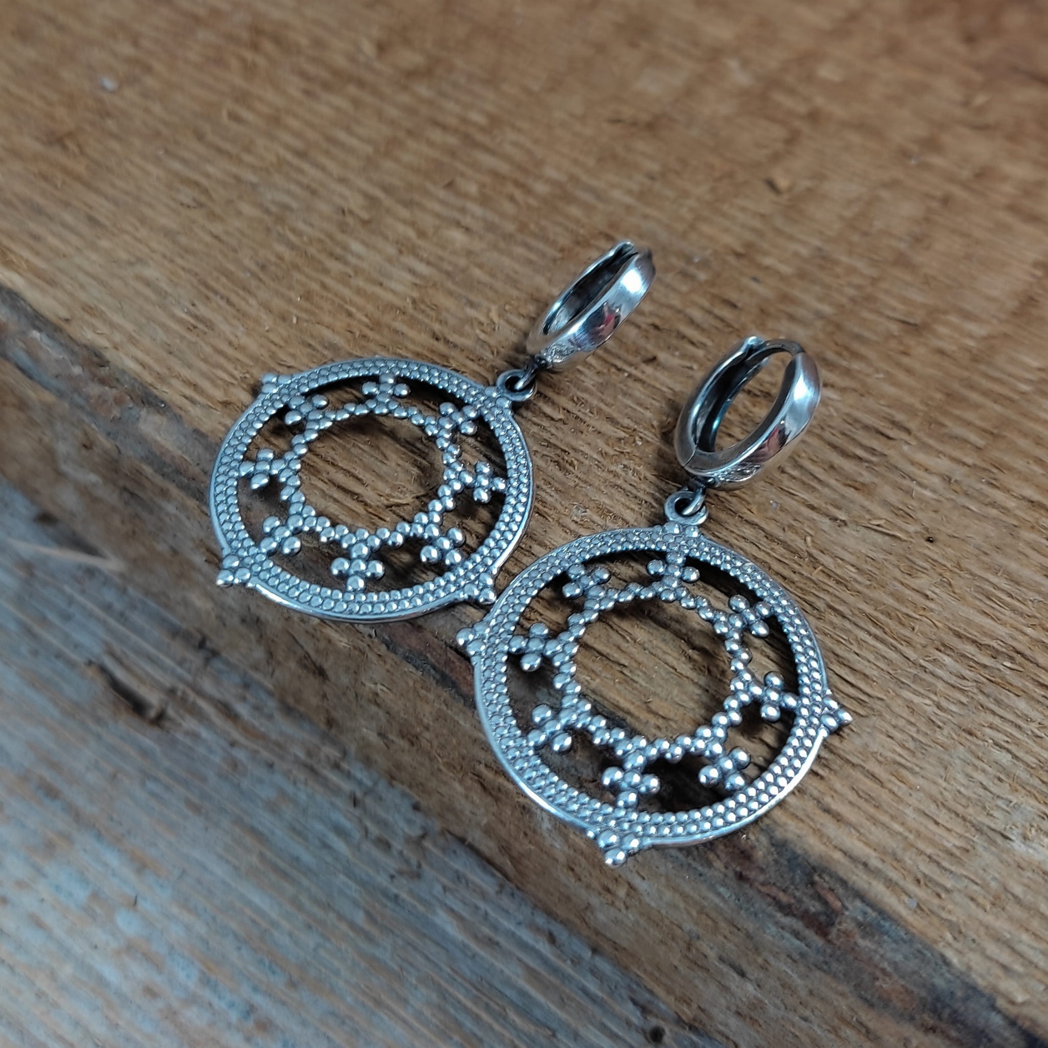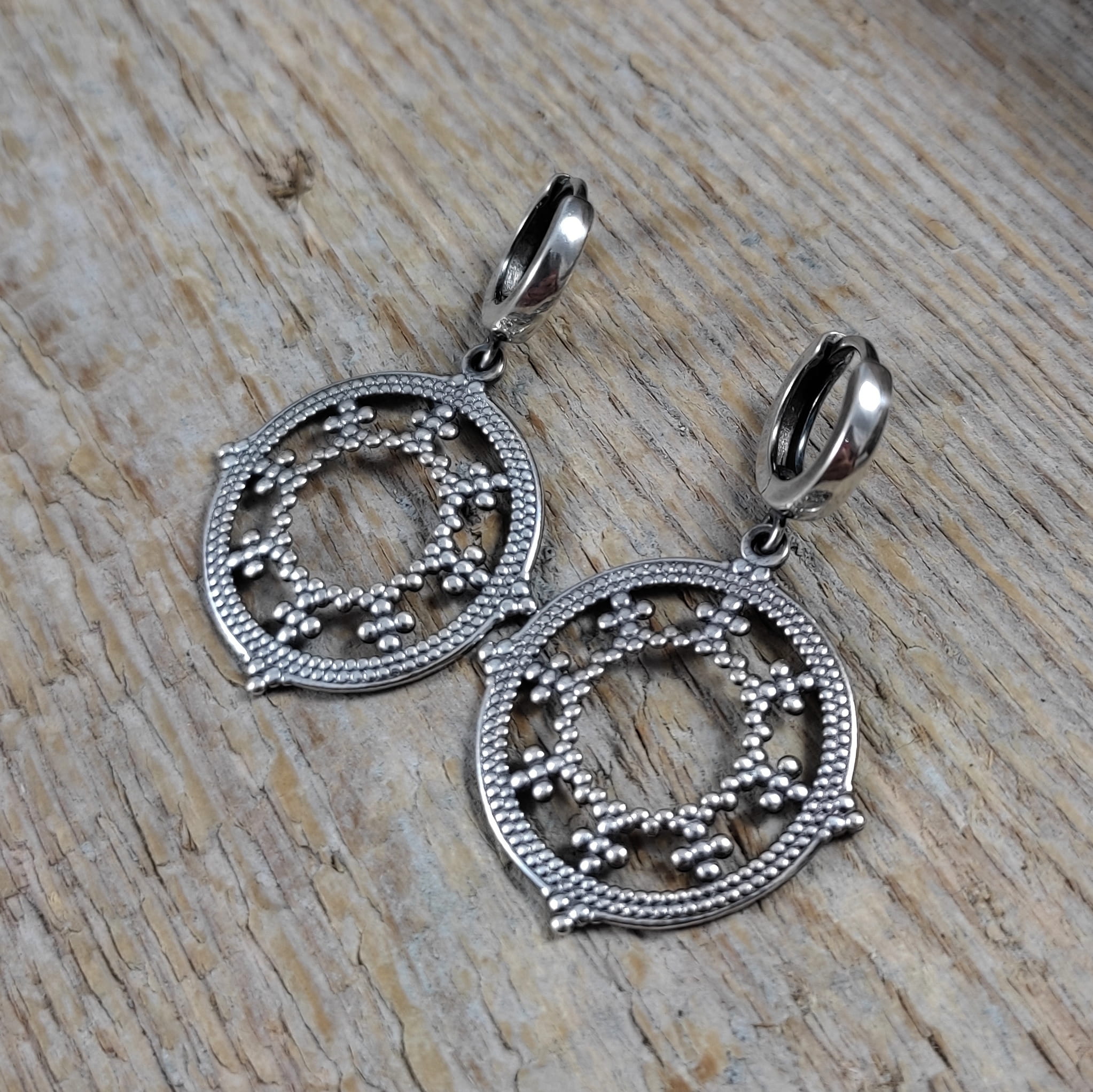Kolczyki wykonane ze srebra 925, oksydowanego i wypolerowanego. Długość całkowita kolczyków wynosi ok. 4 cm. Wielkość blaszki ażurowej 26,0/24,7/0,7 mm. Elegancko zapakowane.