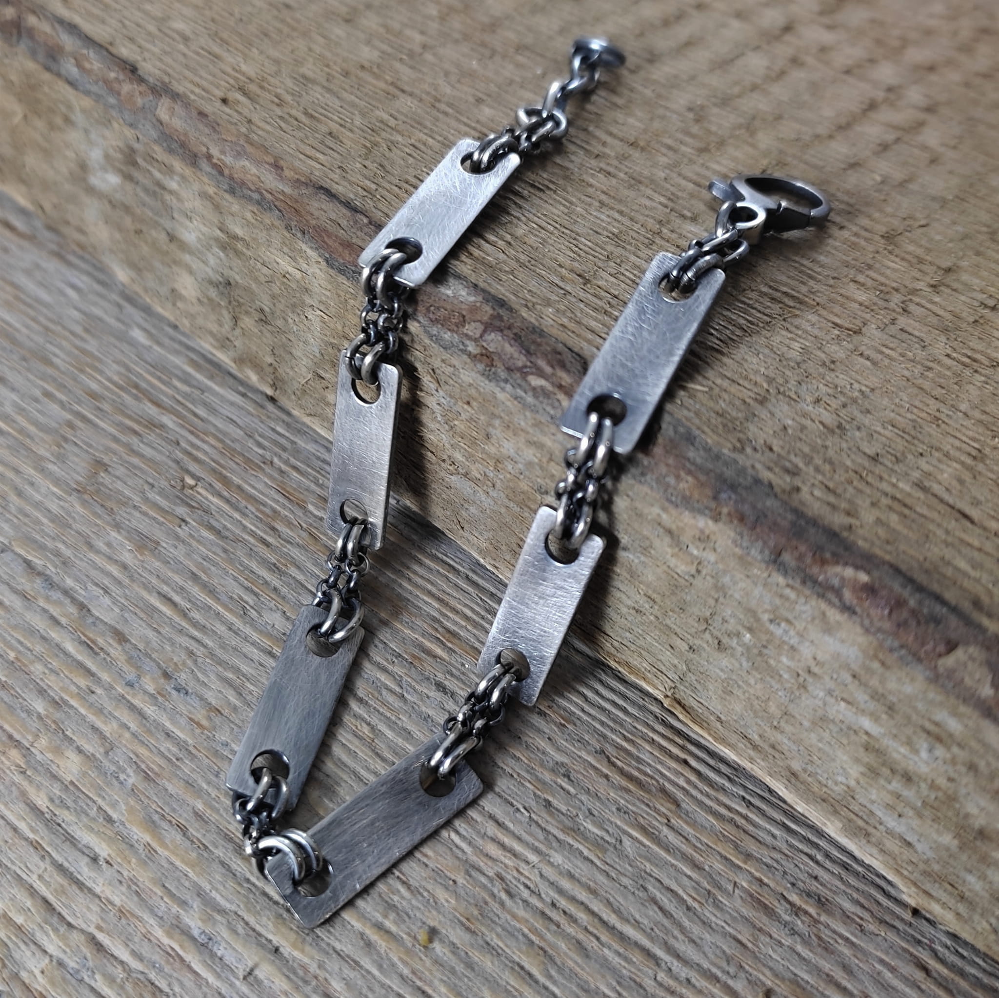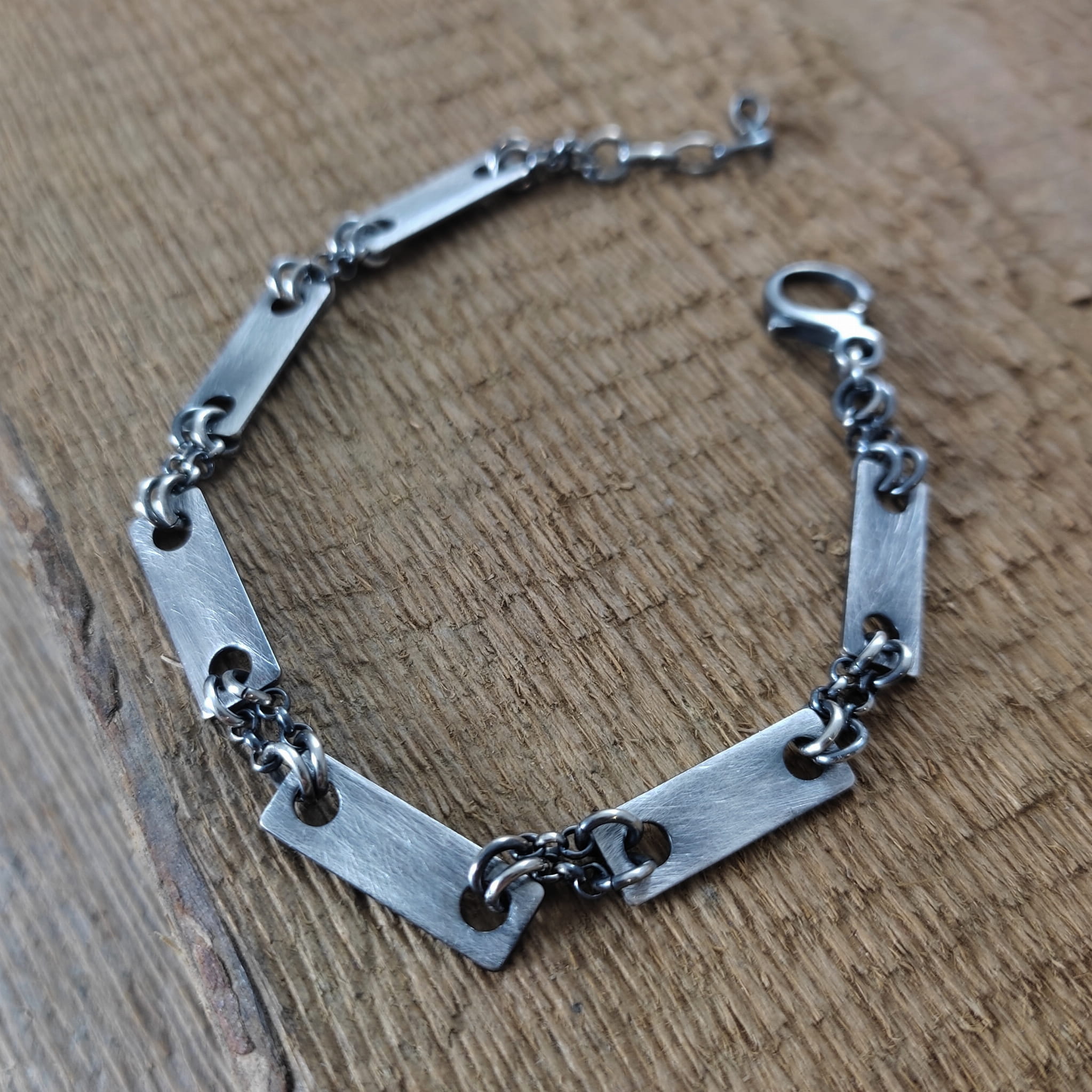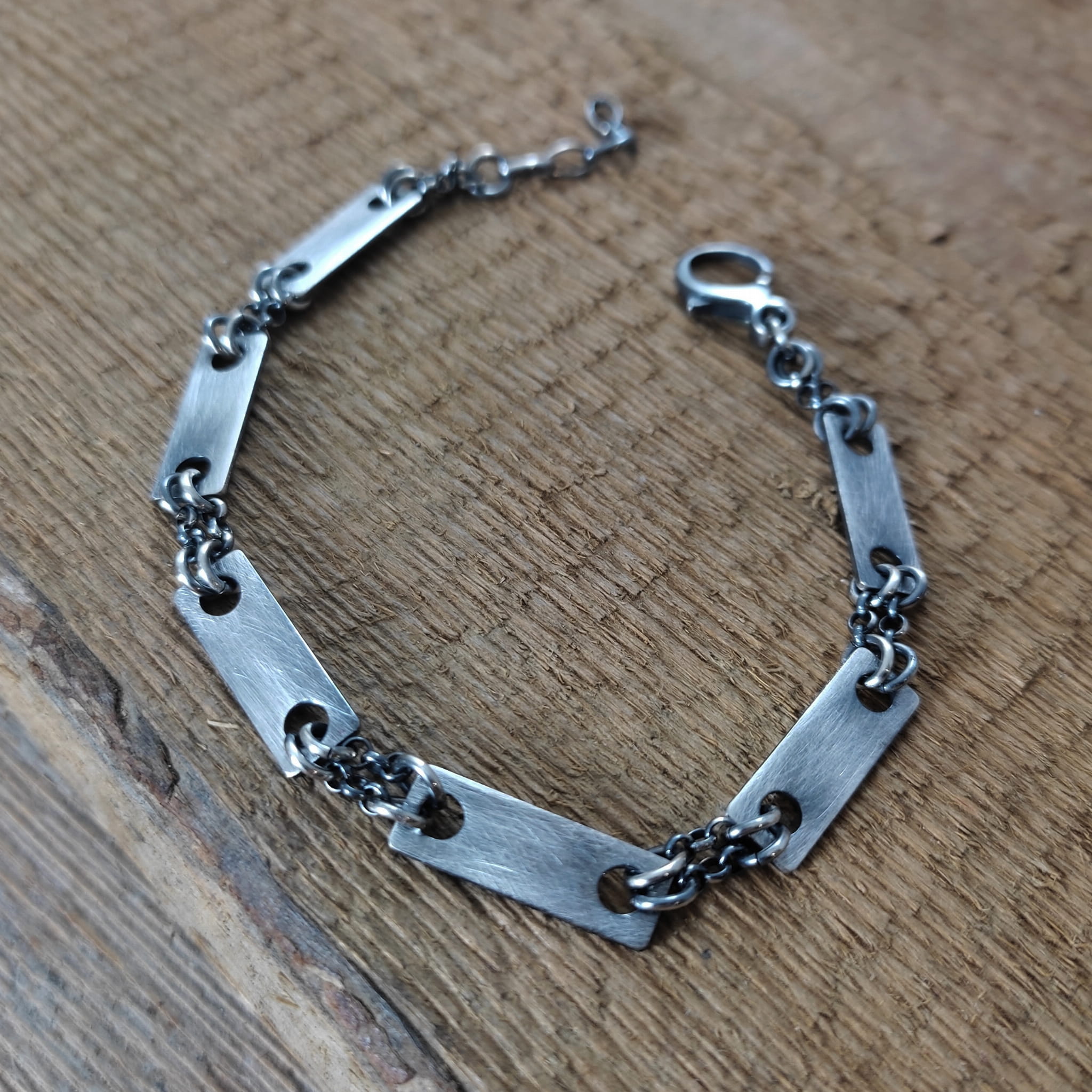 Bransoletka wykonana ze srebra próby 925, oksydowanego i wypolerowanego. Długość bransoletki wynosi ok. 18,2 cm, plus łańcuszek regulacyjny 2,5 cm. Wielkość blaszek 18/6 mm. Elegancko zapakowana.