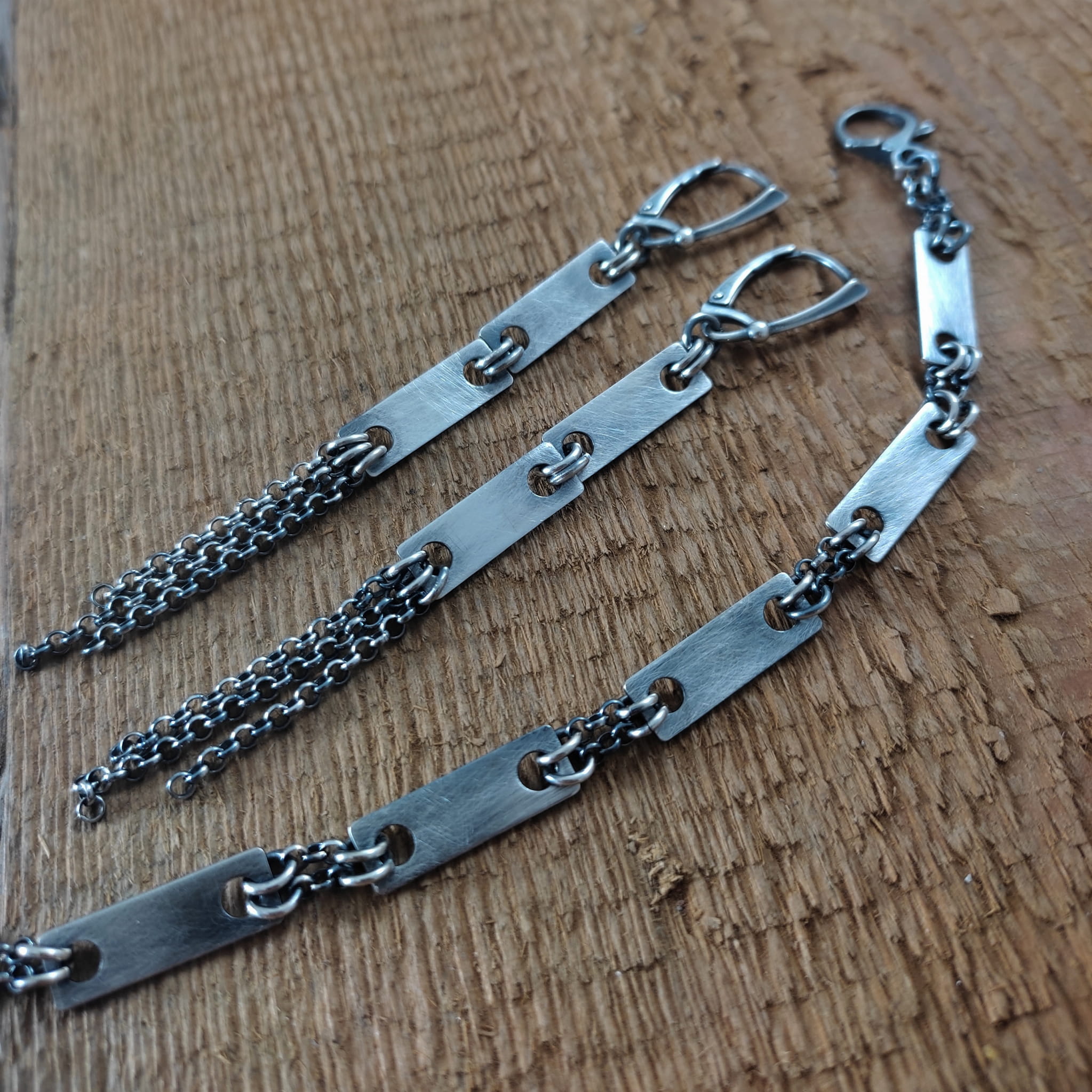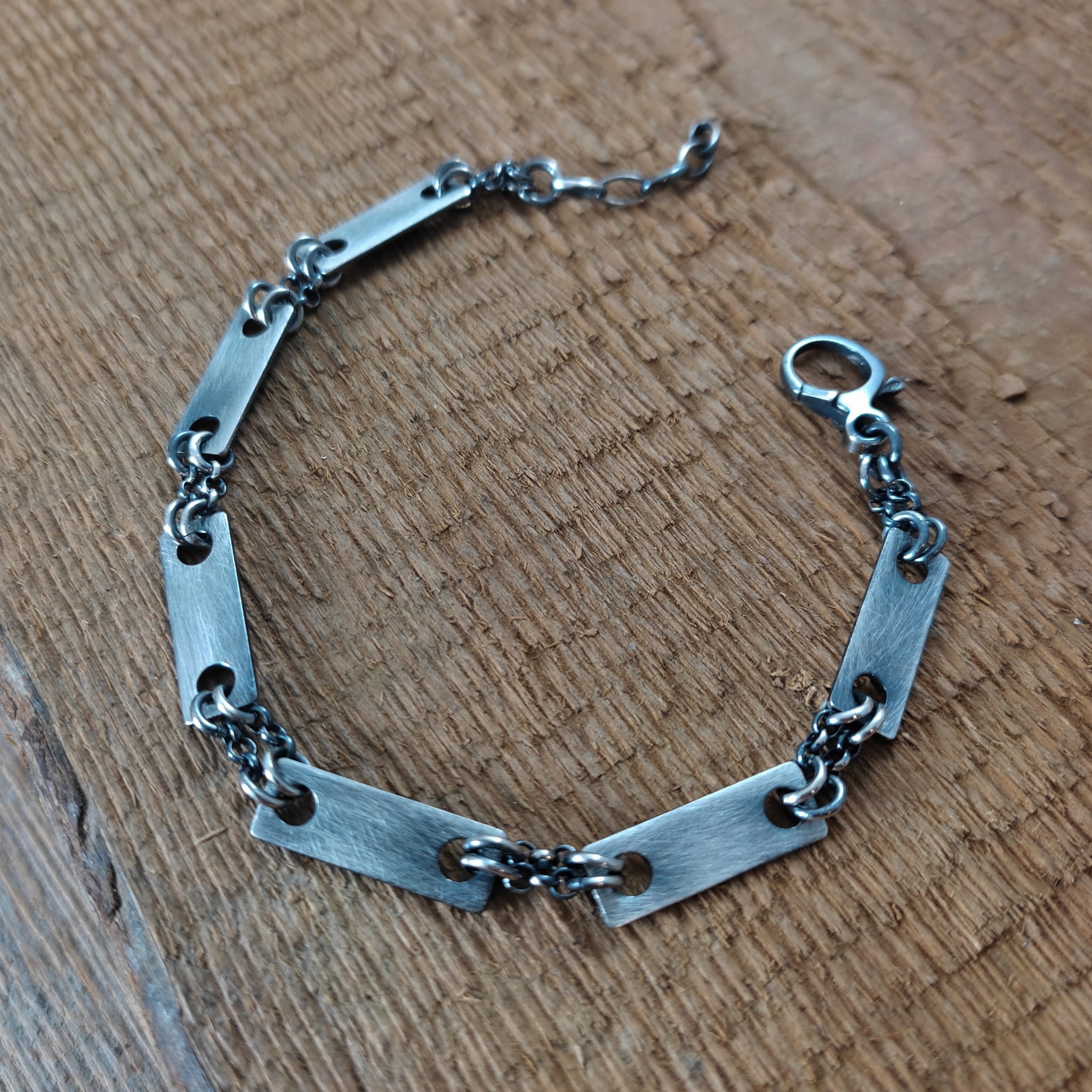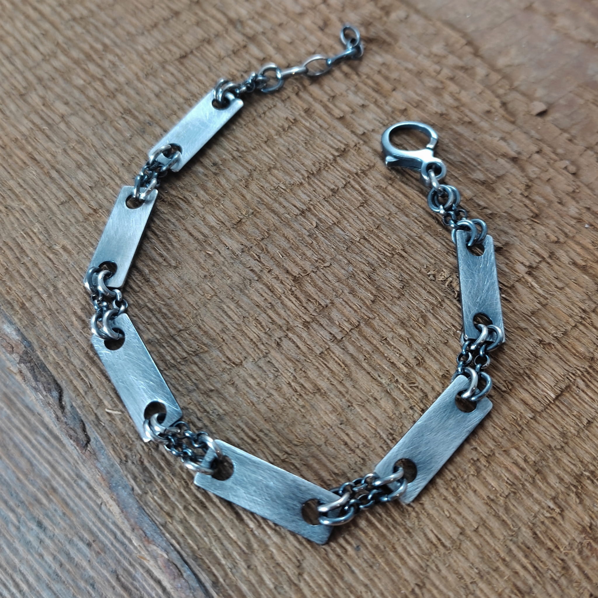 Bransoletka wykonana ze srebra próby 925, oksydowanego i wypolerowanego. Długość bransoletki wynosi ok. 18,2 cm, plus łańcuszek regulacyjny 2,5 cm. Wielkość blaszek 18/6 mm. Elegancko zapakowana.