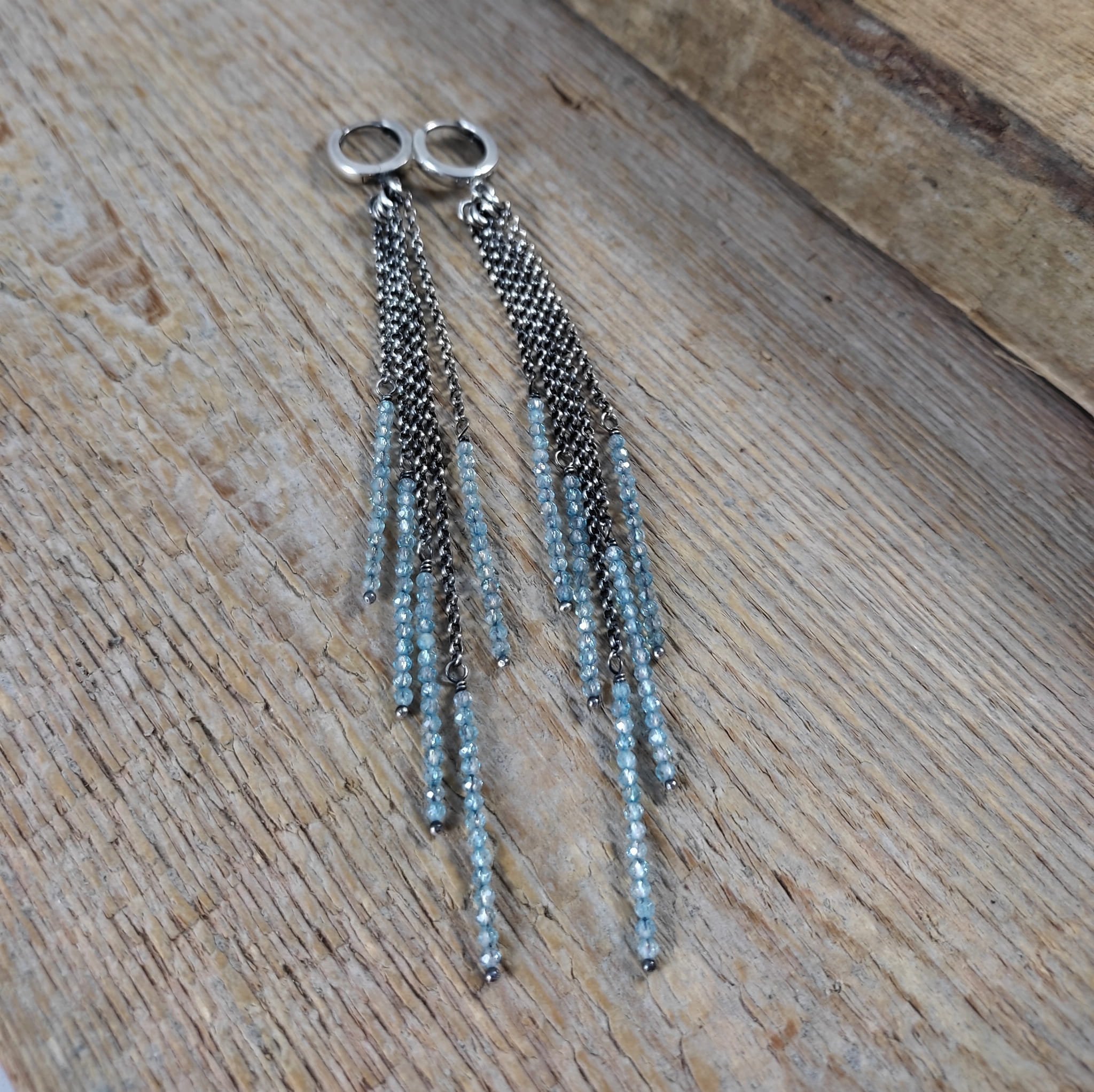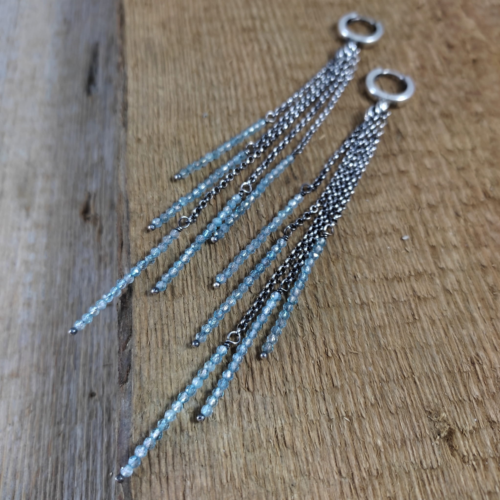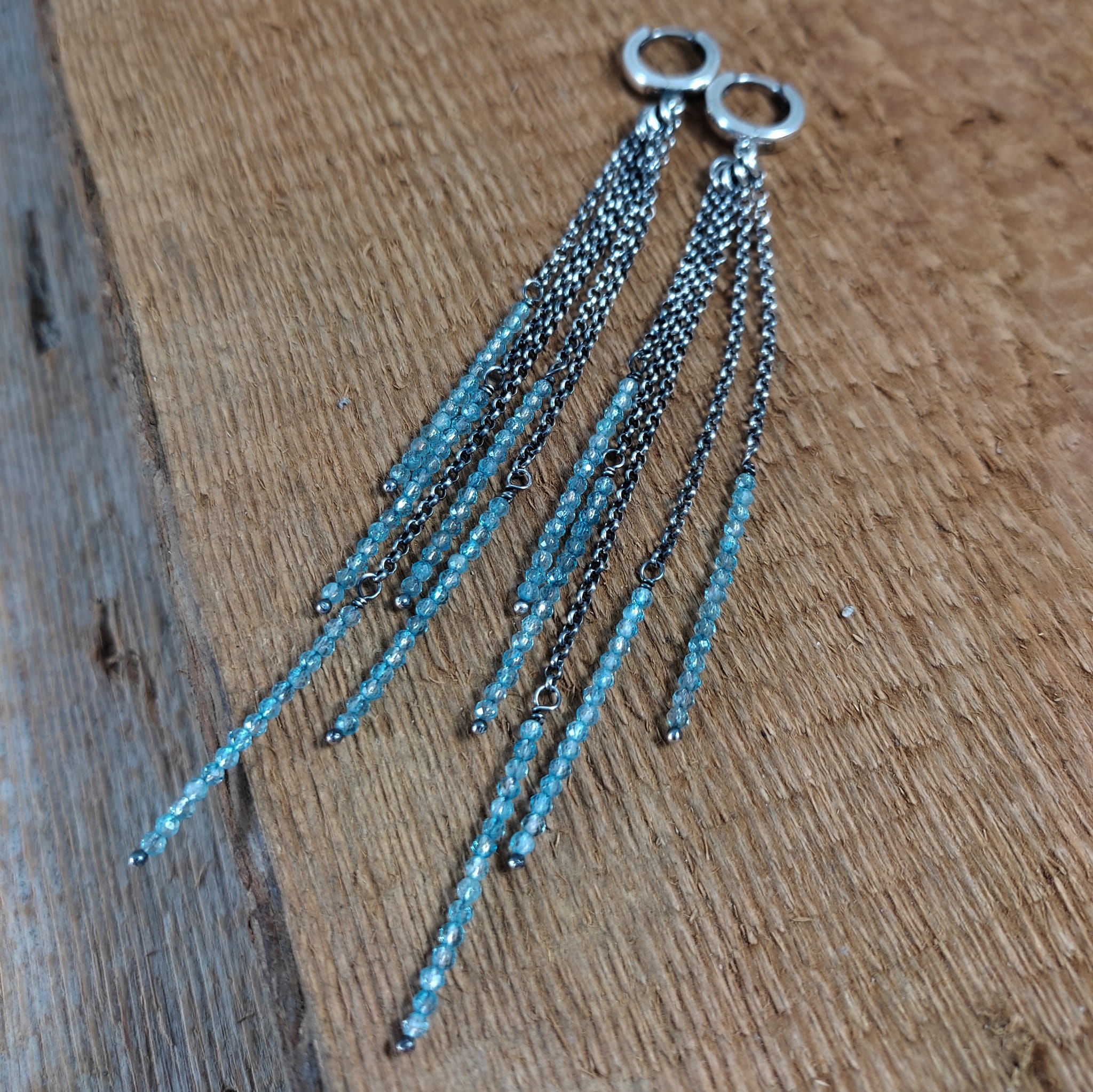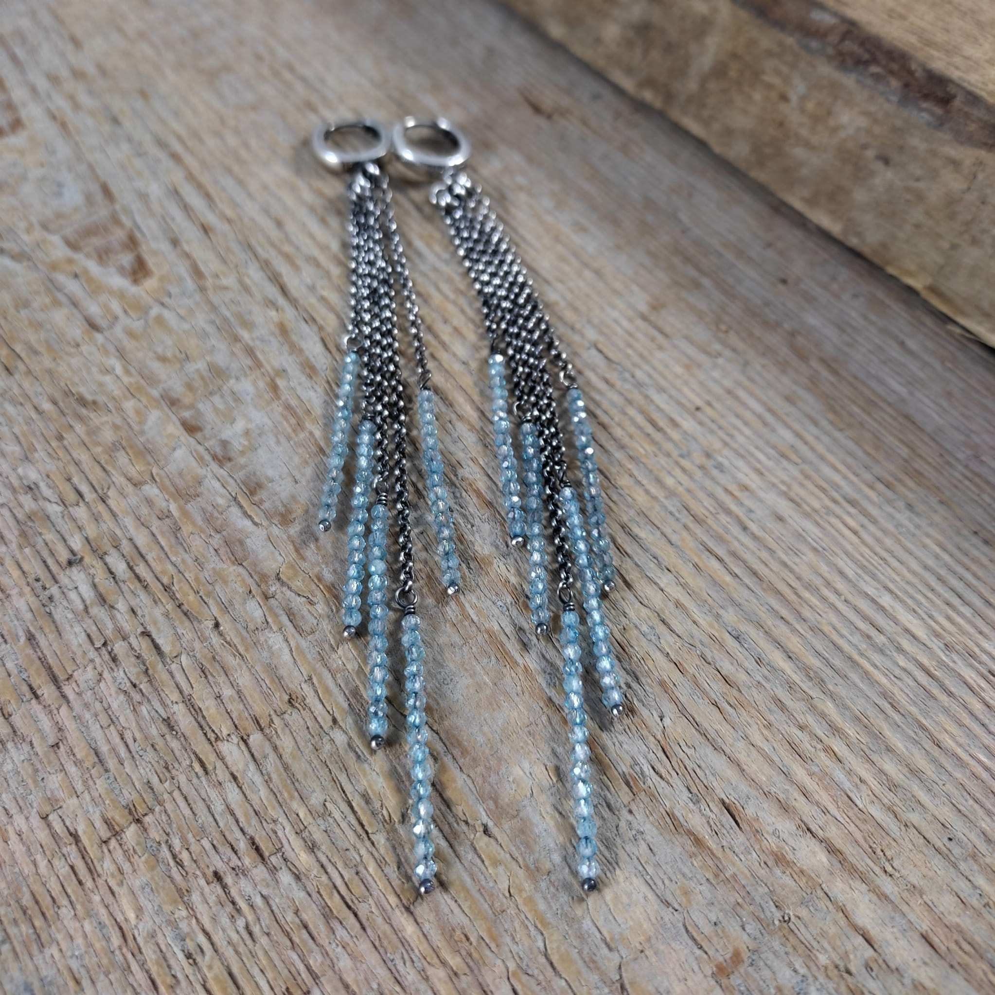 Kolczyki wykonane z fasetowanych oponek topazu 2 mm. Całość dopełniona srebrem 925, oksydowanym i wypolerowanym. Długość całkowita kolczyków wynosi ok. 11 cm. Elegancko zapakowane. Kamienie posiadają ryski, niedoskonałości.