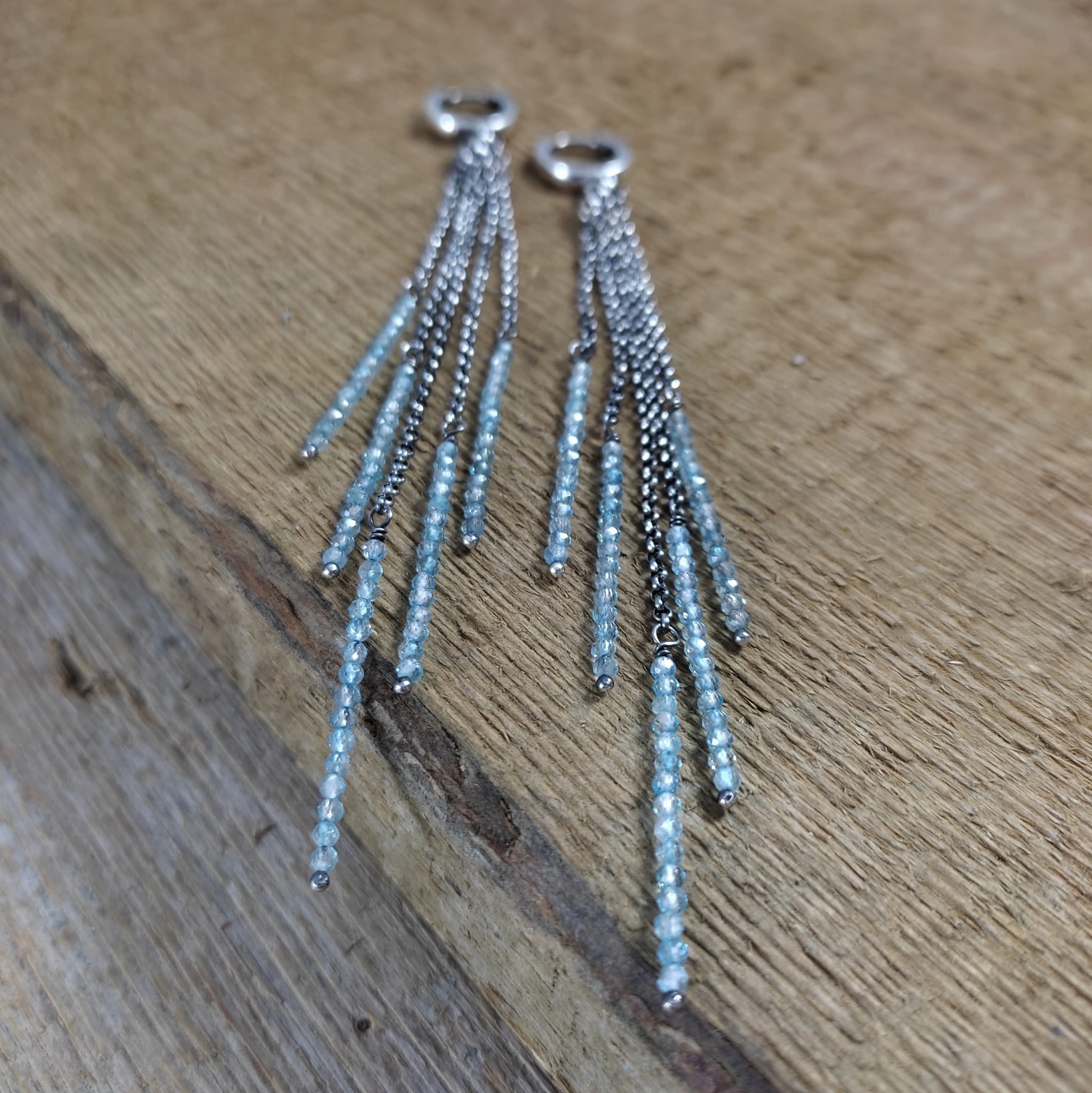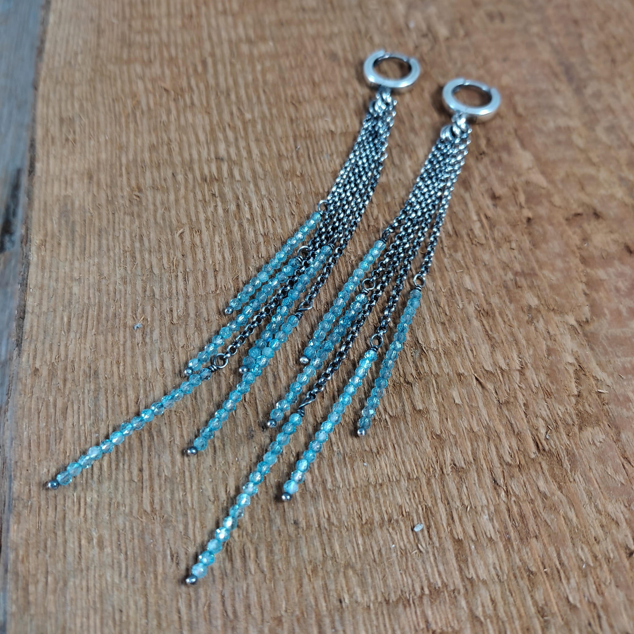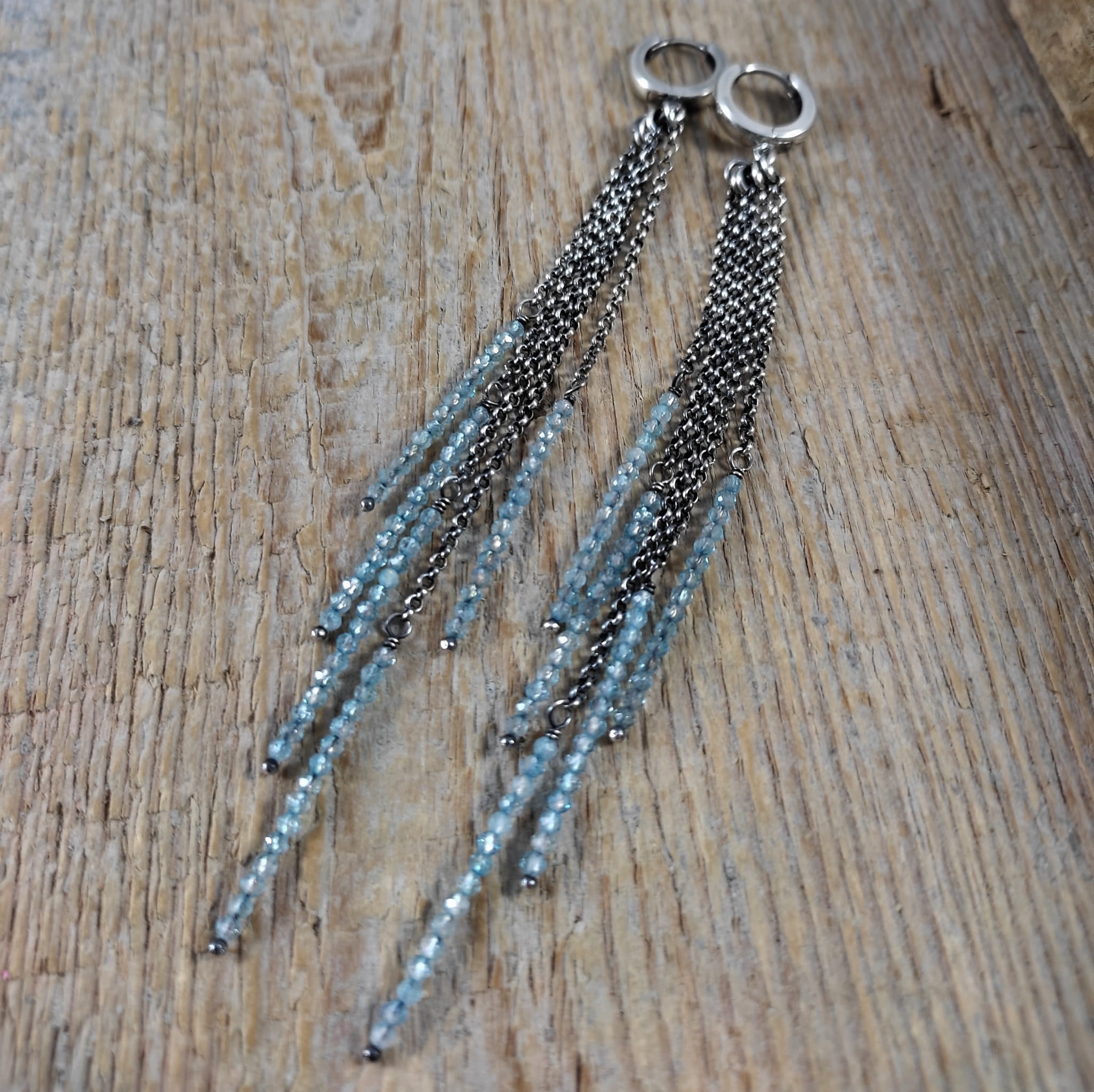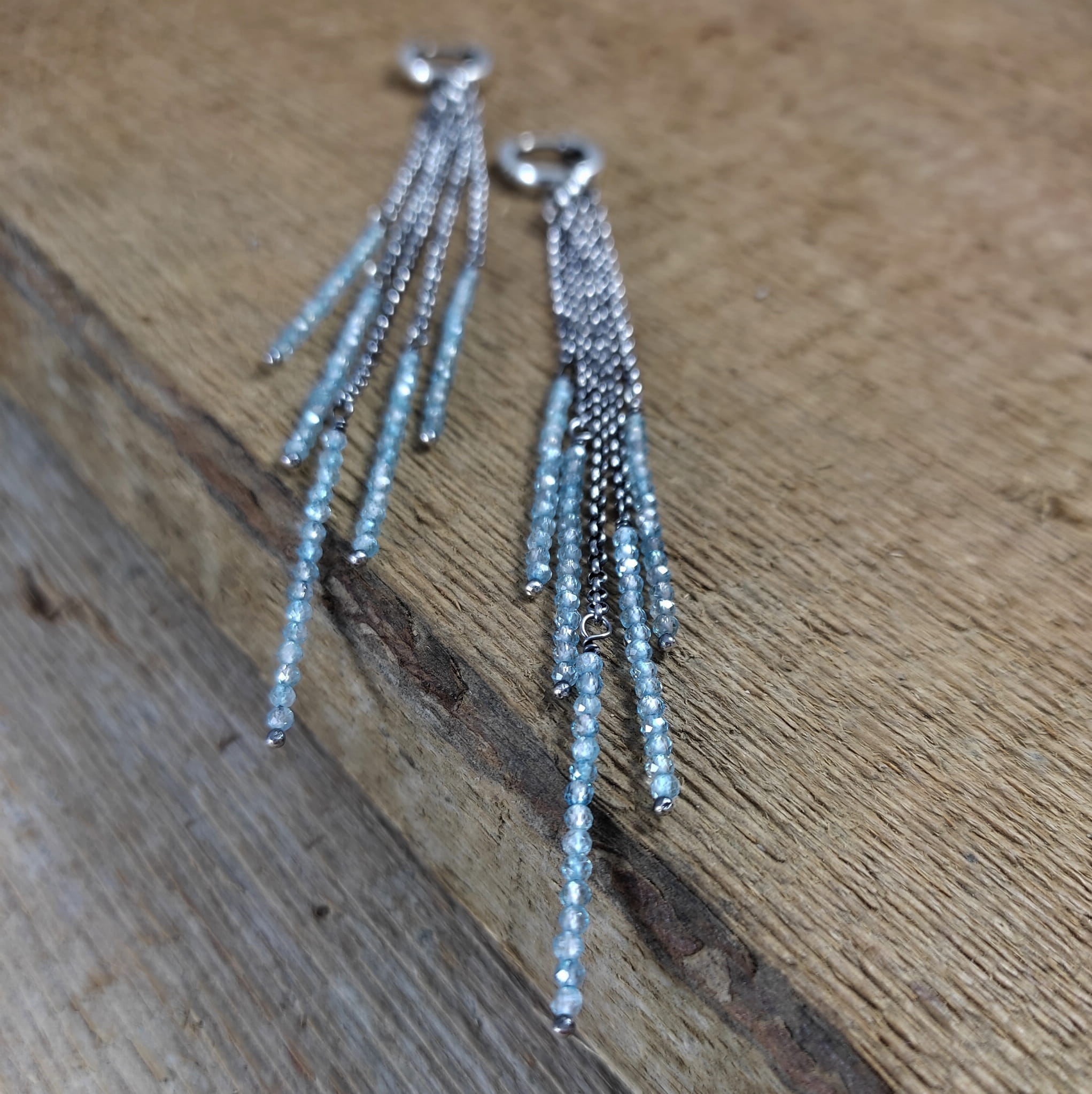 Kolczyki wykonane z fasetowanych oponek topazu 2 mm. Całość dopełniona srebrem 925, oksydowanym i wypolerowanym. Długość całkowita kolczyków wynosi ok. 11 cm. Elegancko zapakowane. Kamienie posiadają ryski, niedoskonałości.