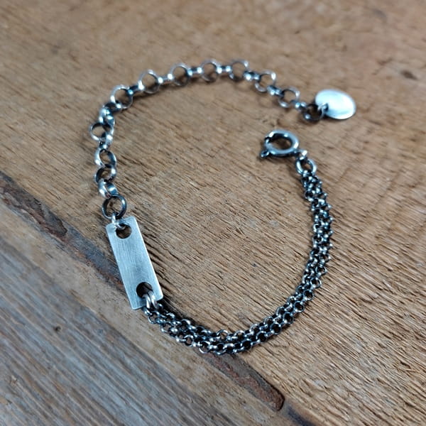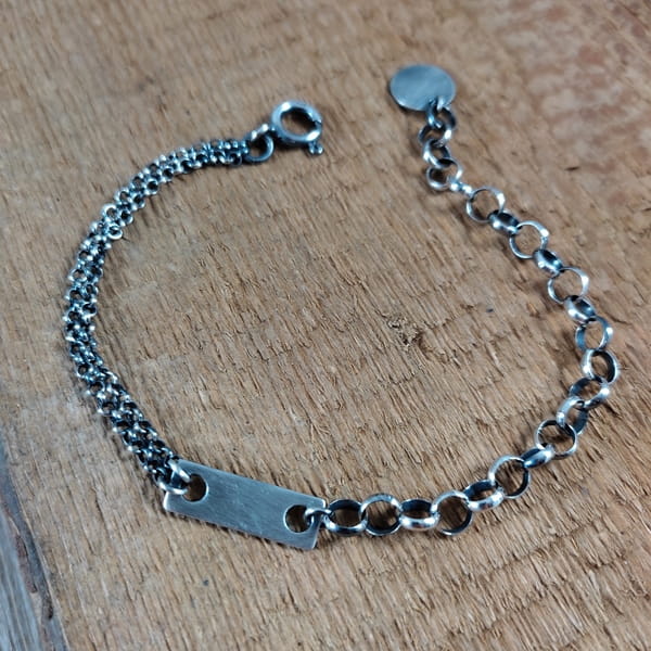 Bransoletka wykonana ze srebra próby 925, oksydowanego i wypolerowanego. Długość bransoletki wynosi ok. 19/20/21/22 cm. (Proszę wpisać w komentarzu, w przypadku braku wysyłamy 20 cm). Wielkość blaszki 18/6 mm. Elegancko zapakowana.