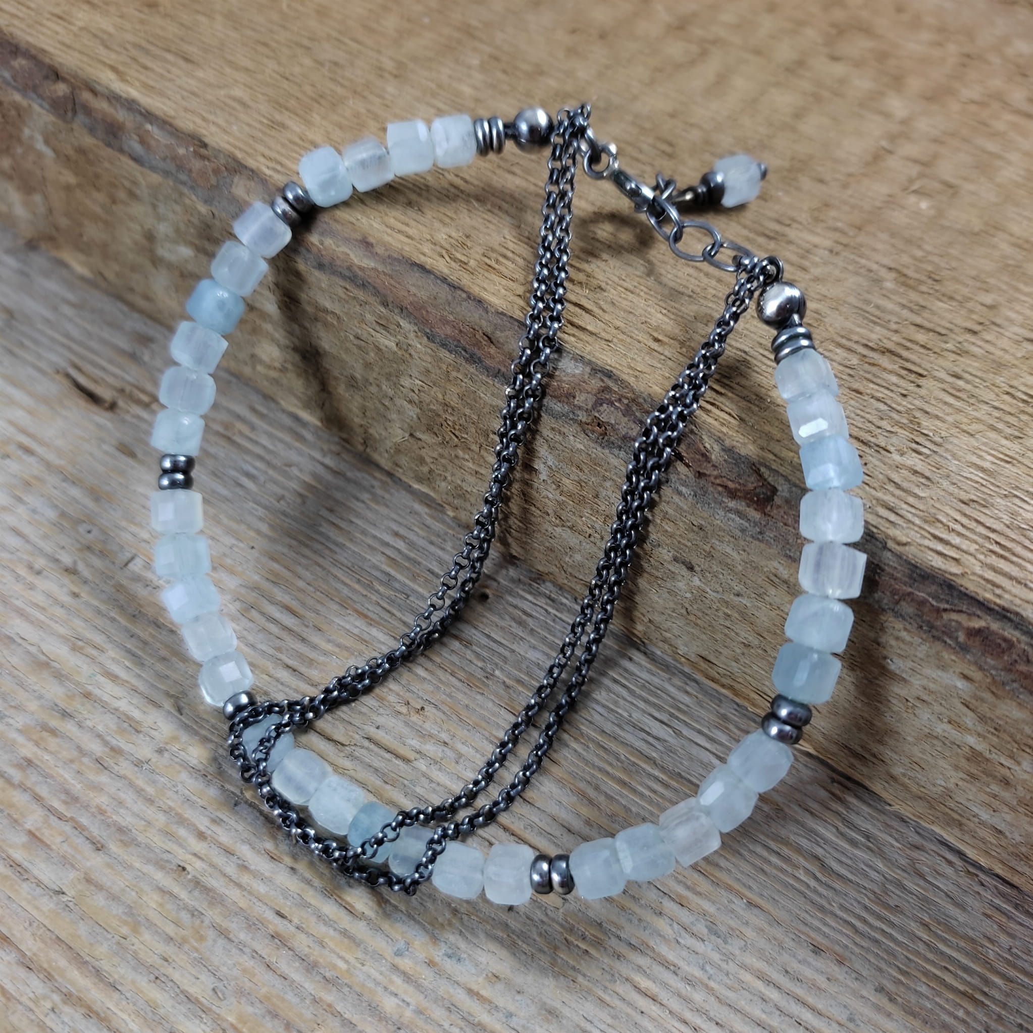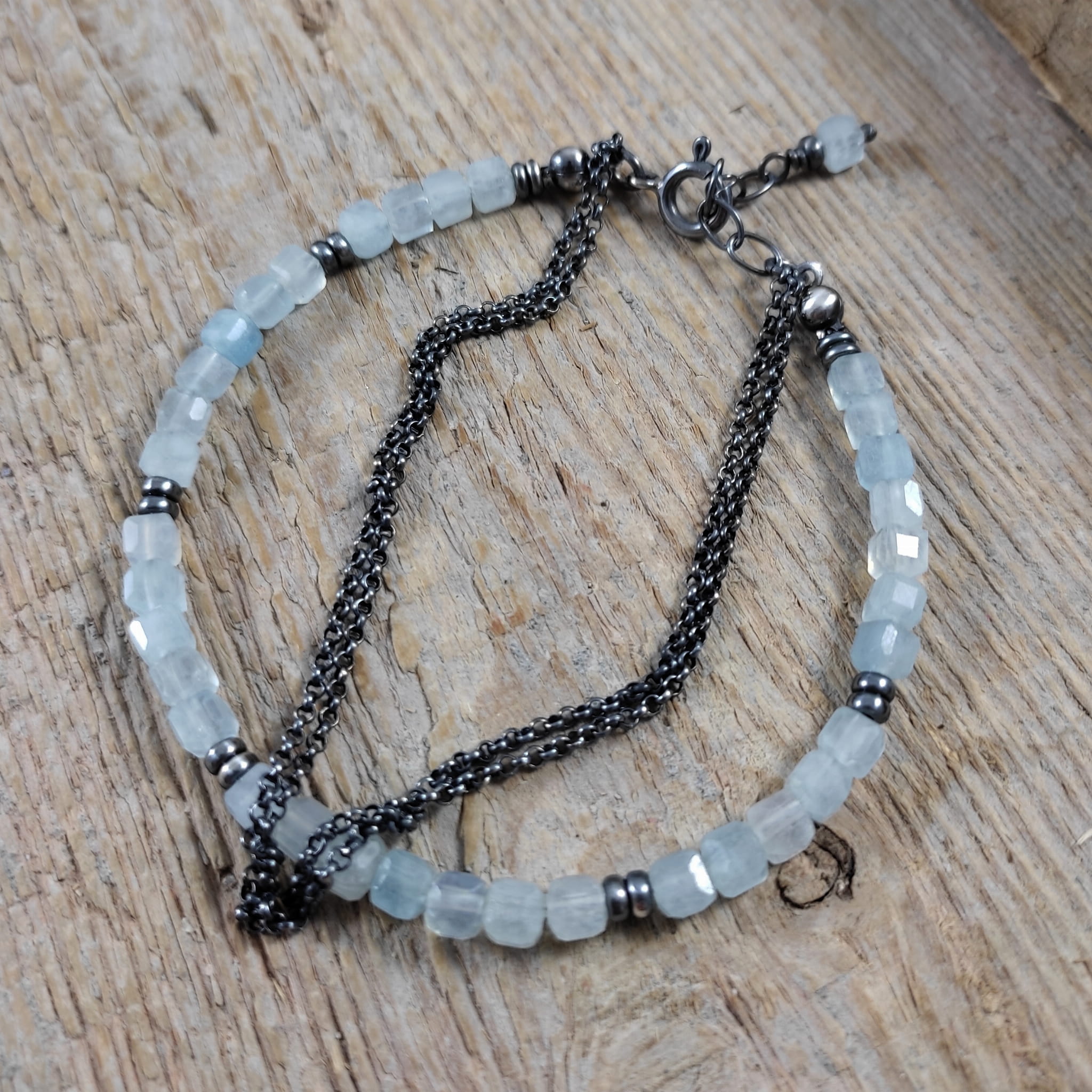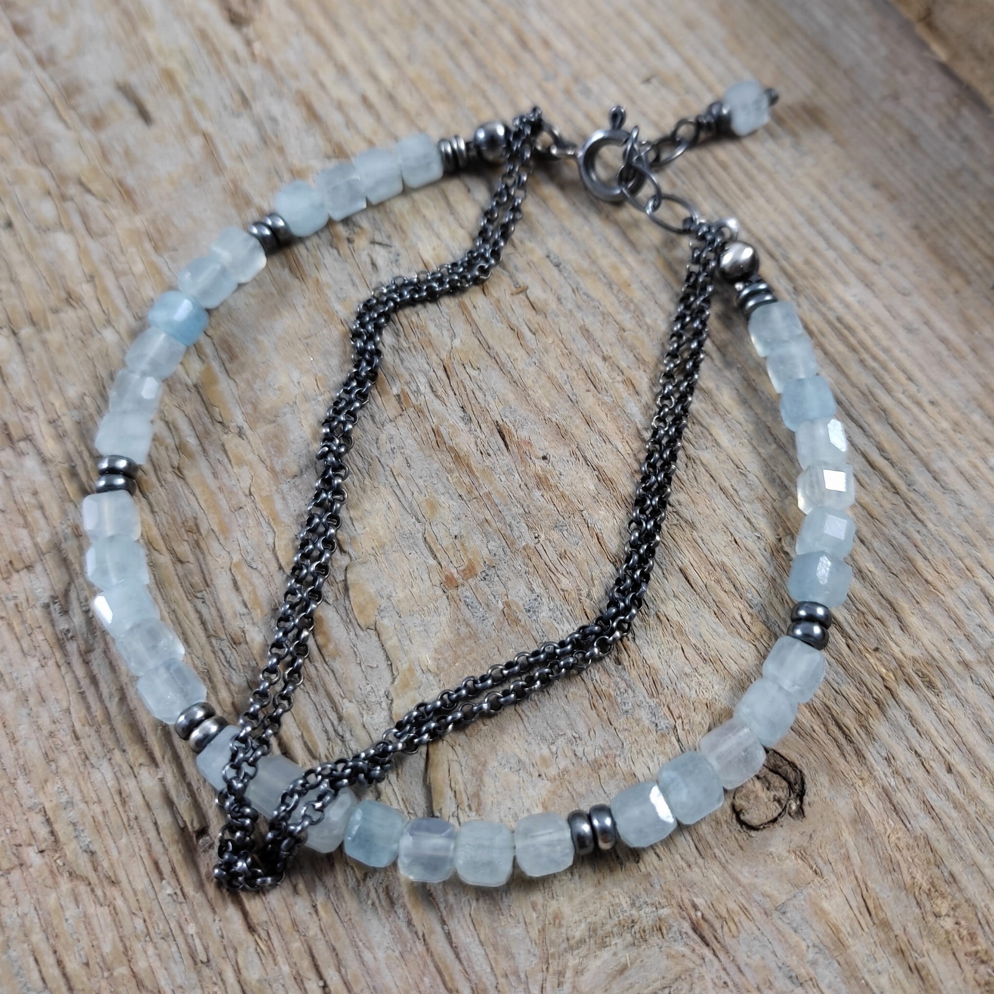 Bransoletka wykonana z fasetowanych sześcianów akwamarynu ok. 64 mm. Całość wykończona w srebrze 925, oksydowanym i wypolerowanym. Długość bransoletki wynosi 19 cm, plus łańcuszek regulacyjny 2 cm. Pasuje na nadgarstek 16-17,5 cm. Elegancko zapakowana. Kamienie posiadają delikatne niedoskonałości.