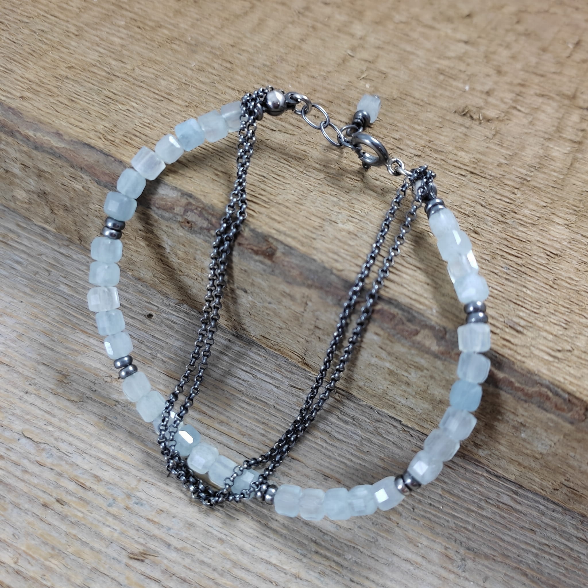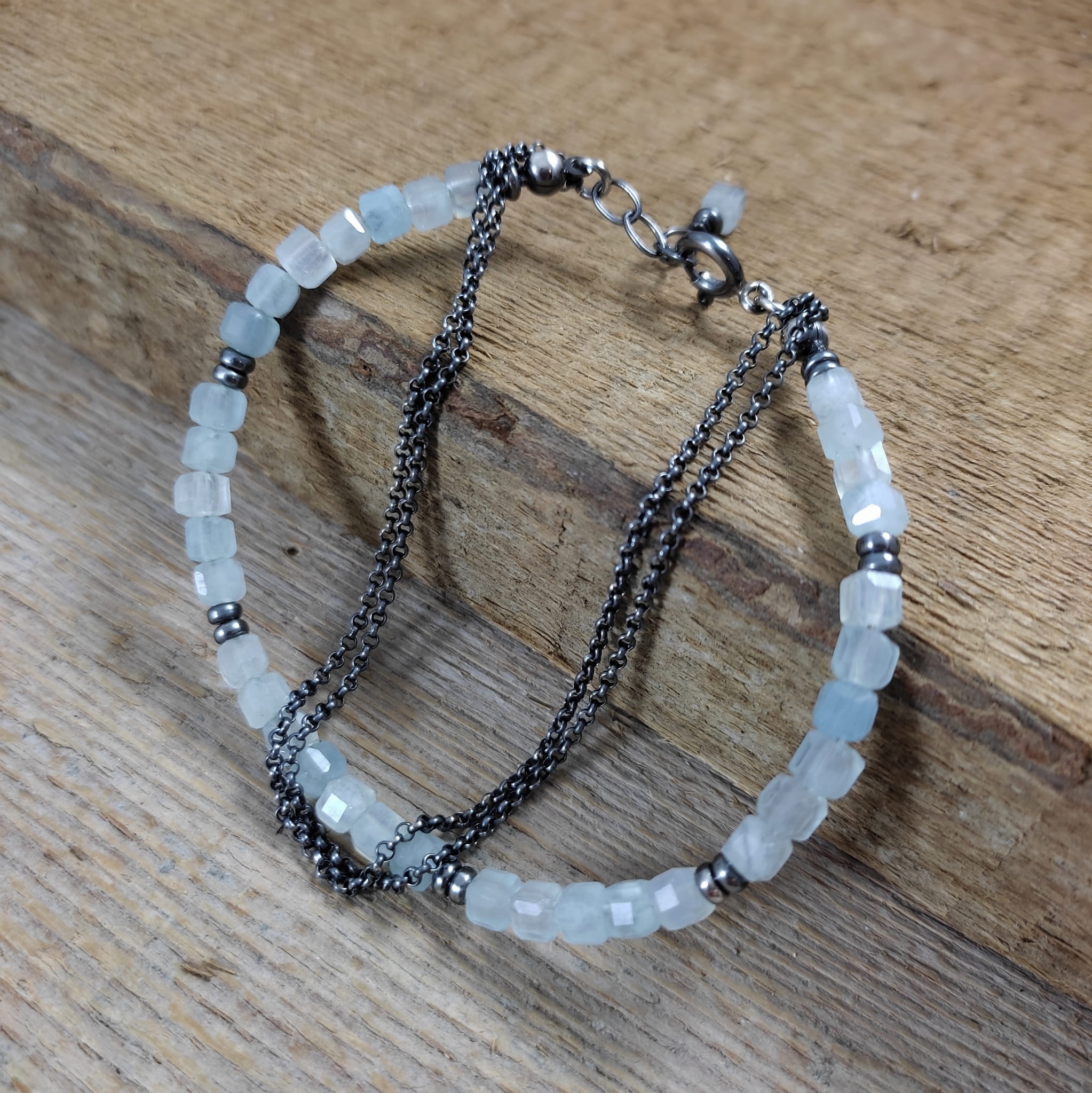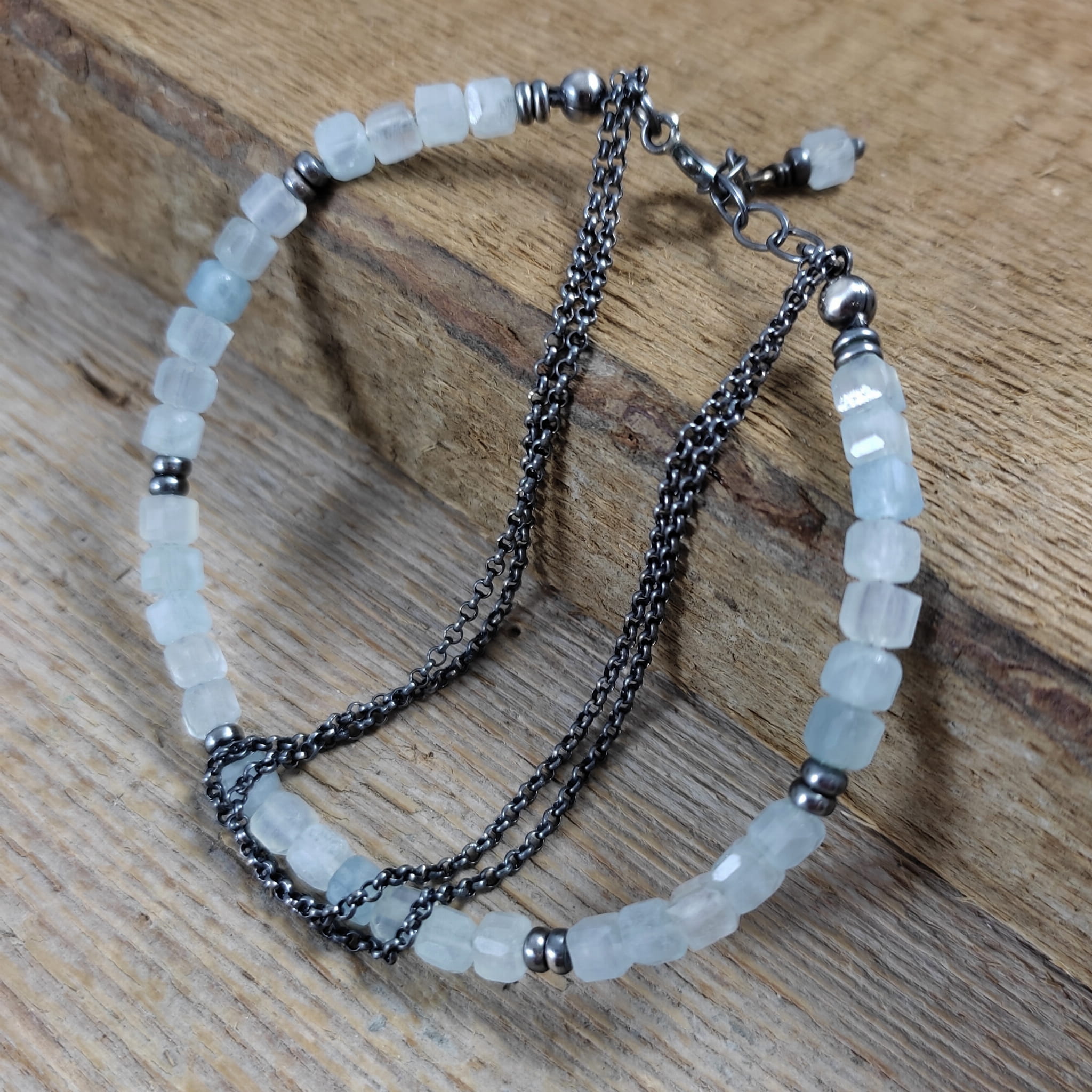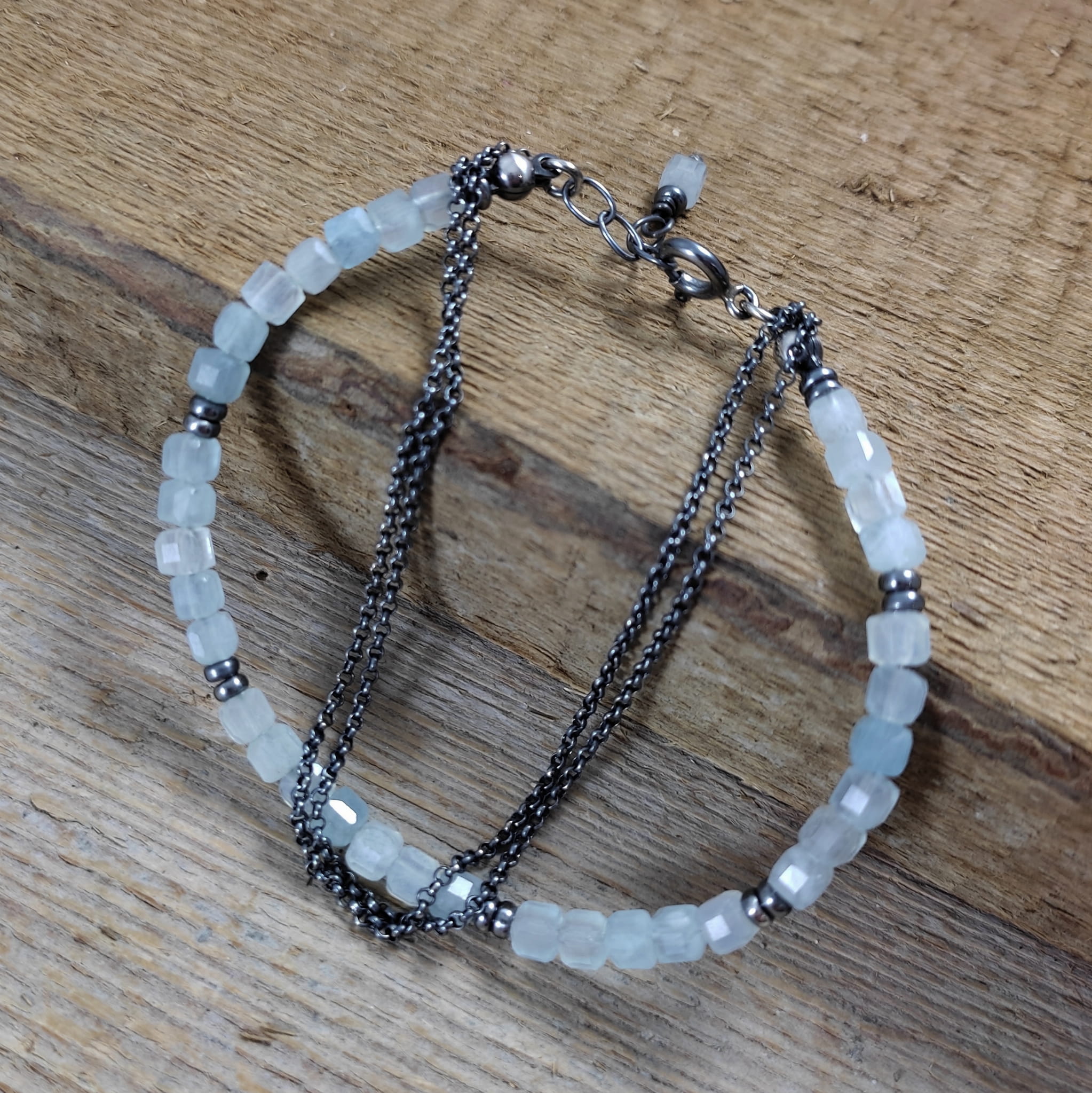 Bransoletka wykonana z fasetowanych sześcianów akwamarynu ok. 64 mm. Całość wykończona w srebrze 925, oksydowanym i wypolerowanym. Długość bransoletki wynosi 19 cm, plus łańcuszek regulacyjny 2 cm. Pasuje na nadgarstek 16-17,5 cm. Elegancko zapakowana. Kamienie posiadają delikatne niedoskonałości.