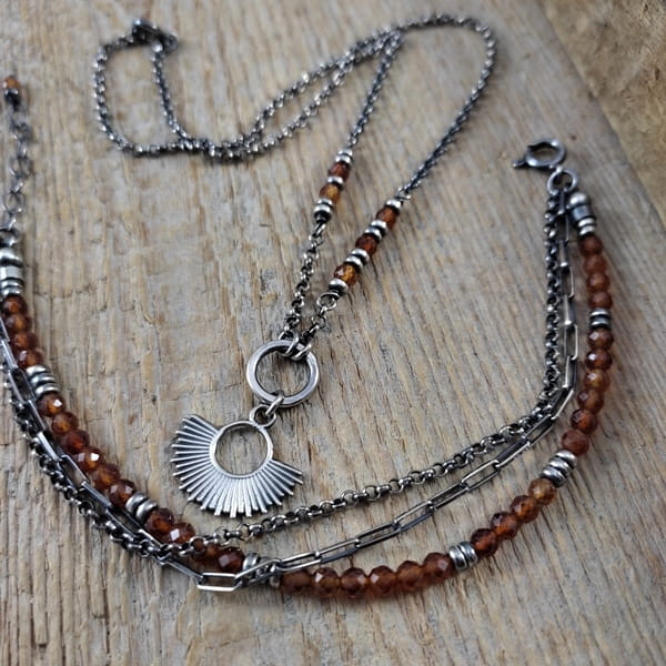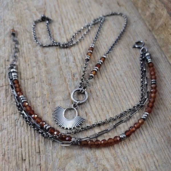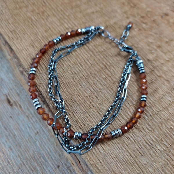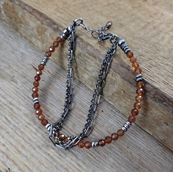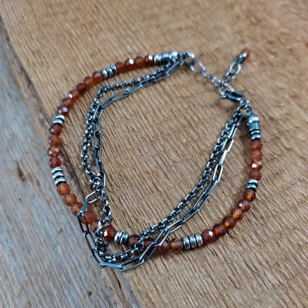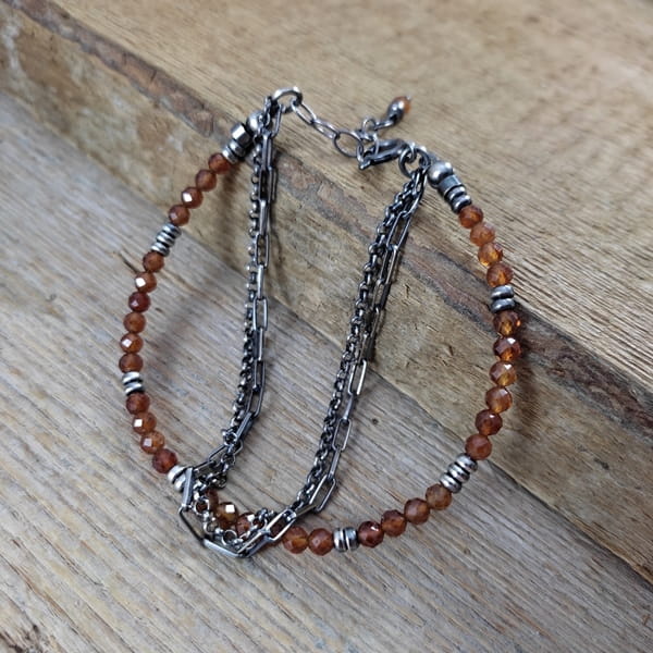 Bransoletka wykonana z fasetowanych kul granatu hessonit ok. 3,5 mm. Całość dopełniona srebrem 925, oksydowanym i wypolerowanym. Długość bransoletki wynosi ok. 18-21 cm, plus łańcuszek regulacyjny 2 cm. (Proszę wpisać w komentarzu, w przypadku braku wysyłamy 18 cm).