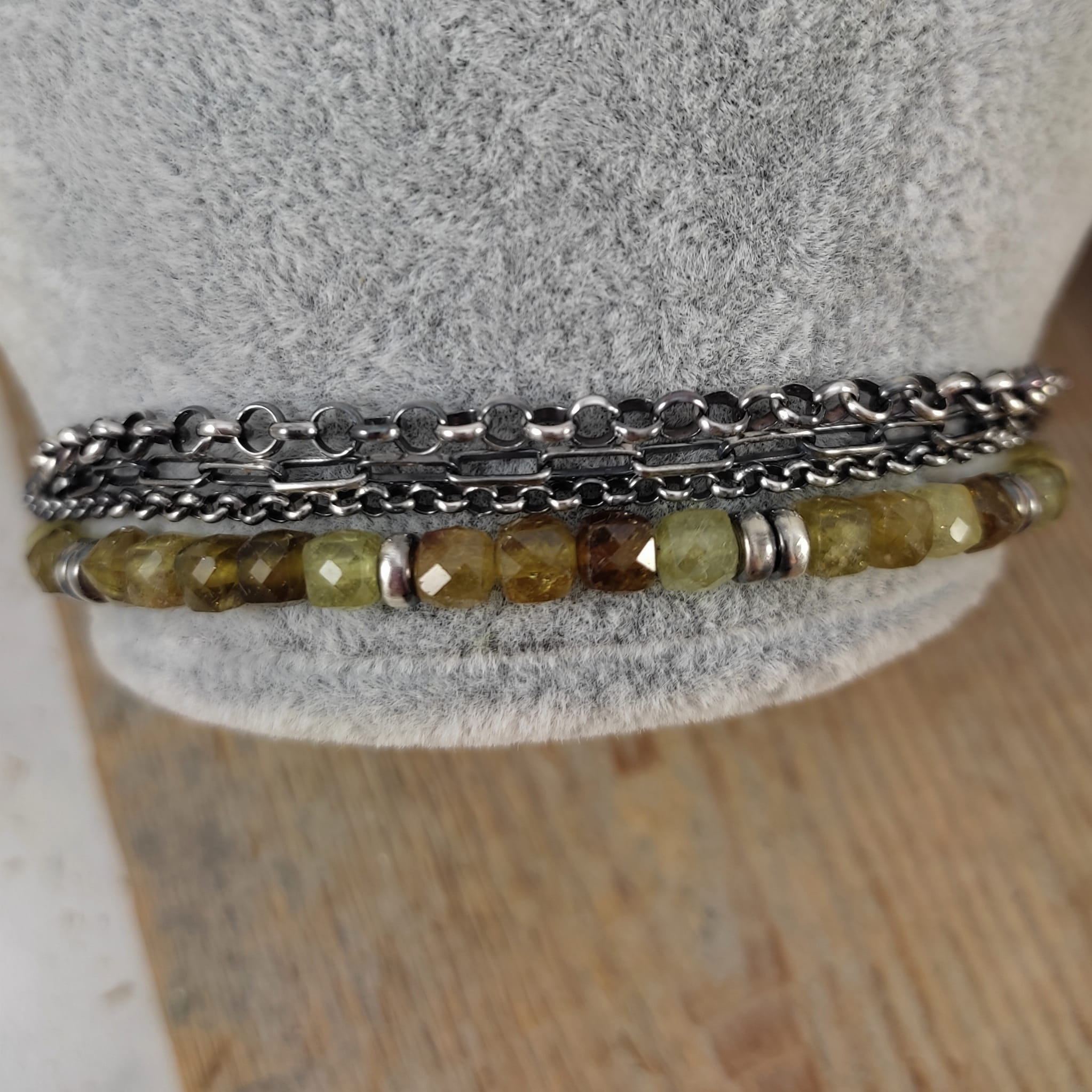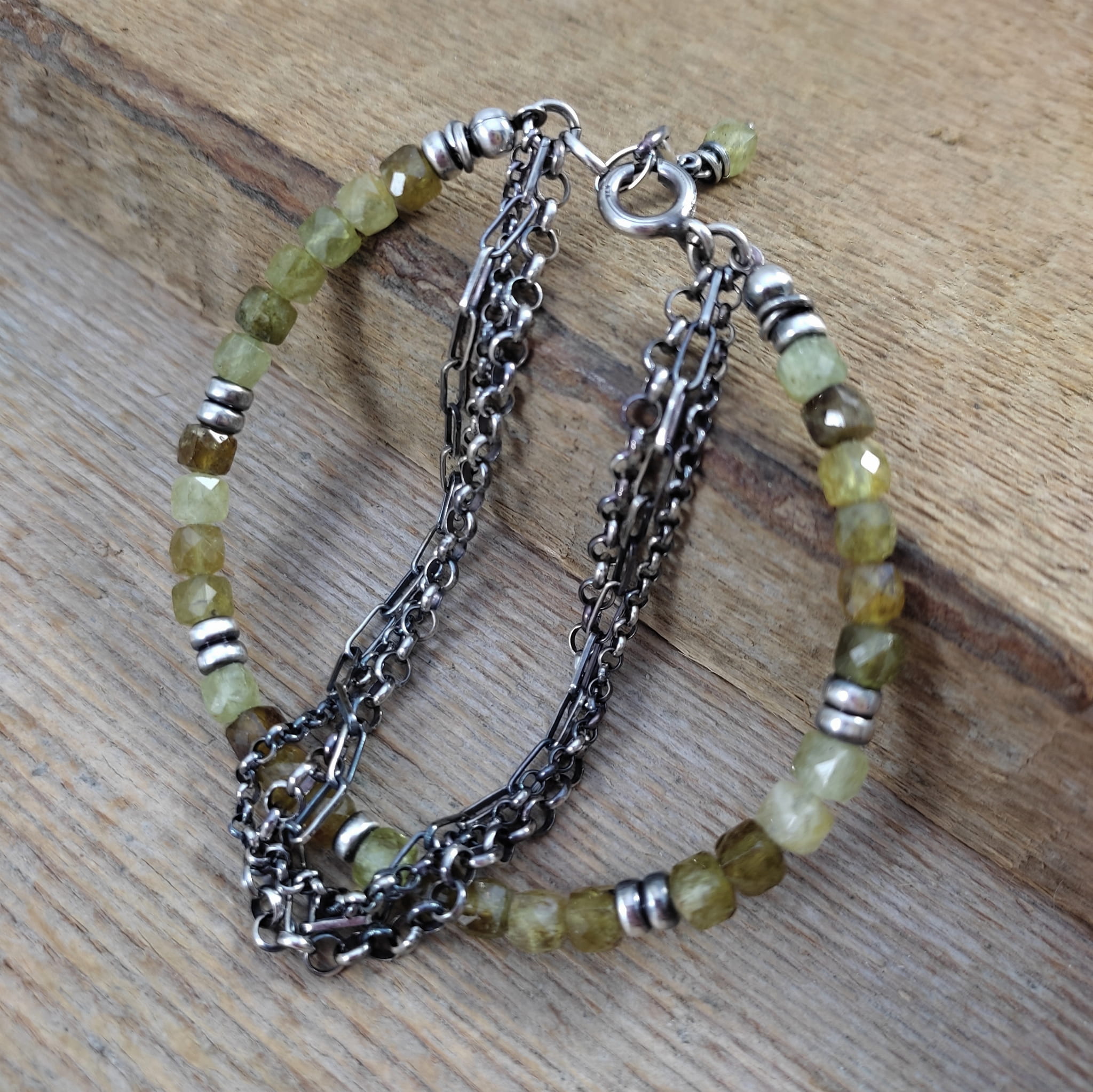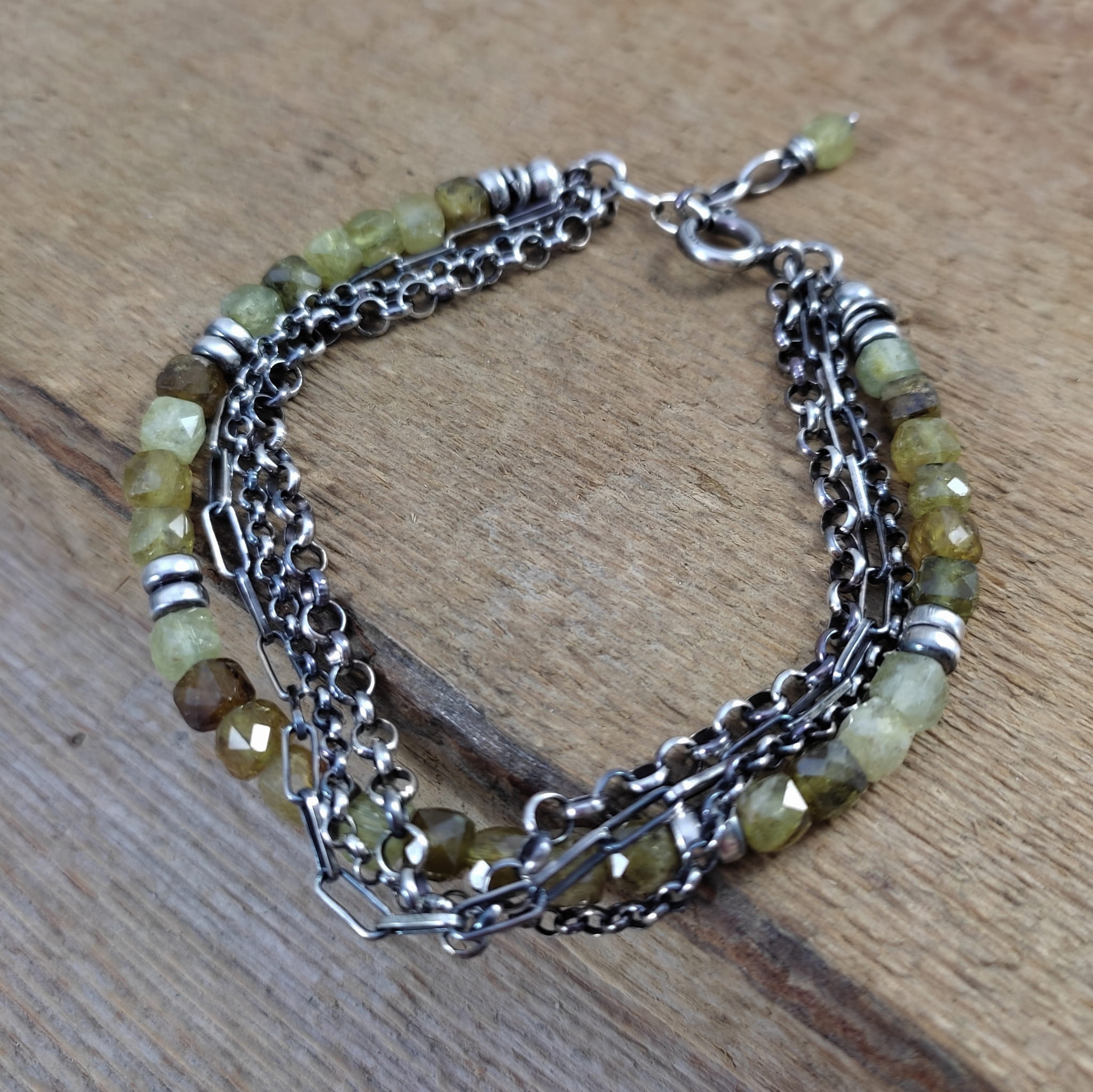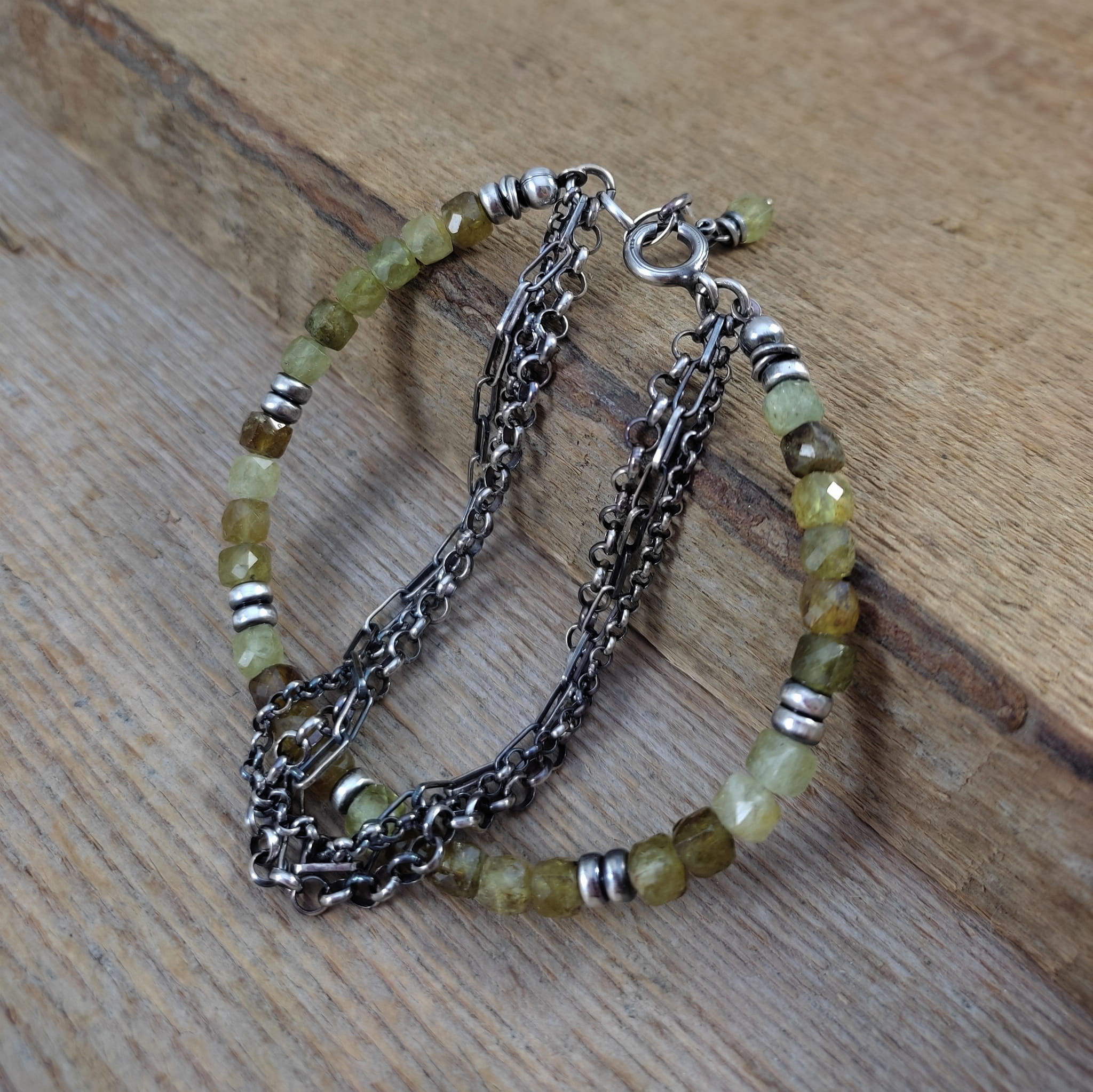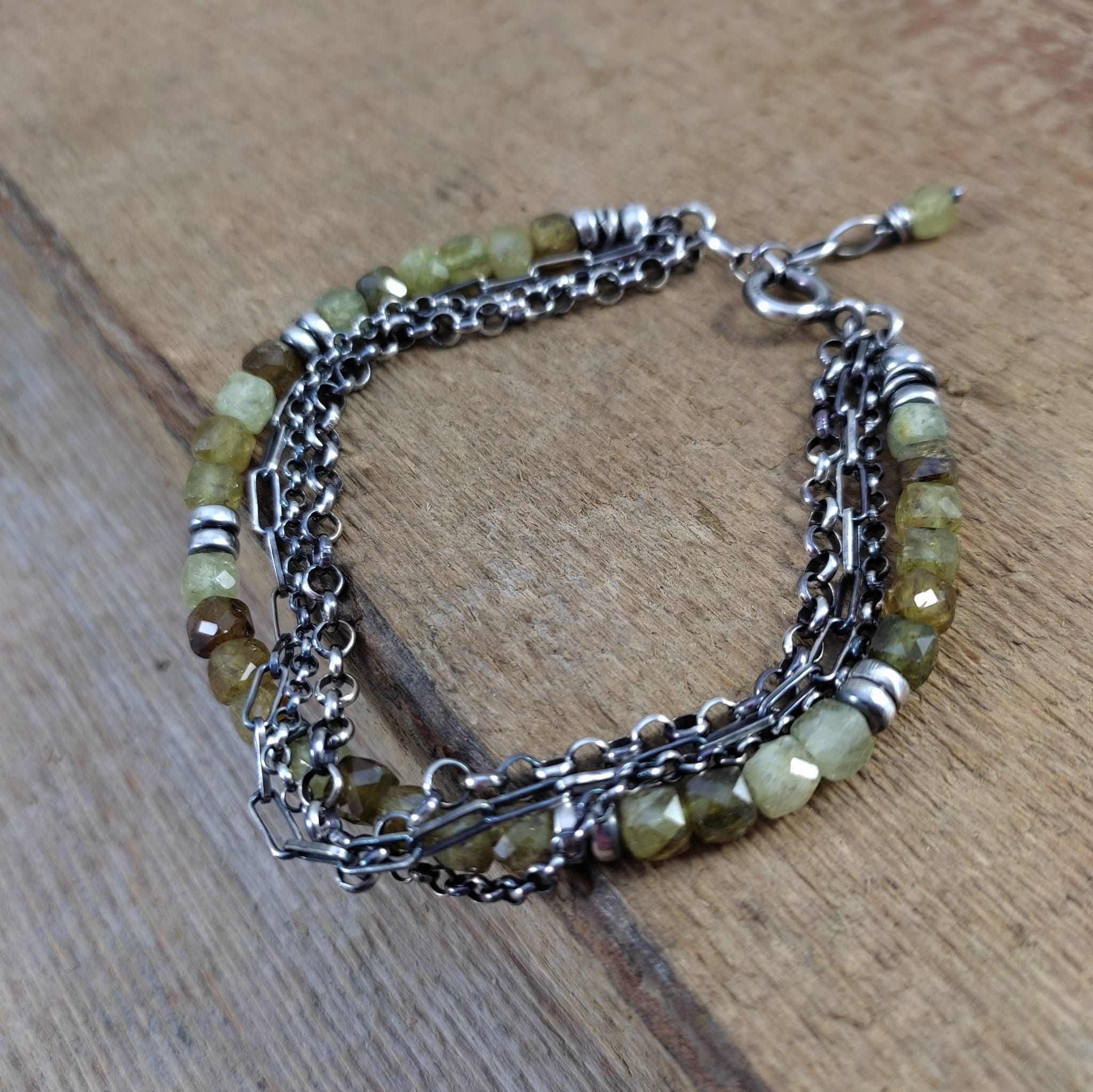 Bransoletka wykonana z fasetowanych sześcianów granatu, grossularu ok. 4 mm. Całość dopełniona srebrem 925, oksydowanym i wypolerowanym.