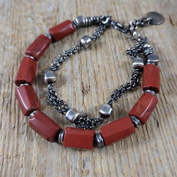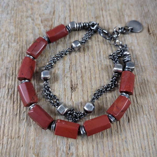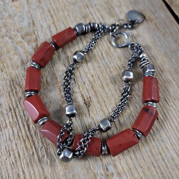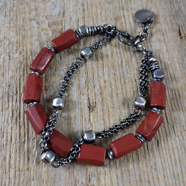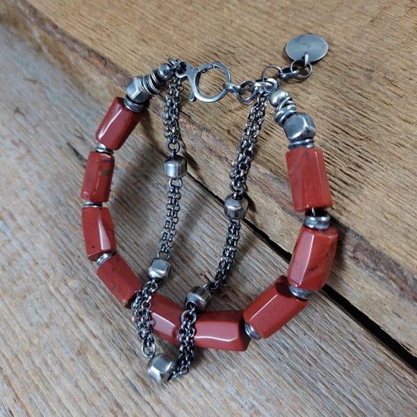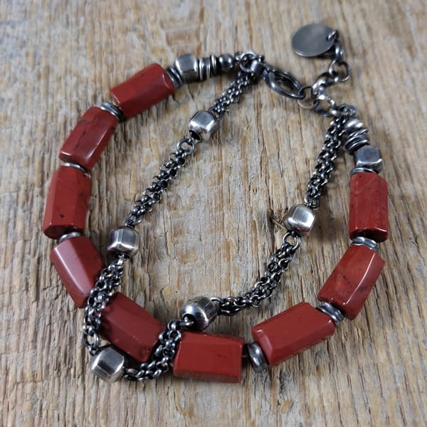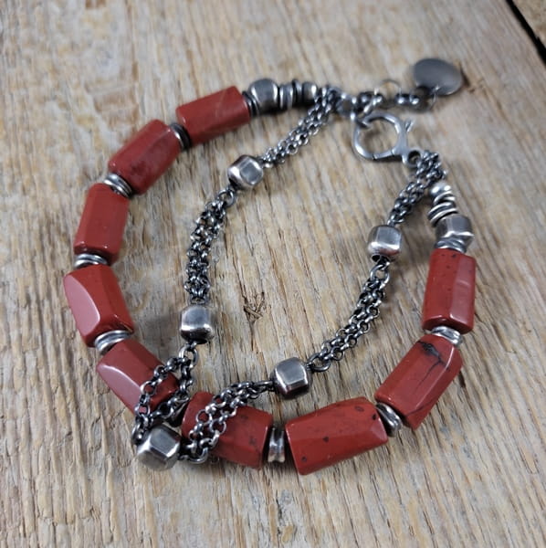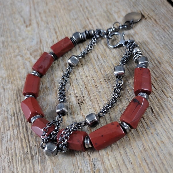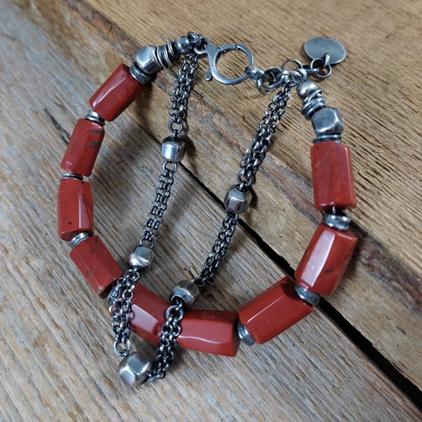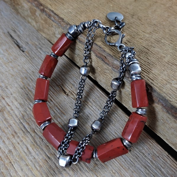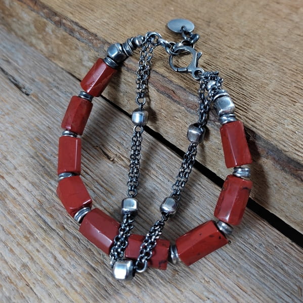 Bransoletka wykonana z nieregularnych bryłek jaspisu ok. 8/12 mm. Całość dopełniona srebrem 925, oksydowanym i wypolerowanym. Długość bransoletki wynosi ok. 18,5 cm, plus łańcuszek regulacyjny ok. 3 cm. Elegancko zapakowana. Kamienie naturalne, surowe, różnią się wielkością i kształtem między sobą, z niedoskonałościami.
