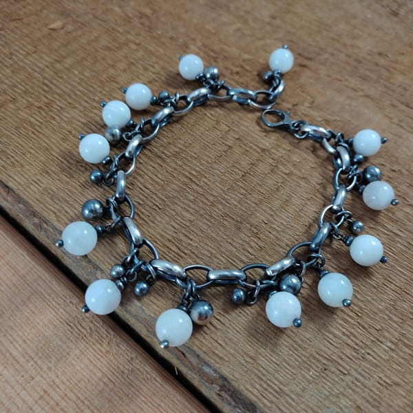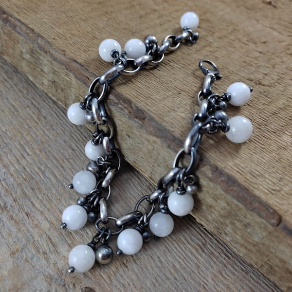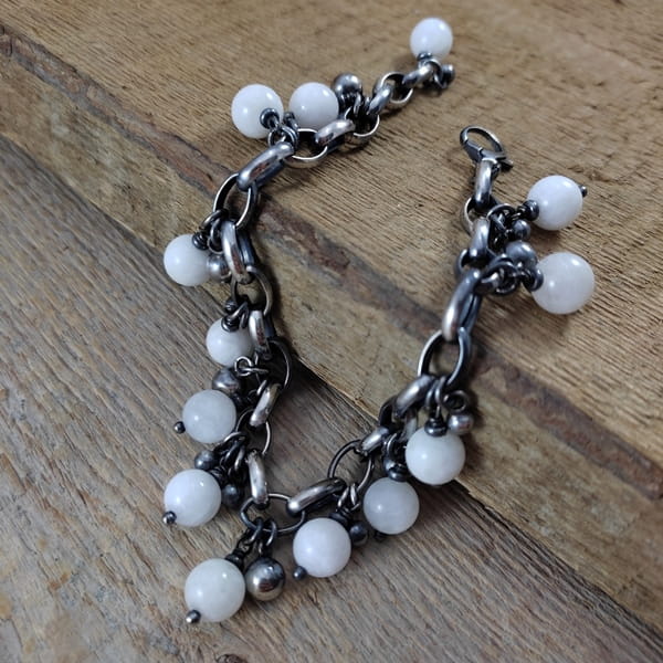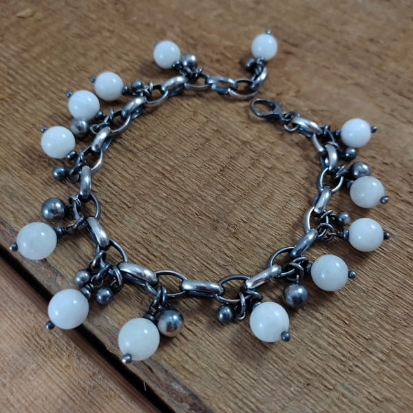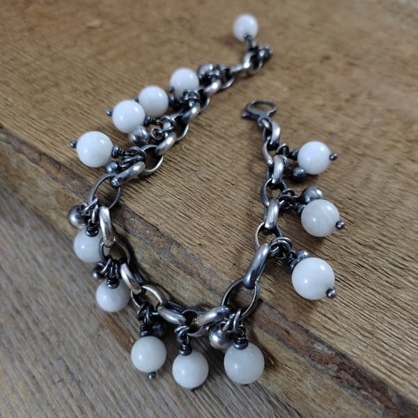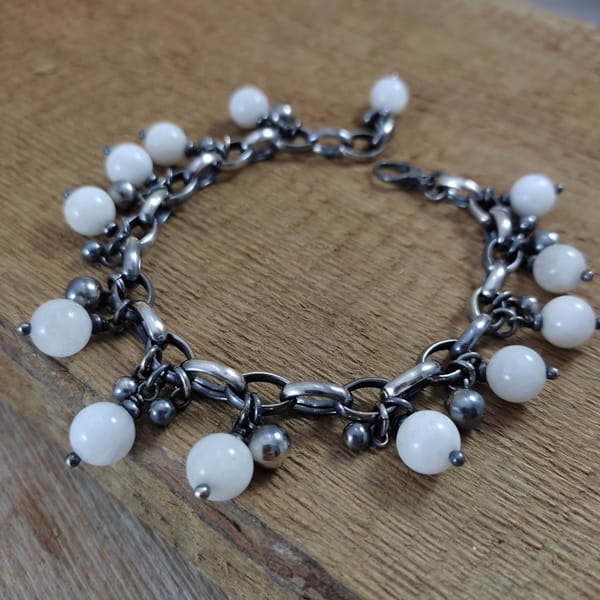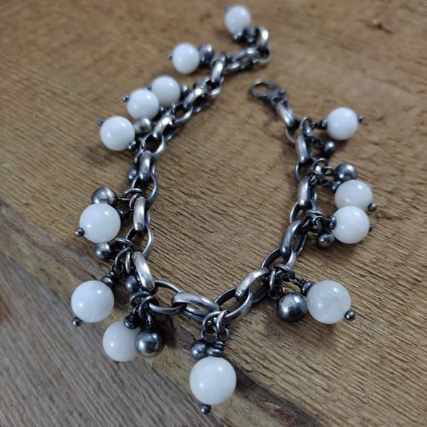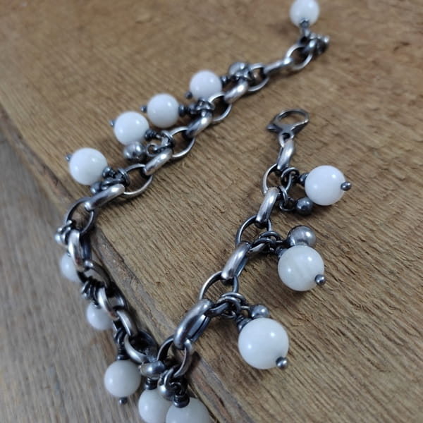 Bransoletka wykonana ze srebra próby 925, oksydowanego i wypolerowanego. Długość bransoletki wynosi ok. 22 cm. Wielkość kul kamienia księżycowego 9 mm, wielkość kul srebrnych 4-6 mm. Elegancko zapakowana.