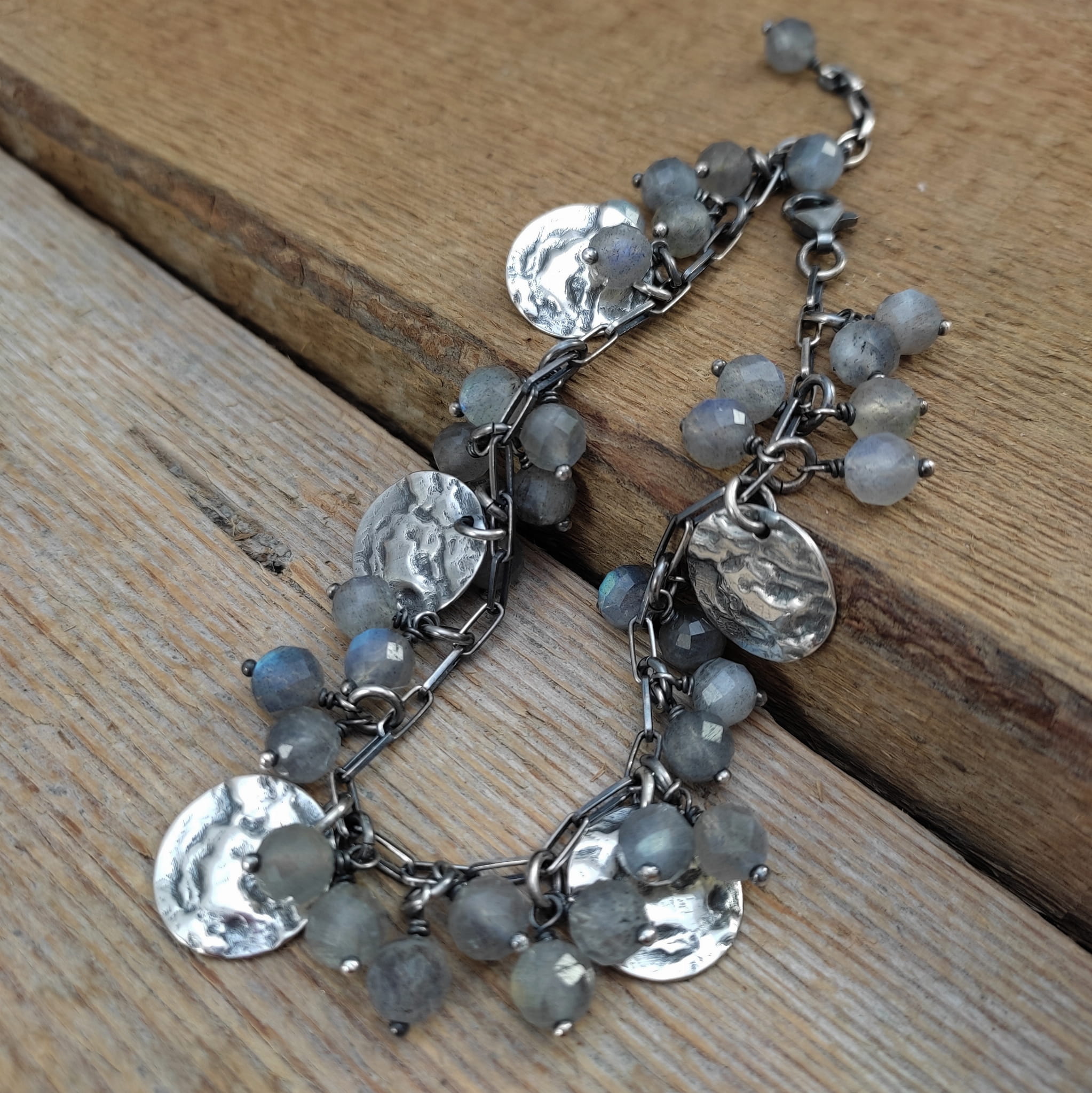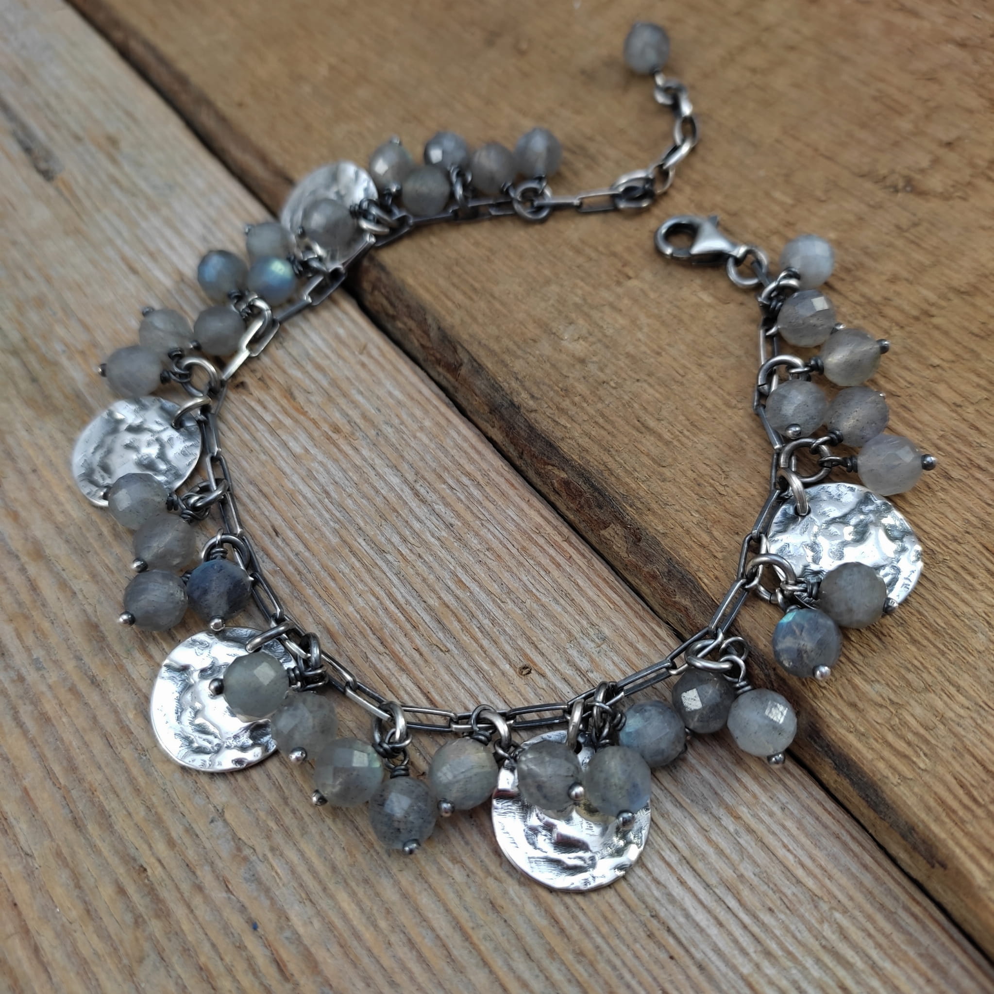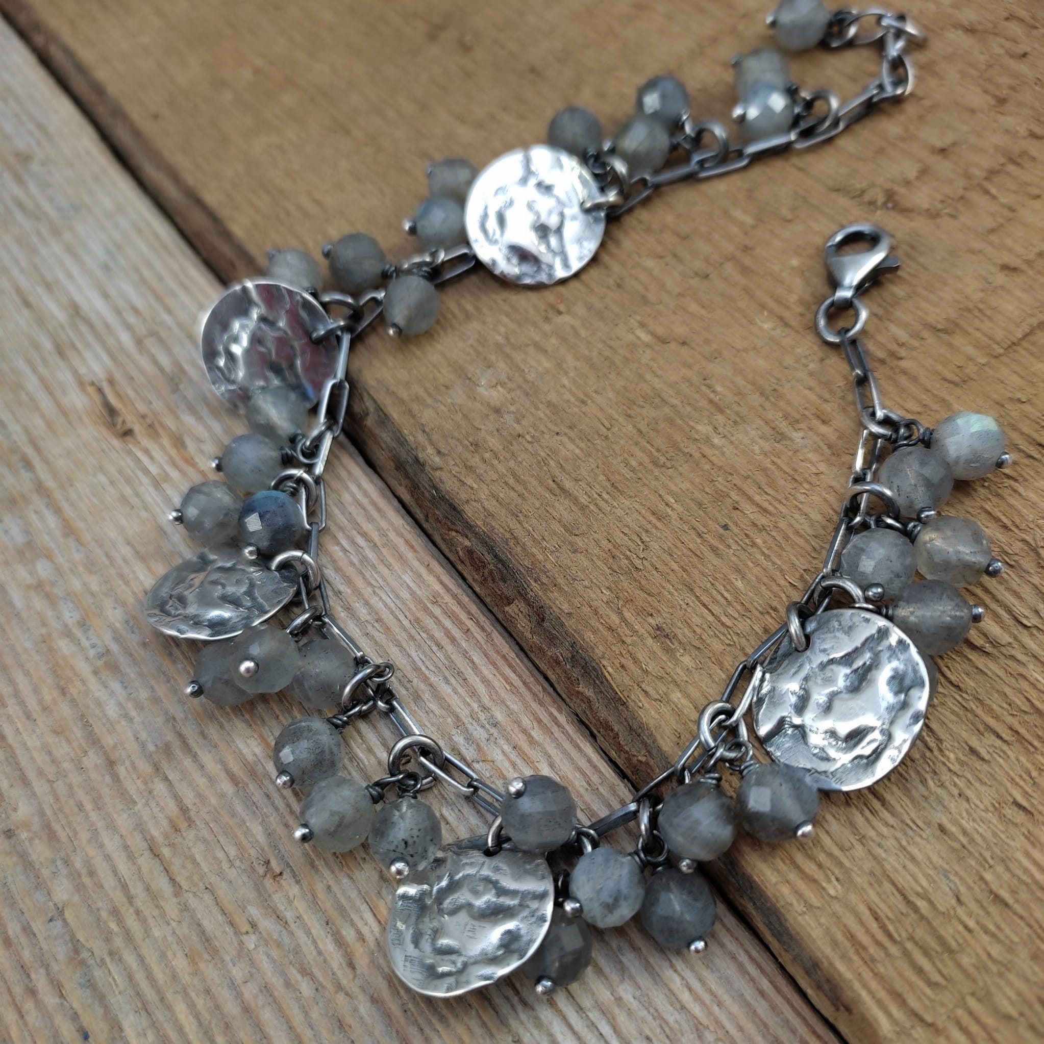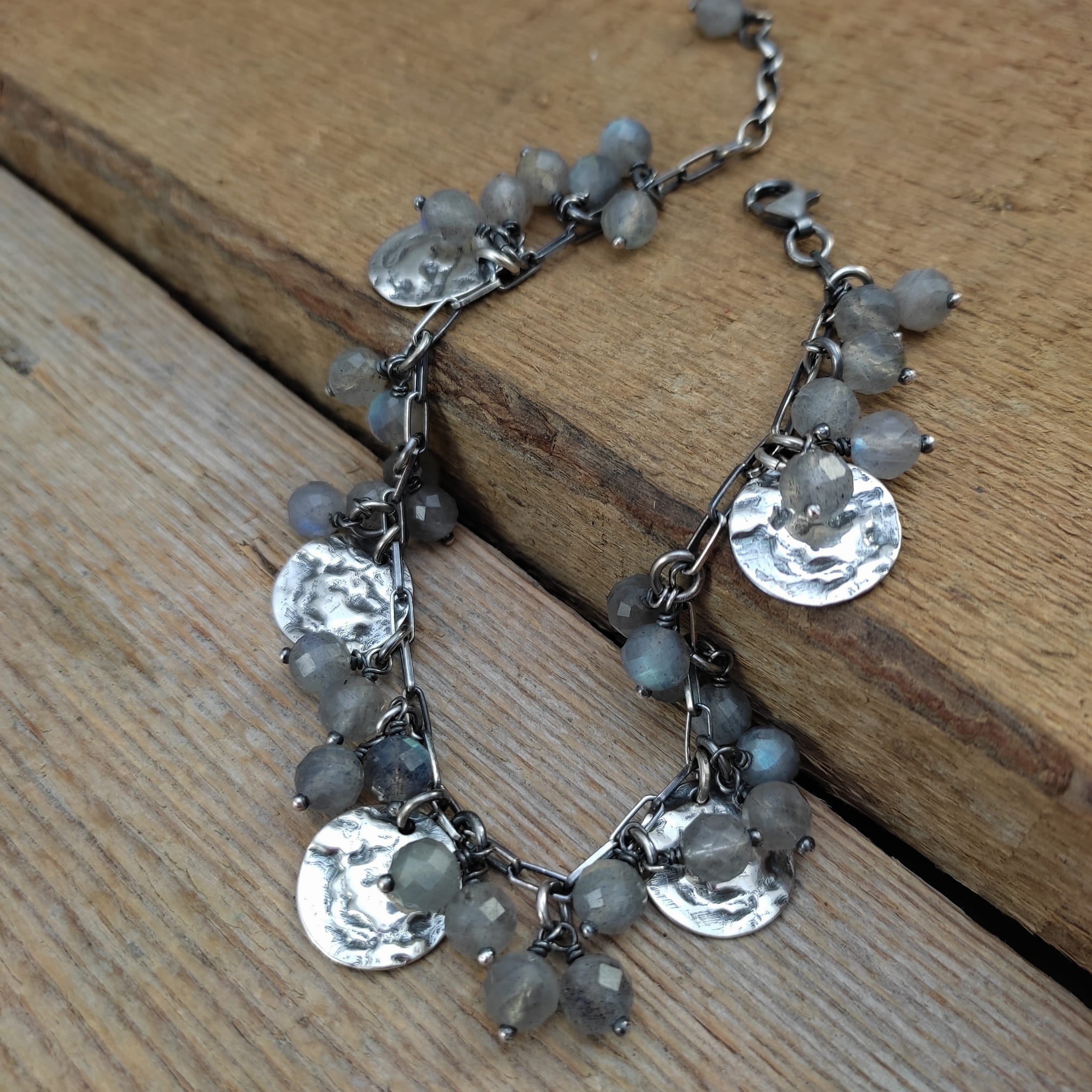 Bransoletka wykonana z fasetowanych kul labradorytu ok. 6 mm. Całość dopełniona srebrem 925, oksydowanym i wypolerowanym.