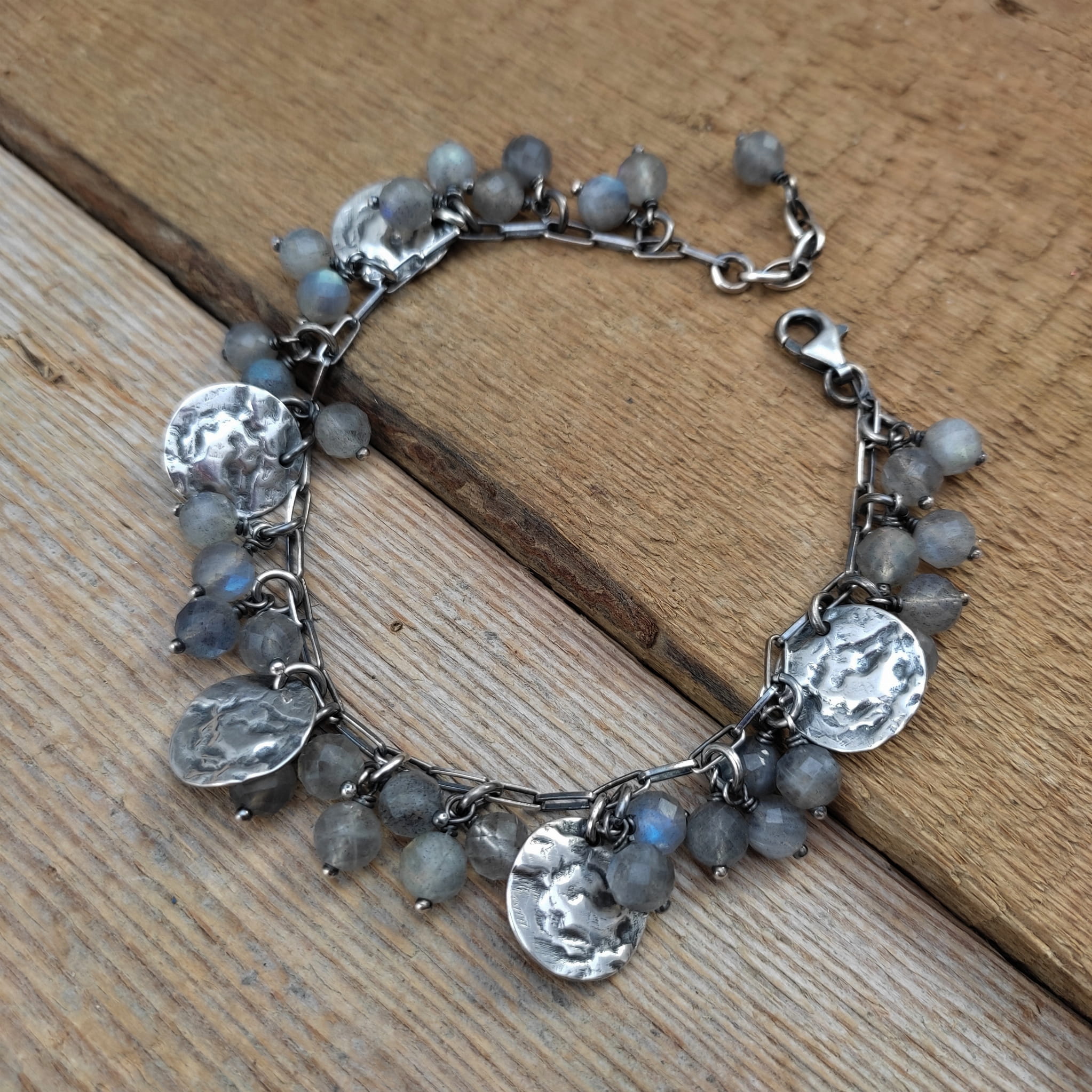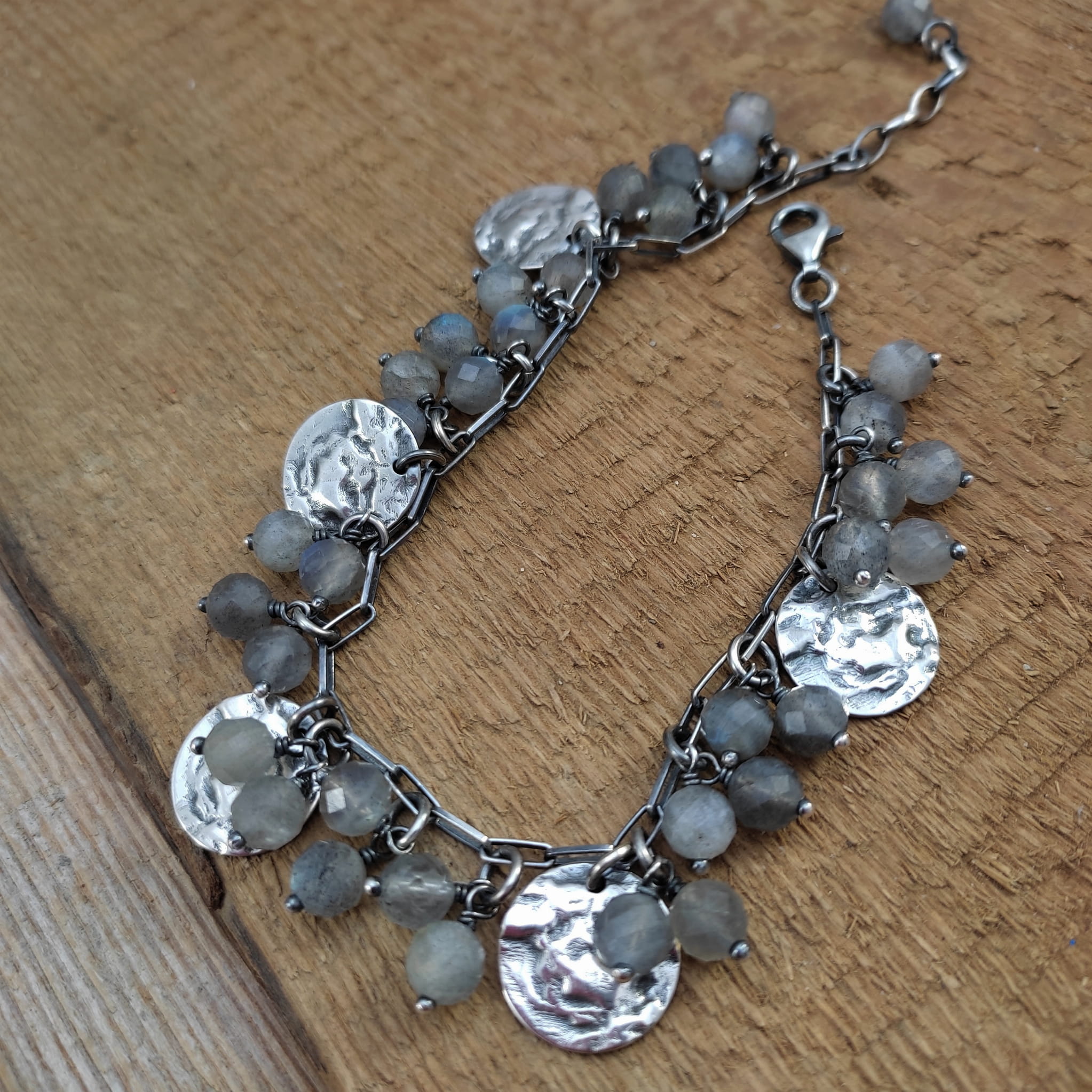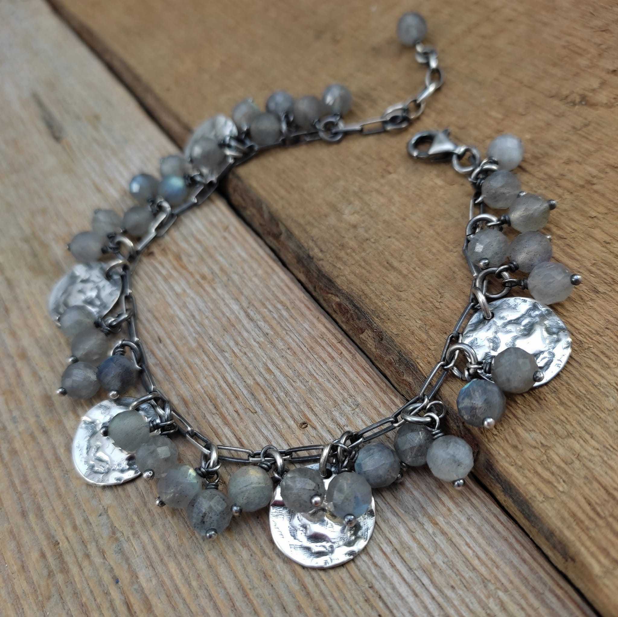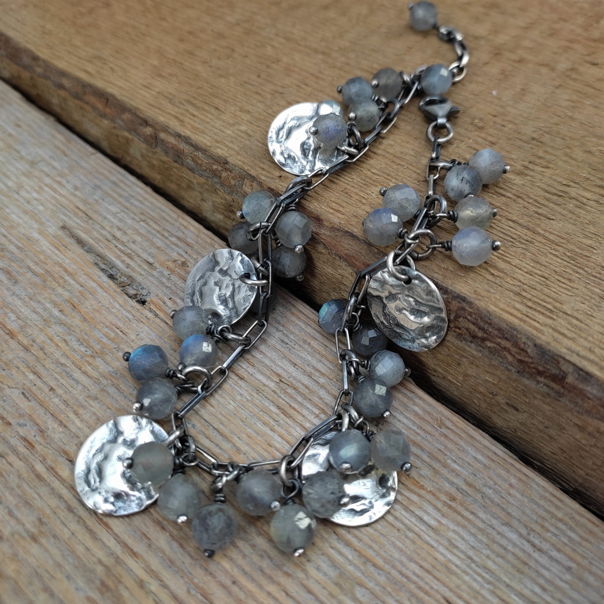 Bransoletka wykonana z fasetowanych kul labradorytu ok. 6 mm. Całość dopełniona srebrem 925, oksydowanym i wypolerowanym.