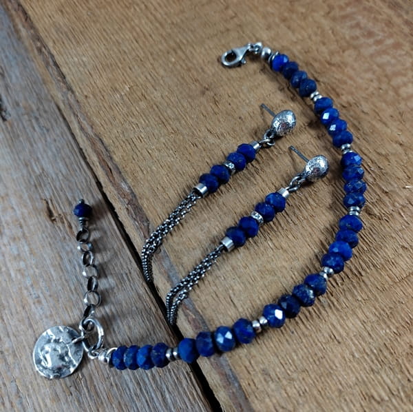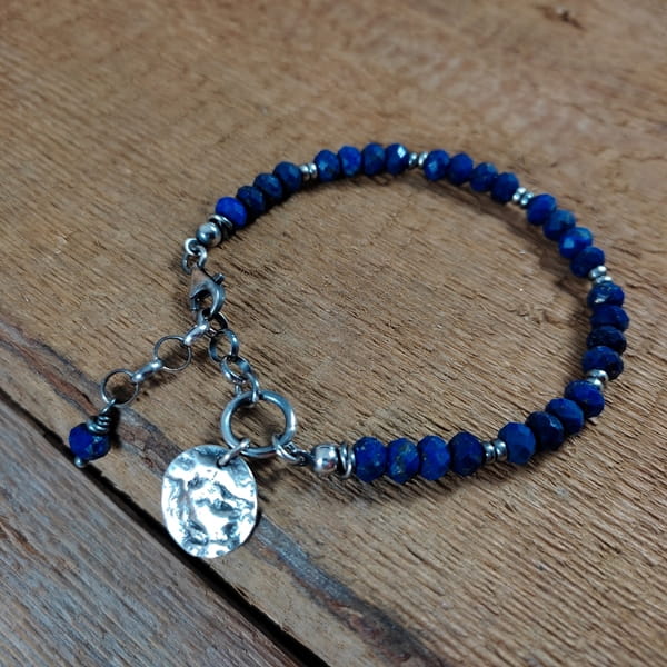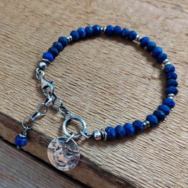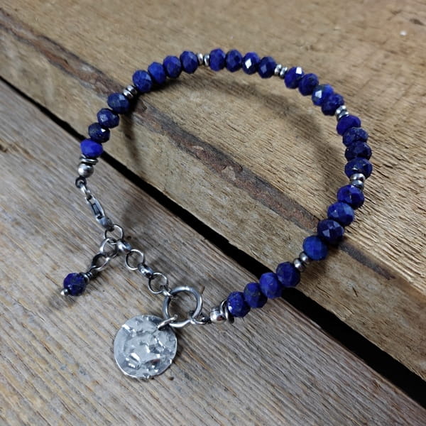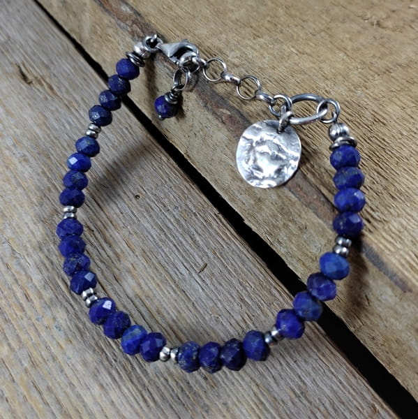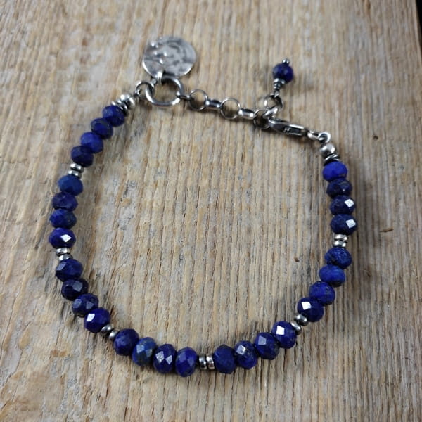 Bransoletka wykonana z fasetowanych oponek Lapis lazuli ok. 6 mm. Całość dopełnia srebro 925, oksydowane i wypolerowane. Długość bransoletki wynosi 18 cm, plus łańcuszek regulacyjny 3 cm, obwód regulowany od 18 do 21 cm. Elegancko zapakowana.