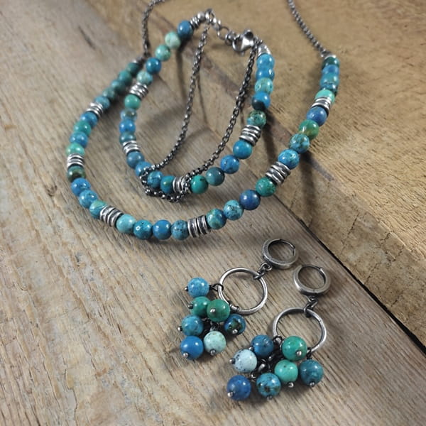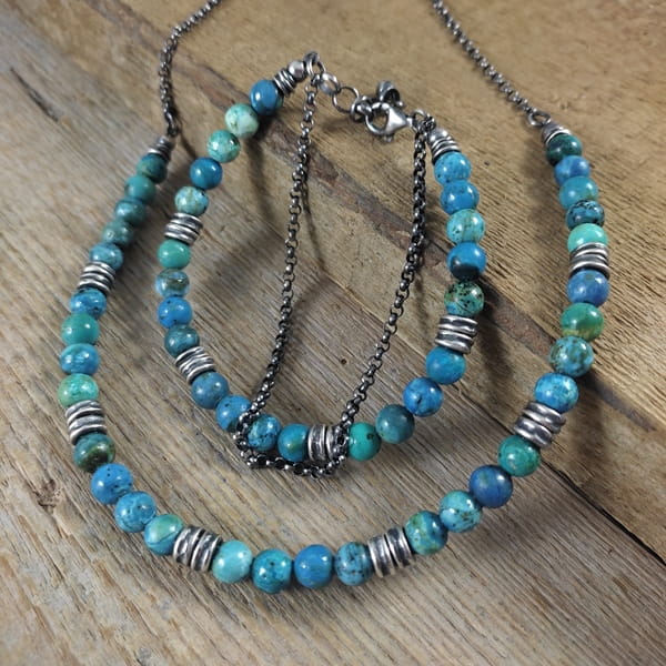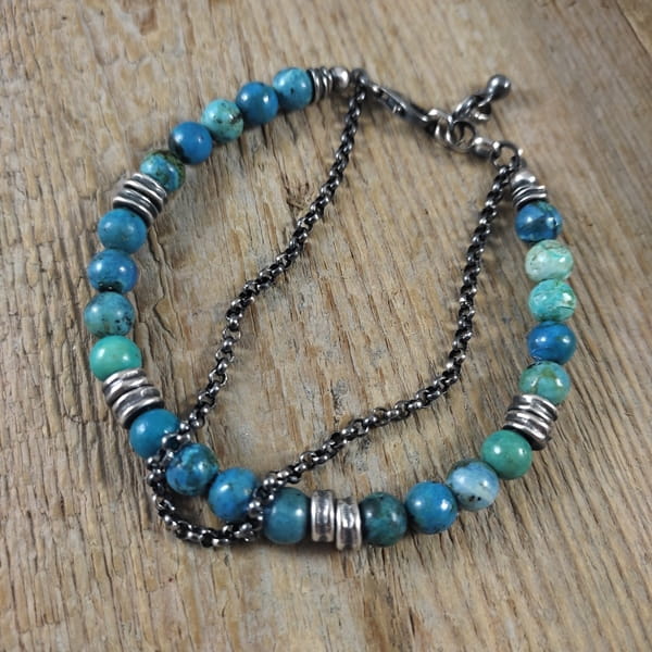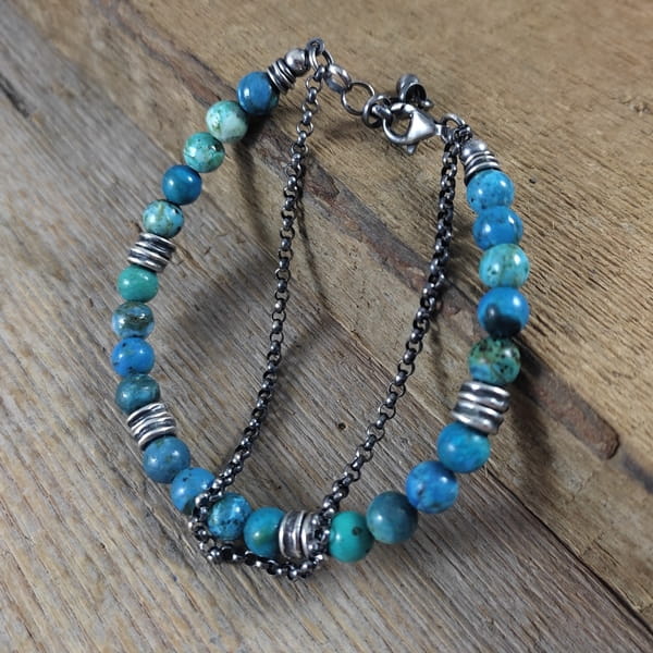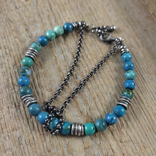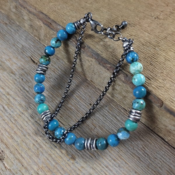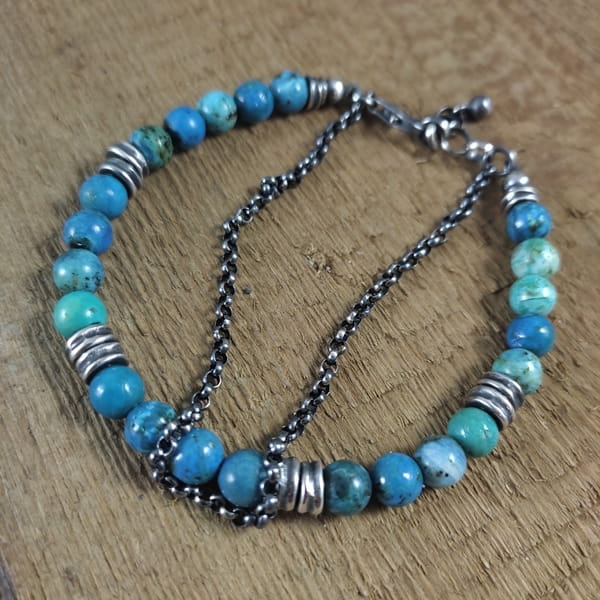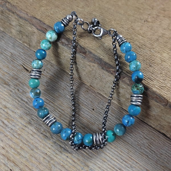 Bransoletka wykonana z kul opalu ok. 6,5 mm. Całość dopełniona srebrem 925, oksydowanym i wypolerowanym.
