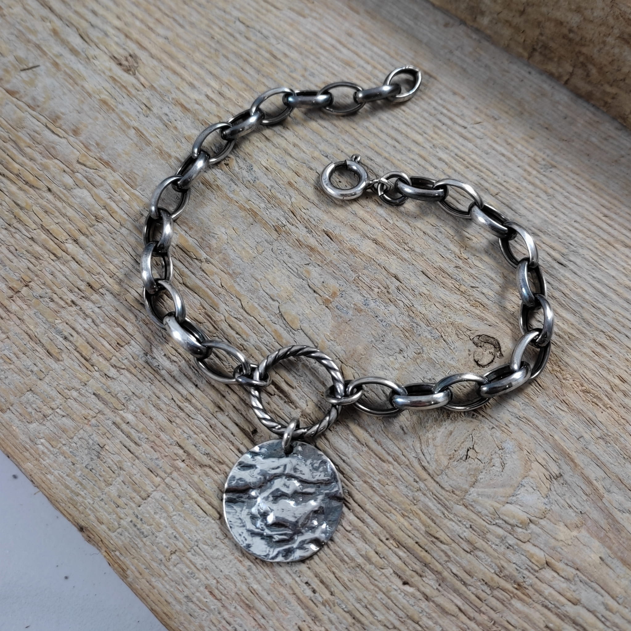 Bransoletka z surową, ale elegancką zawieszką w postaci gniecionego koła o średnicy 19 mm. Wielkości ogniwek łańcucha wynoszą 7/10 mm. Długość bransoletki to ok. 23 cm. Pasuje na nadgarstek 16,5-19 cm. Bransoletka została wykonana w całości ze srebra 925, srebro oksydowane. Zapakowane w eleganckie pudełko.