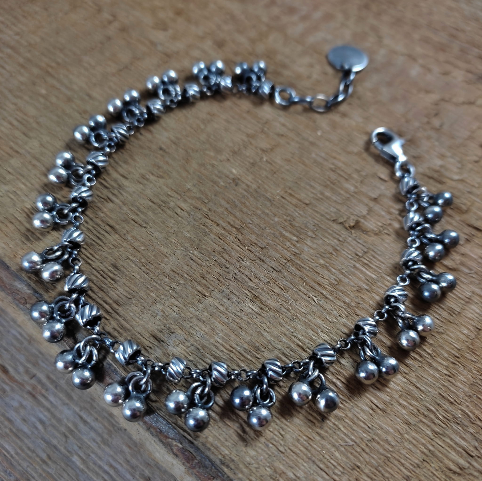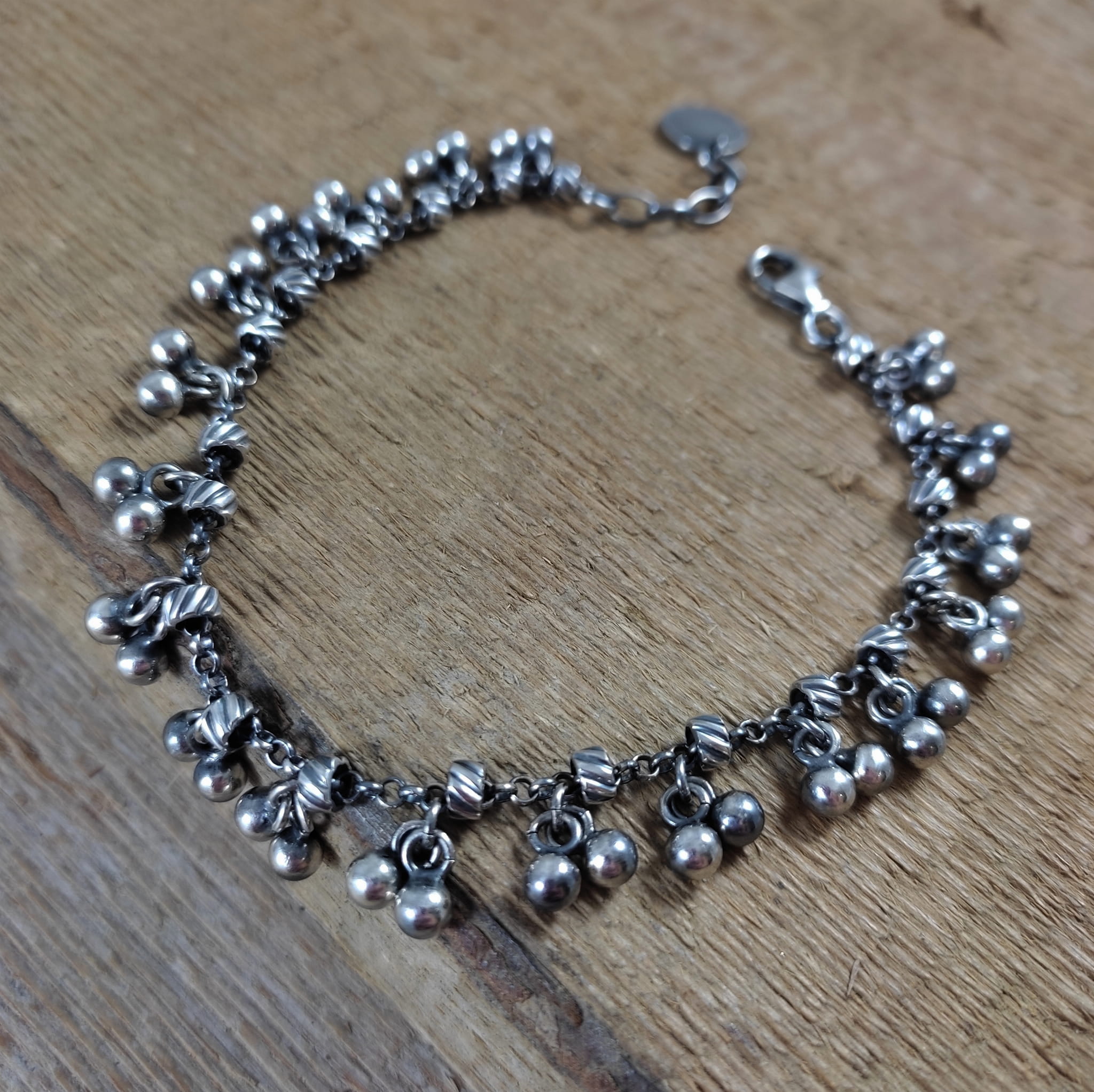 Bransoletka wykonana ze srebra próby 925, oksydowanego i wypolerowanego.