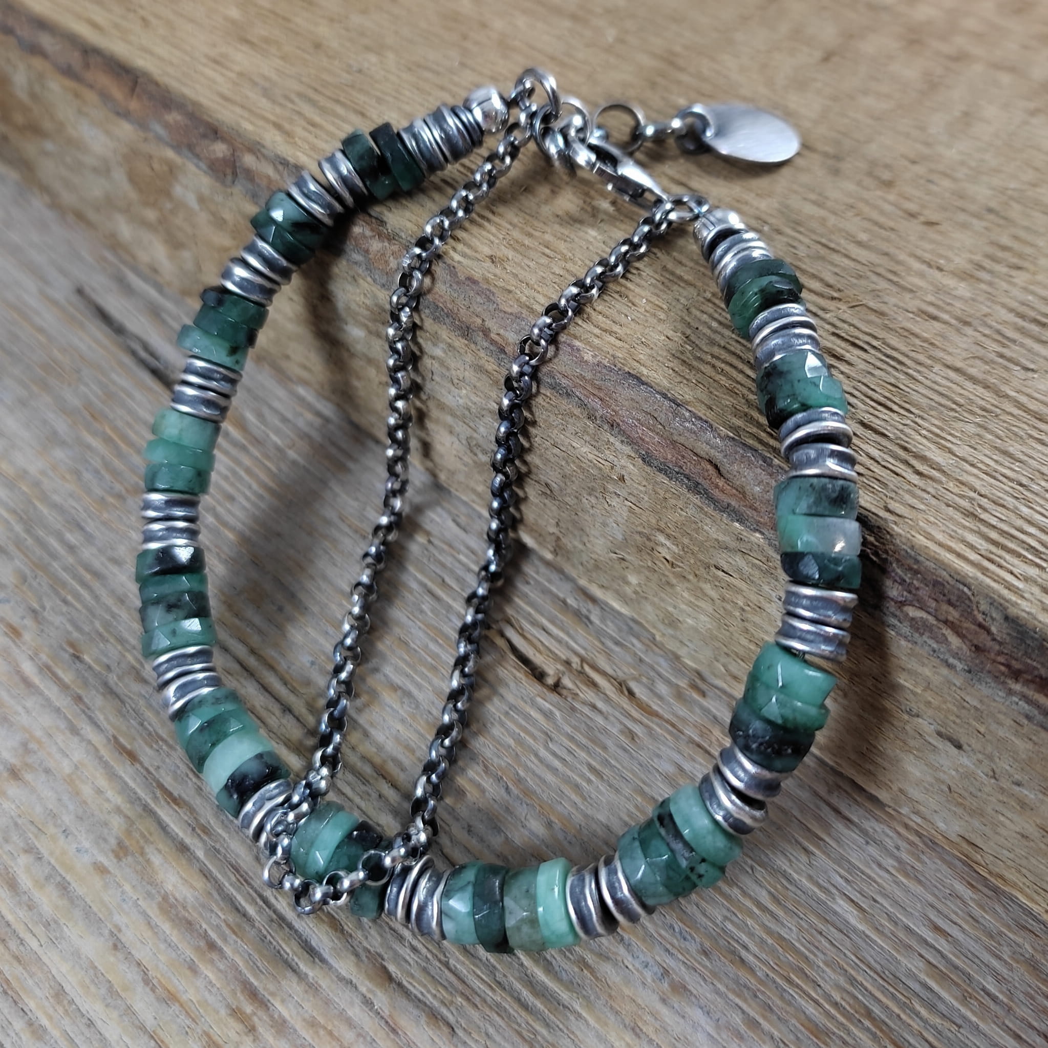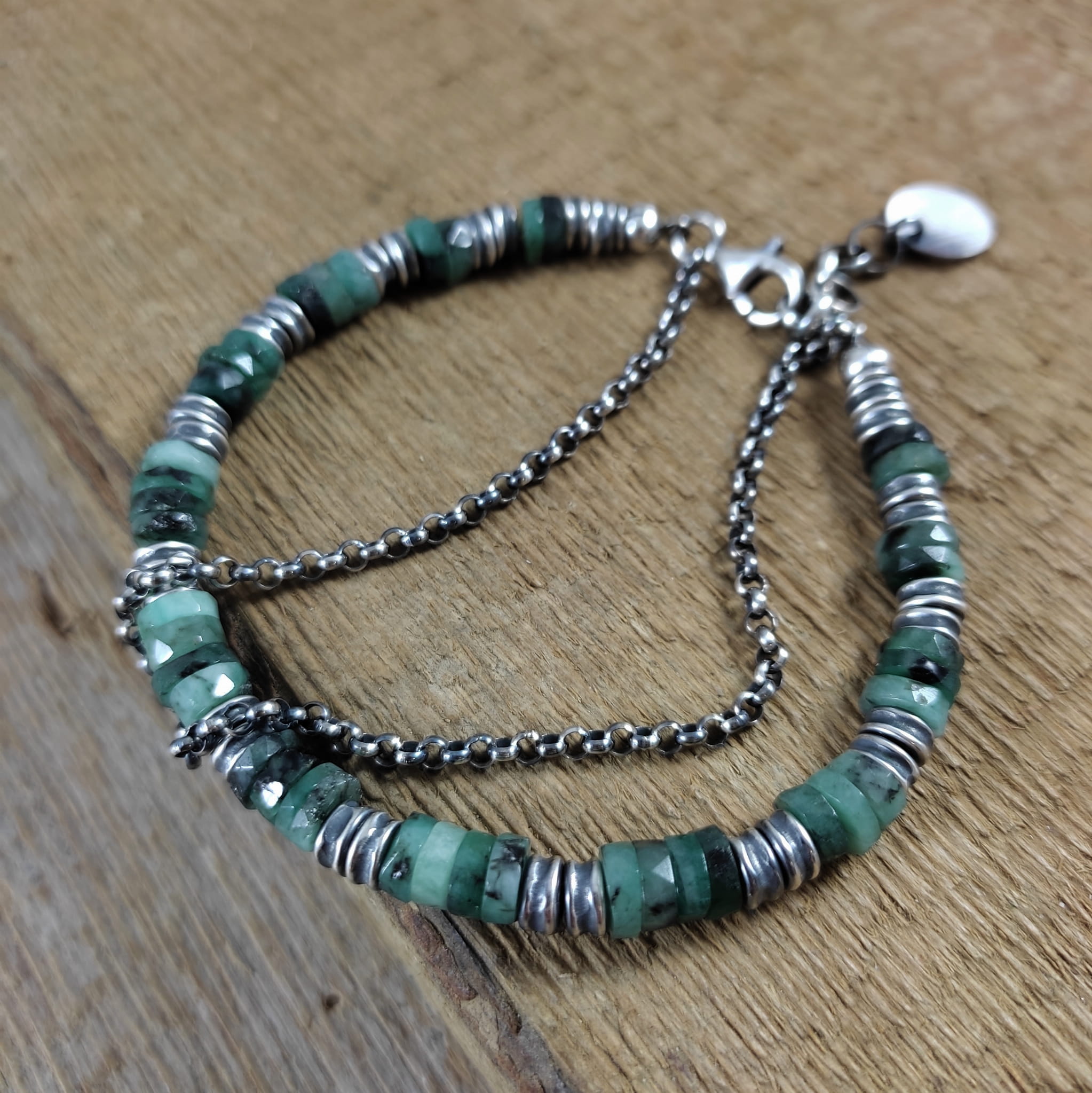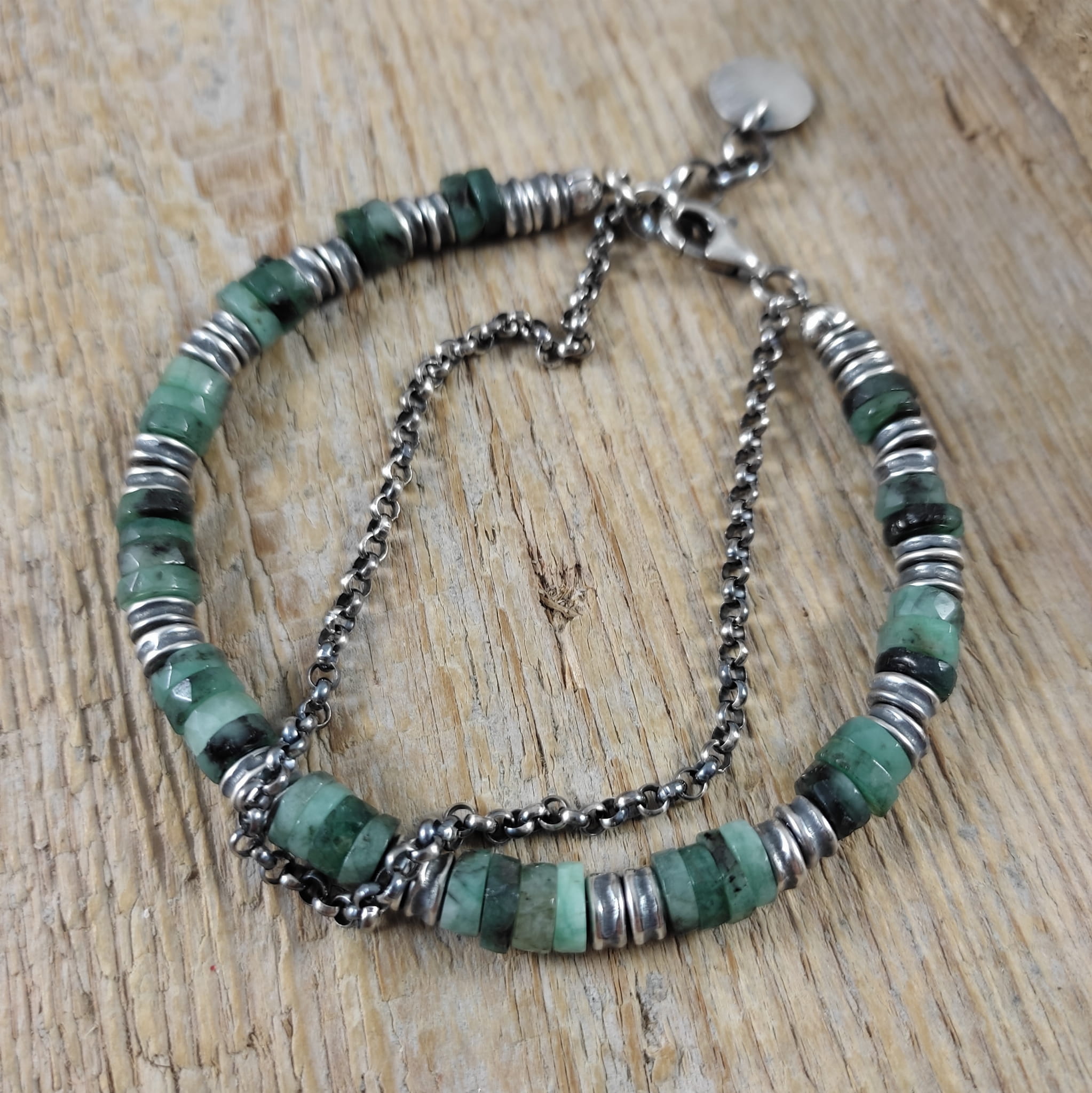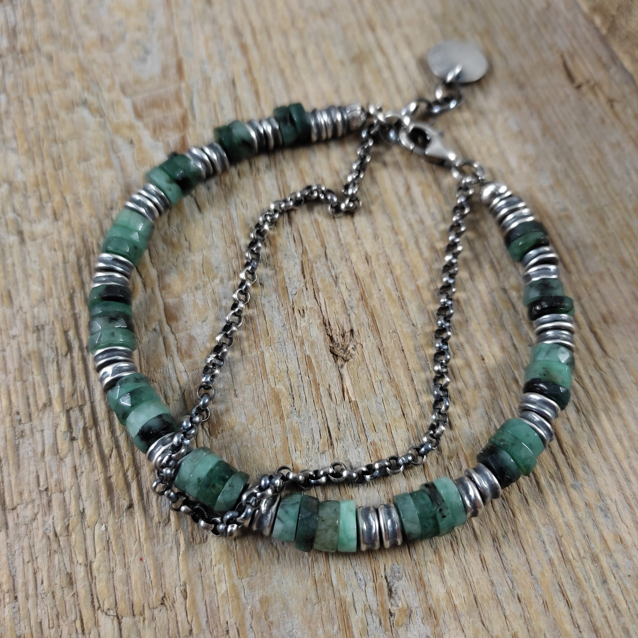 Bransoletka wykonana z talarków szmaragdu ok. 6 mm. Całość dopełniona srebrem 925, oksydowanym i wypolerowanym.