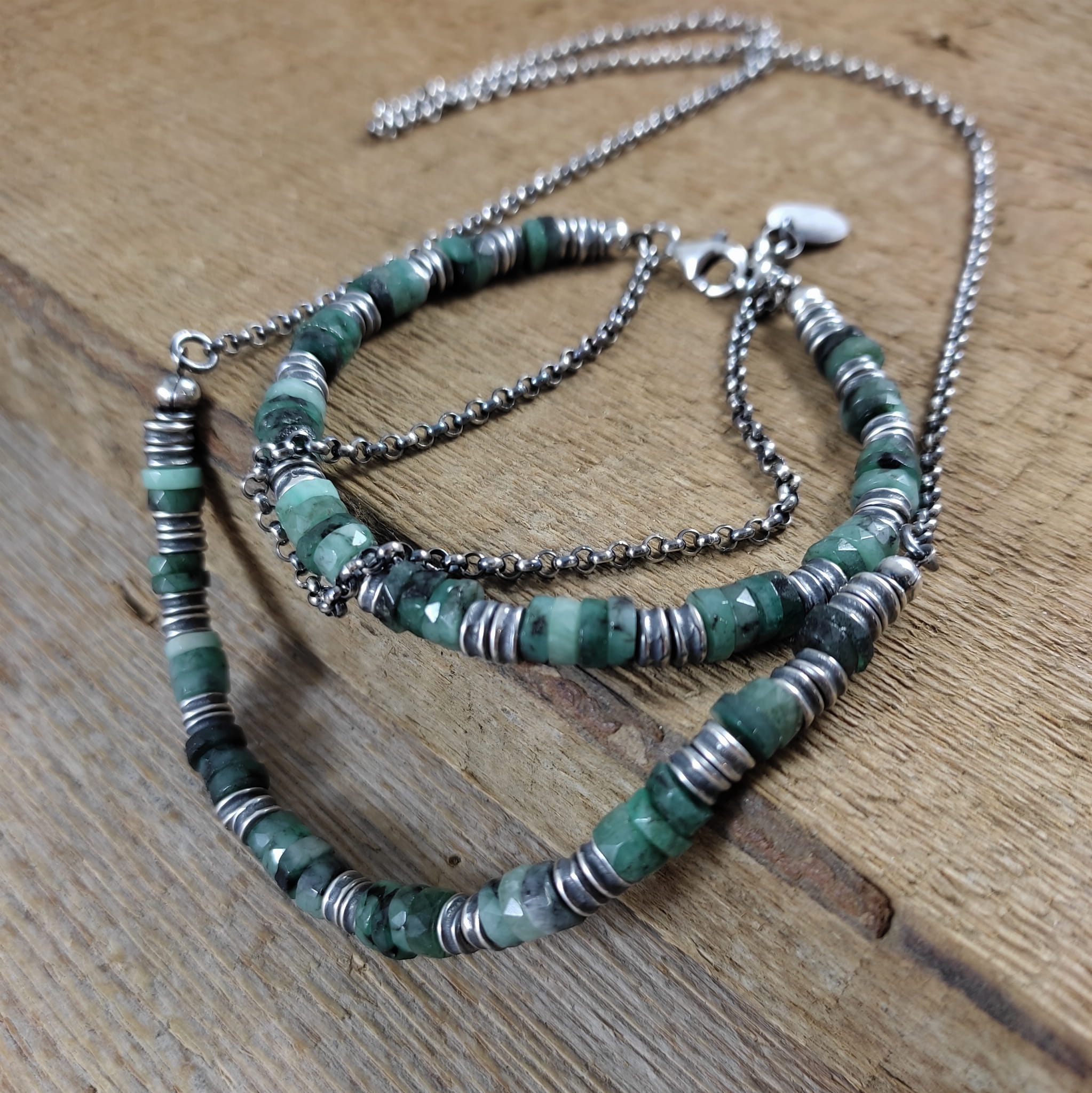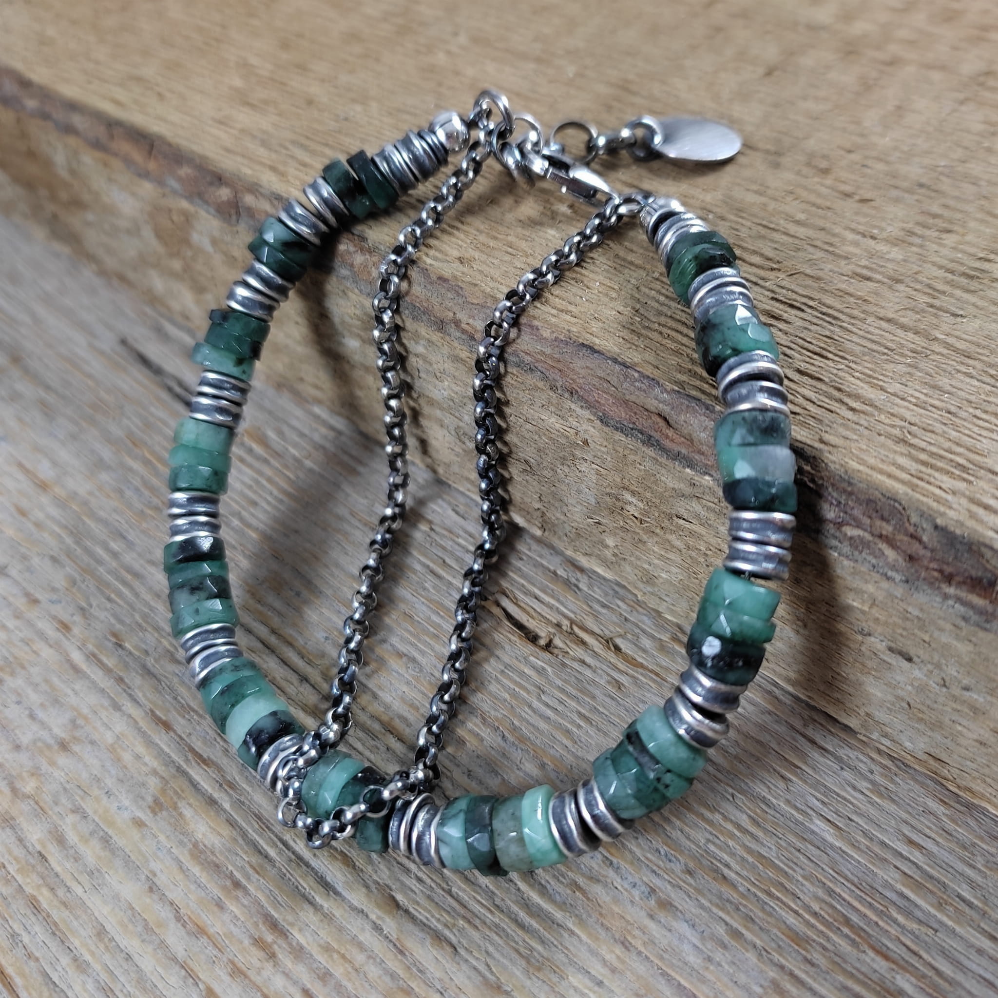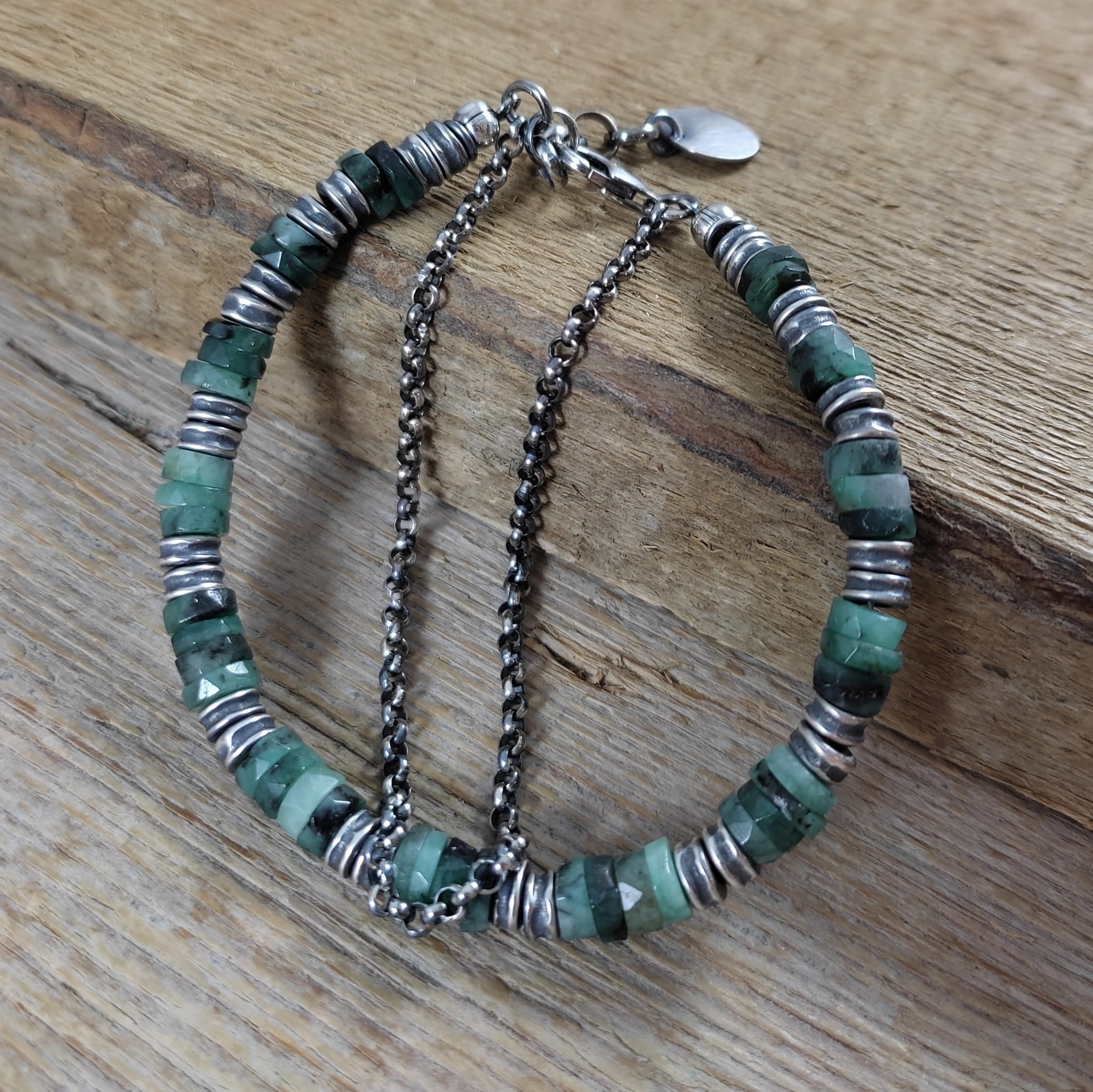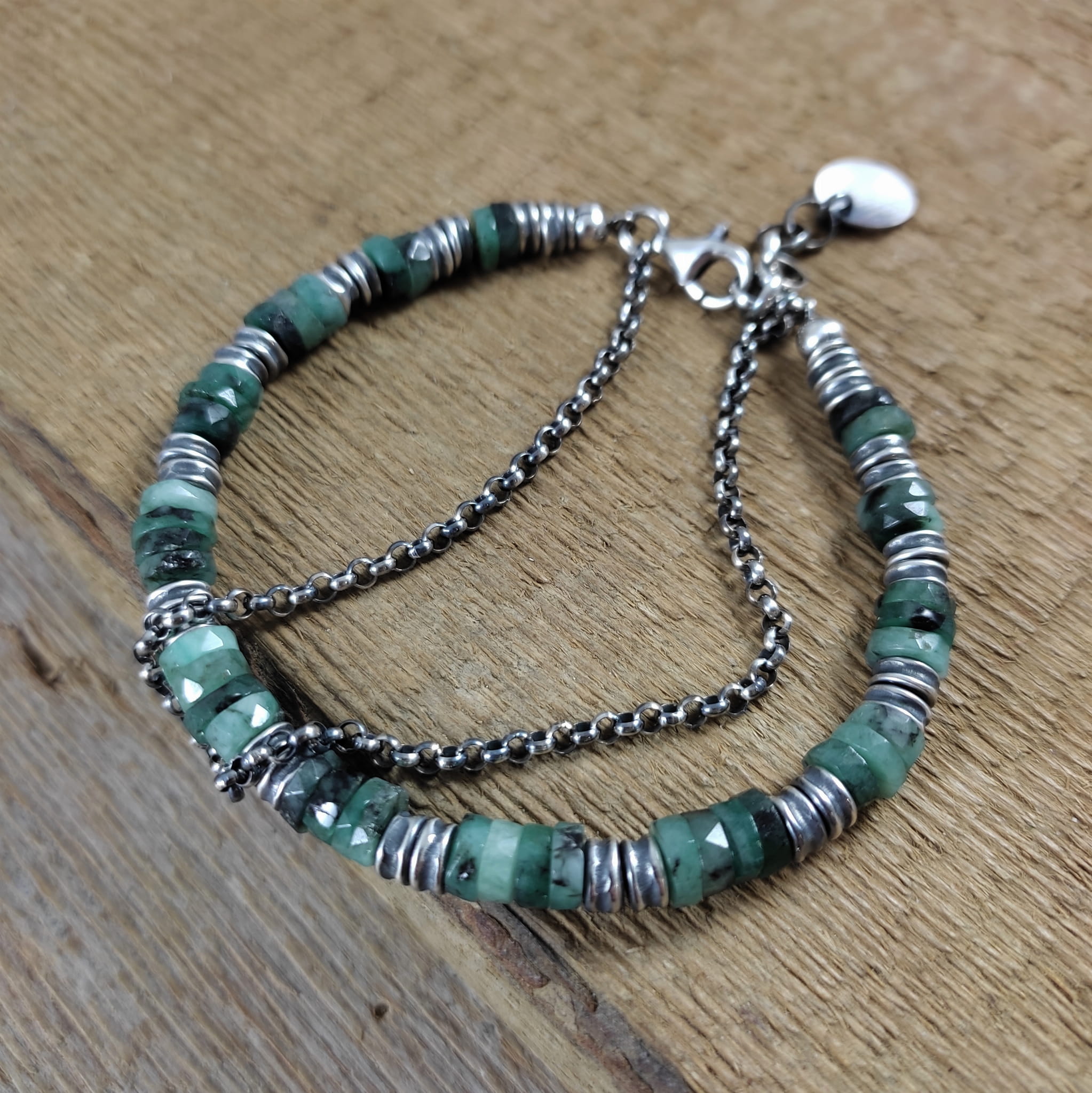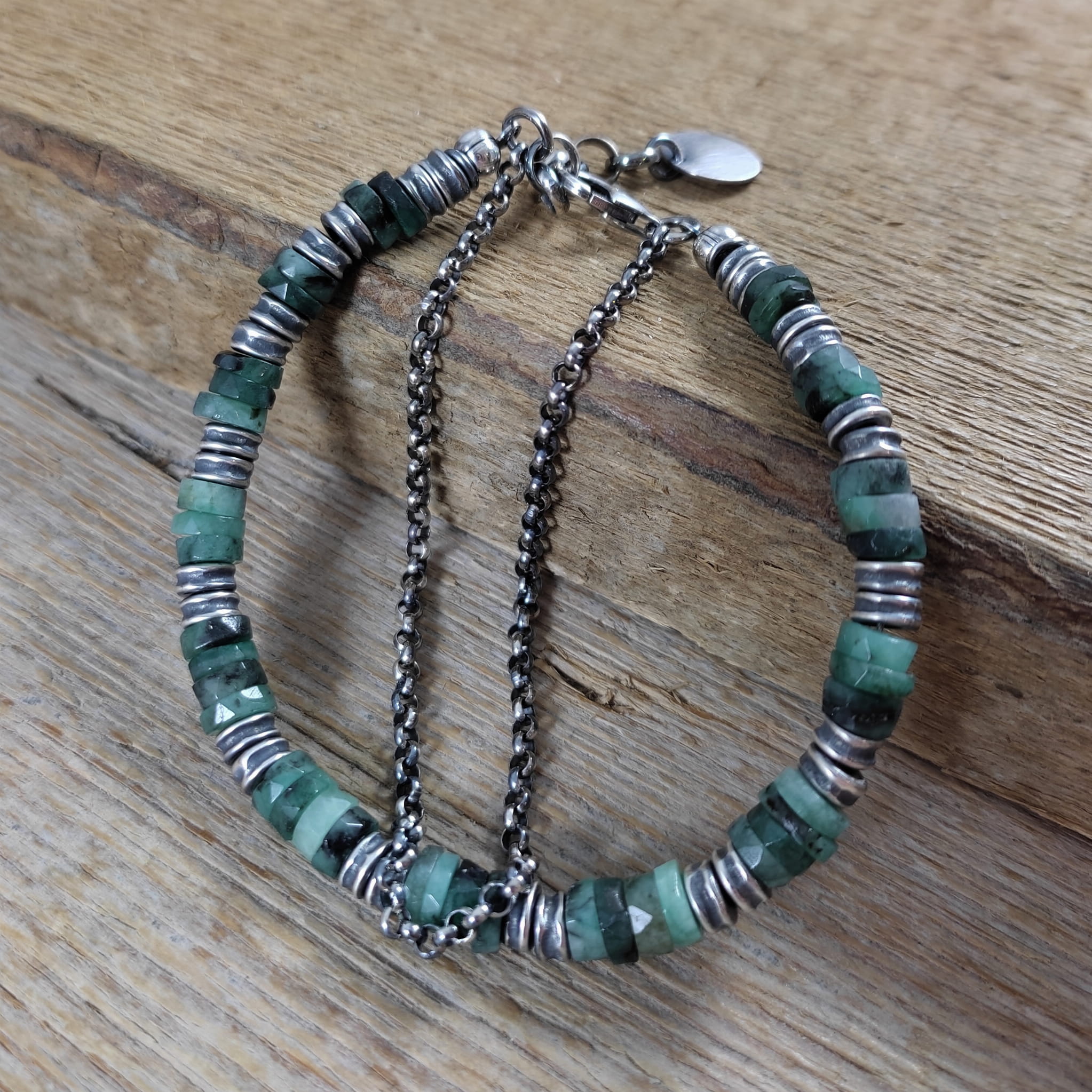 Bransoletka wykonana z talarków szmaragdu ok. 6 mm. Całość dopełniona srebrem 925, oksydowanym i wypolerowanym.