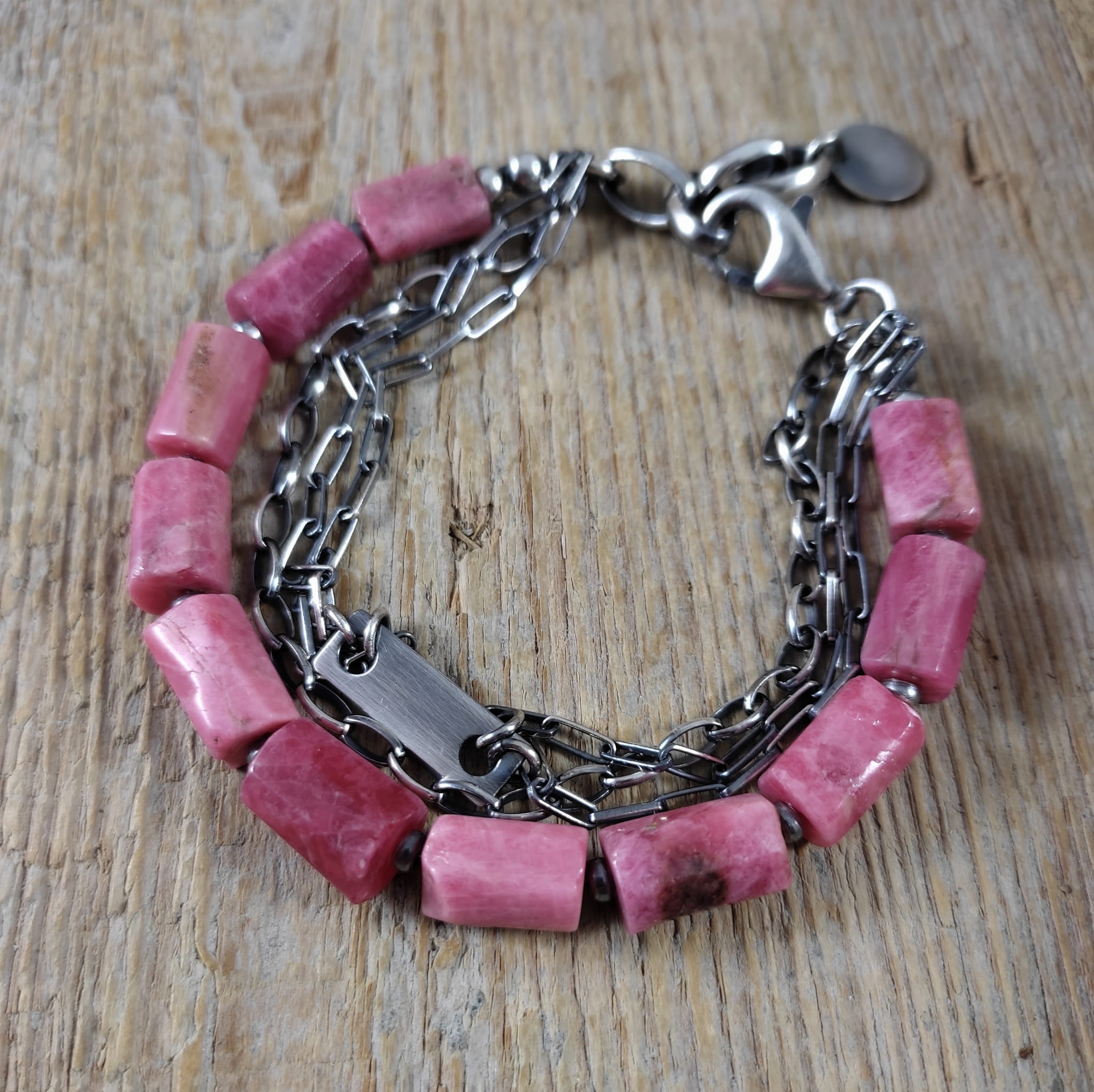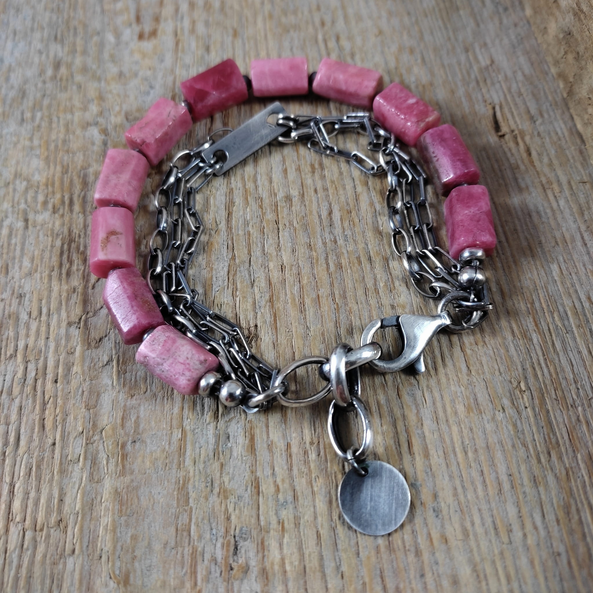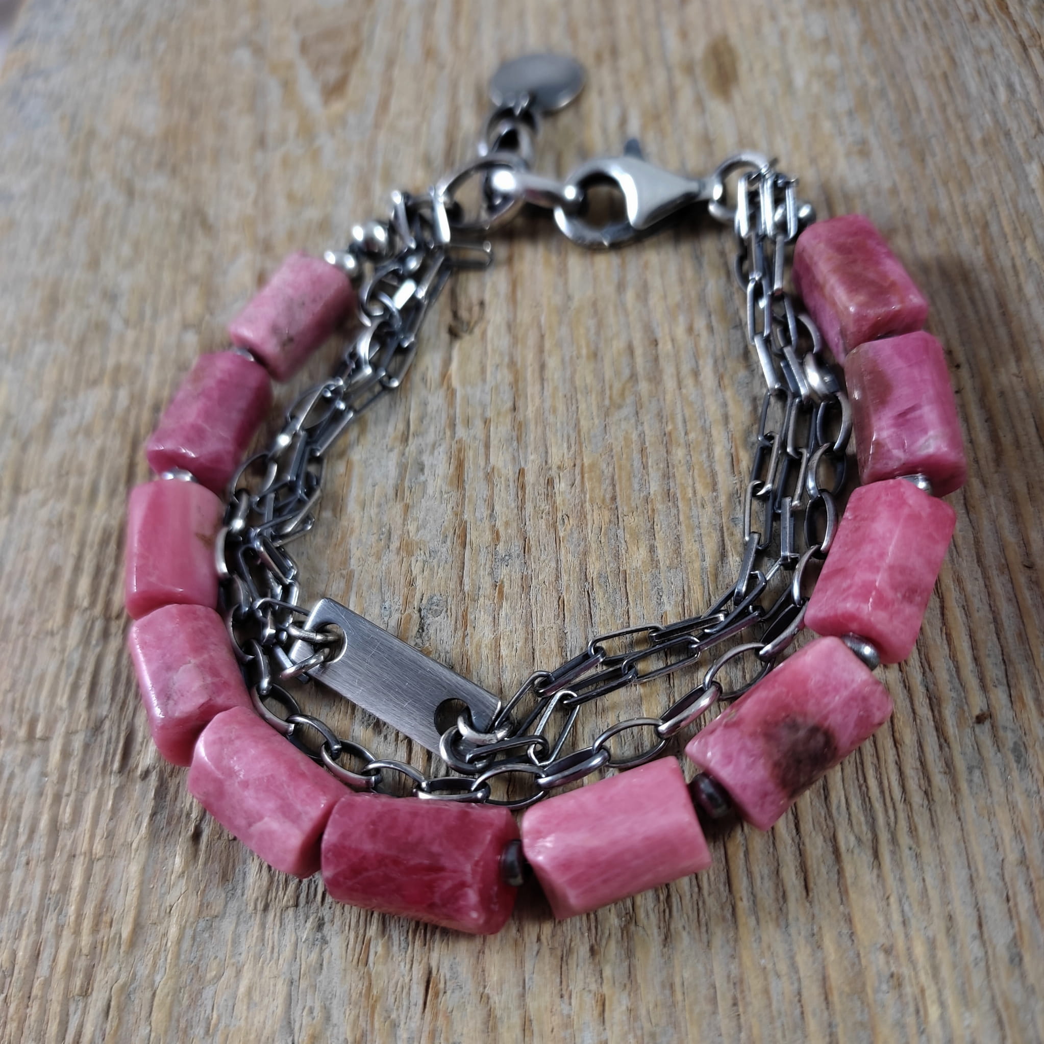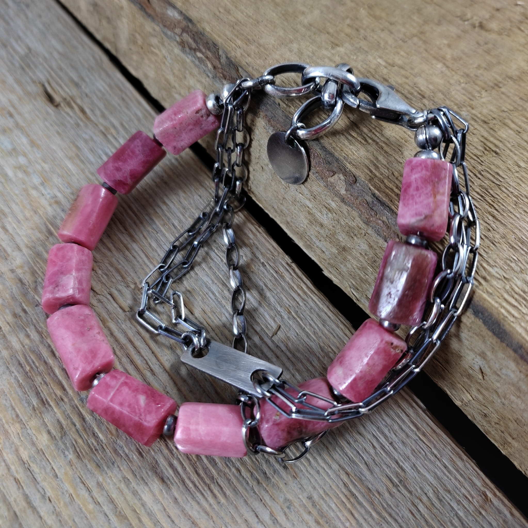Bransoletka wykonana z surowych bryłek thulitu (różowa odmiana zoisytu) 8/10 mm. Całość dopełniona srebrem 925, oksydowanym i wypolerowanym. Długość bransoletki wynosi 19 cm, plus łańcuszek regulacyjny 3 cm. Elegancko zapakowana.