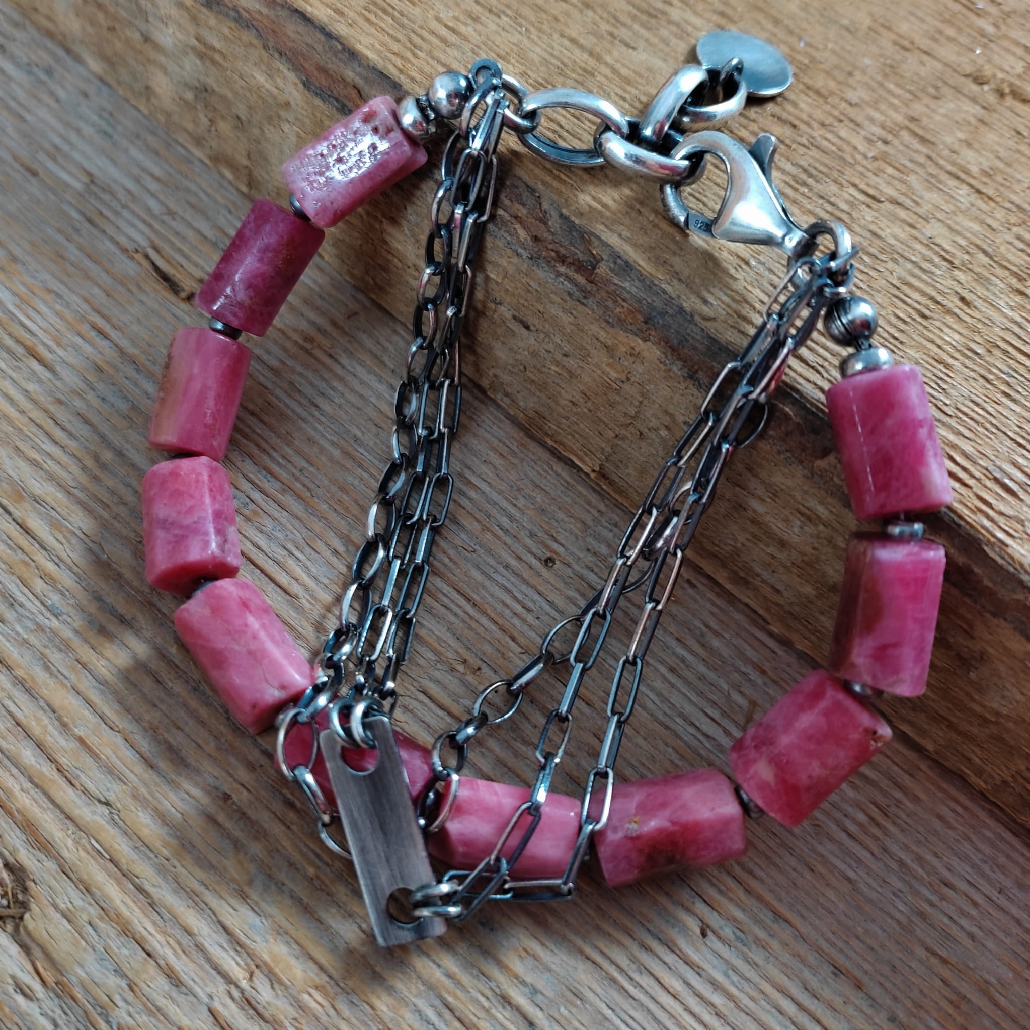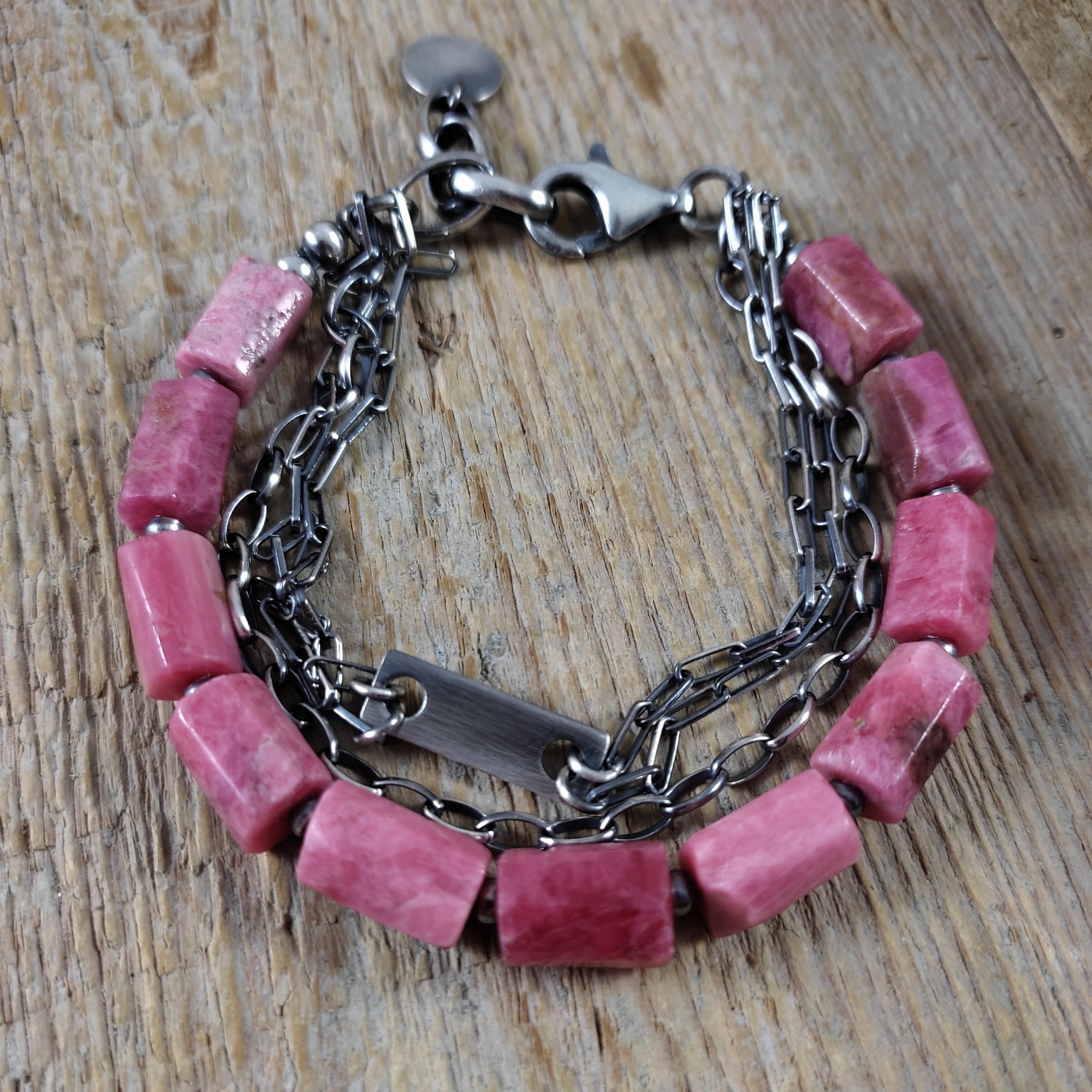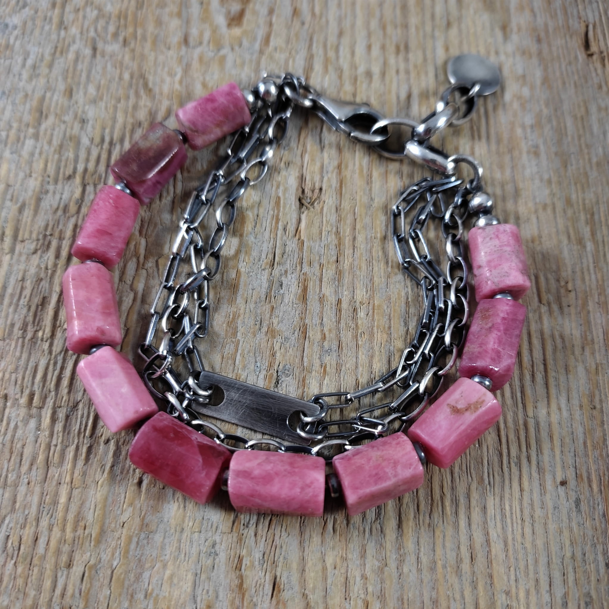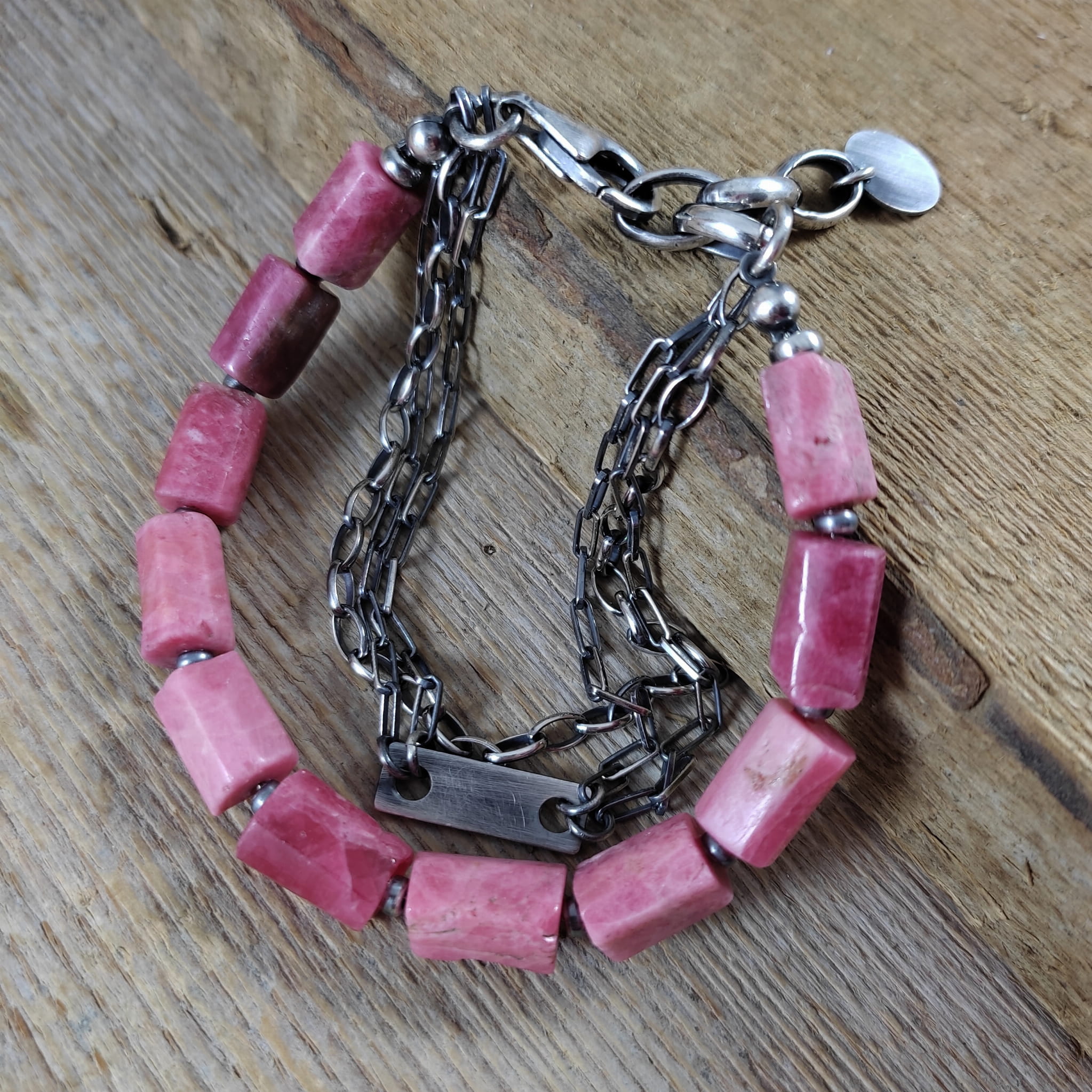 Bransoletka wykonana z surowych bryłek thulitu (różowa odmiana zoisytu) 8/10 mm. Całość dopełniona srebrem 925, oksydowanym i wypolerowanym. Długość bransoletki wynosi 19 cm, plus łańcuszek regulacyjny 3 cm. Elegancko zapakowana.