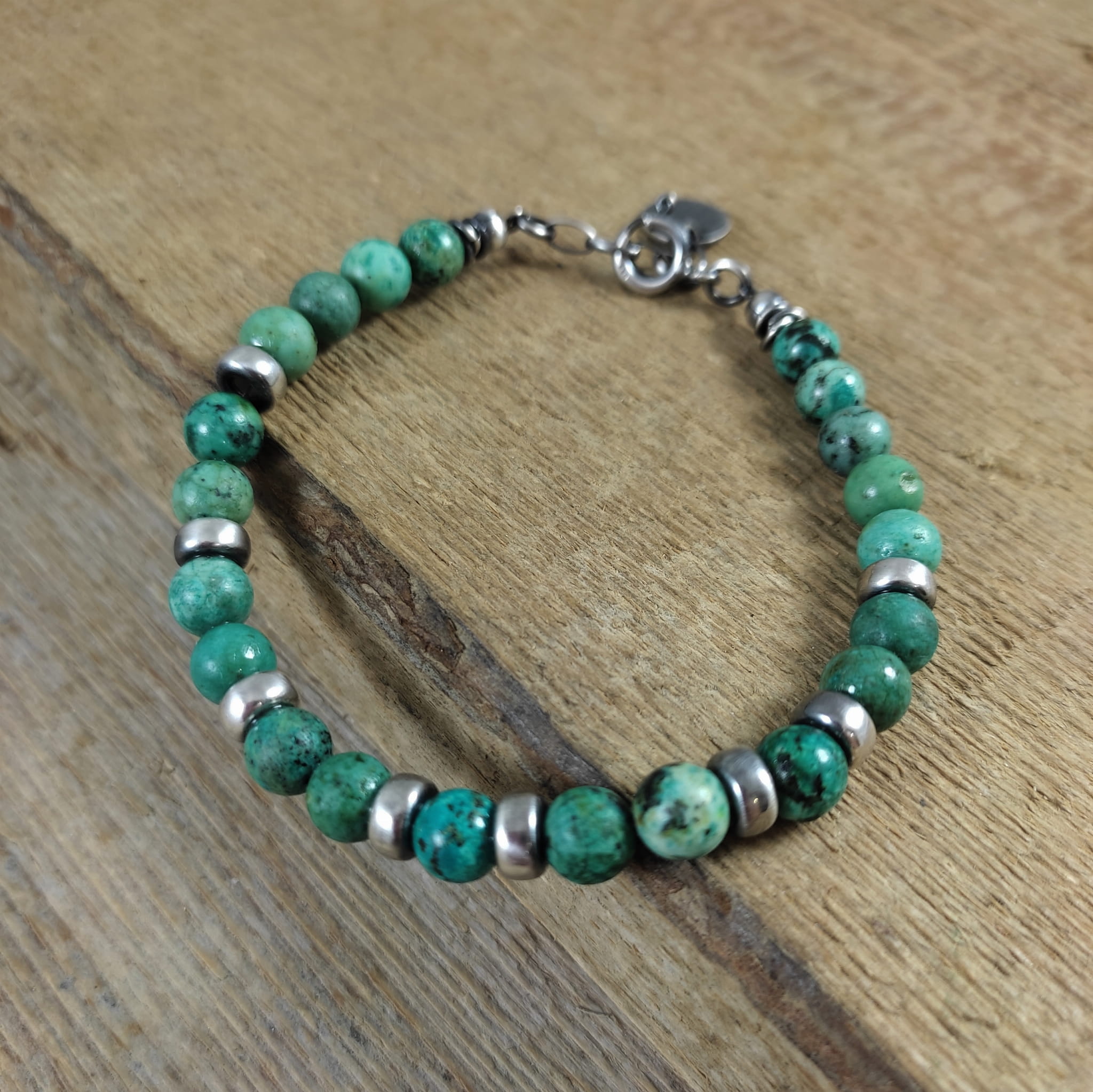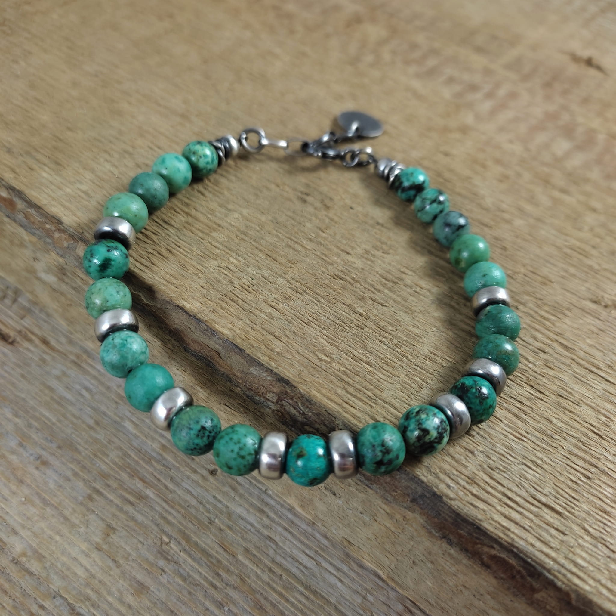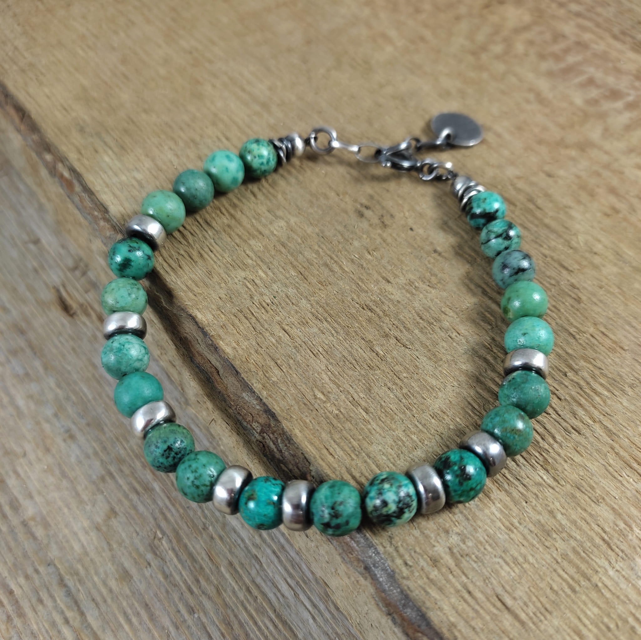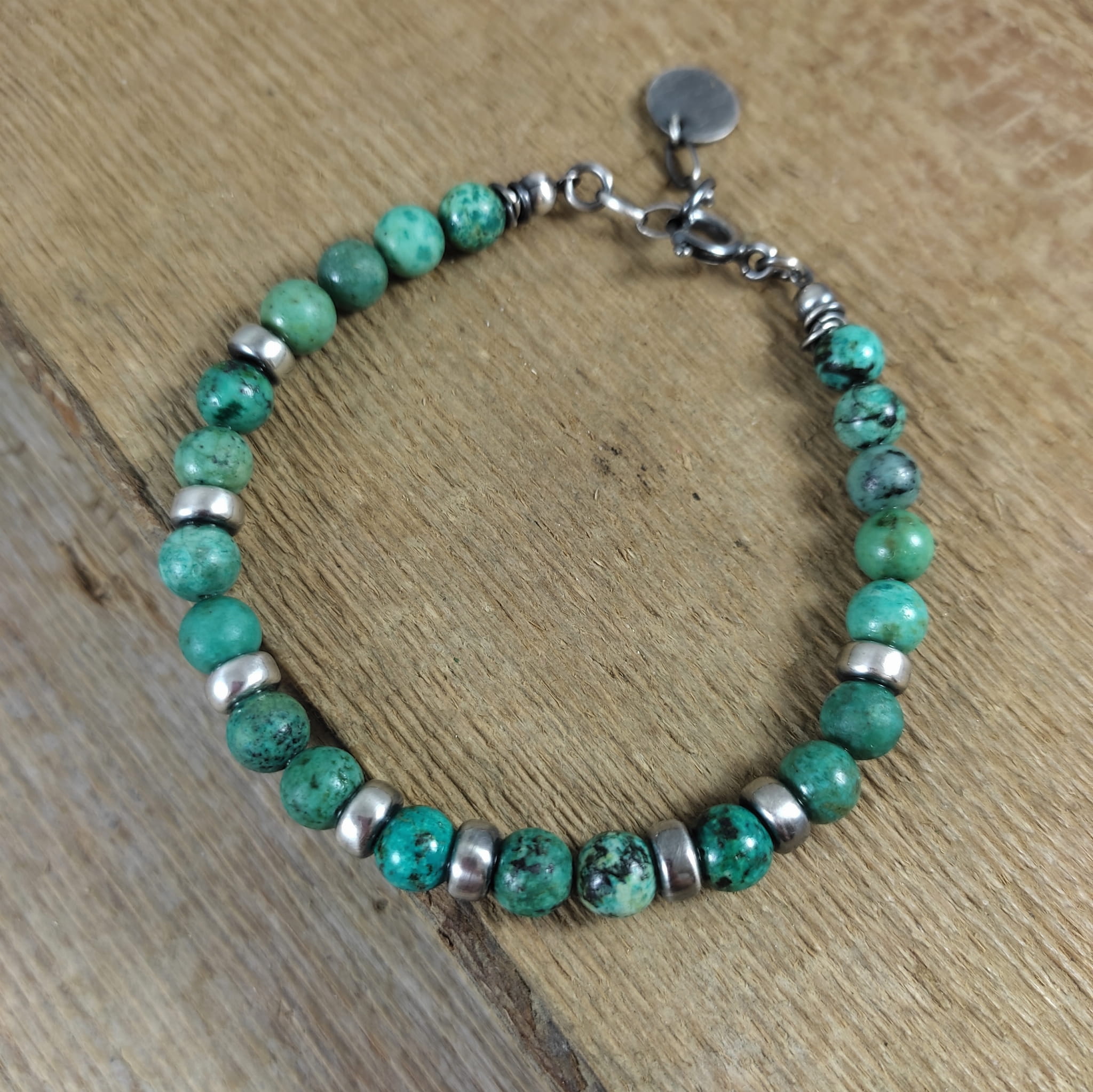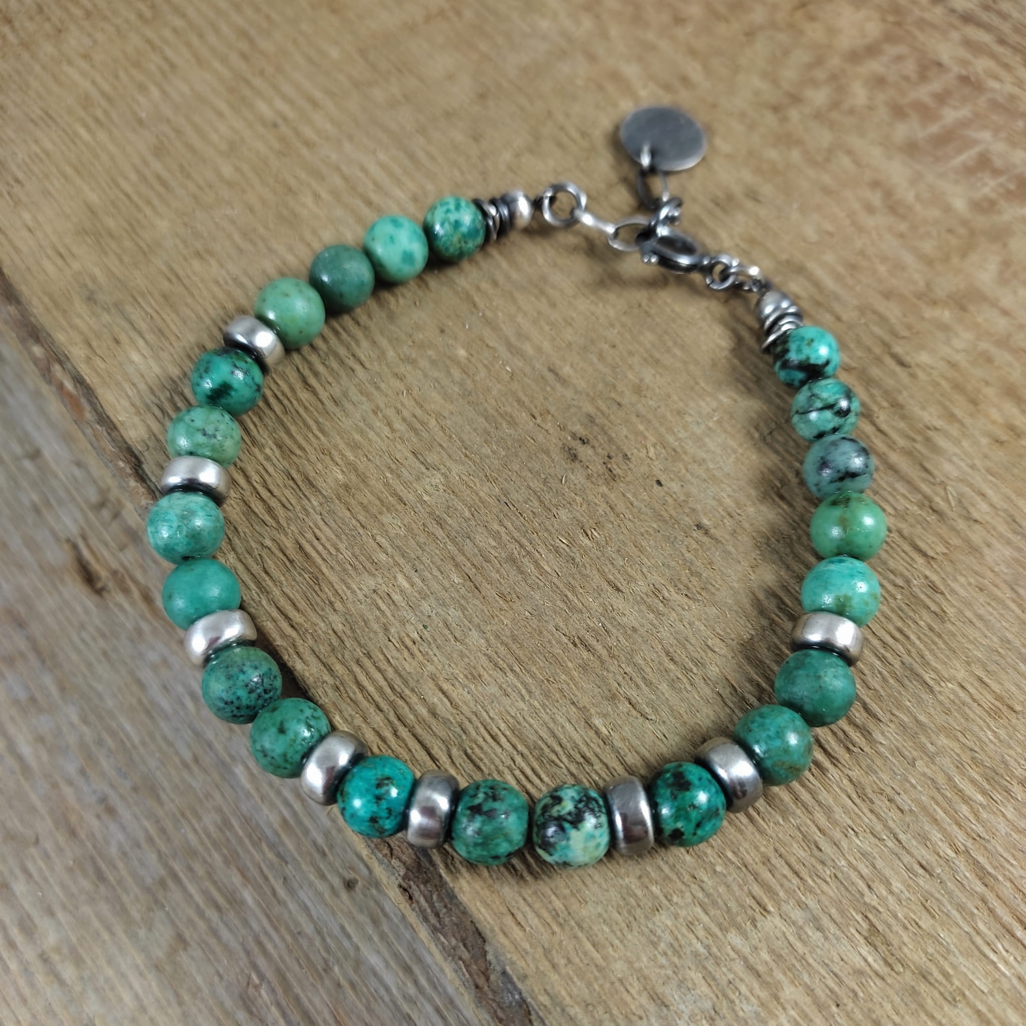 Bransoletka wykonana z kul turkusu ok. 6 mm. Całość dopełniona srebrem 925, oksydowanym i wypolerowanym.