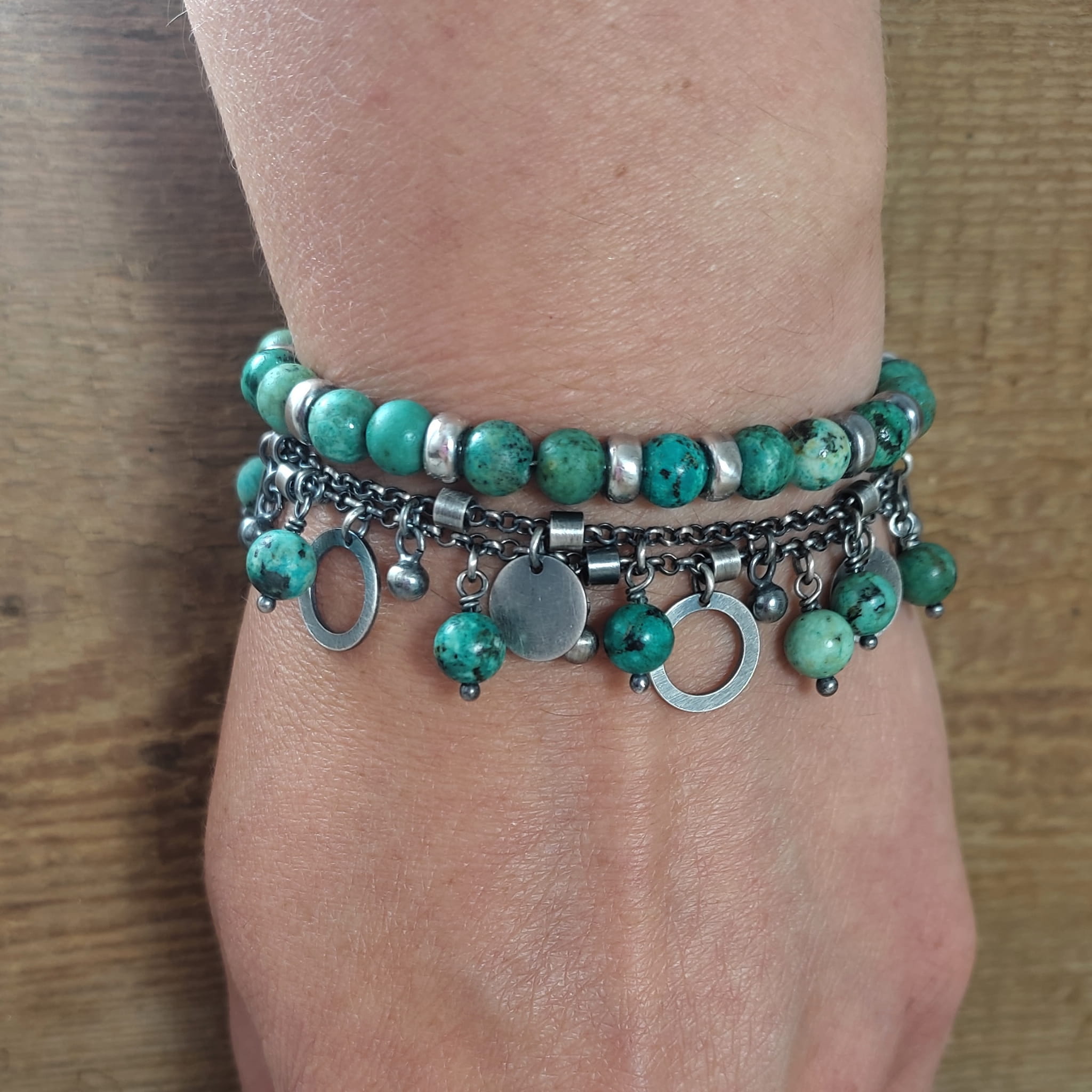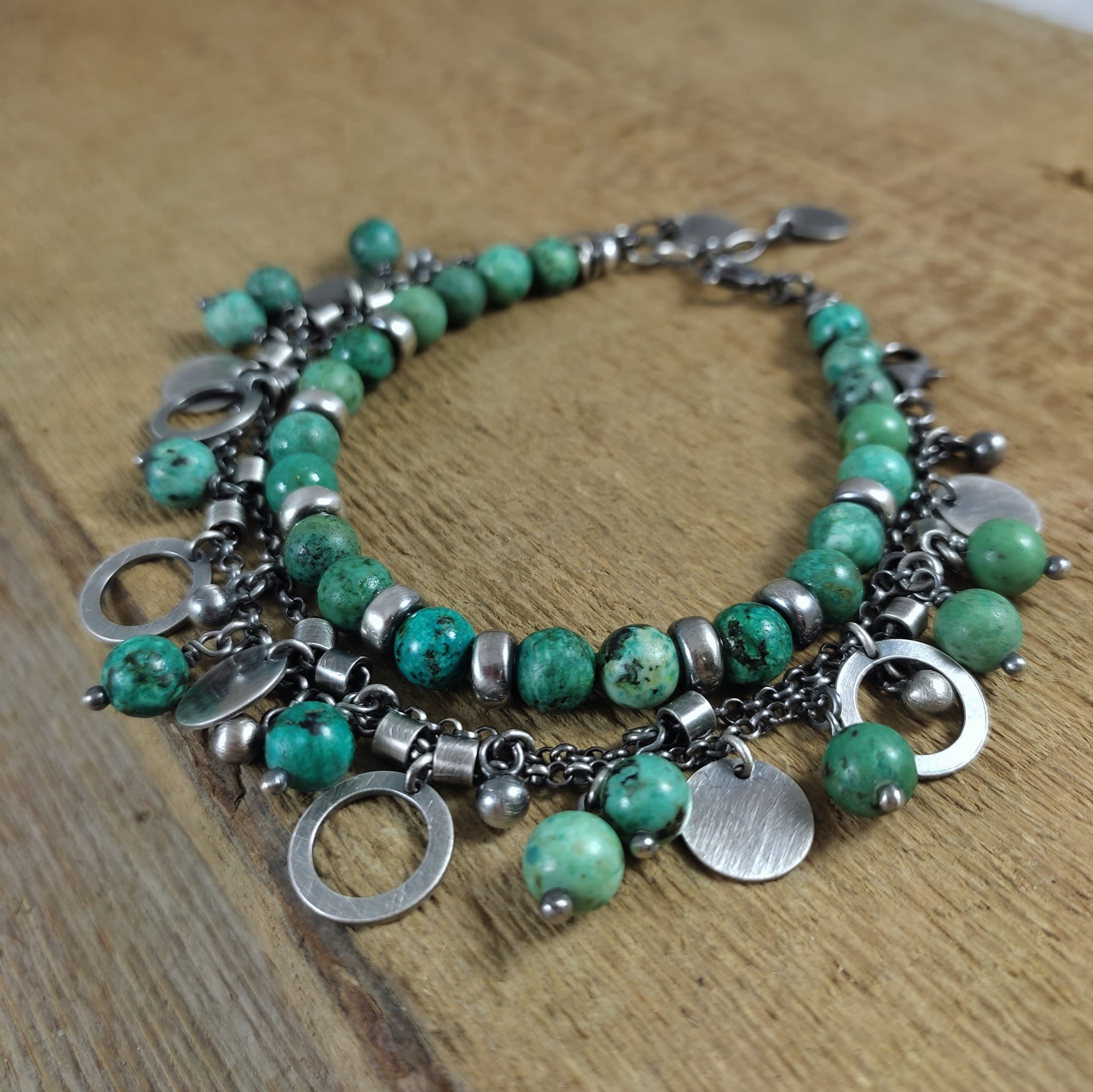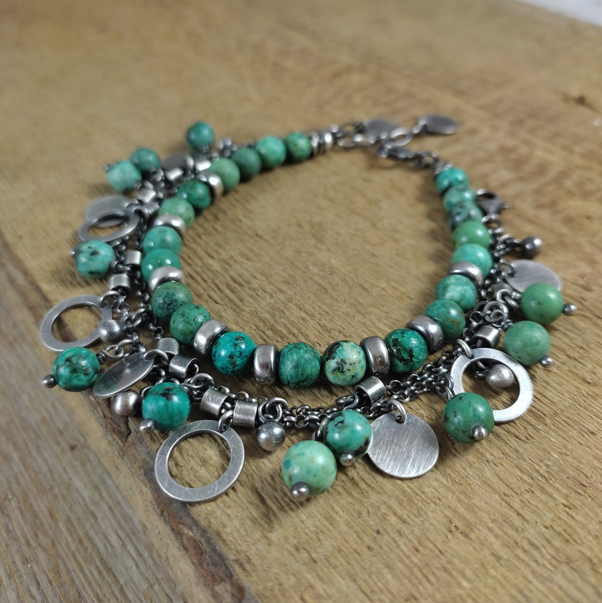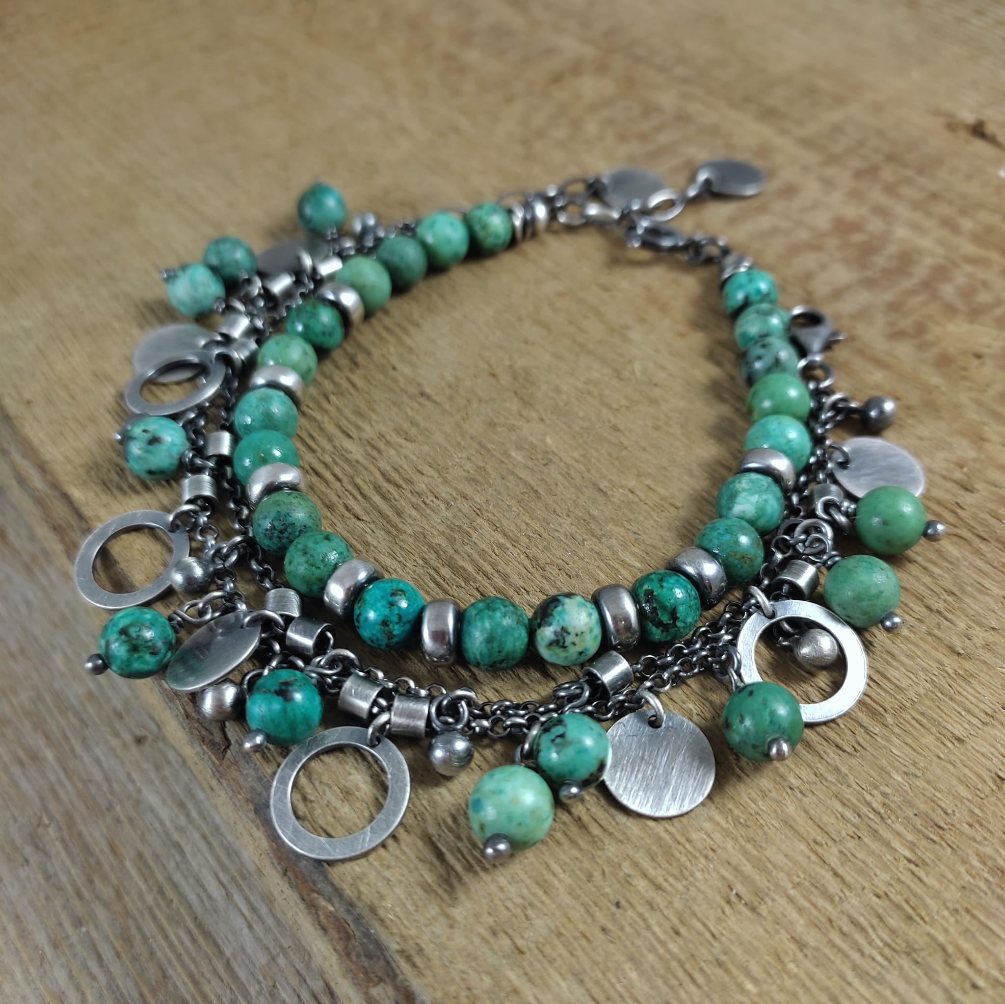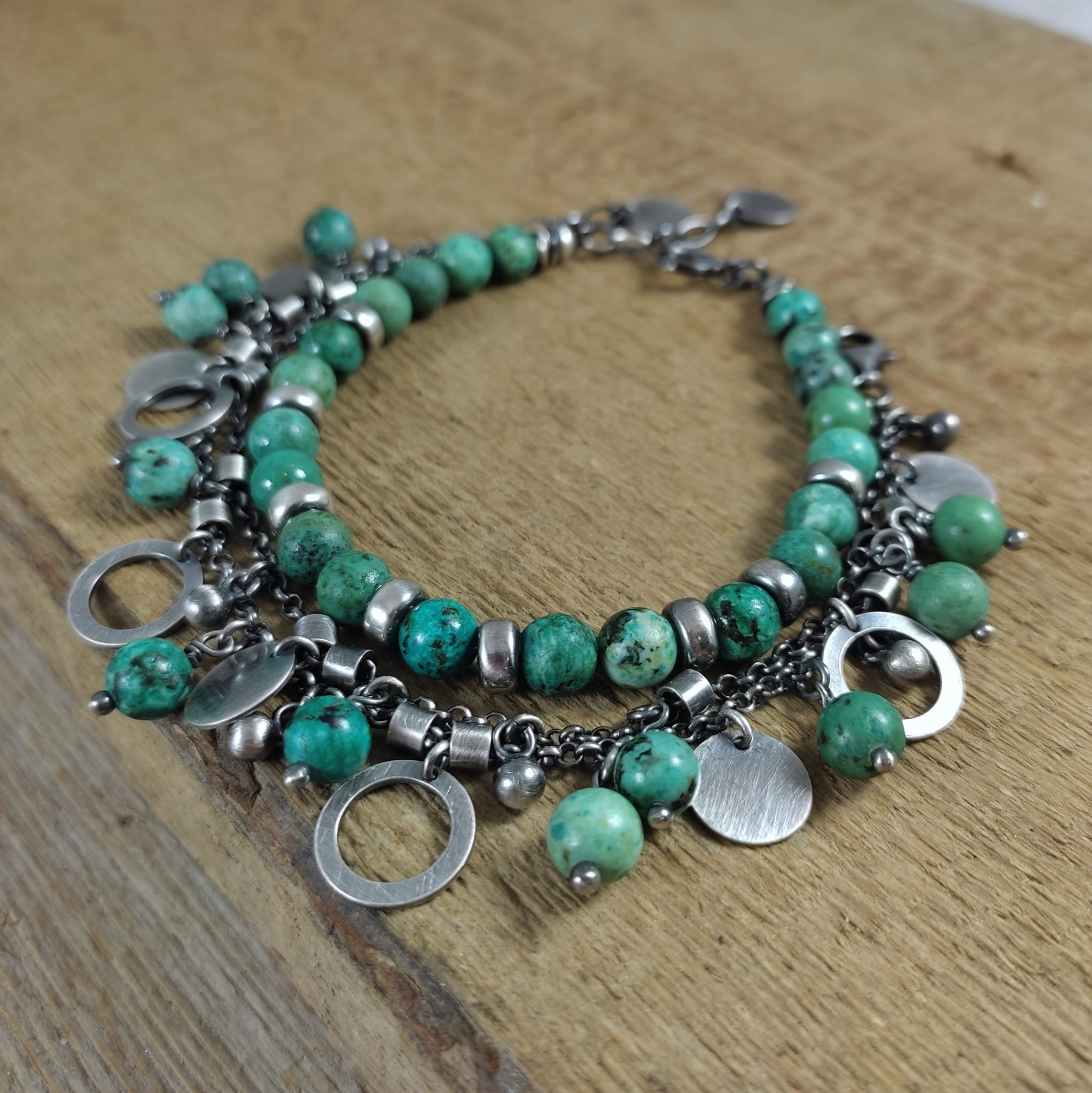 Bransoletka wykonana z kul turkusu ok. 6 mm. Całość dopełniona srebrem 925, oksydowanym i wypolerowanym.
