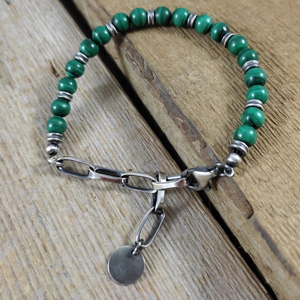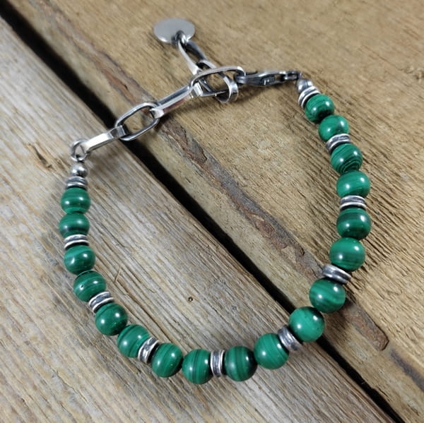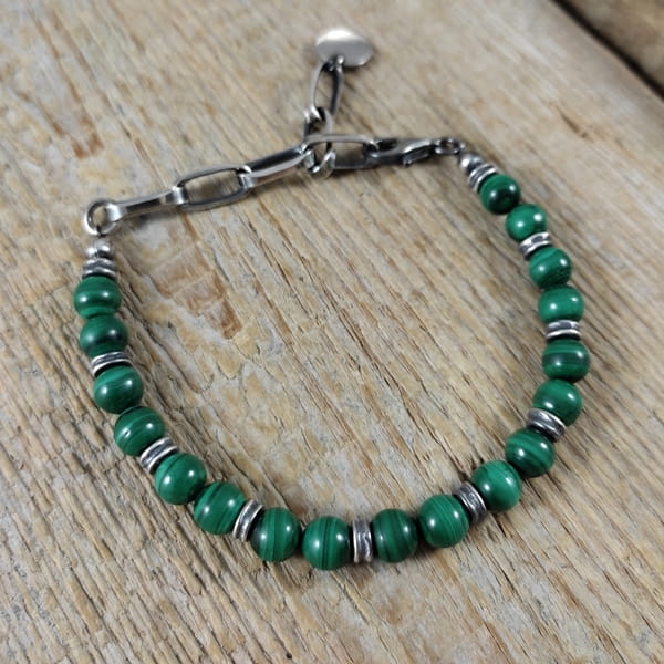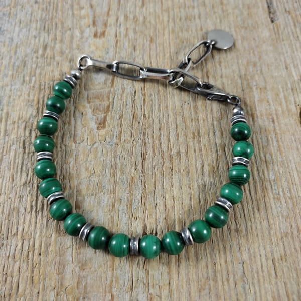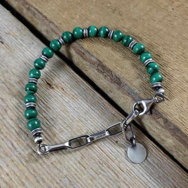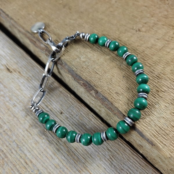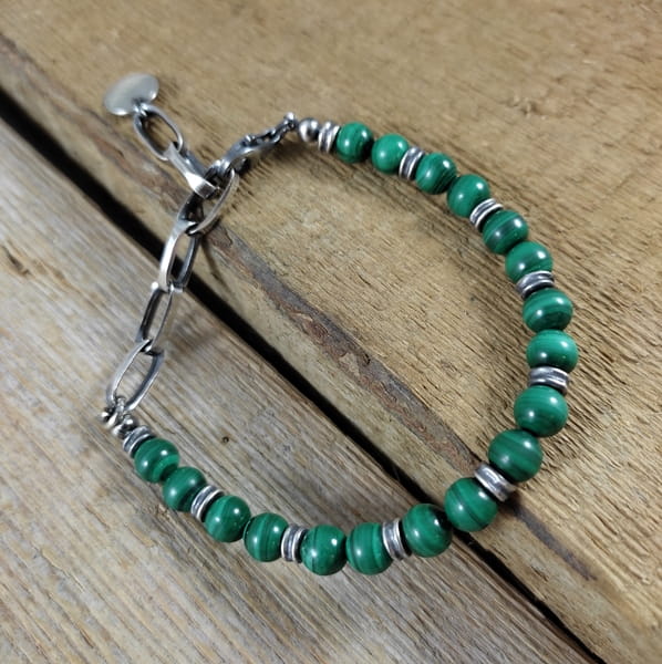 Bransoletka wykonana z kul malachitu ok. 7 mm. Całość dopełniona srebrem 925, oksydowanym i wypolerowanym. Długość bransoletki wynosi ok. 17 cm, plus łańcuszek regulacyjny 6,5 cm (możliwość skrócenia łańcuszka). Elegancko zapakowana.
