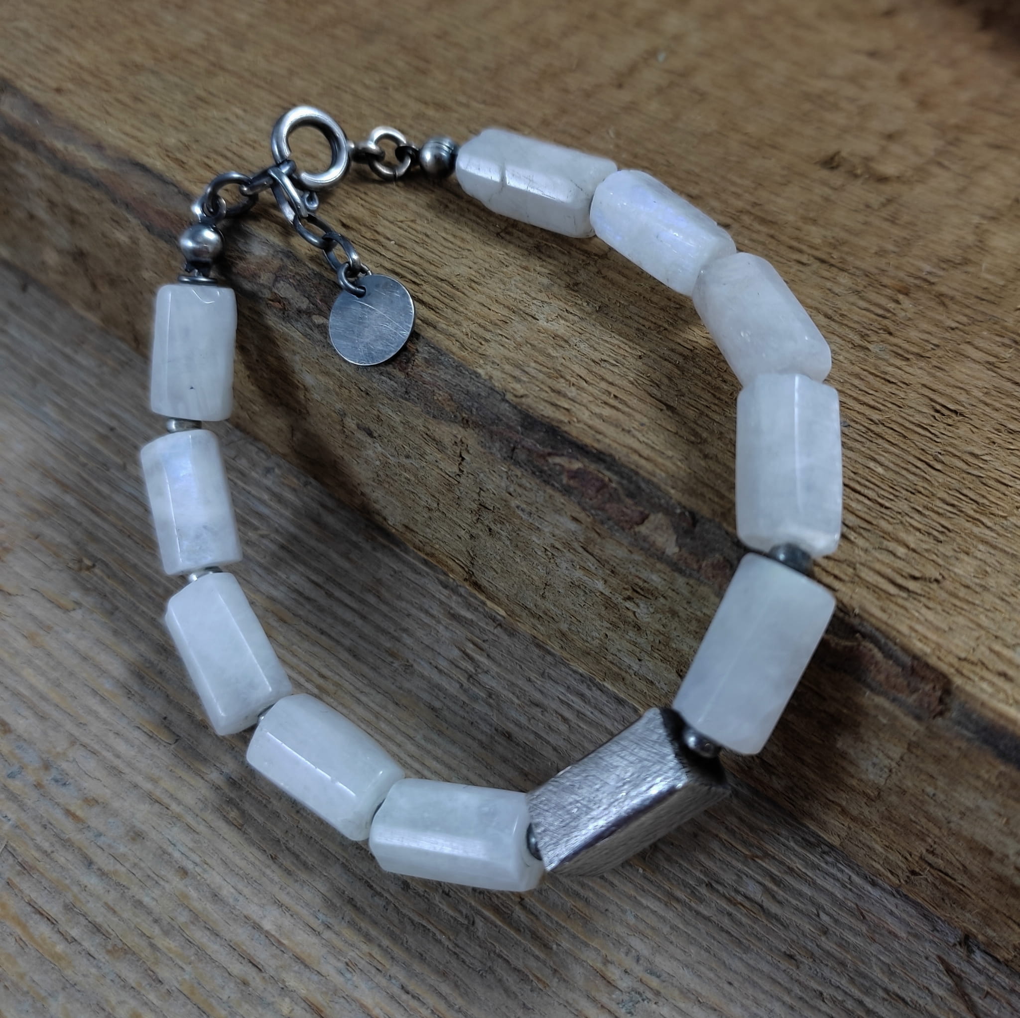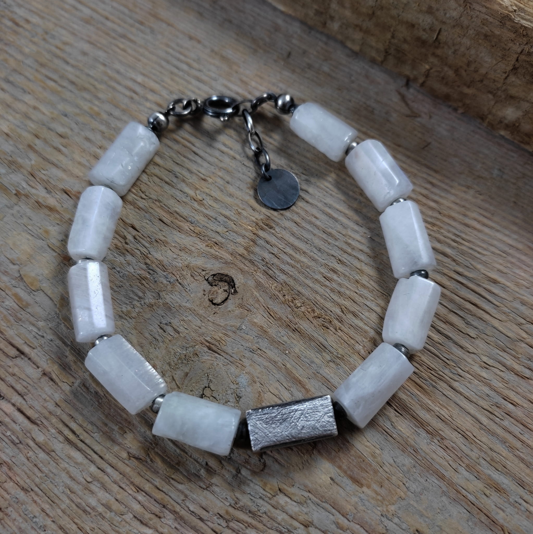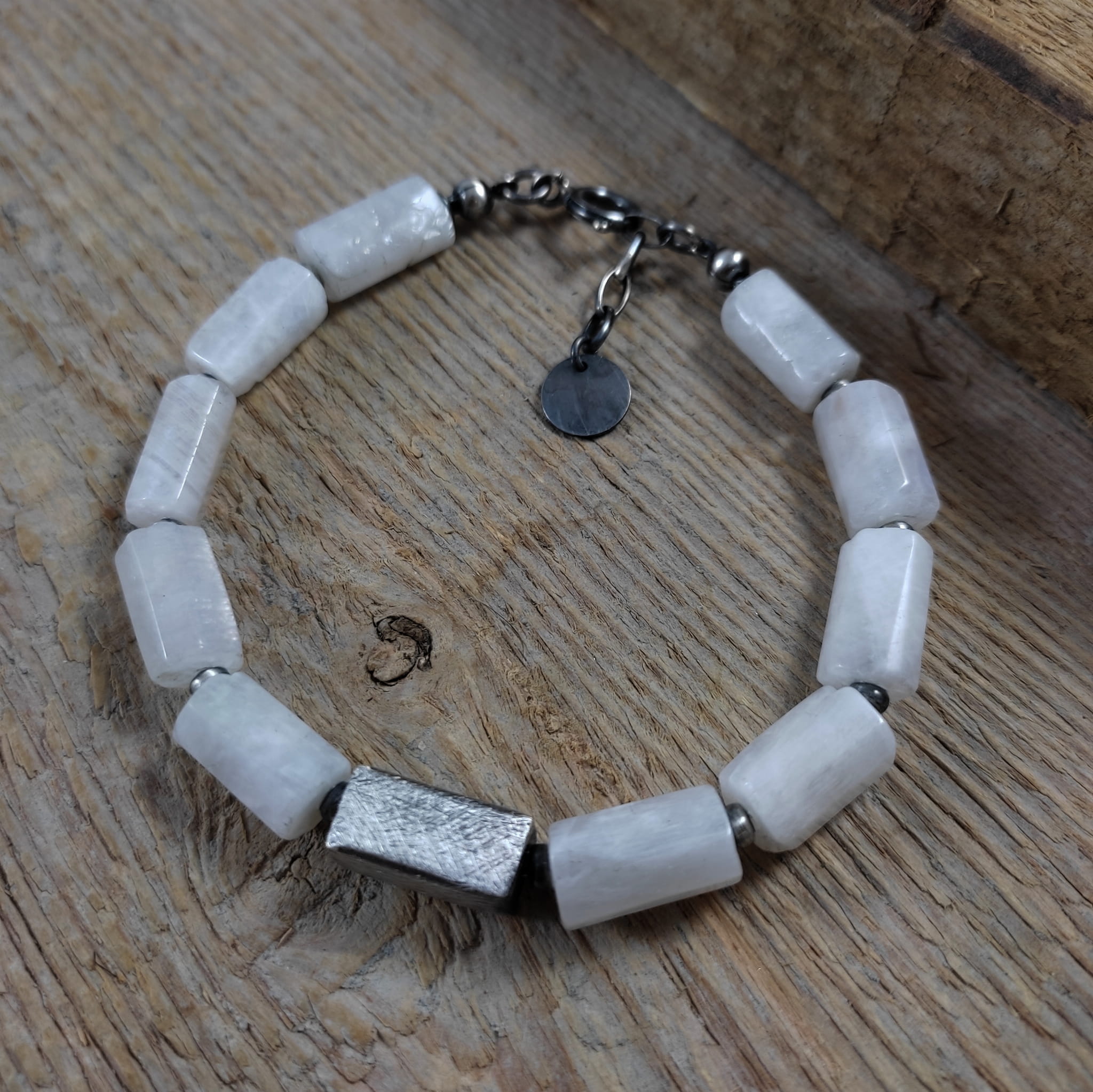 Bransoletka wykonana z nieregularnych, surowych bryłek kamienia księżycowego ok. 8/12 mm. Całość dopełniona srebrem 925, oksydowanym i wypolerowanym. Długość bransoletki wynosi ok. 19,5 cm, plus łańcuszek regulacyjny ok. 2 cm. Pasuje na nadgarstek 16,5-18 cm. Elegancko zapakowana. Kamienie naturalne, różnią się wielkością i kształtem między sobą, z niedoskonałościami.