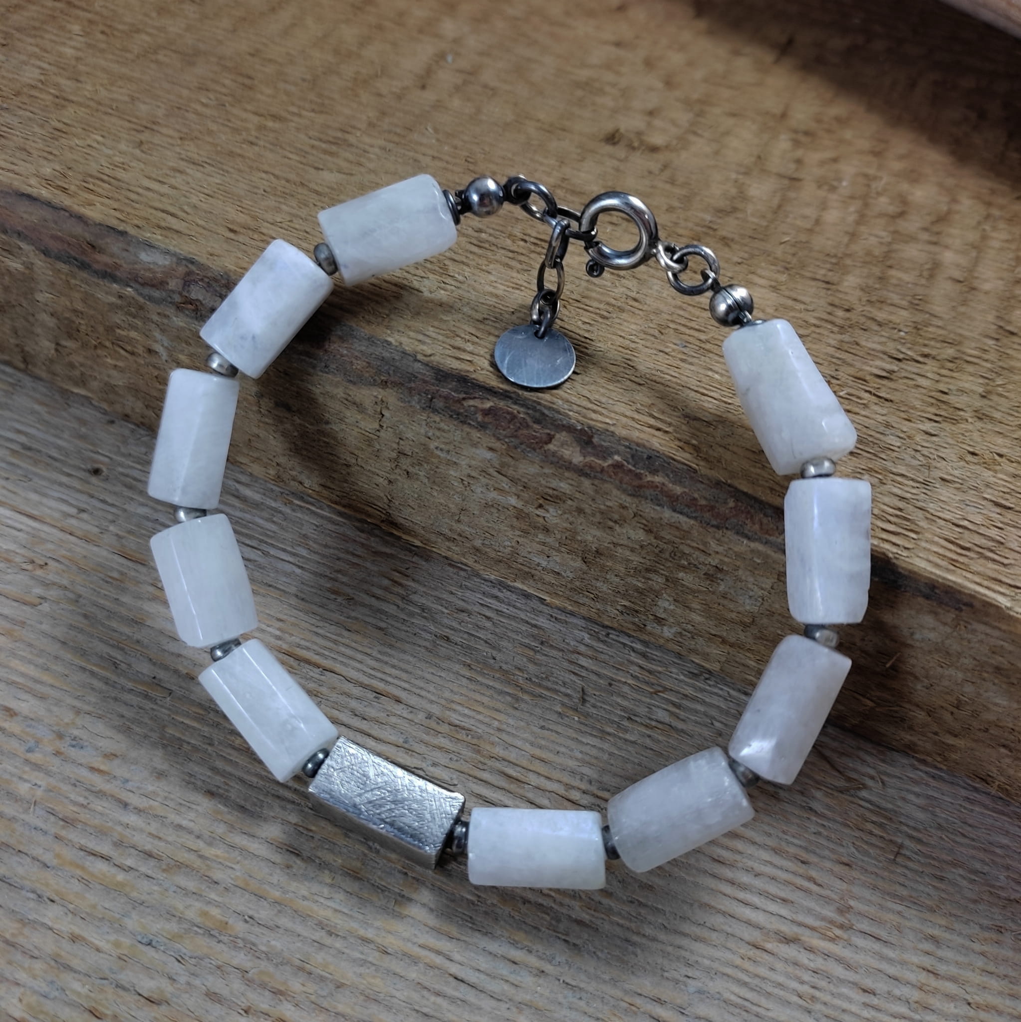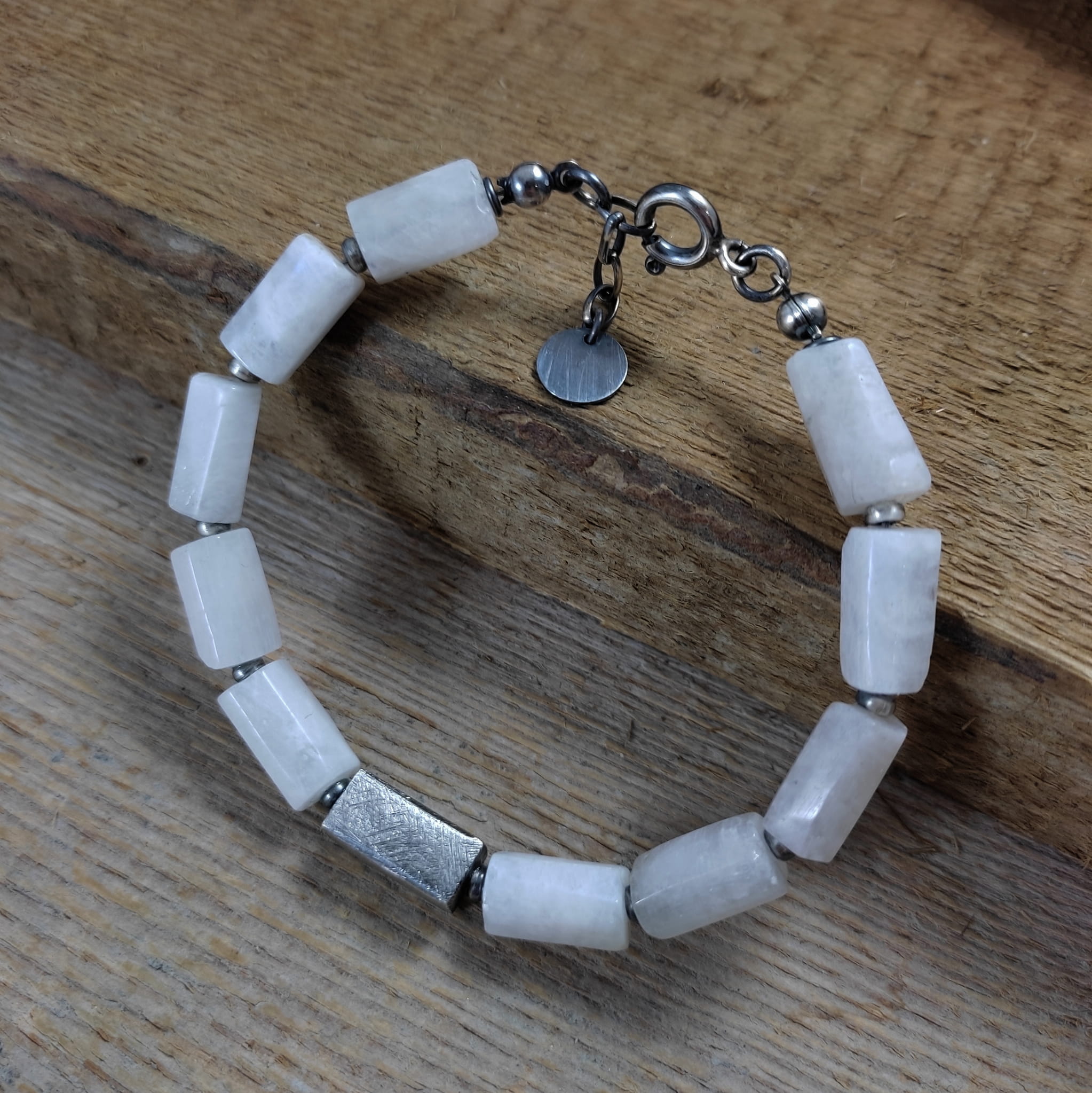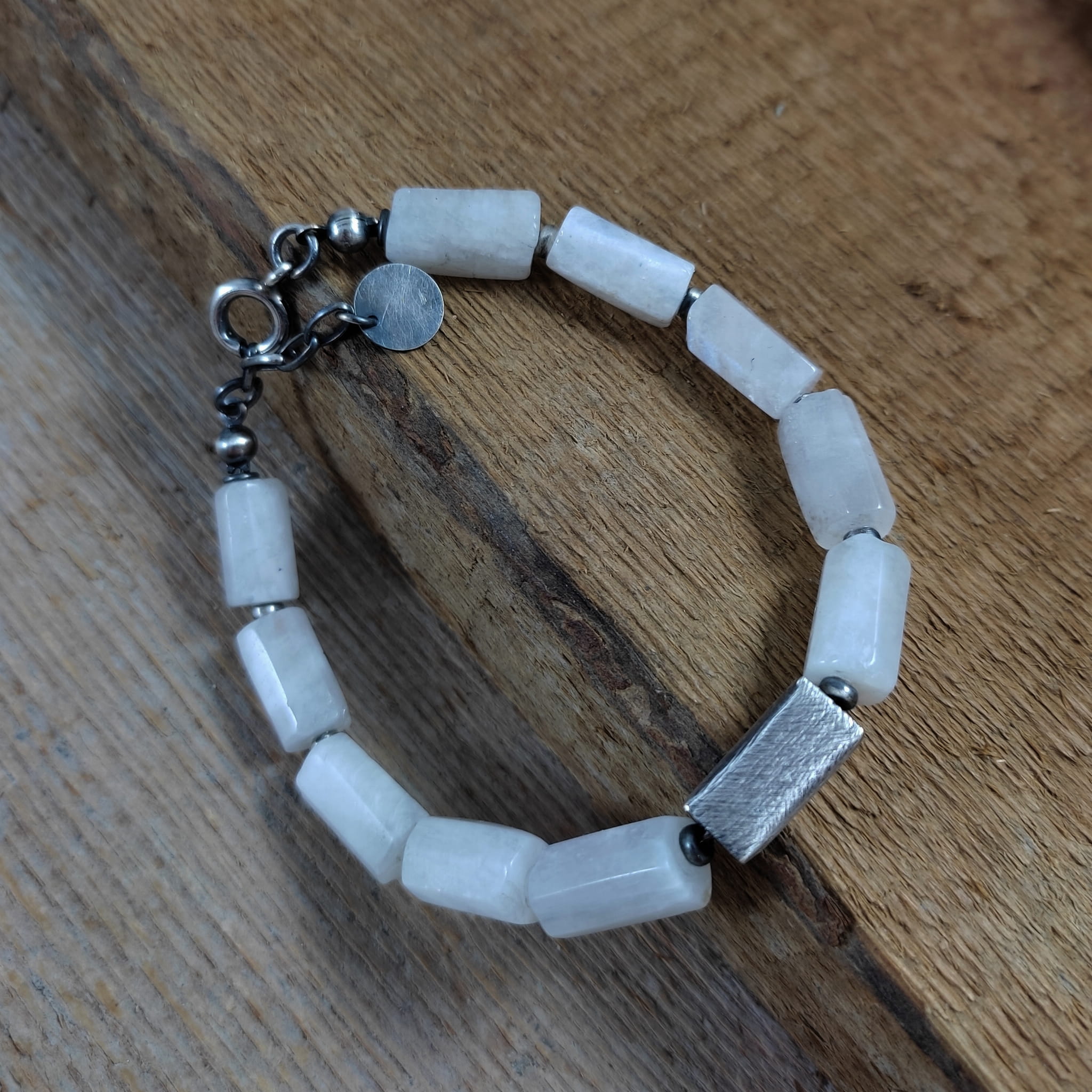 Bransoletka wykonana z nieregularnych, surowych bryłek kamienia księżycowego ok. 8/12 mm. Całość dopełniona srebrem 925, oksydowanym i wypolerowanym. Długość bransoletki wynosi ok. 19,5 cm, plus łańcuszek regulacyjny ok. 2 cm. Pasuje na nadgarstek 16,5-18 cm. Elegancko zapakowana. Kamienie naturalne, różnią się wielkością i kształtem między sobą, z niedoskonałościami.