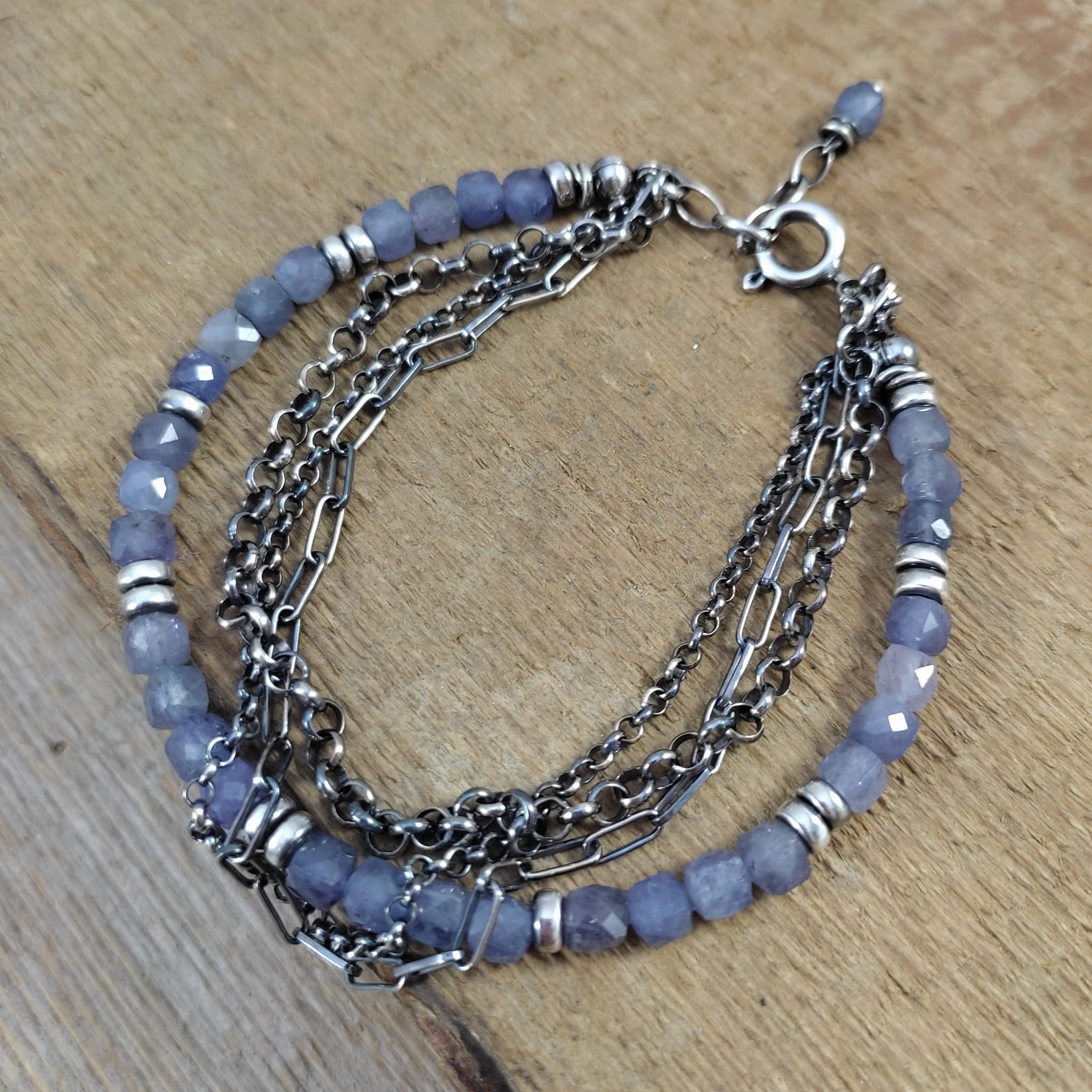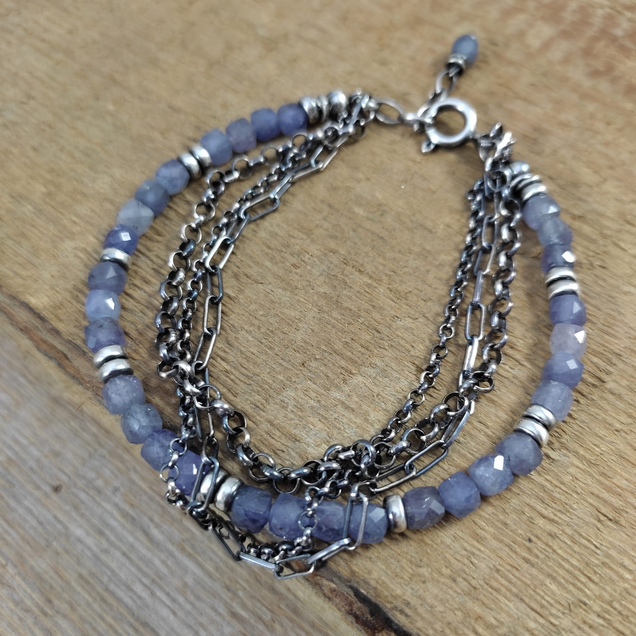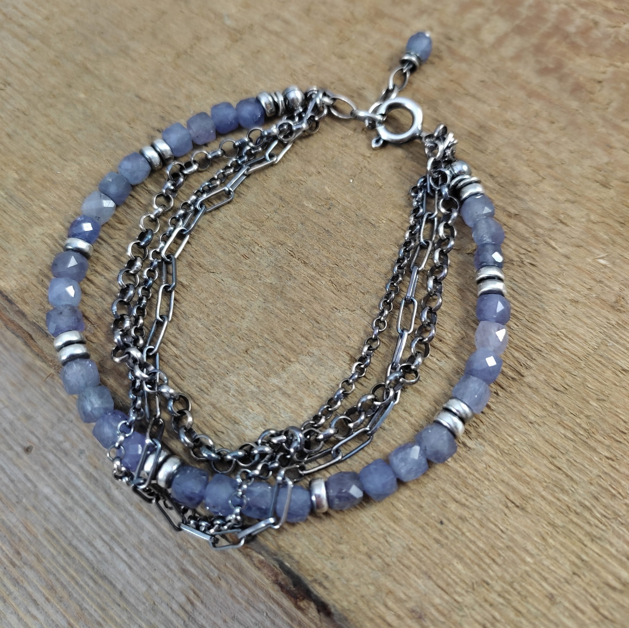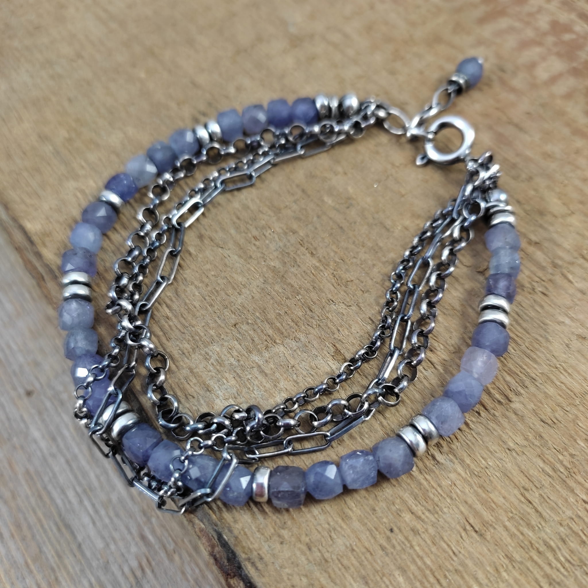 Bransoletka wykonana z fasetowanych sześcianów granatu, grossularu ok. 4 mm. Całość dopełniona srebrem 925, oksydowanym i wypolerowanym.