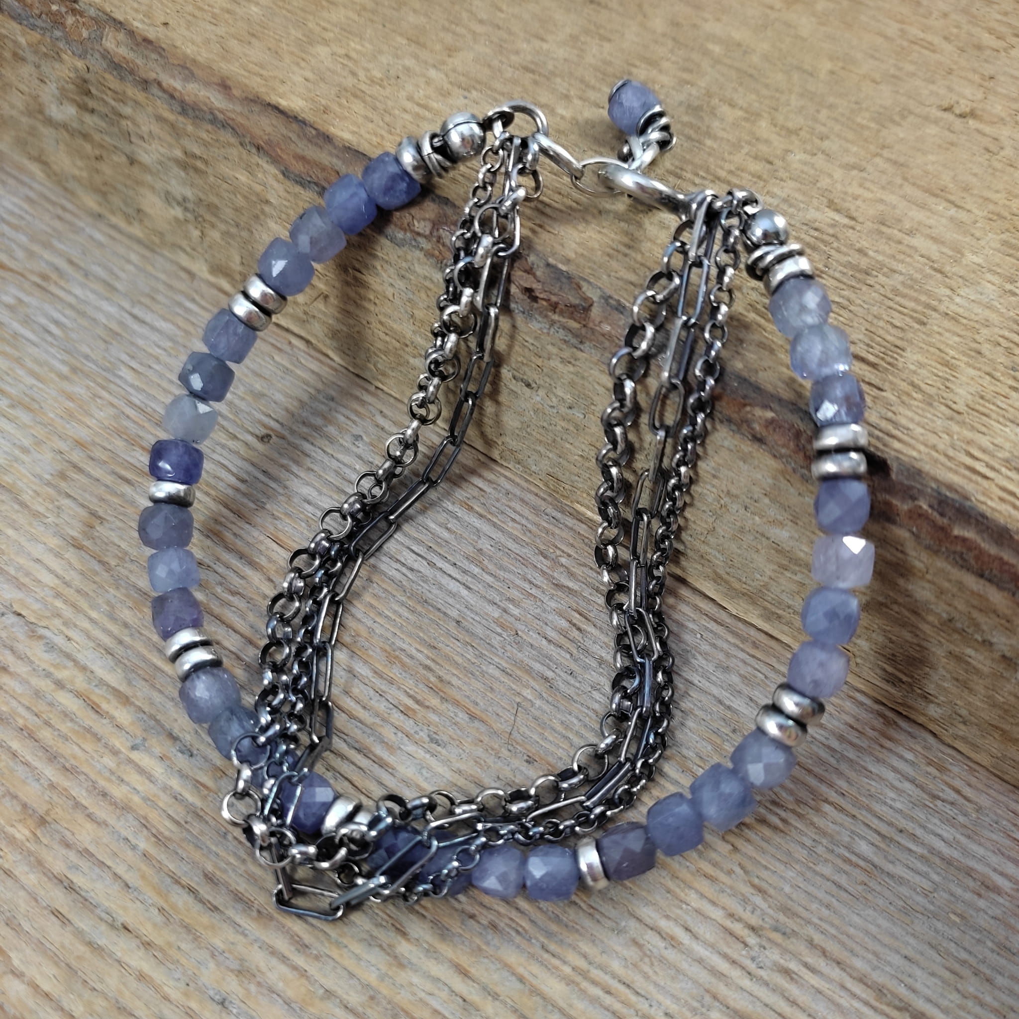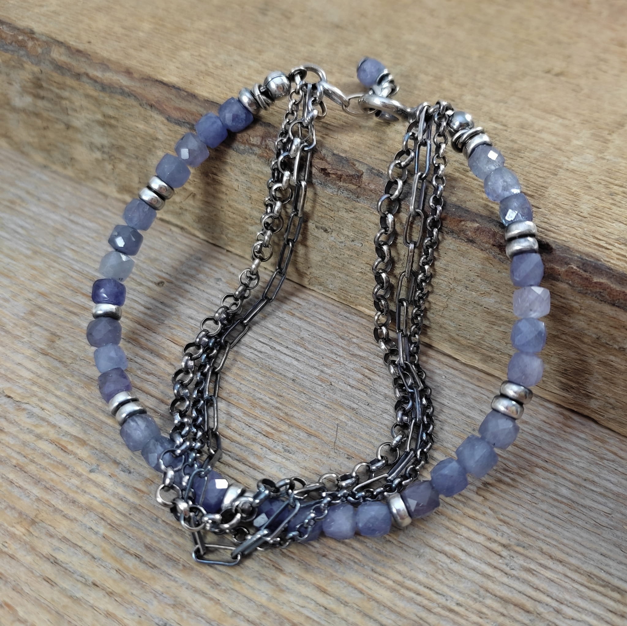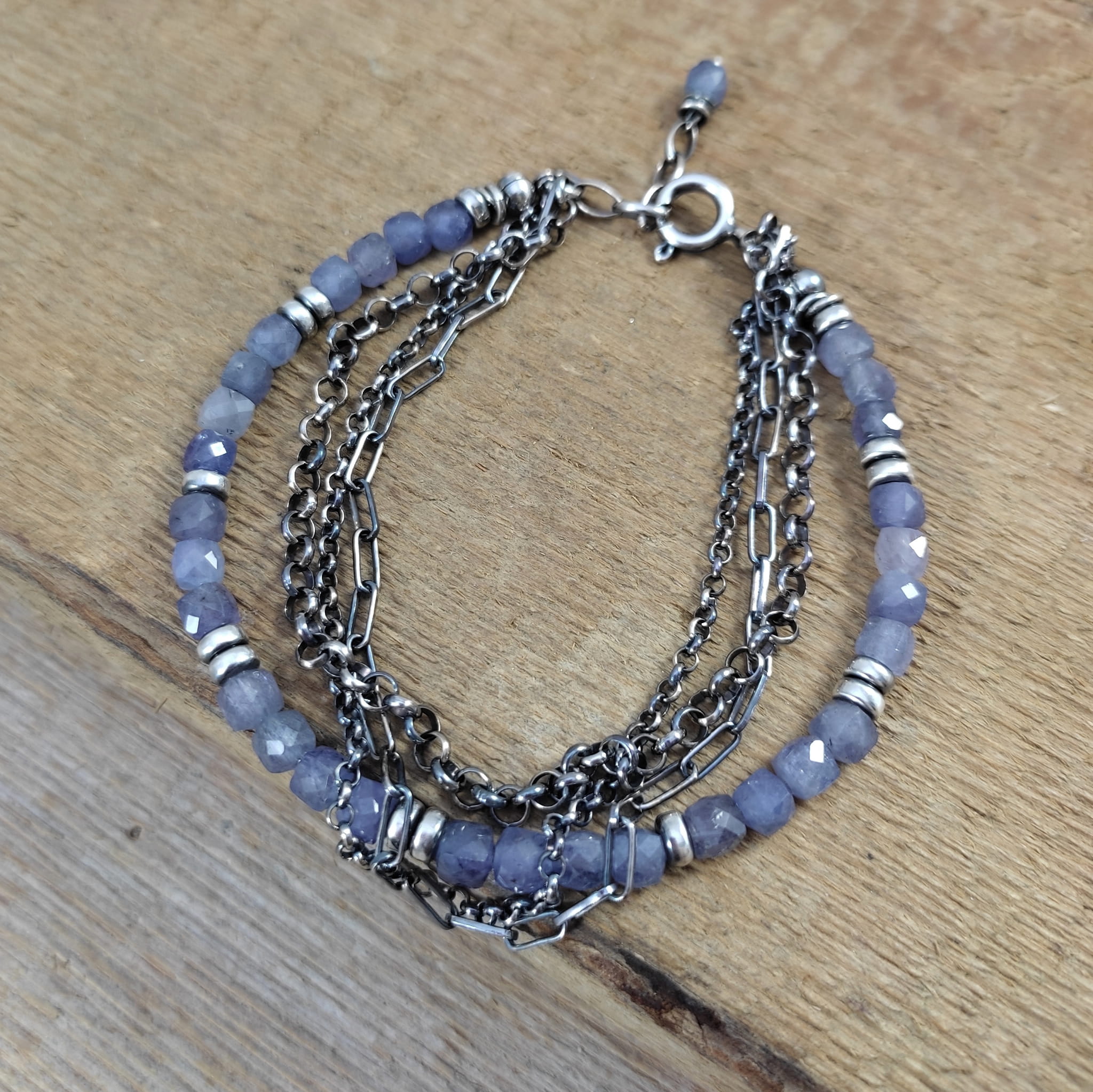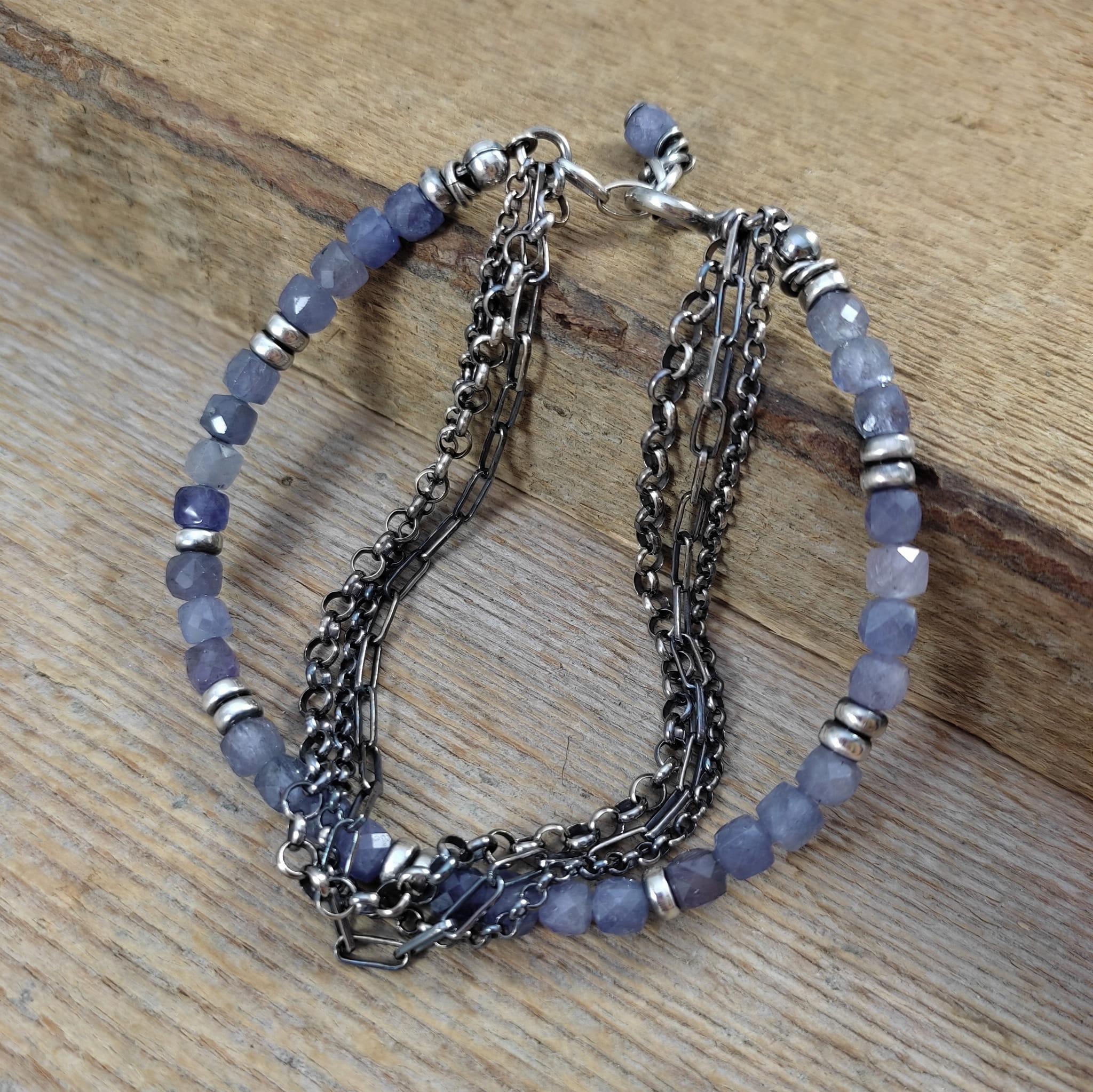 Bransoletka wykonana z fasetowanych sześcianów granatu, grossularu ok. 4 mm. Całość dopełniona srebrem 925, oksydowanym i wypolerowanym.