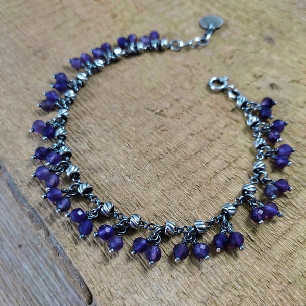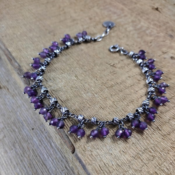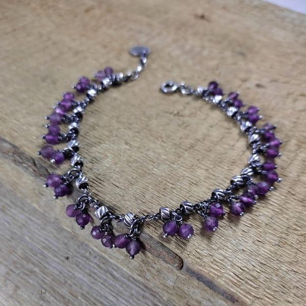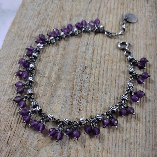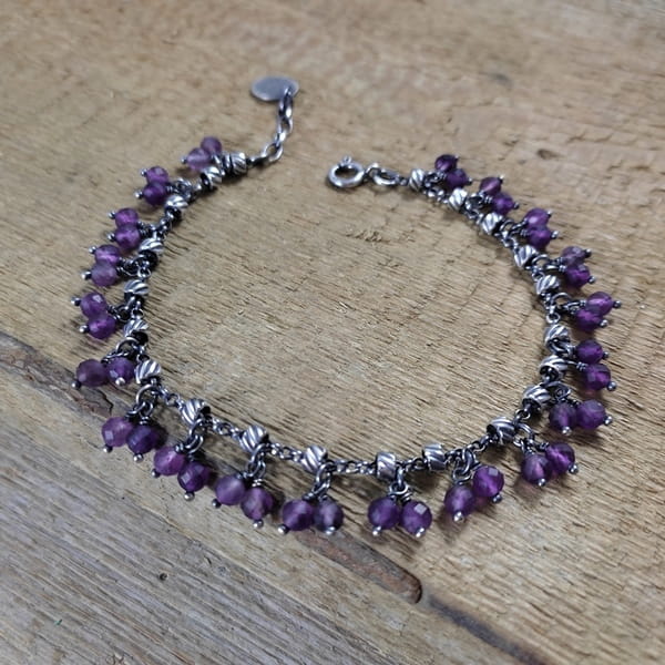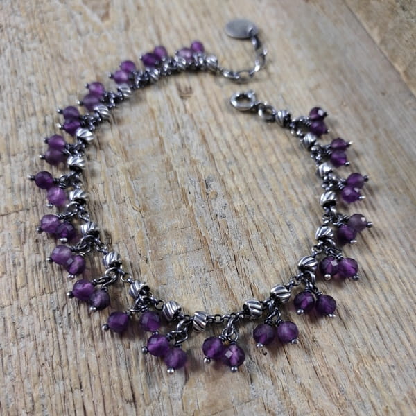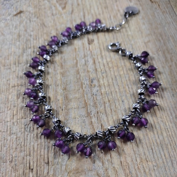 Bransoletka wykonana z kul ametystu ok. 4 mm. Całość dopełniona srebrem 925, oksydowanym i wypolerowanym.