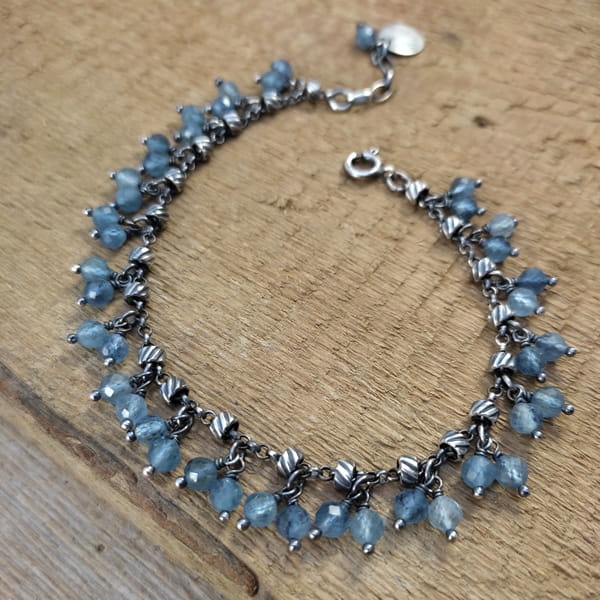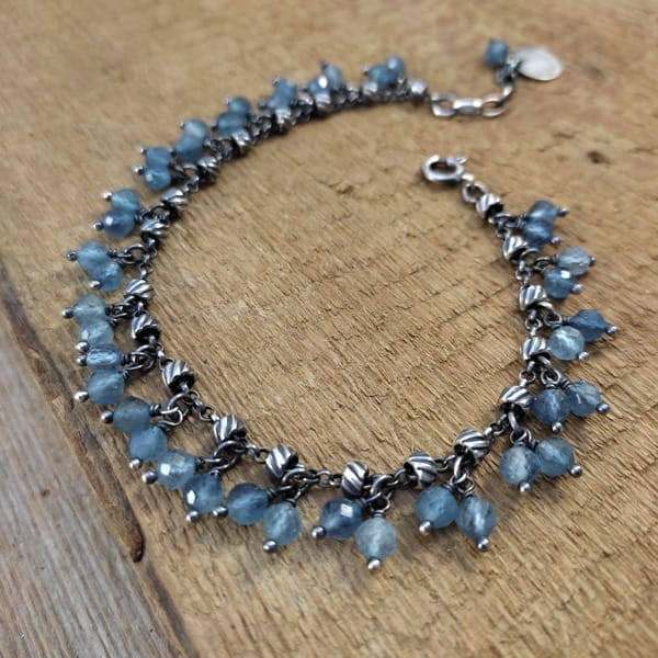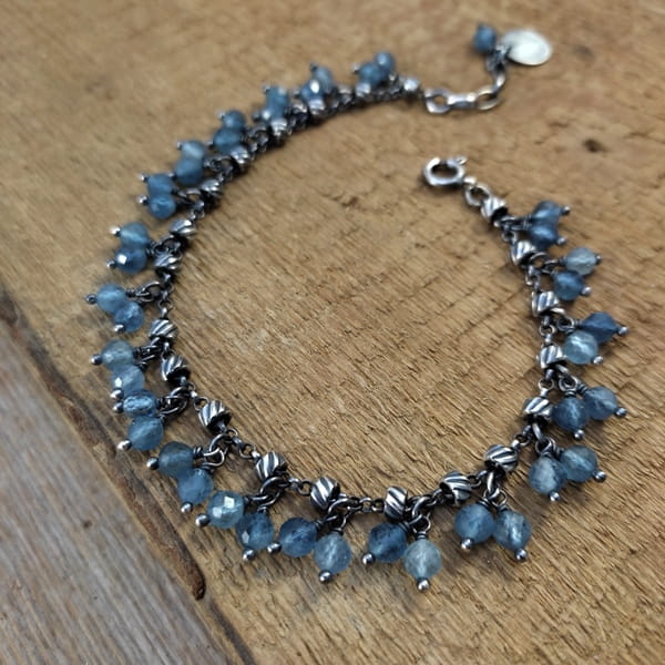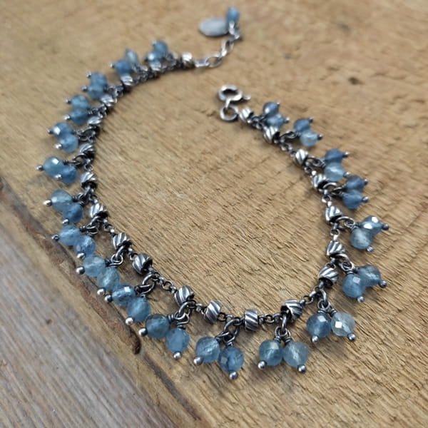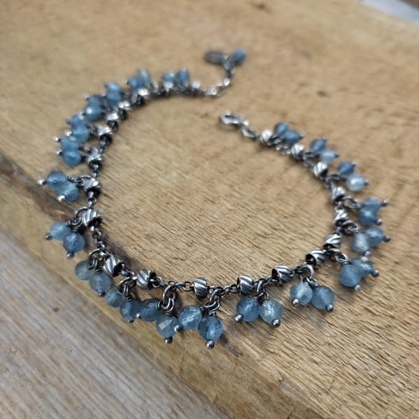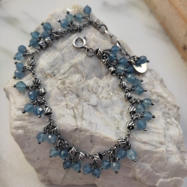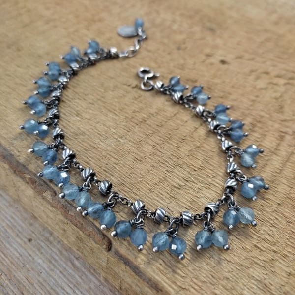 Bransoletka wykonana z fasetowanych kul akwamarynu ok. 4,5 mm. Całość dopełniona srebrem 925, oksydowanym i wypolerowanym.