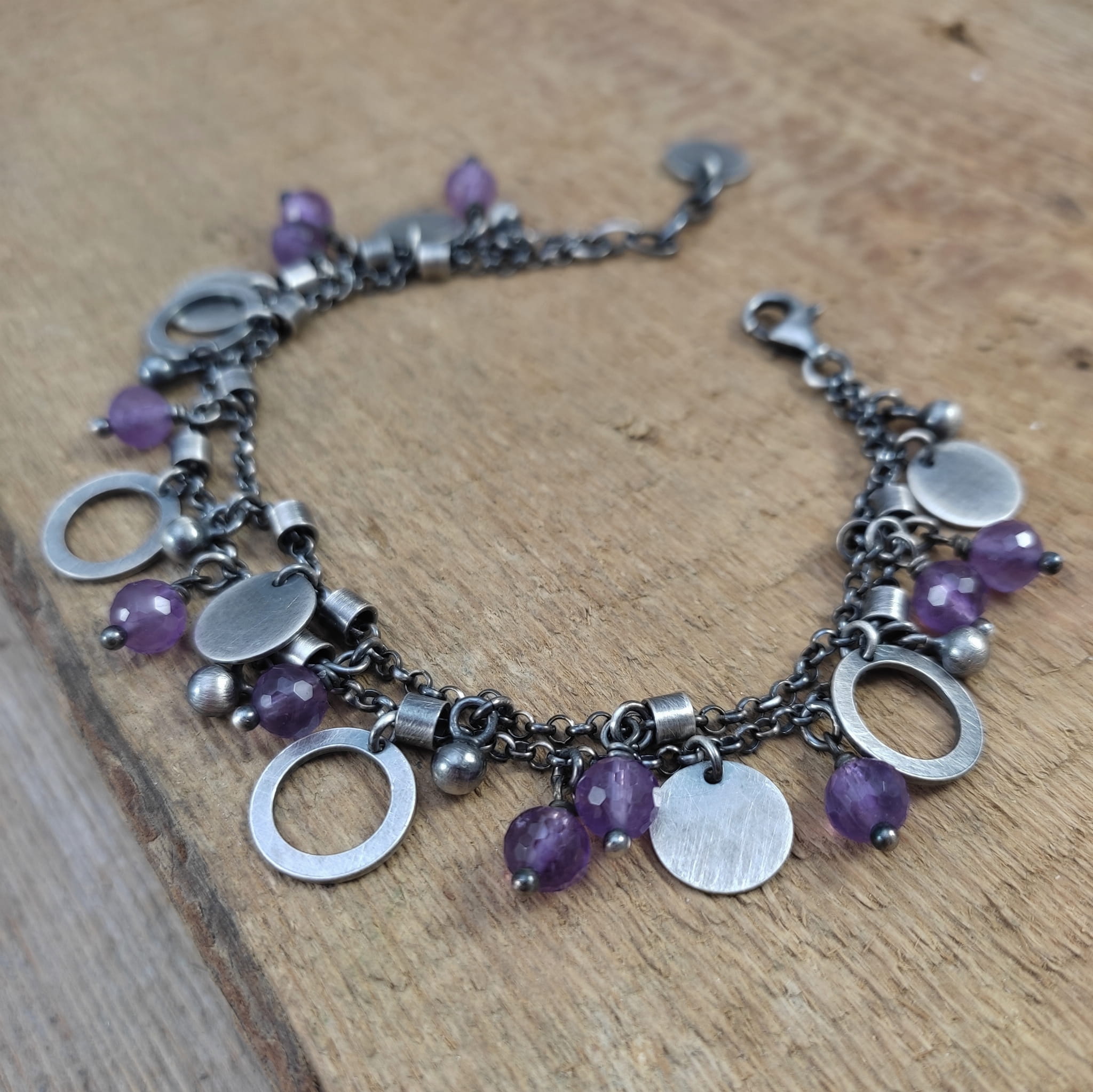 Bransoletka wykonana z kul ametystu 5.5 mm. Całość dopełniona srebrem 925, oksydowanym i wypolerowanym.