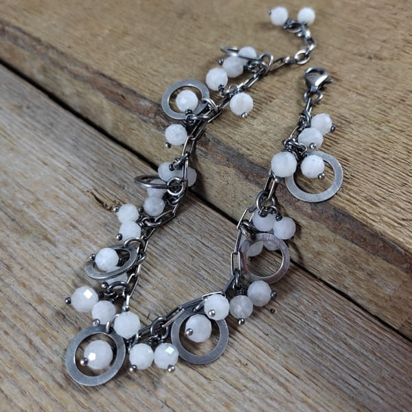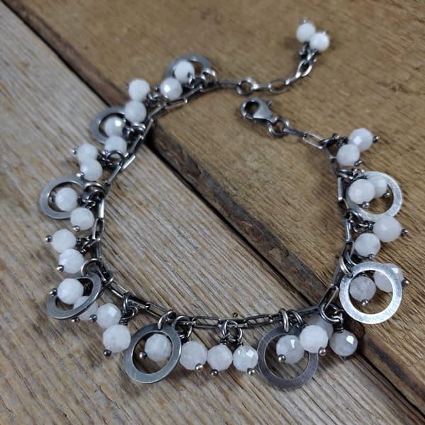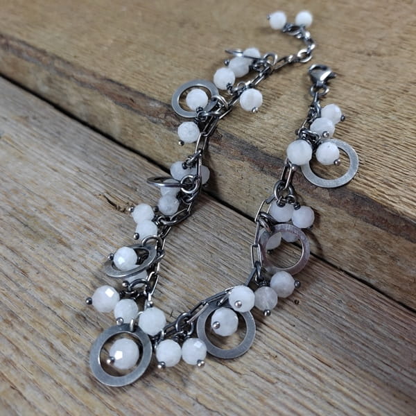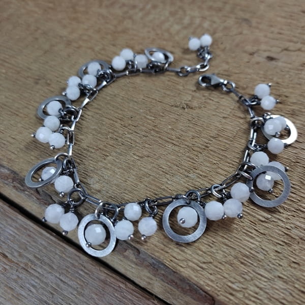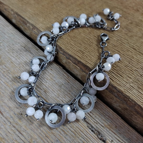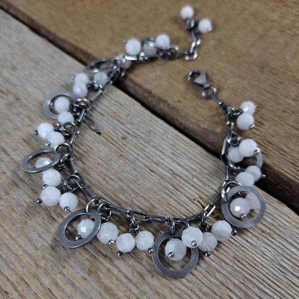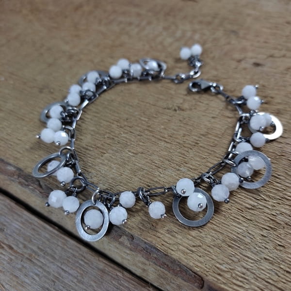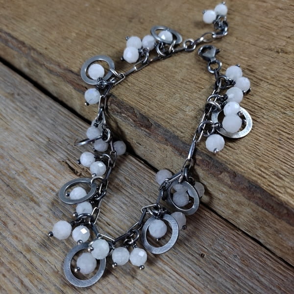 Bransoletka wykonana z fasetowanych kul kamienia księżycowego ok. 5,5-6 mm. Całość dopełniona srebrem 925, oksydowanym i wypolerowanym.