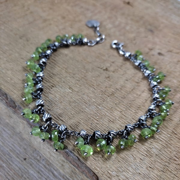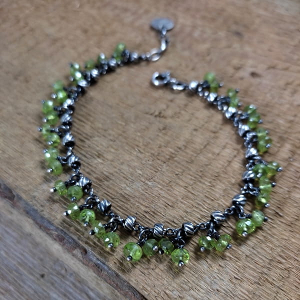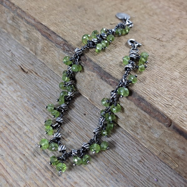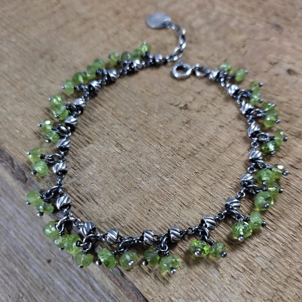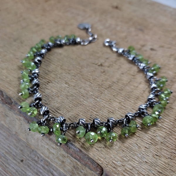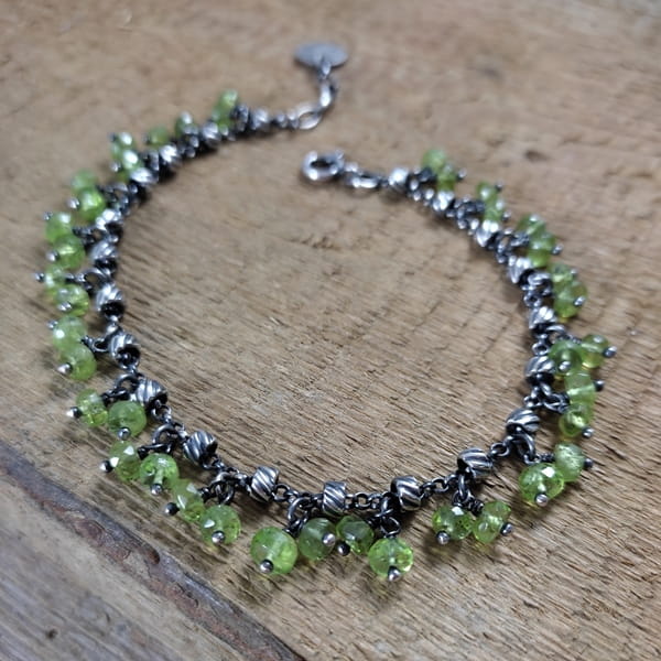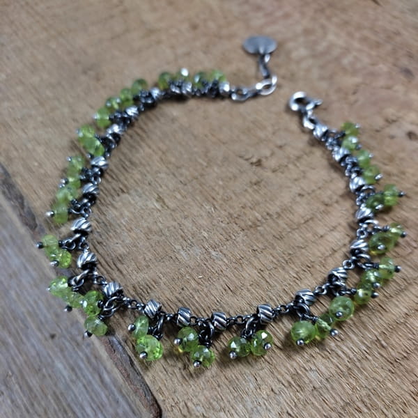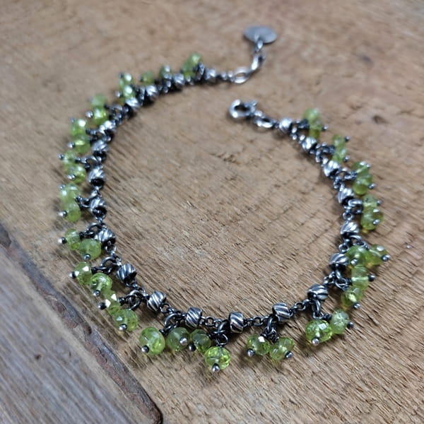 Bransoletka wykonana z oponek perydotu (oliwin) ok. 4,5 mm. Całość dopełniona srebrem 925, oksydowanym i wypolerowanym.