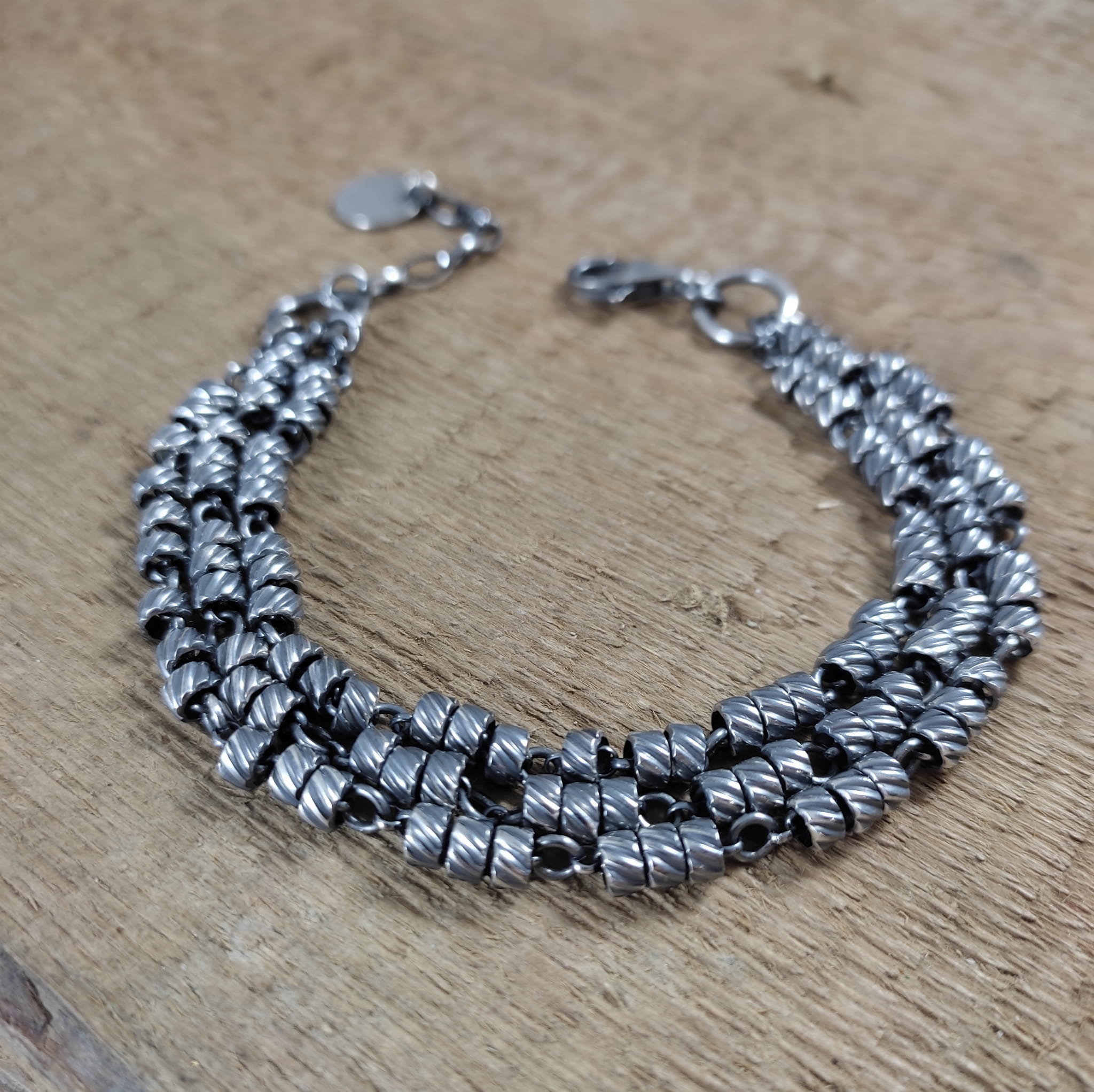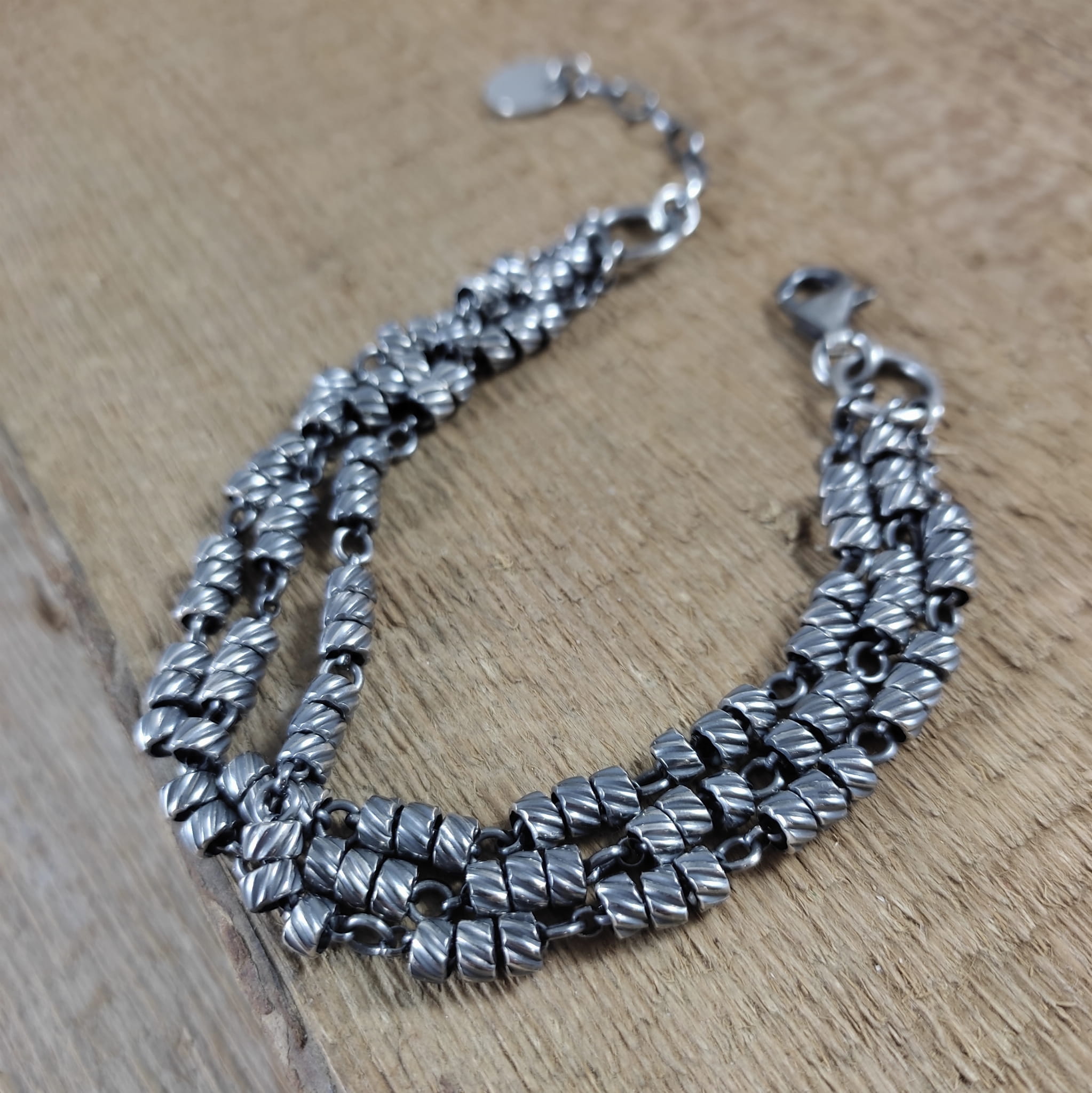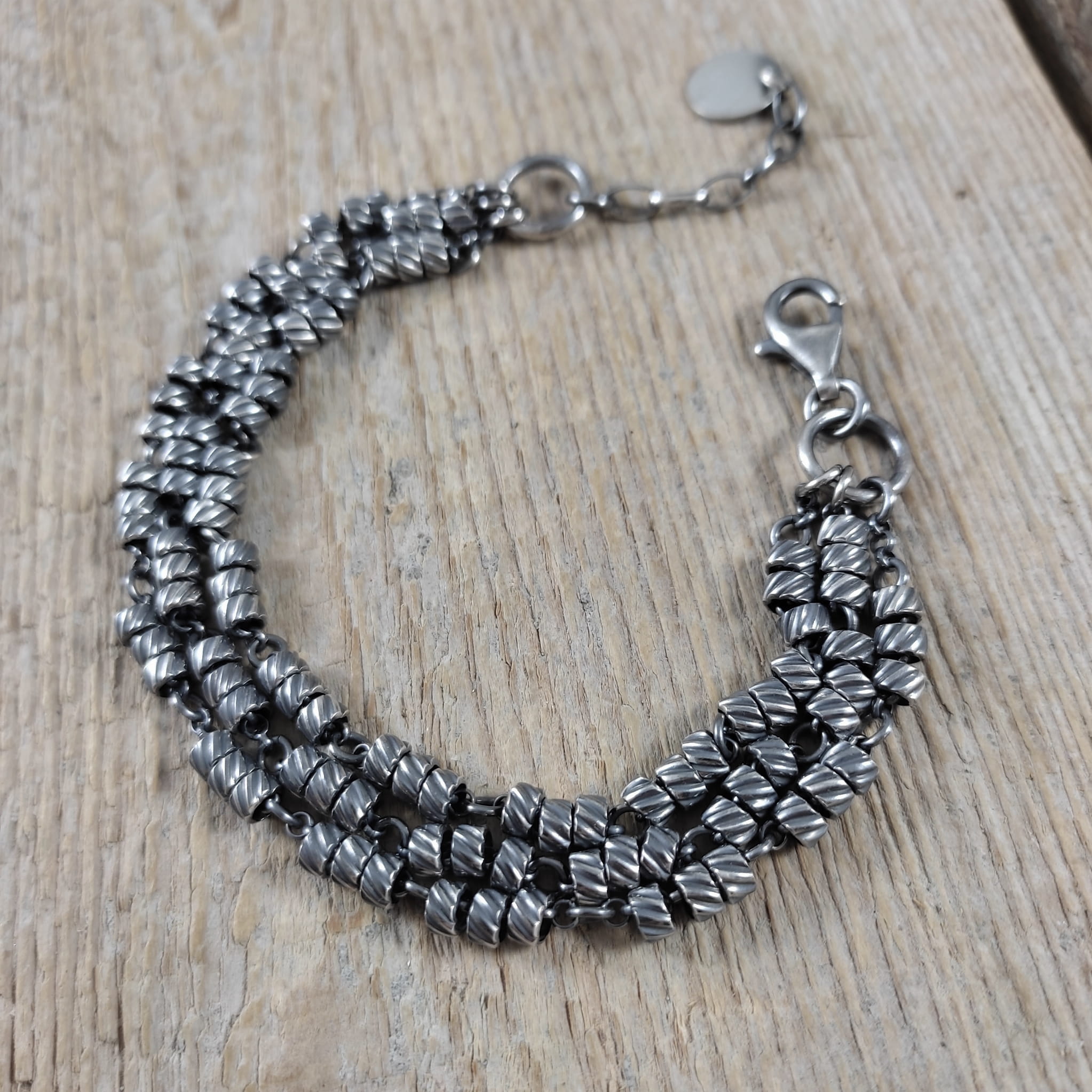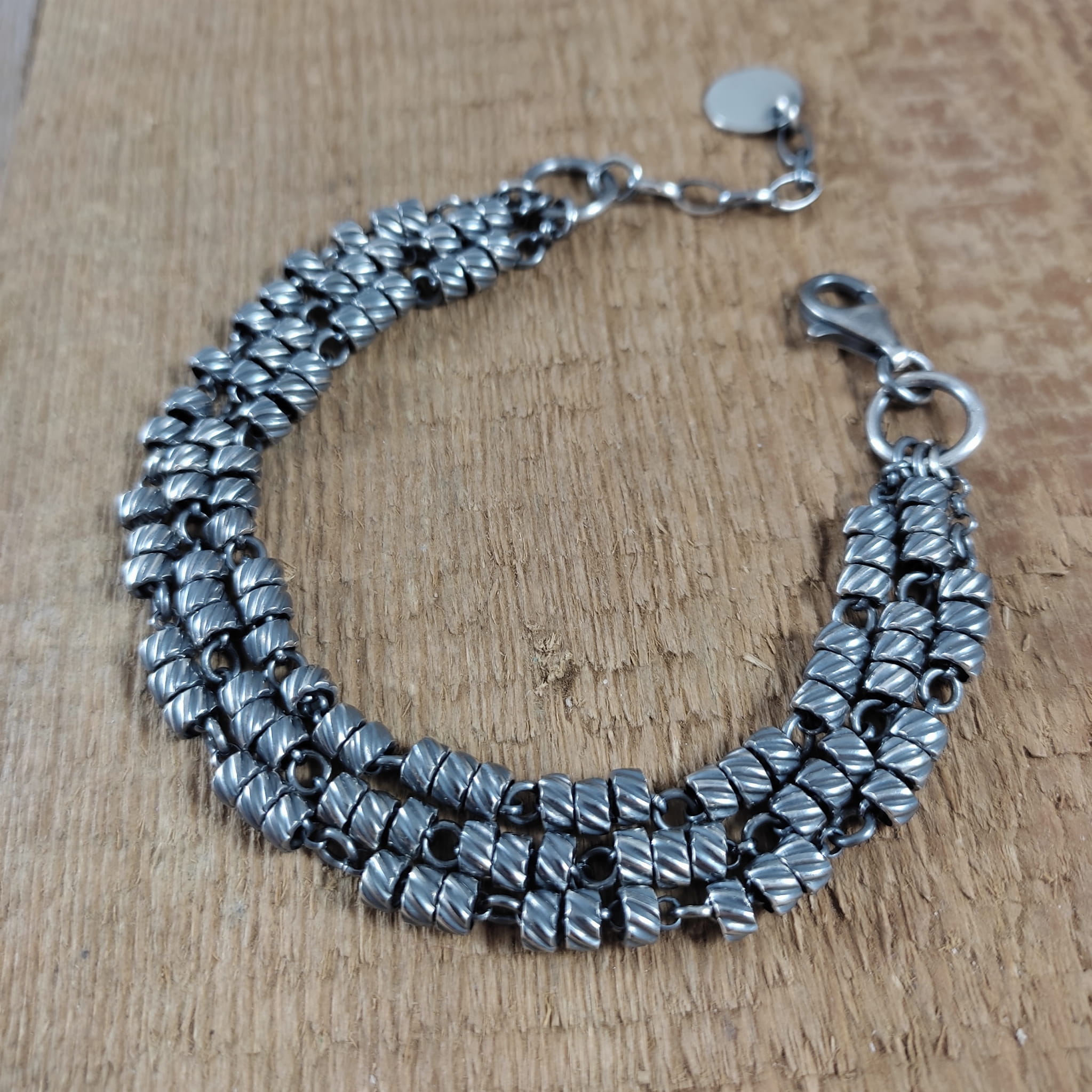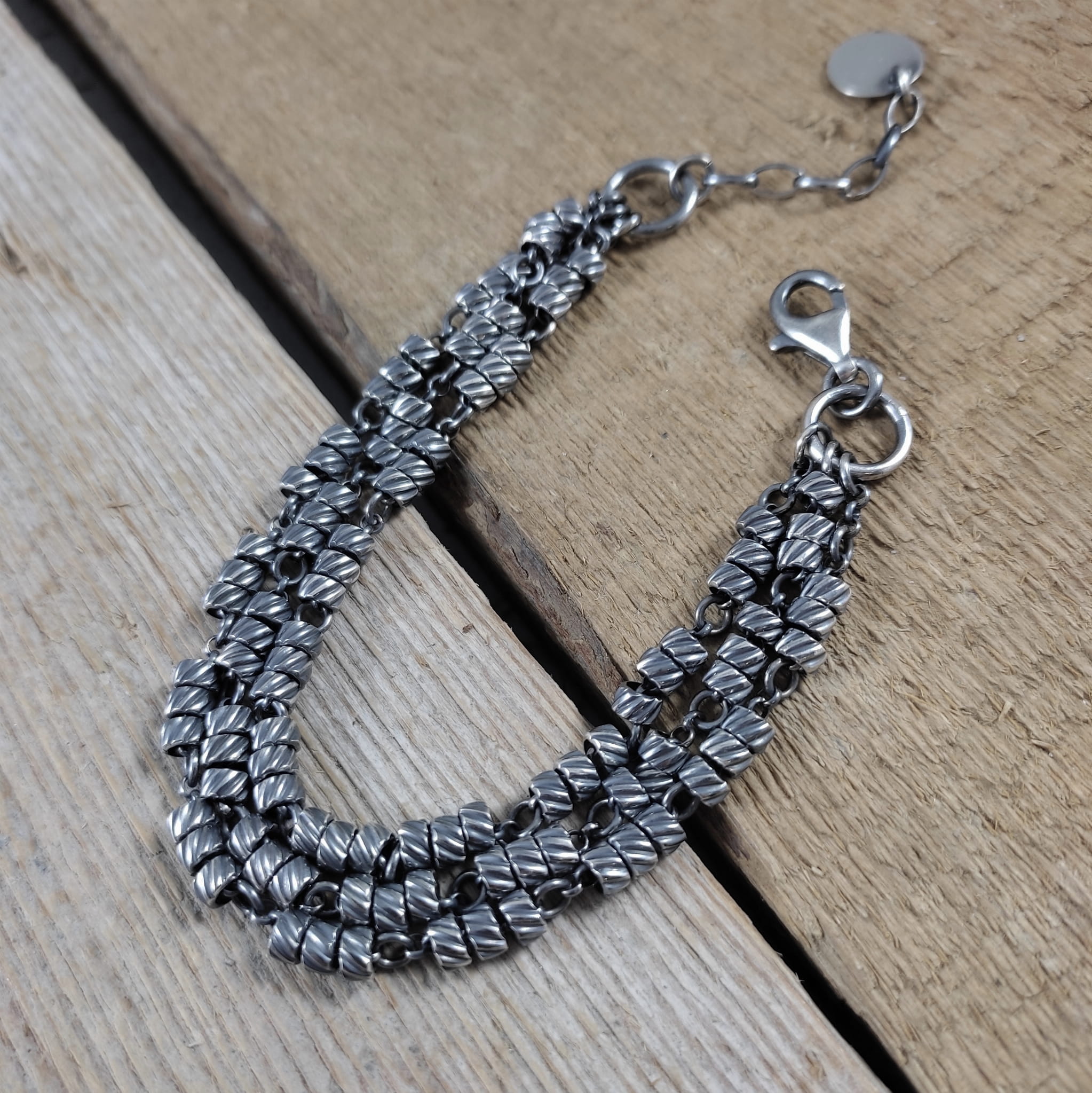 Bransoletka wykonana ze srebra próby 925, oksydowanego i wypolerowanego. Długość bransoletki wynosi ok. 18/19/19,5/20 cm, plus łańcuszek regulacyjny 2,5 cm. (Proszę wpisać w komentarzu, w przypadku braku wysyłamy 19,5 cm). Średnica srebrnych oponek ok. 4 mm. Elegancko zapakowana.