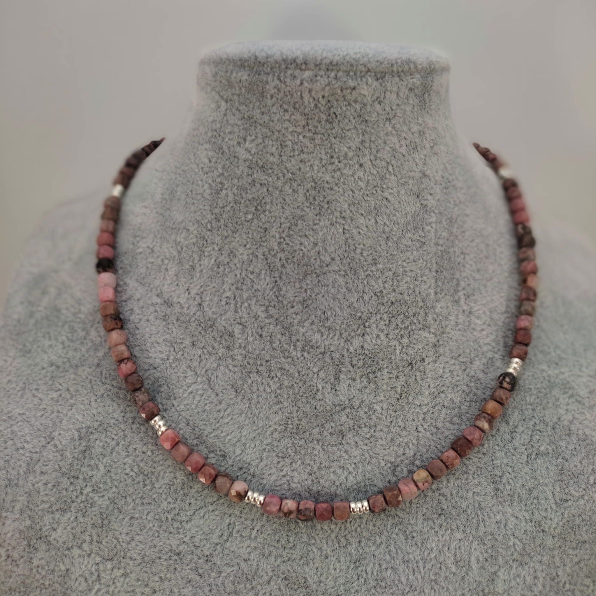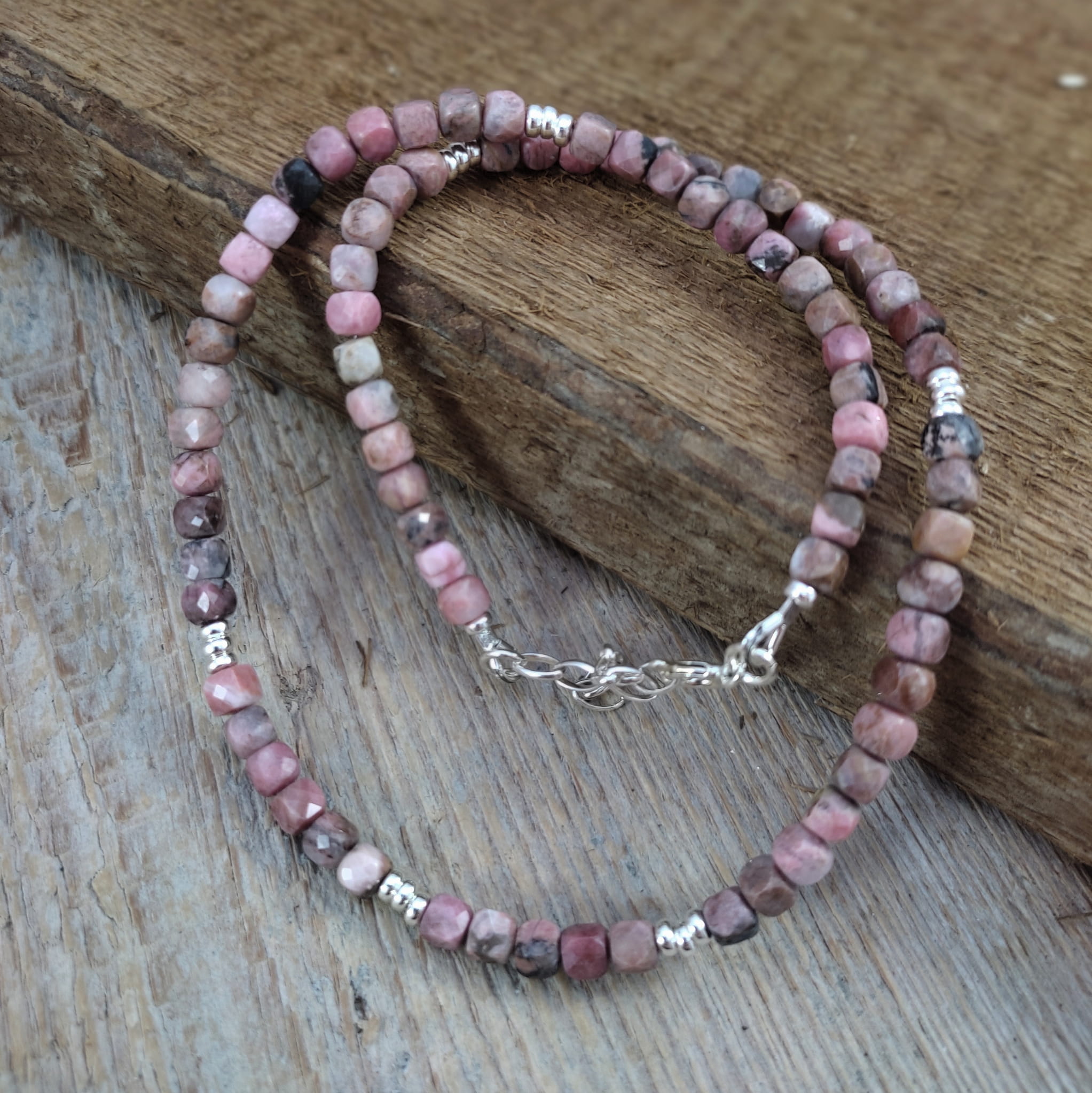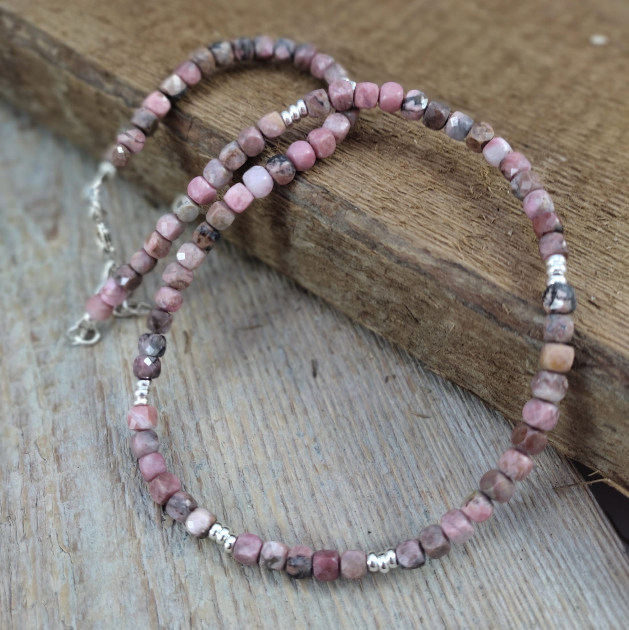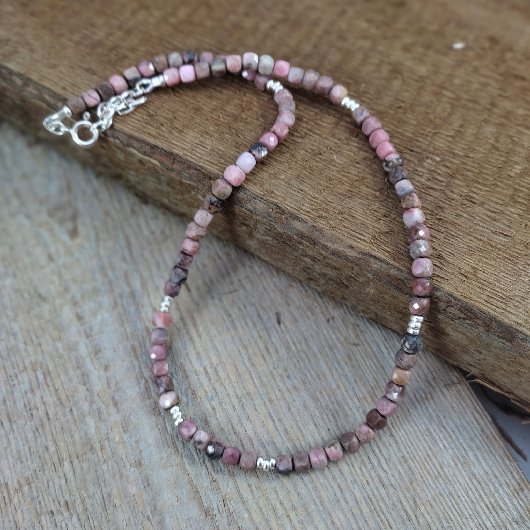 Naszyjnik wykonany z fasetowanych sześcianów rodonitu 4 mm. Całość dopełniona srebrem 925. Długość naszyjnika wynosi ok. 41 cm, plus łańcuszek regulacyjny 4,5 cm. Elegancko zapakowany. Kamienie posiadają delikatne niedoskonałości, ryski.