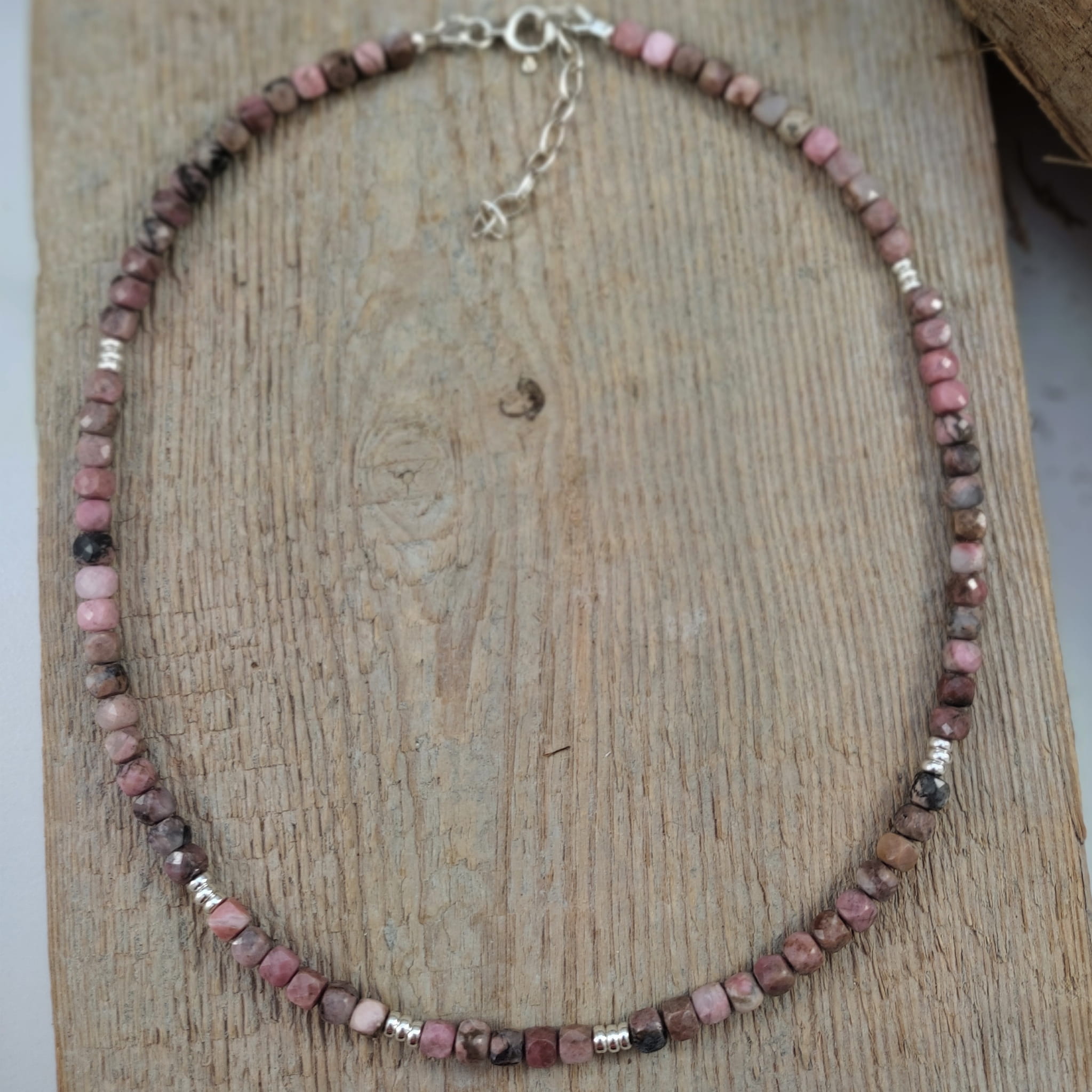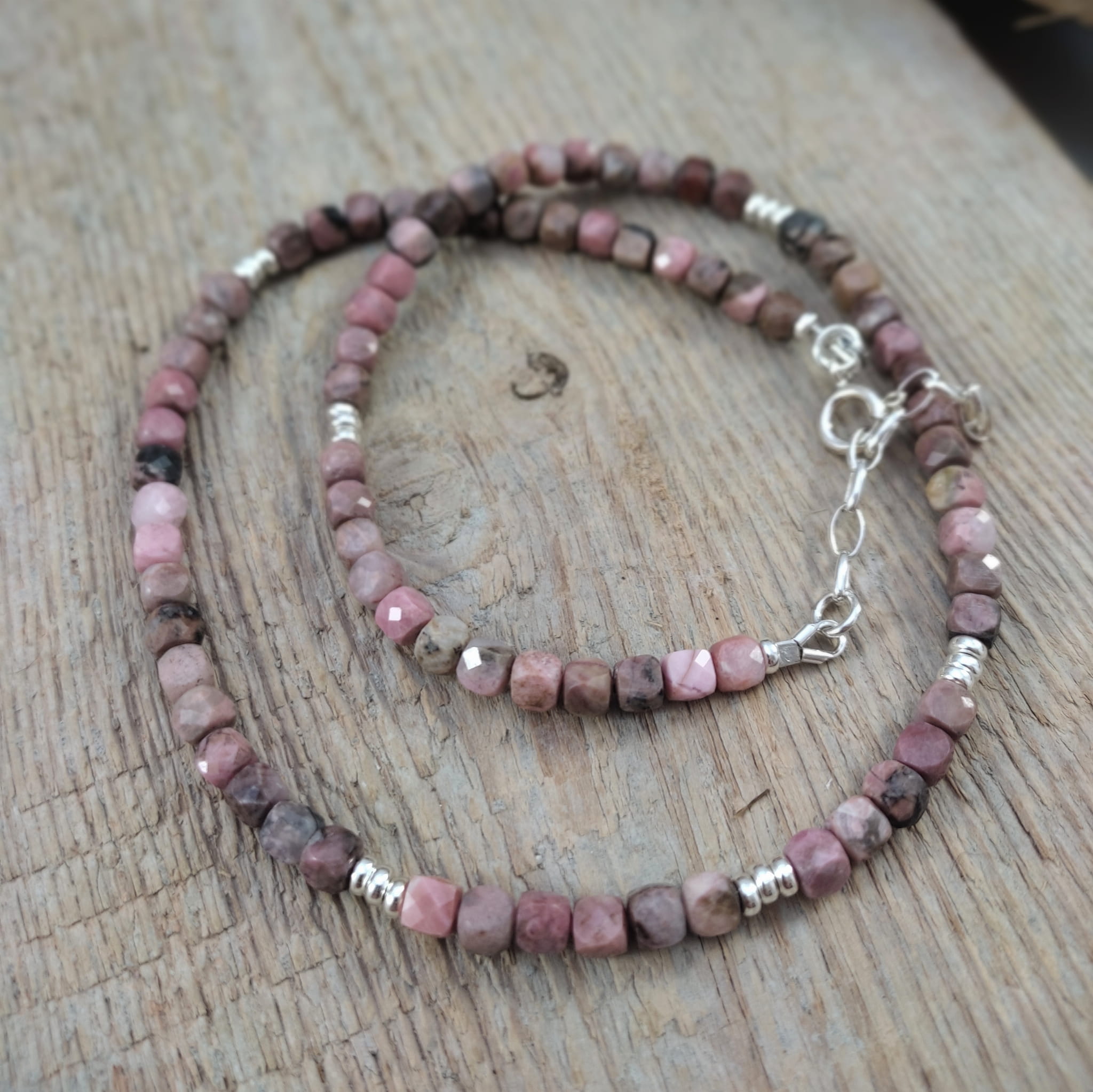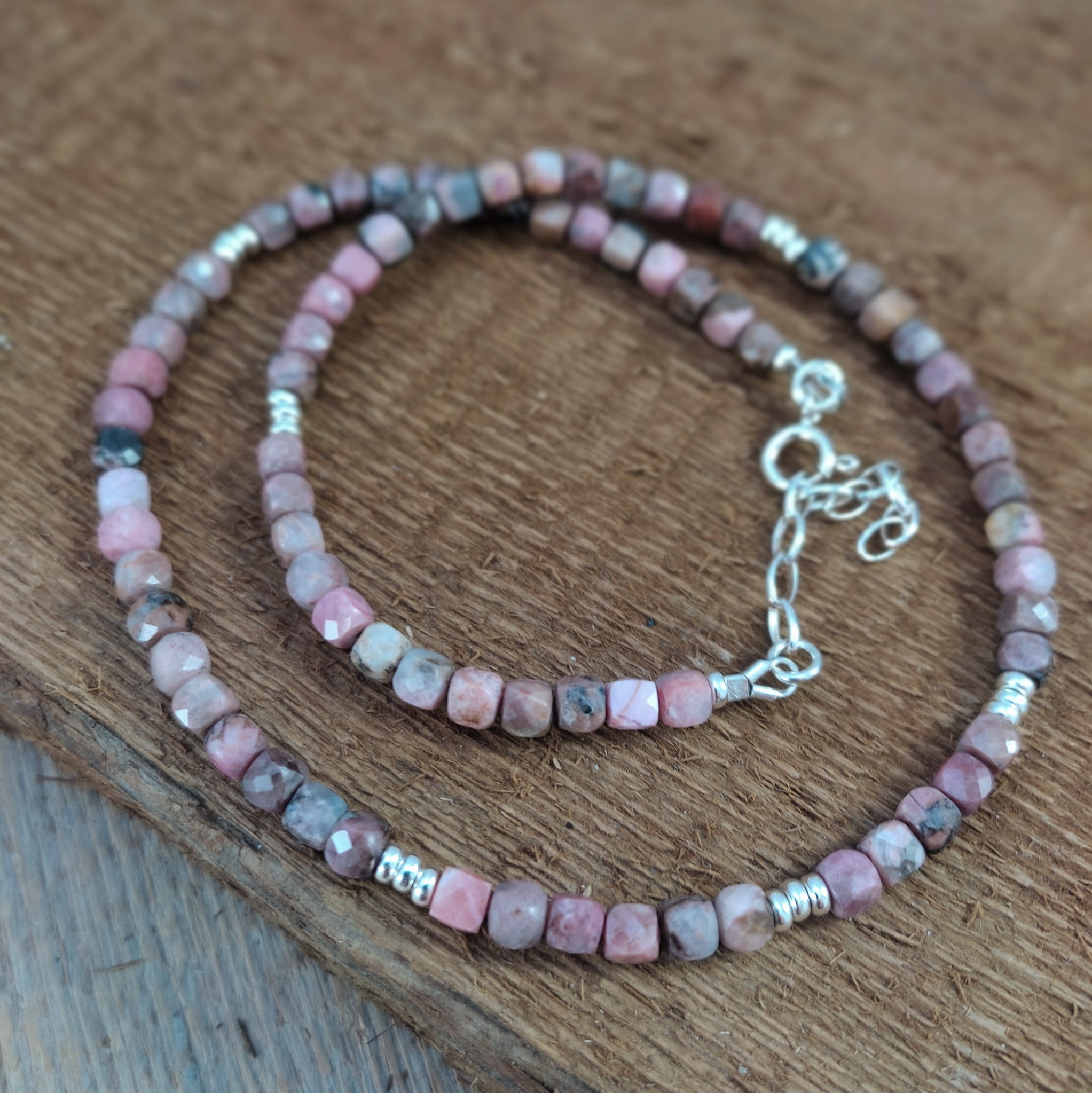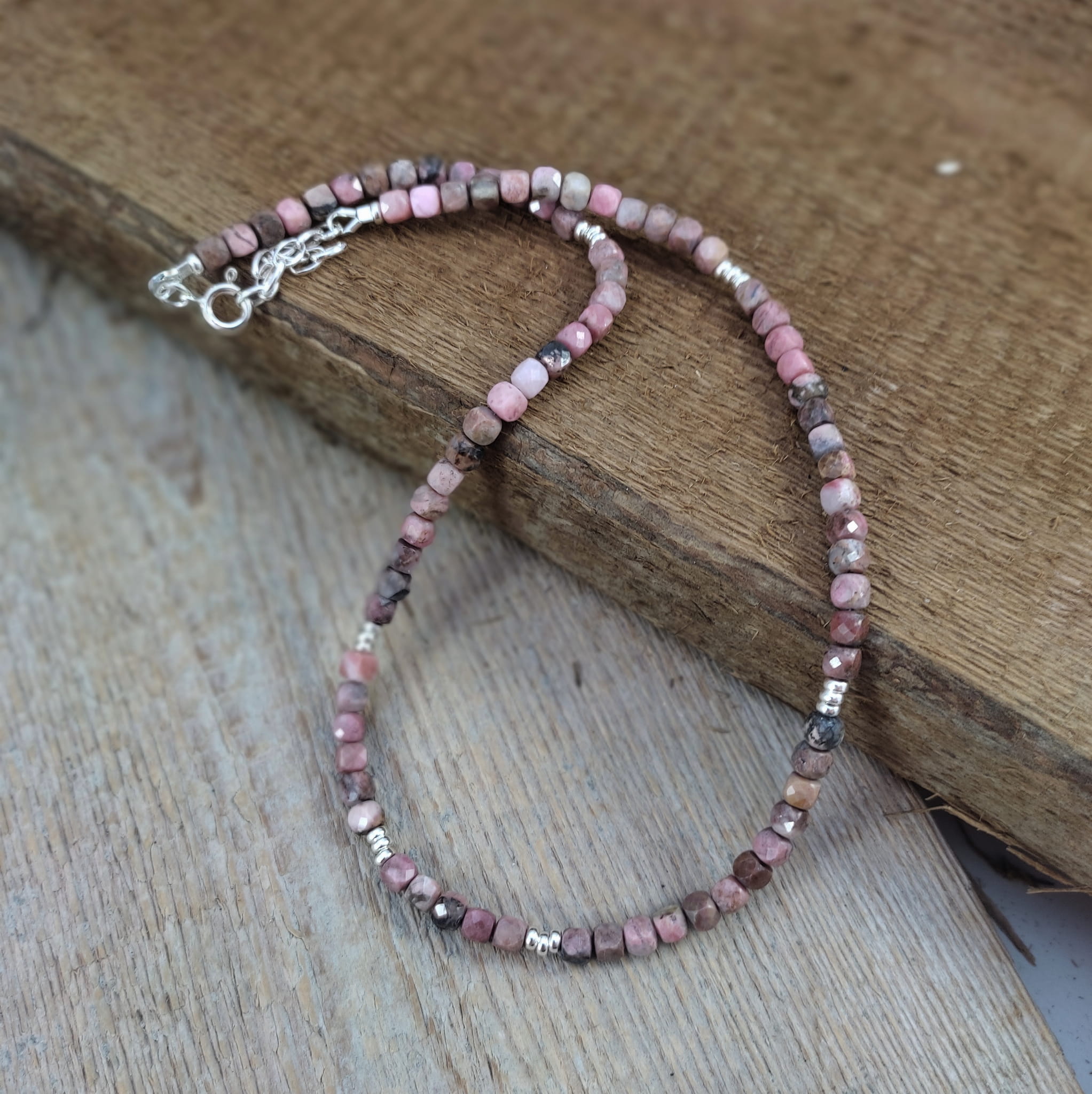 Naszyjnik wykonany z fasetowanych sześcianów rodonitu 4 mm. Całość dopełniona srebrem 925. Długość naszyjnika wynosi ok. 41 cm, plus łańcuszek regulacyjny 4,5 cm. Elegancko zapakowany. Kamienie posiadają delikatne niedoskonałości, ryski.