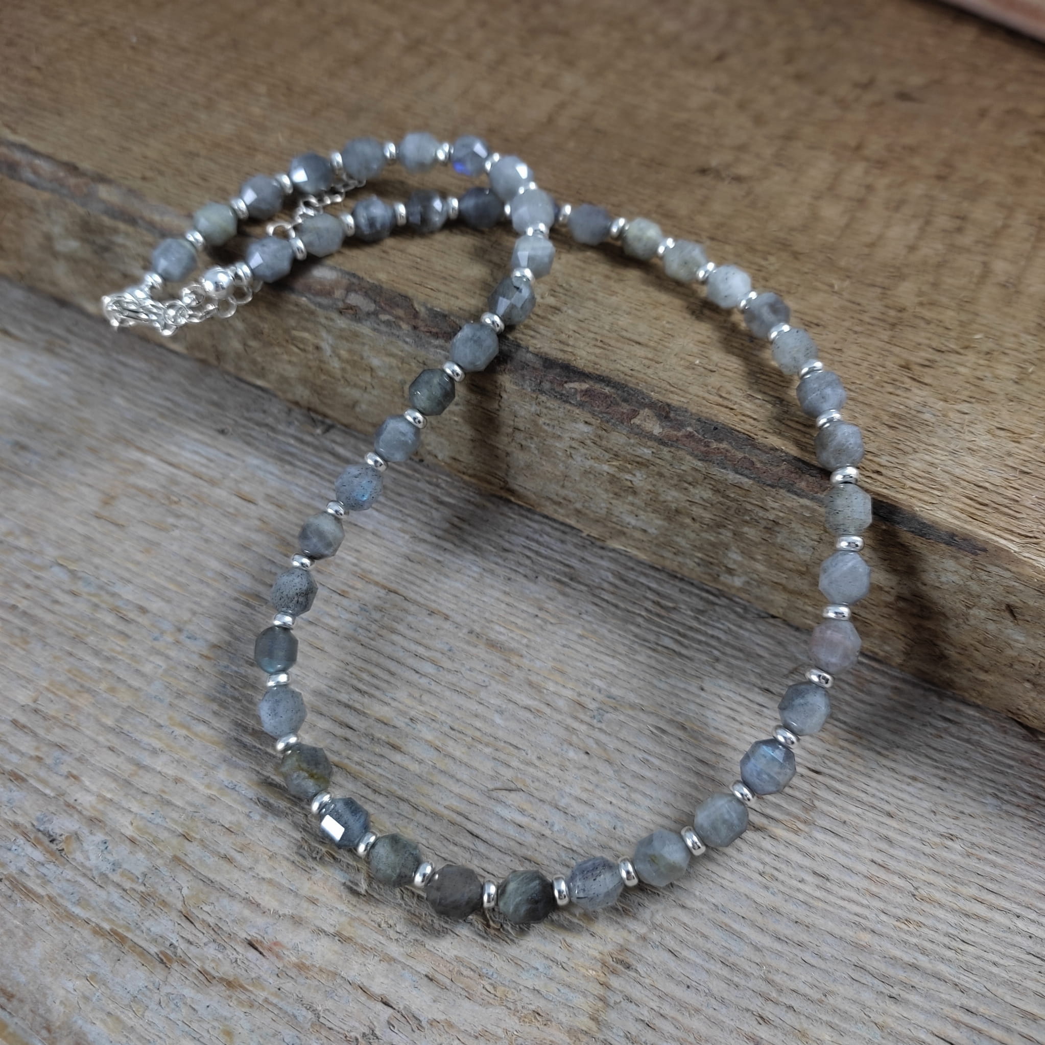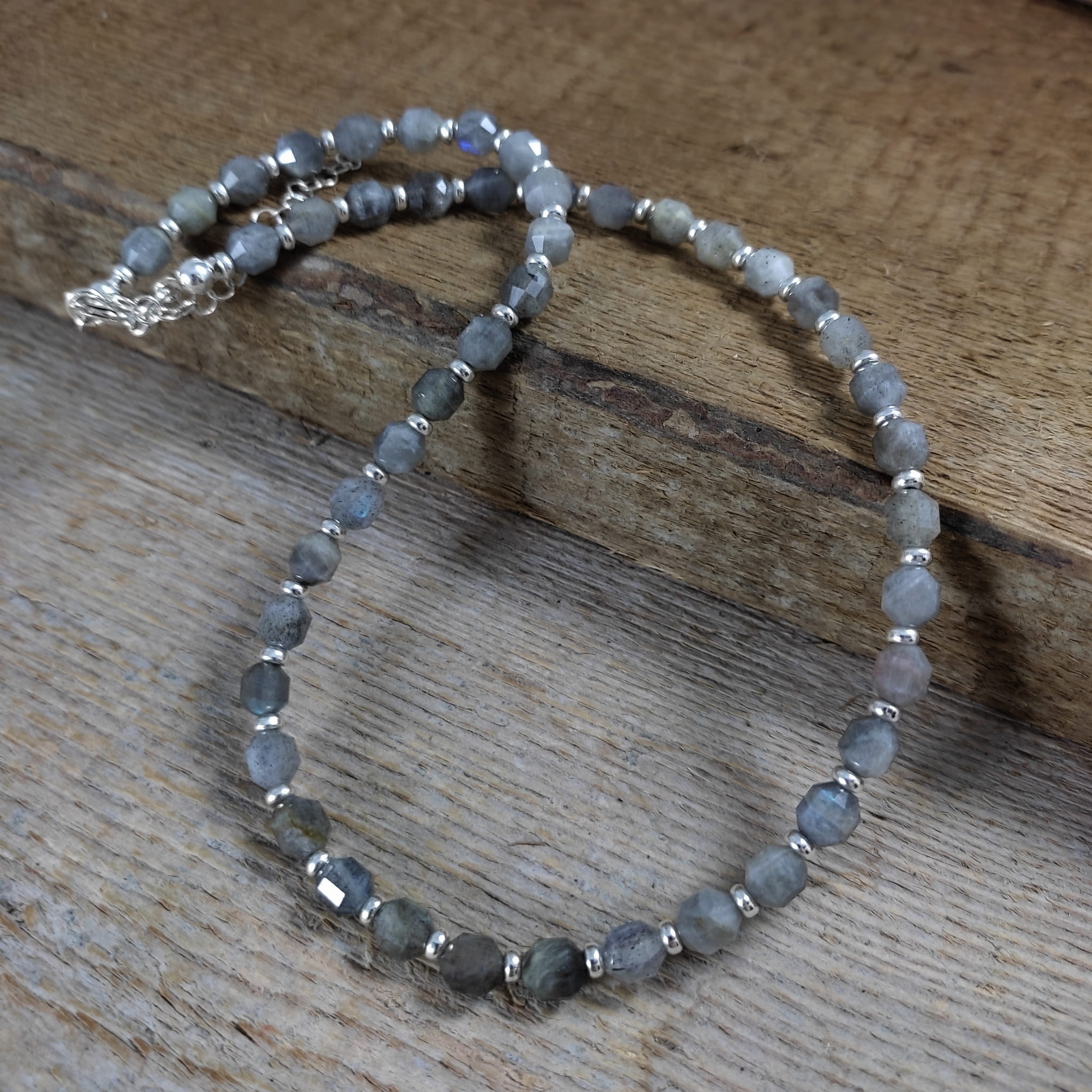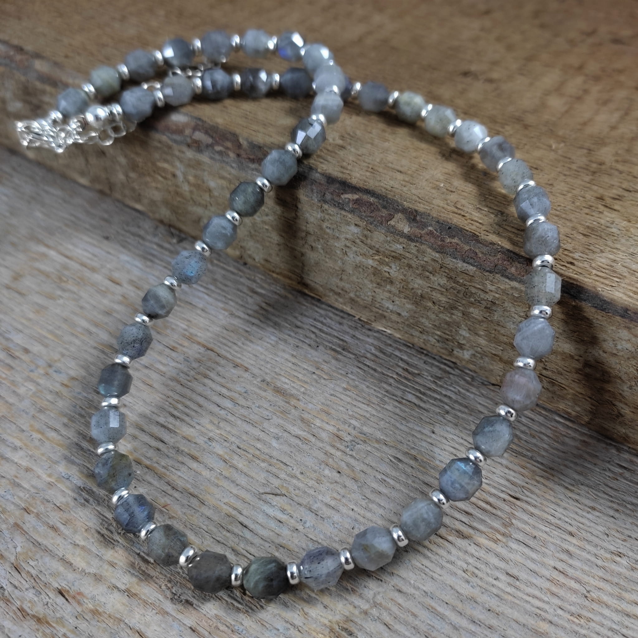 Naszyjnik wykonany z fasetowanych bryłek labradorytu ok. 5,5/6,5 mm. Całość wykończona w srebrze 925. Długość naszyjnika wynosi ok. 38 cm, plus łańcuszek regulacyjny 5 cm. Elegancko zapakowany. Kamienie posiadają delikatne niedoskonałości.