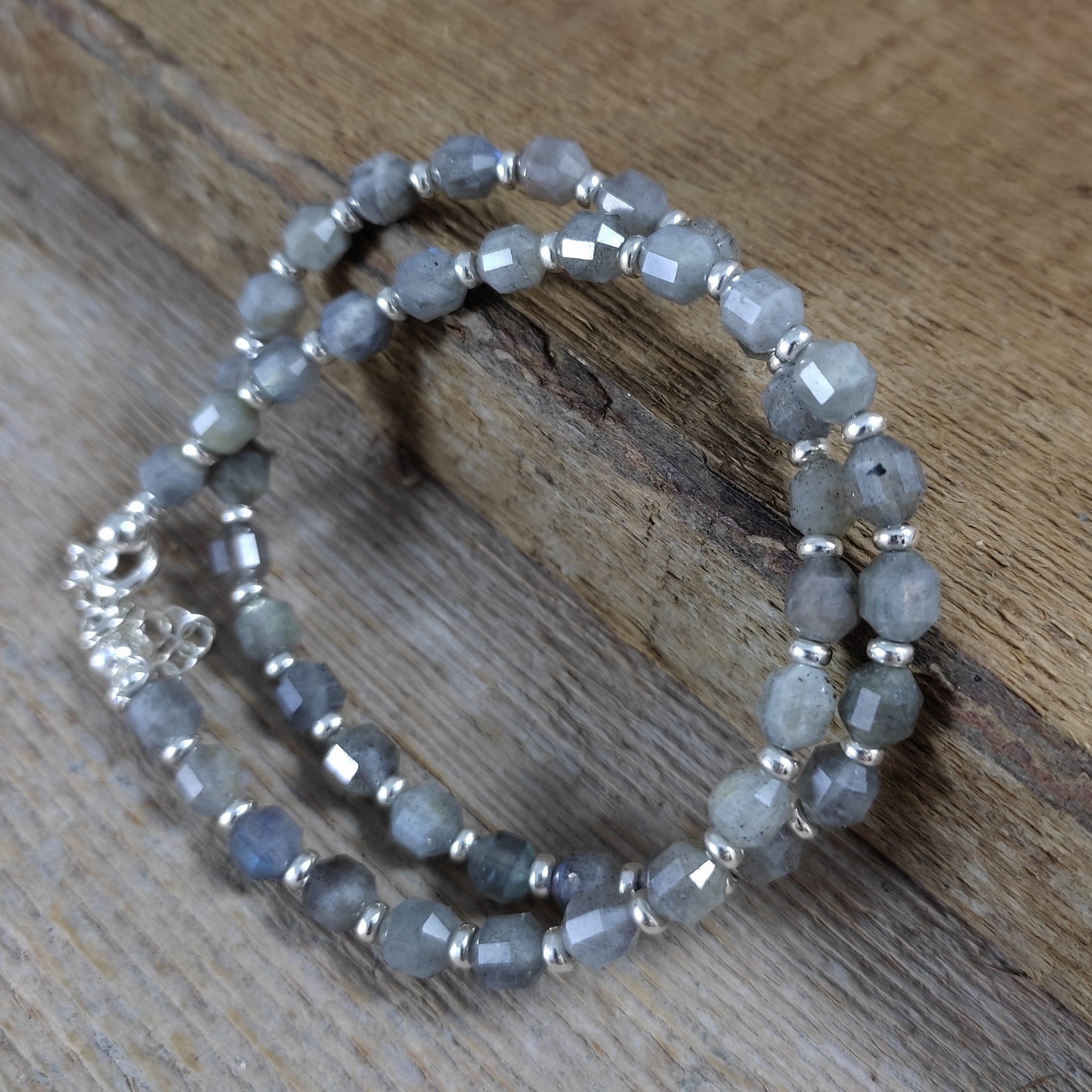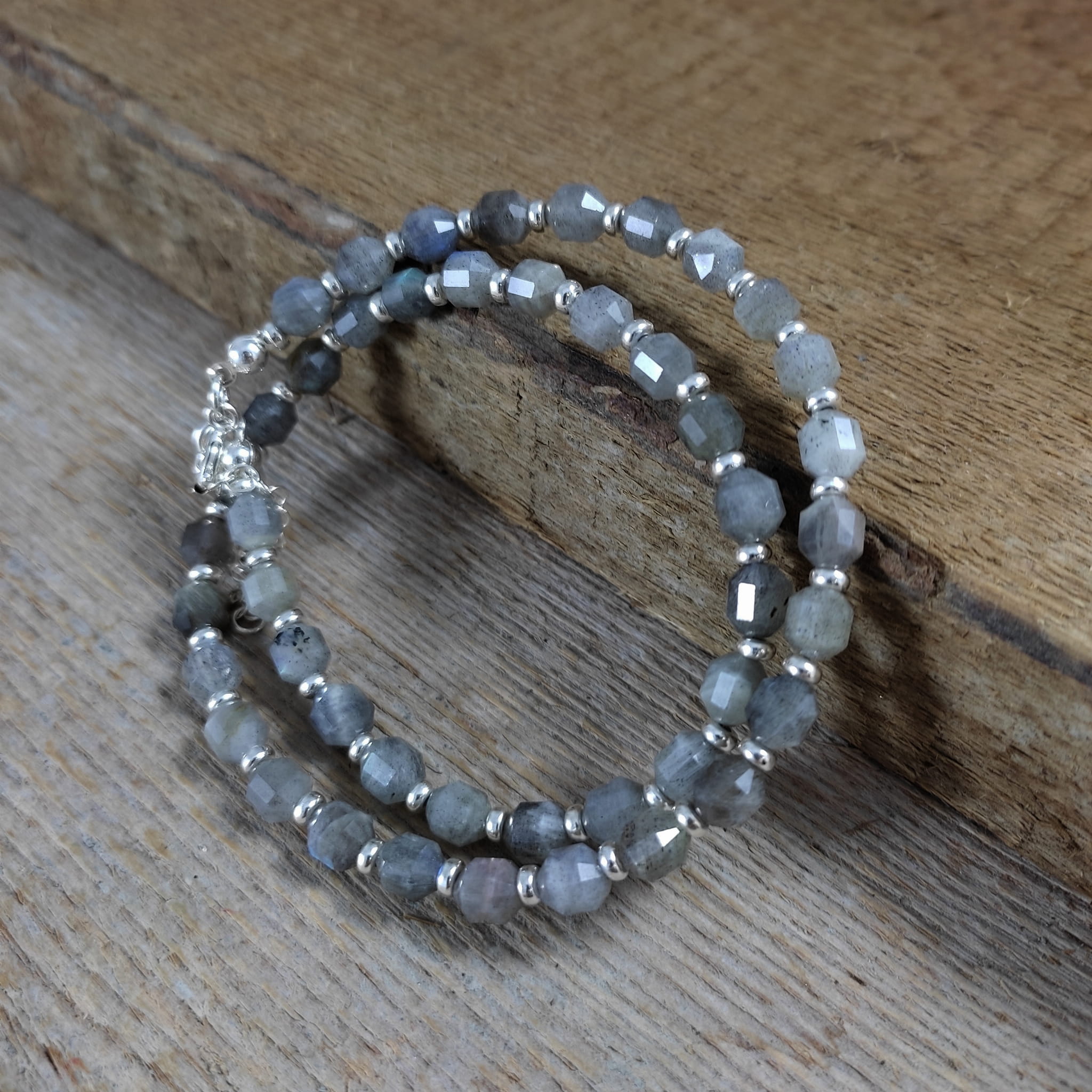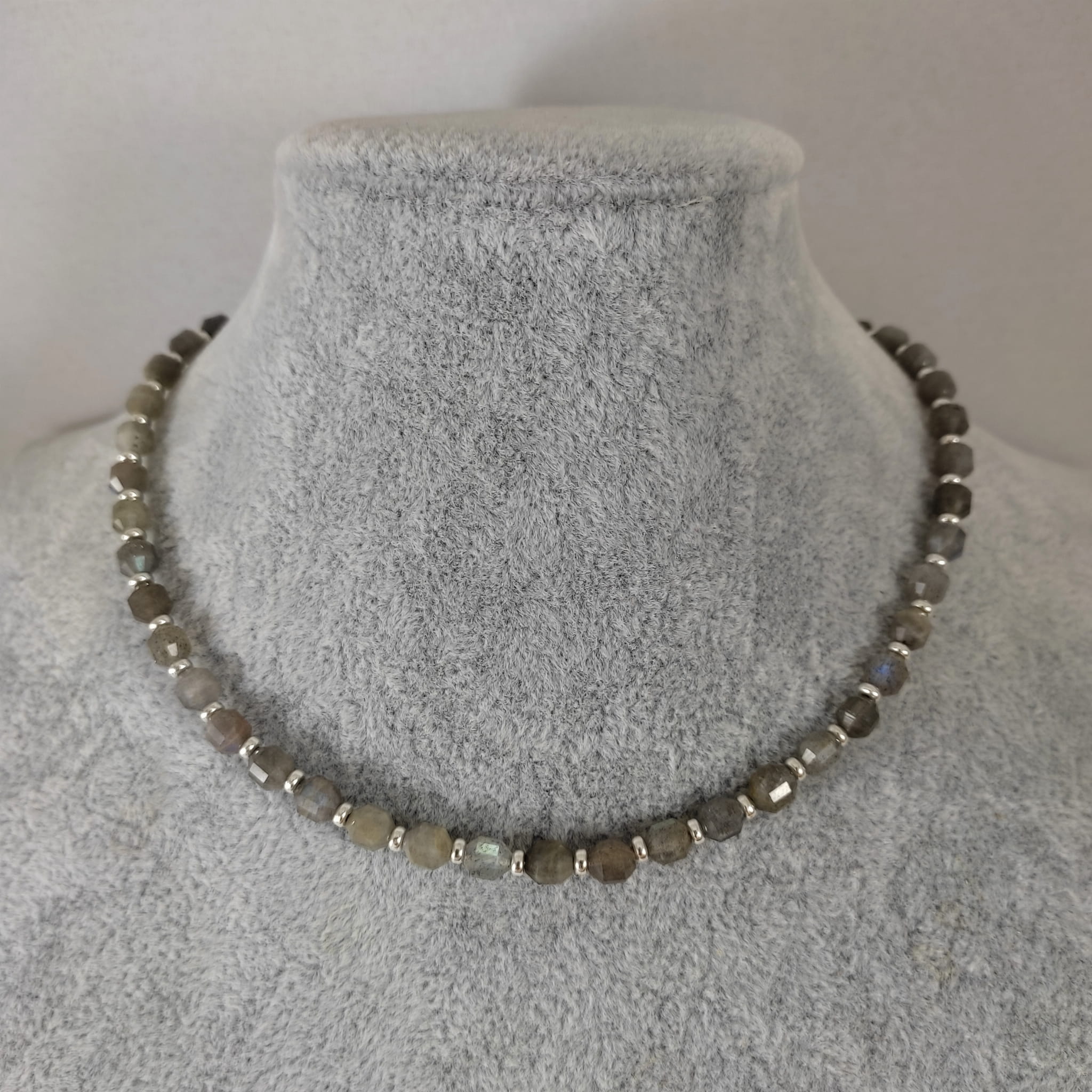 Naszyjnik wykonany z fasetowanych bryłek labradorytu ok. 5,5/6,5 mm. Całość wykończona w srebrze 925. Długość naszyjnika wynosi ok. 38 cm, plus łańcuszek regulacyjny 5 cm. Elegancko zapakowany. Kamienie posiadają delikatne niedoskonałości.