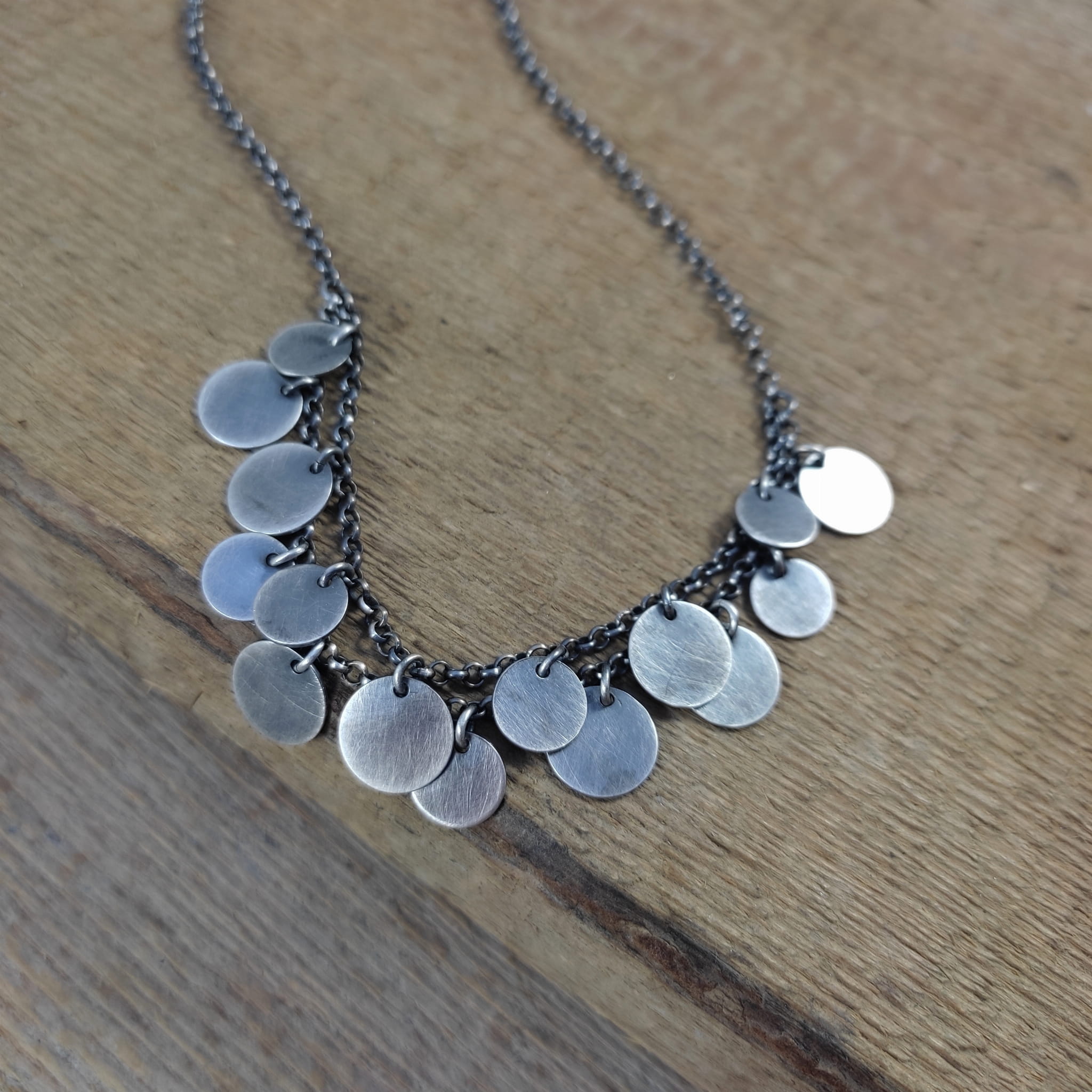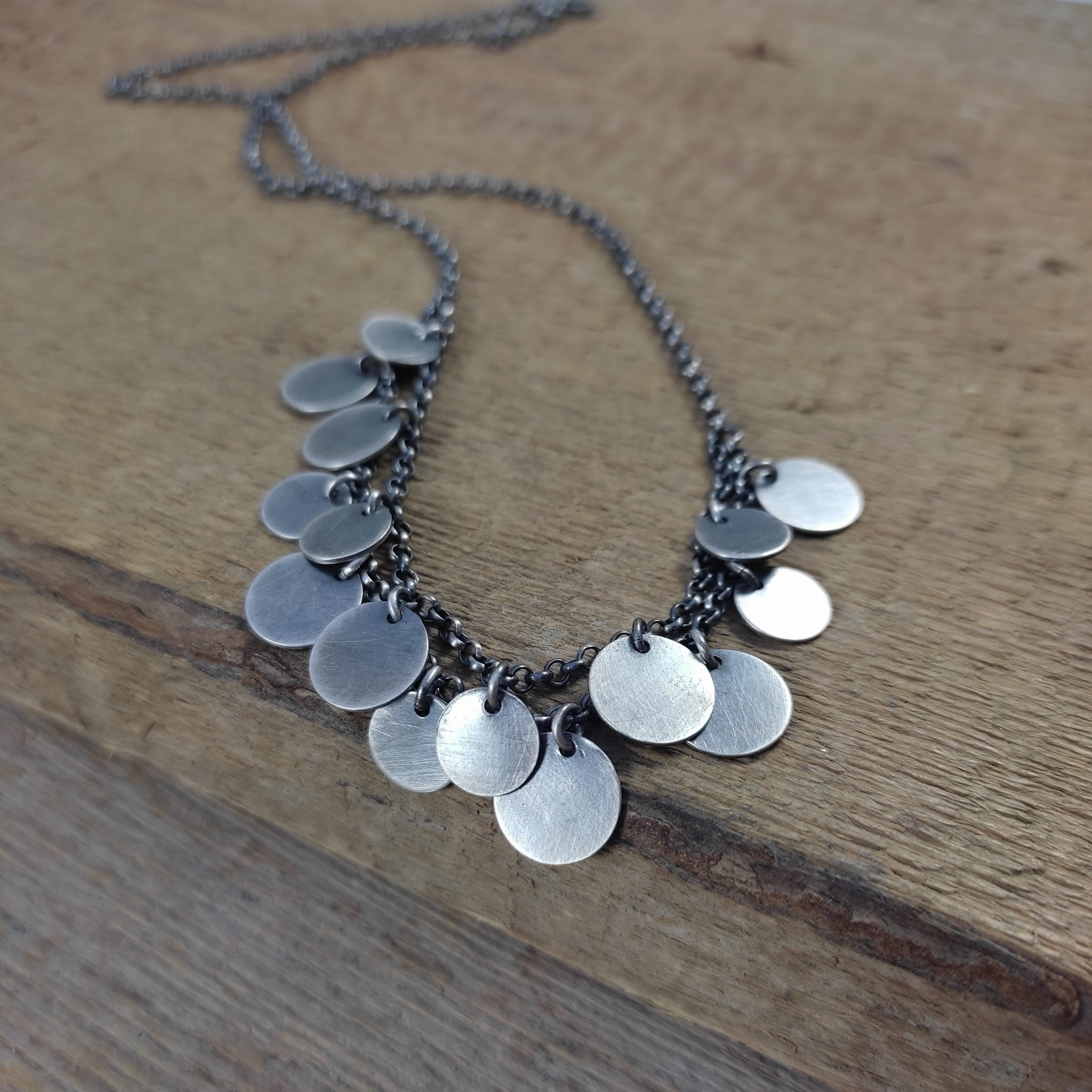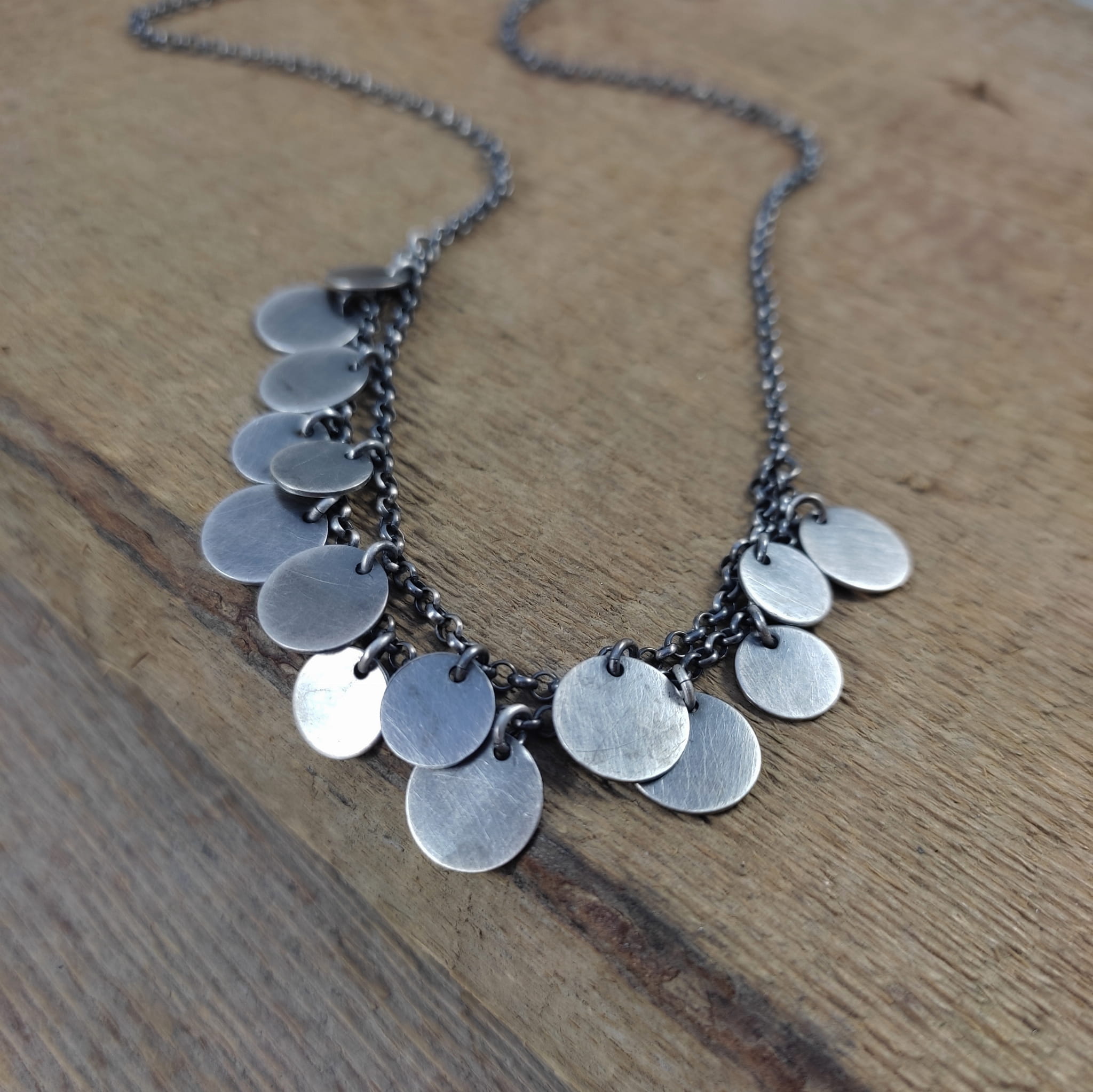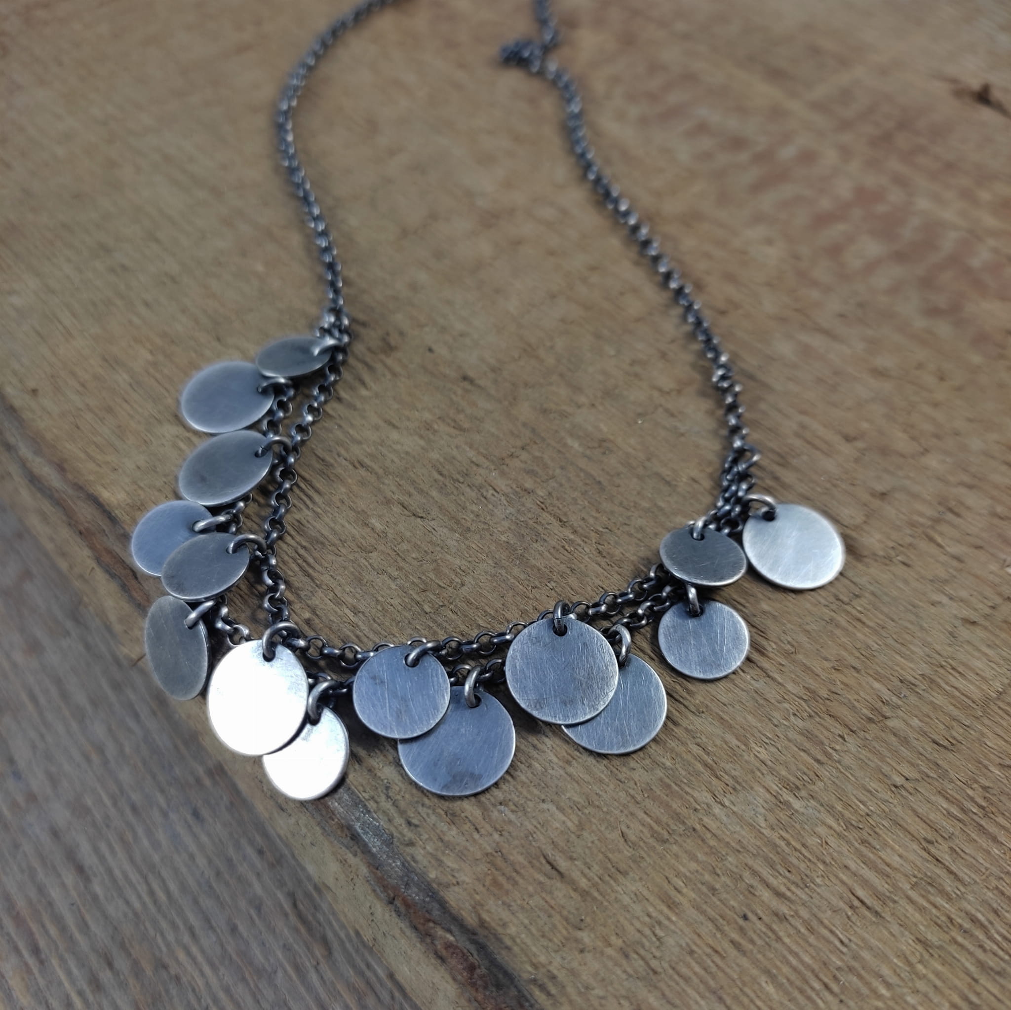 Naszyjnik wykonany ze srebra 925, oksydowanego i wypolerowanego.