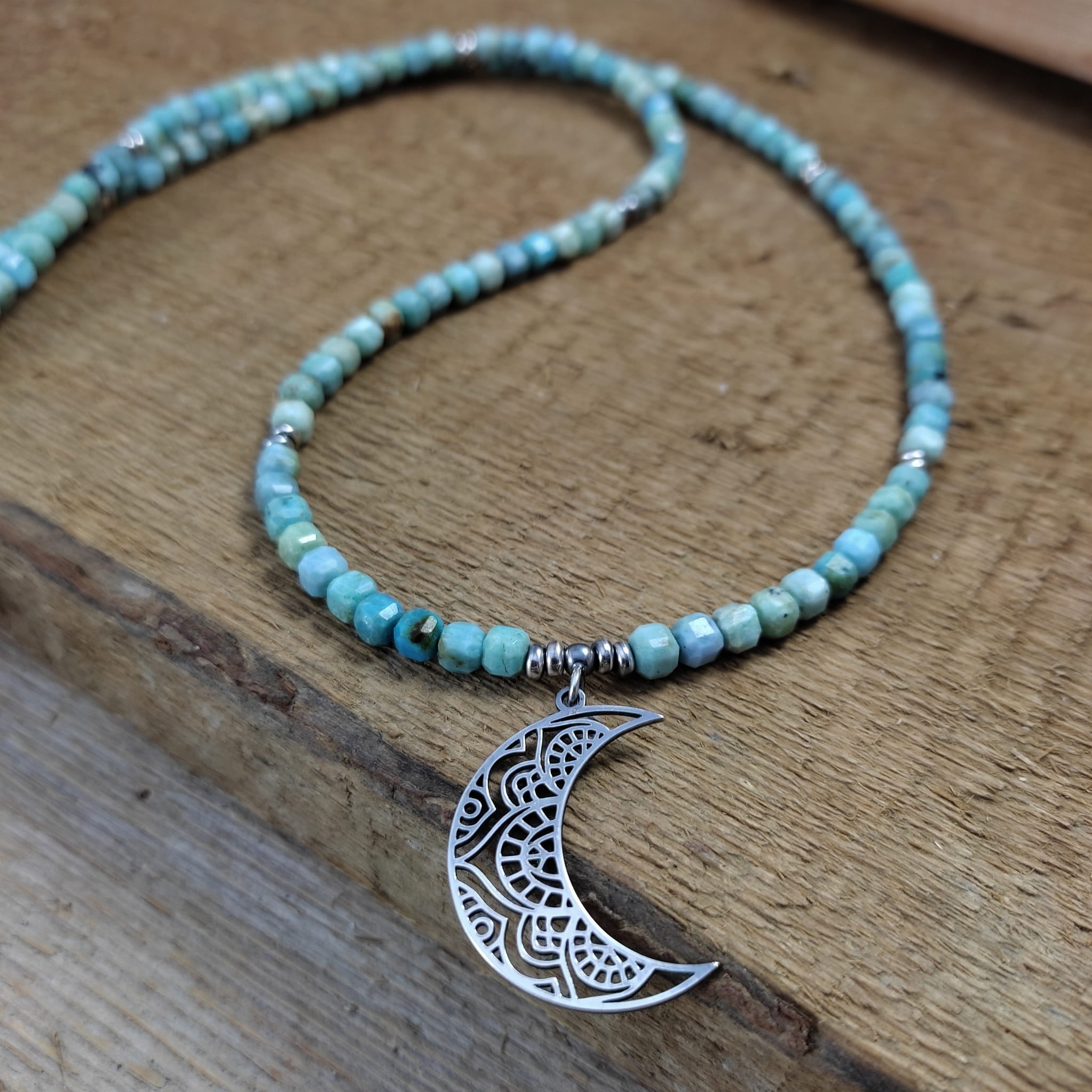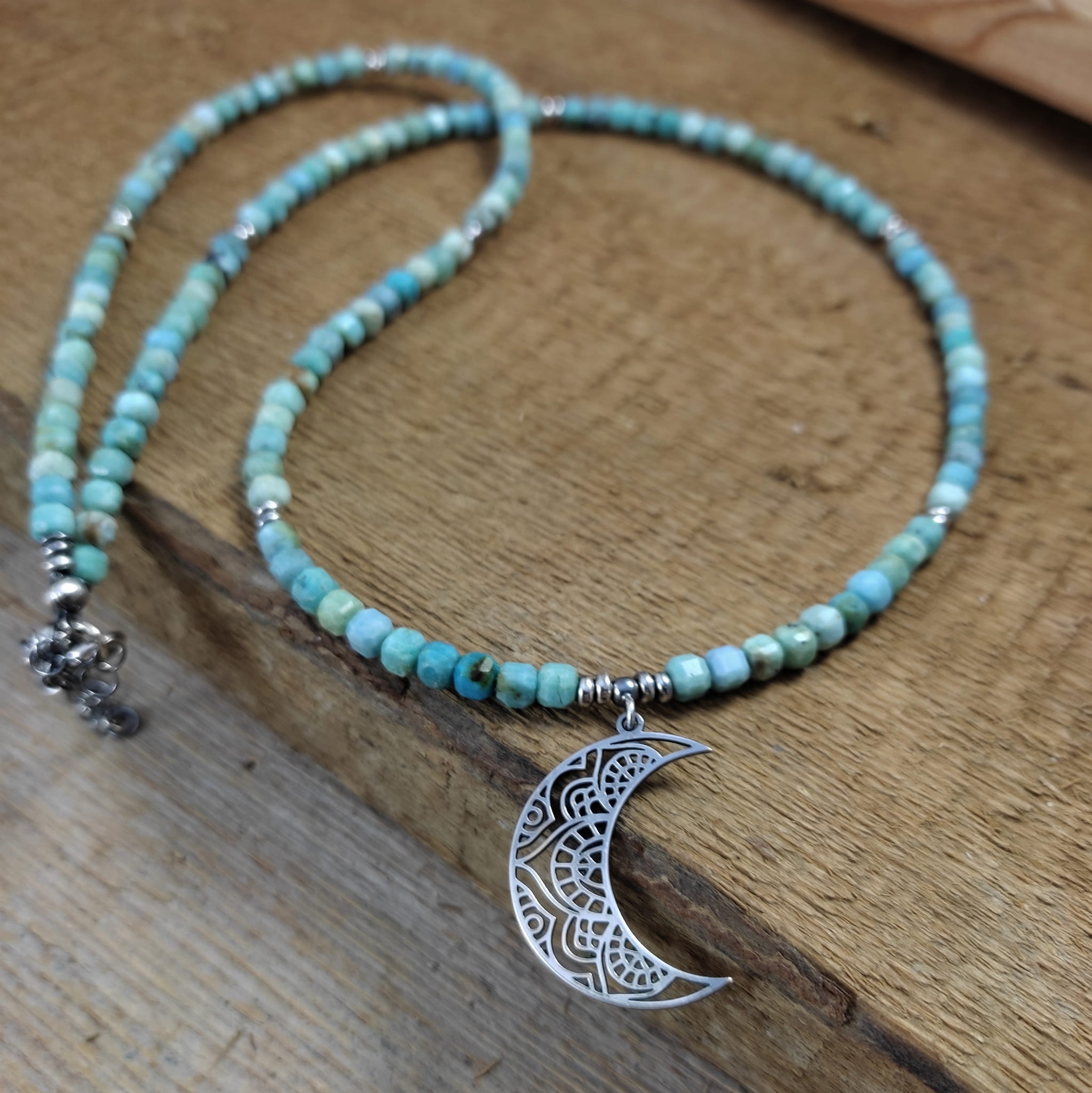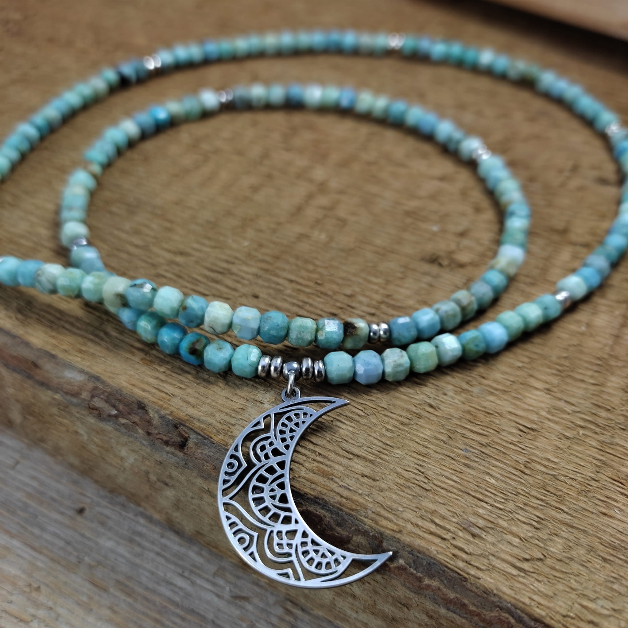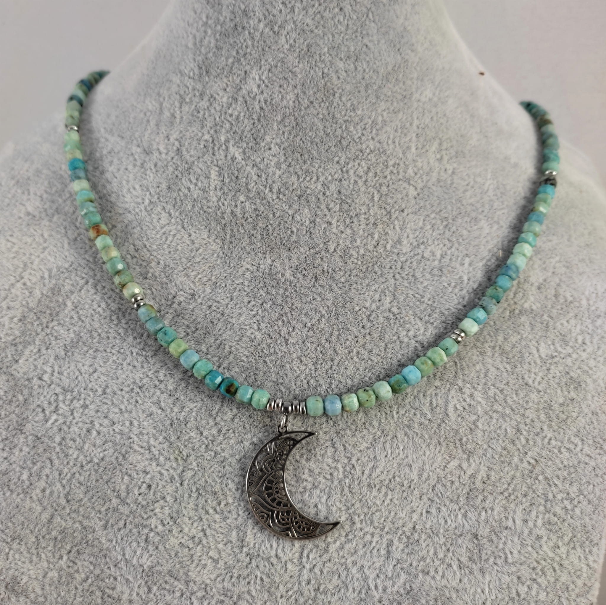 Naszyjnik wykonany z fasetowanych sześcianów turkusu 4 mm. Całość wykończona w srebrze 925, oksydowanym i wypolerowanym. Długość naszyjnika wynosi ok. 63 cm, plus łańcuszek regulacyjny 5 cm. Wielkość księżyca 27,5/19,5/0,8 mm. Elegancko zapakowany. Kamienie posiadają delikatne niedoskonałości.