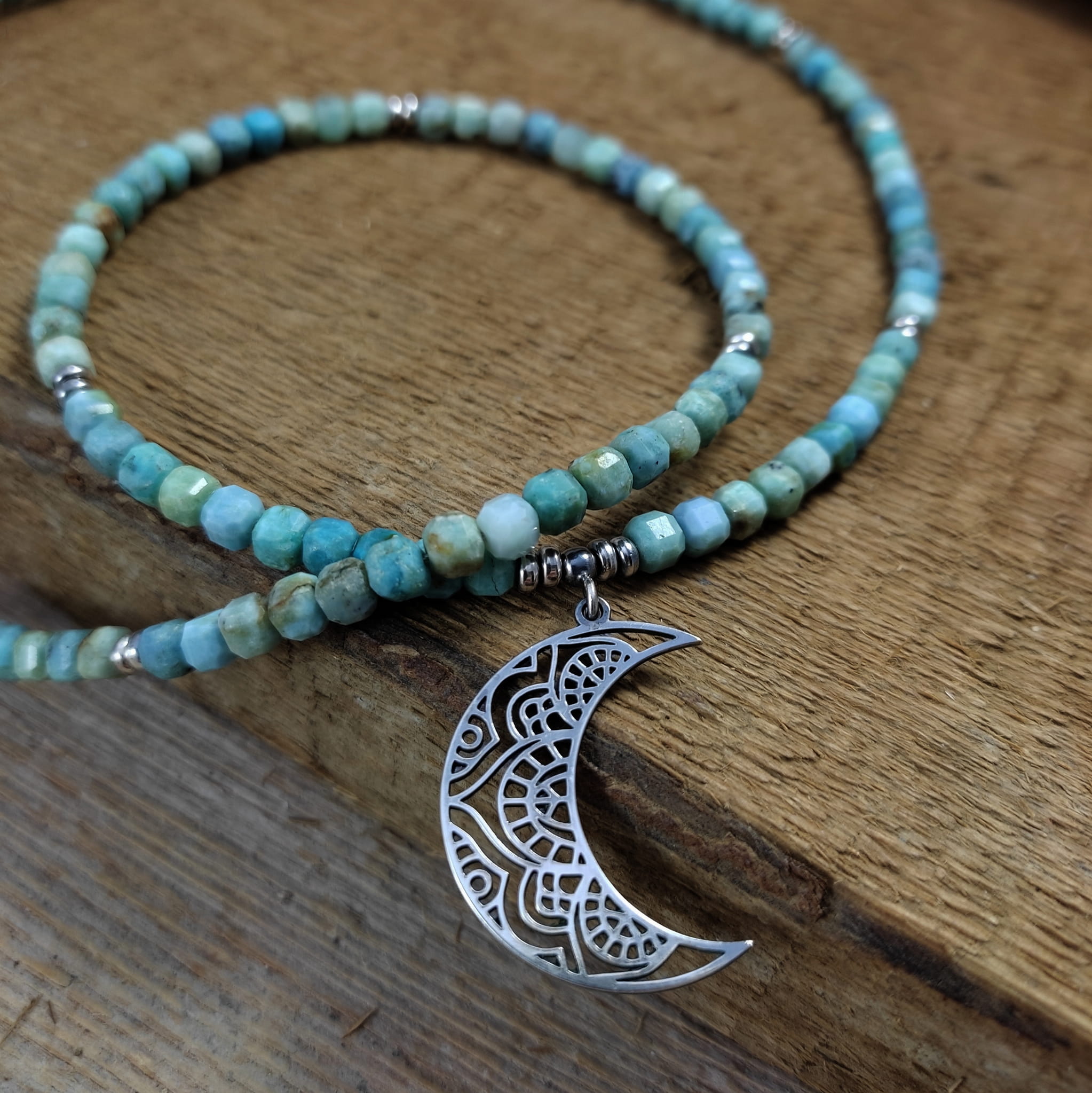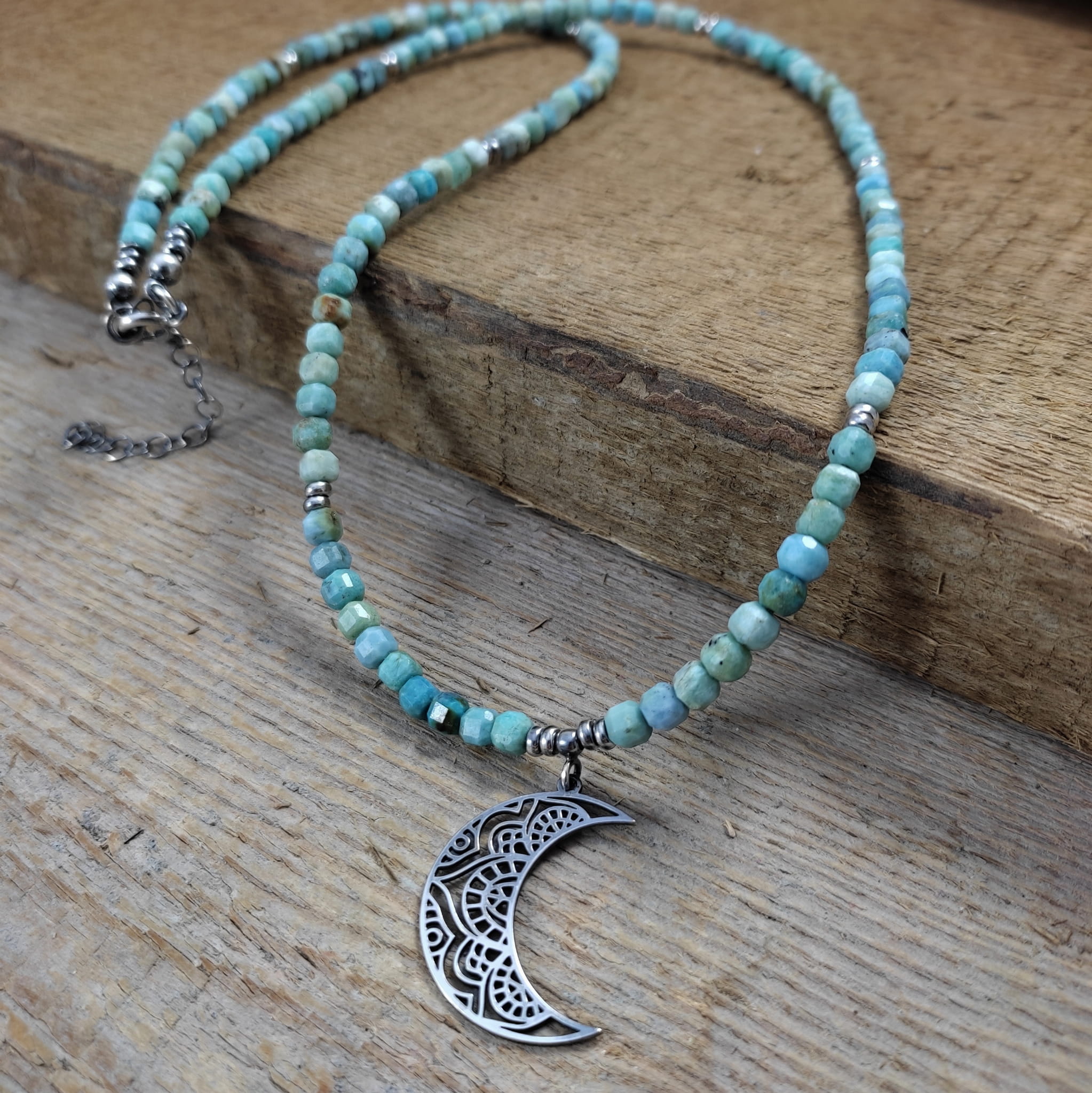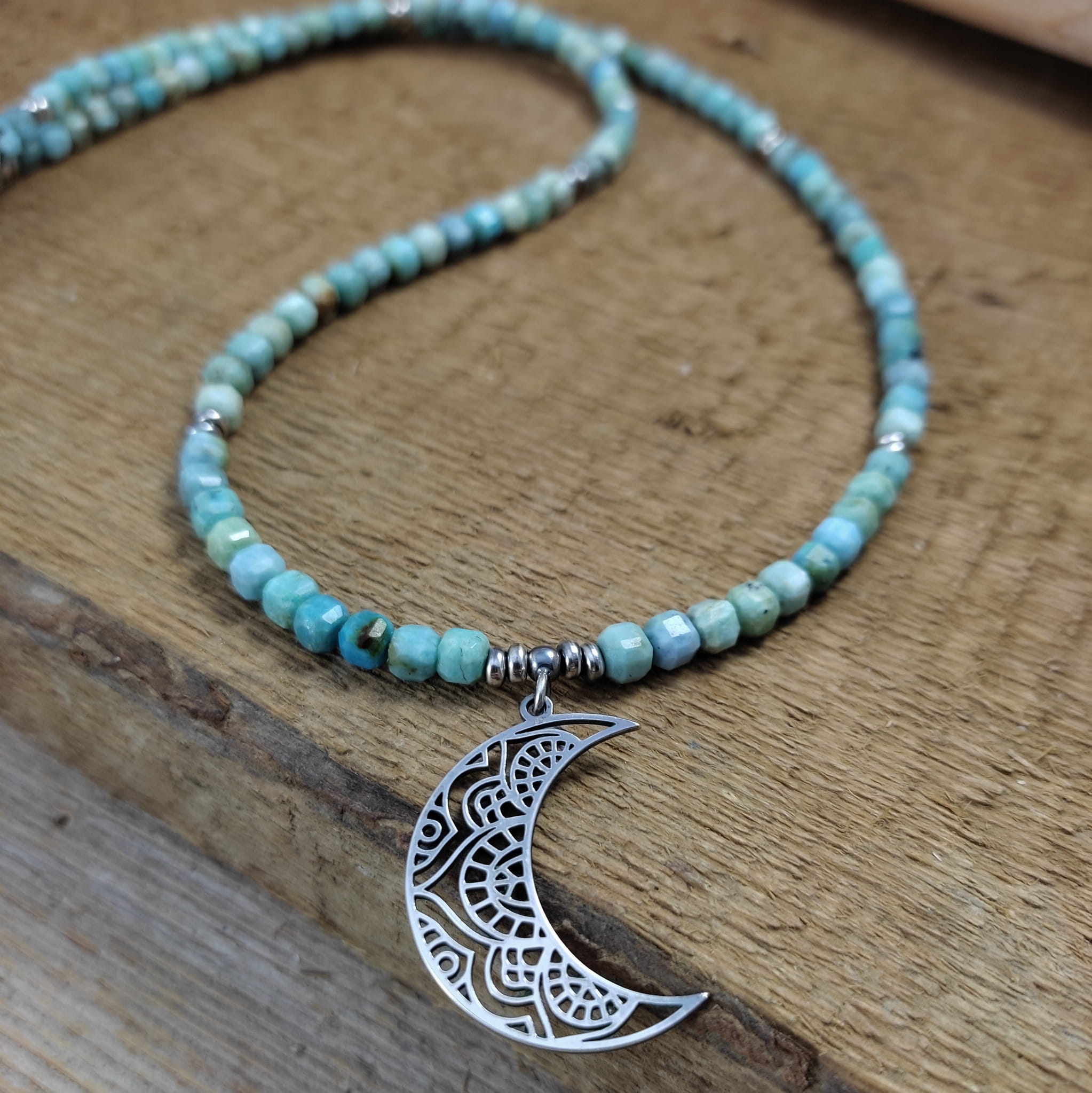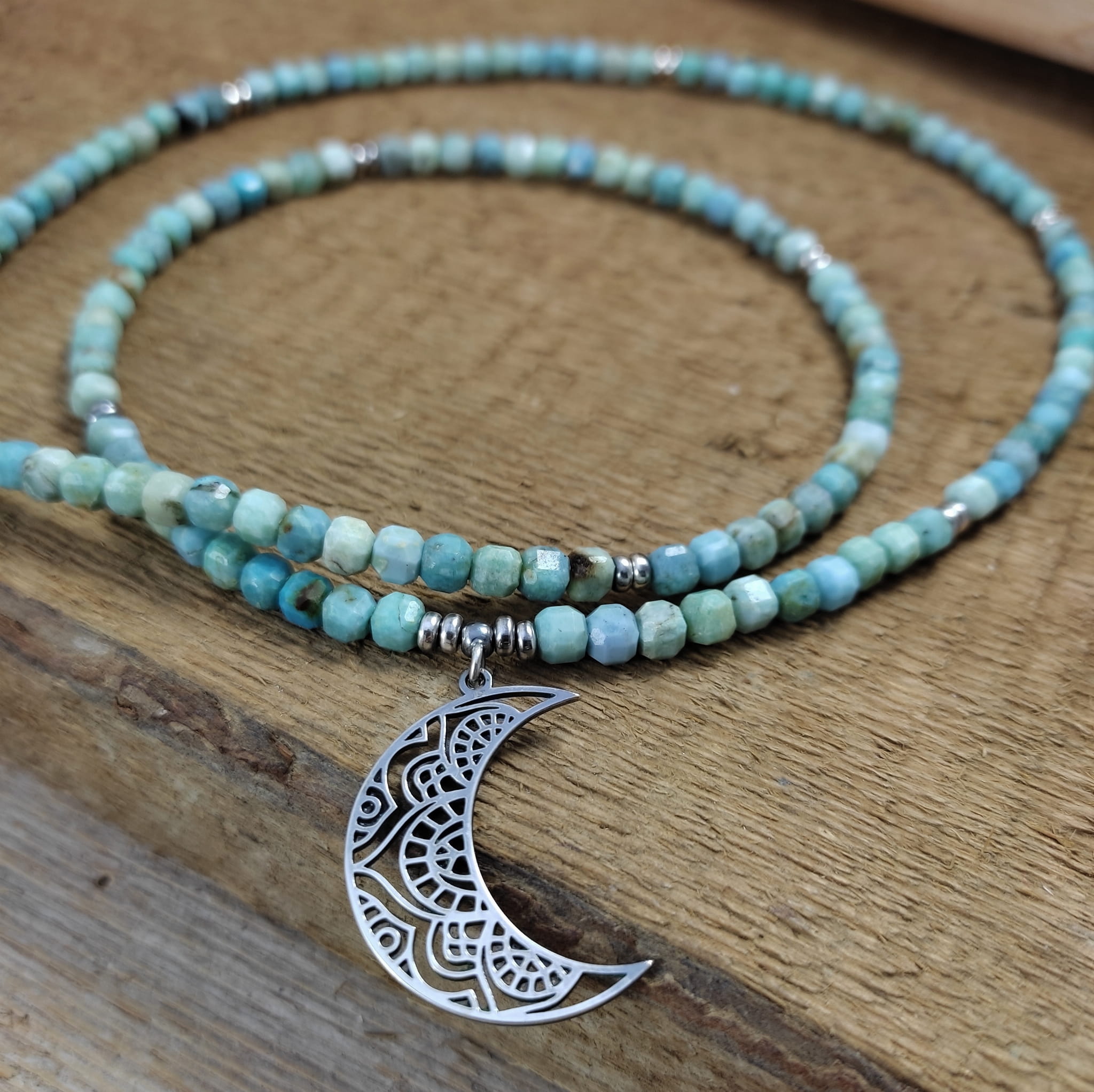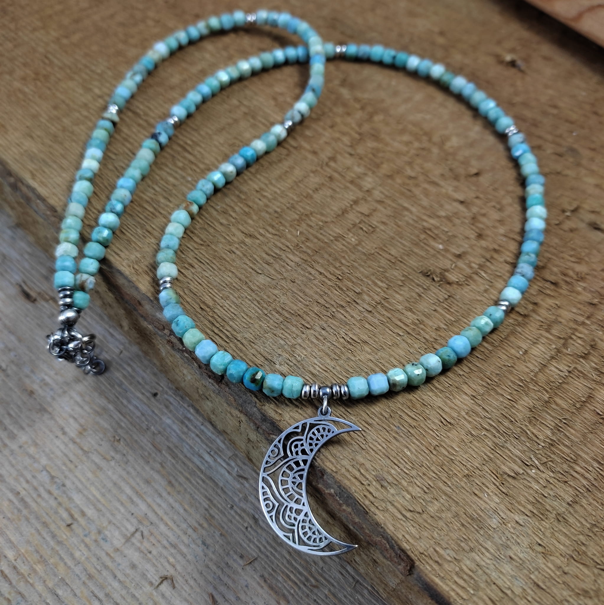 Naszyjnik wykonany z fasetowanych sześcianów turkusu 4 mm. Całość wykończona w srebrze 925, oksydowanym i wypolerowanym. Długość naszyjnika wynosi ok. 63 cm, plus łańcuszek regulacyjny 5 cm. Wielkość księżyca 27,5/19,5/0,8 mm. Elegancko zapakowany. Kamienie posiadają delikatne niedoskonałości.