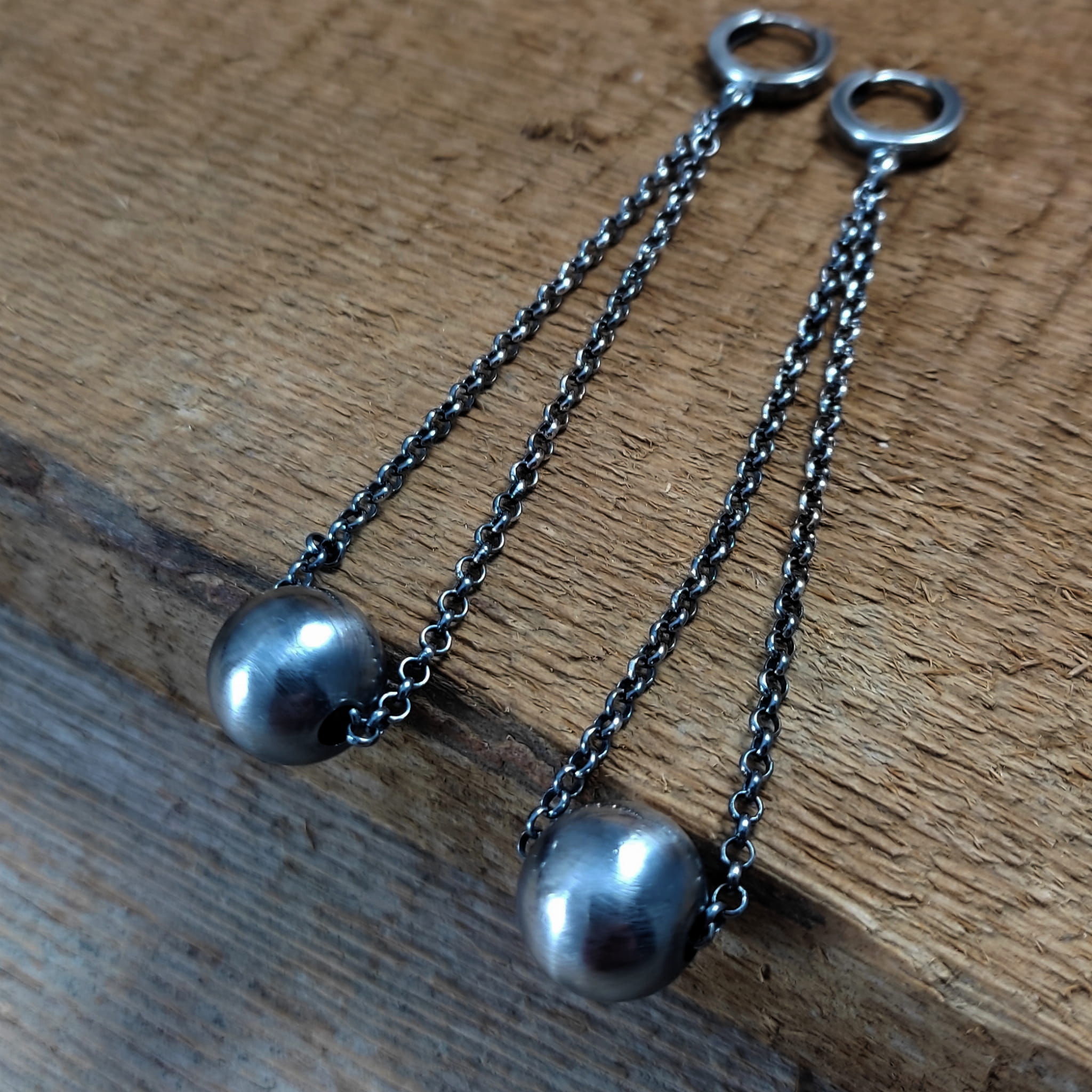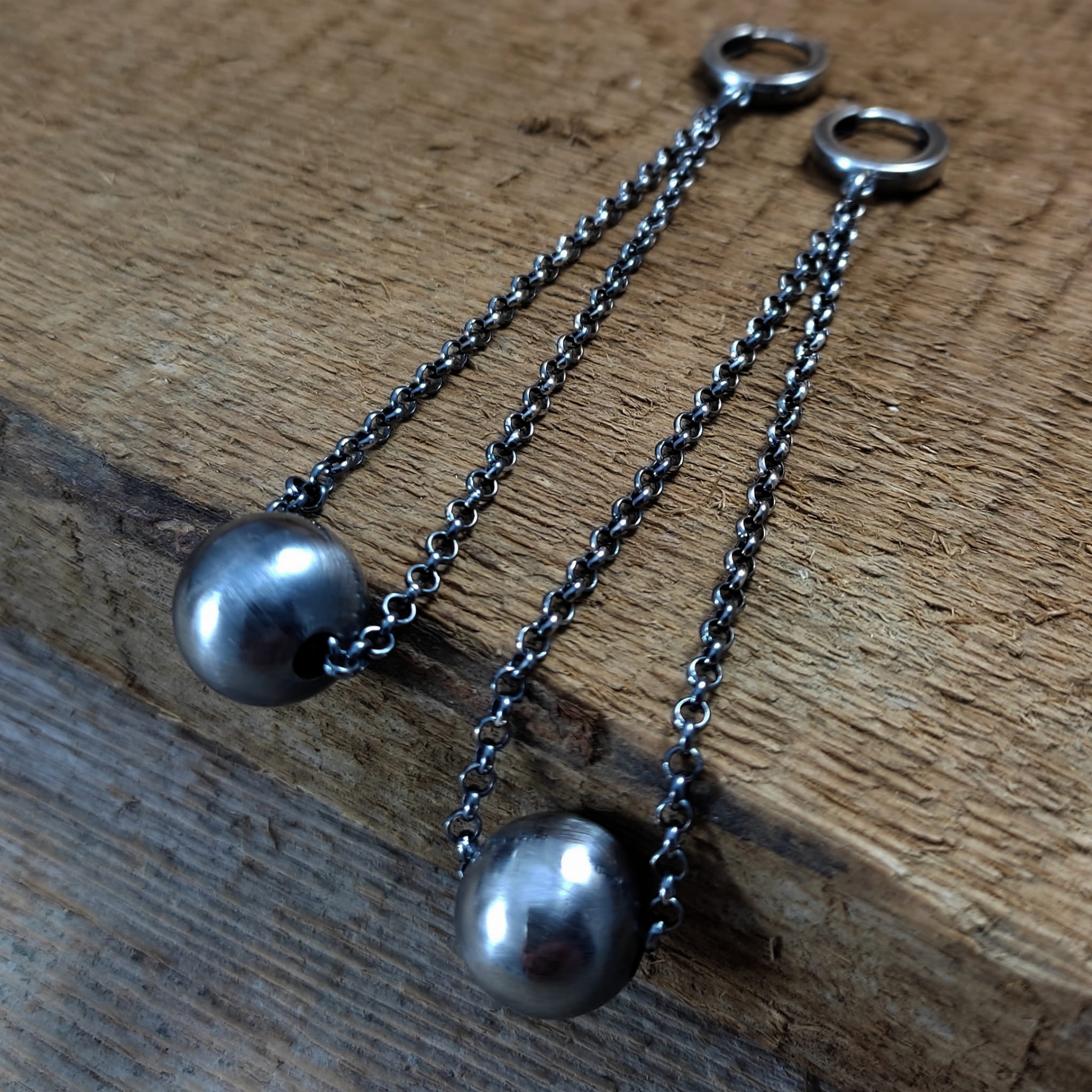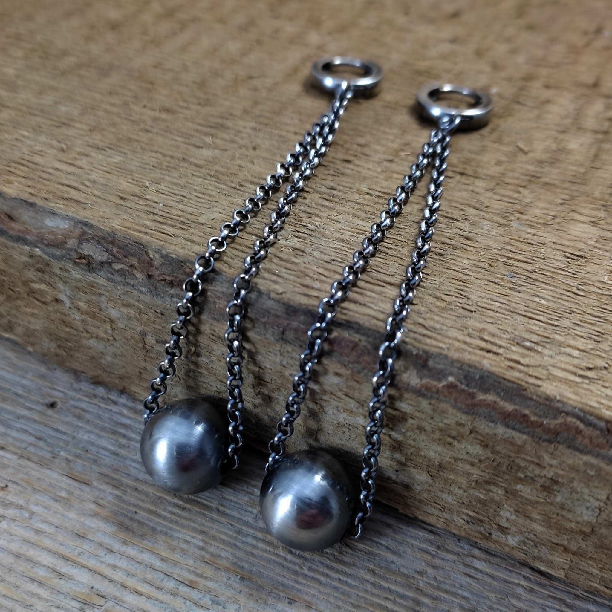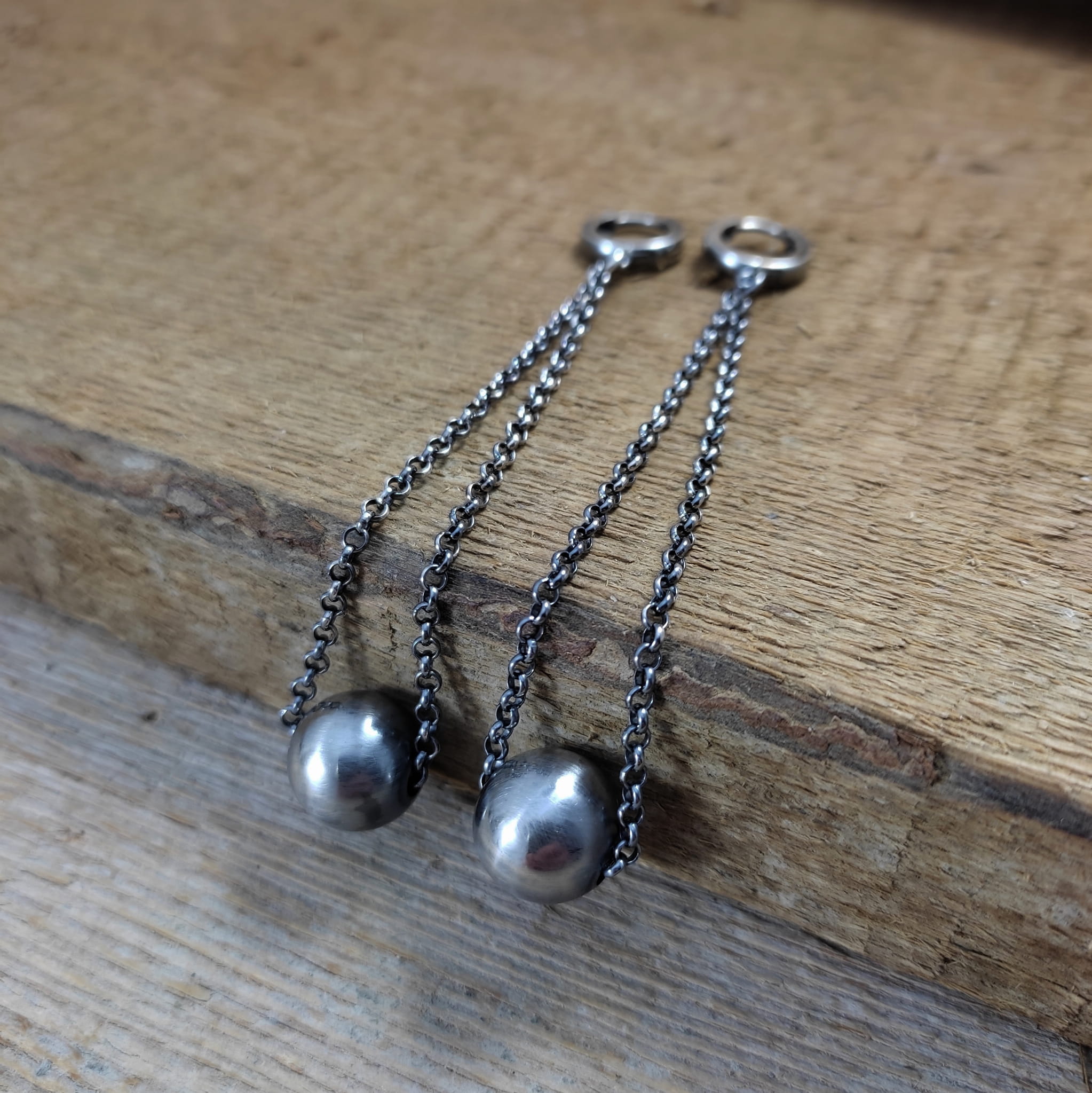 Kolczyki wykonane ze srebra 925, oksydowanego i wypolerowanego. Wielkość ozdobnej kuli ok 12 mm (lekka). Całkowita długość kolczyków wynosi ok. 9 cm. Elegancko zapakowane.