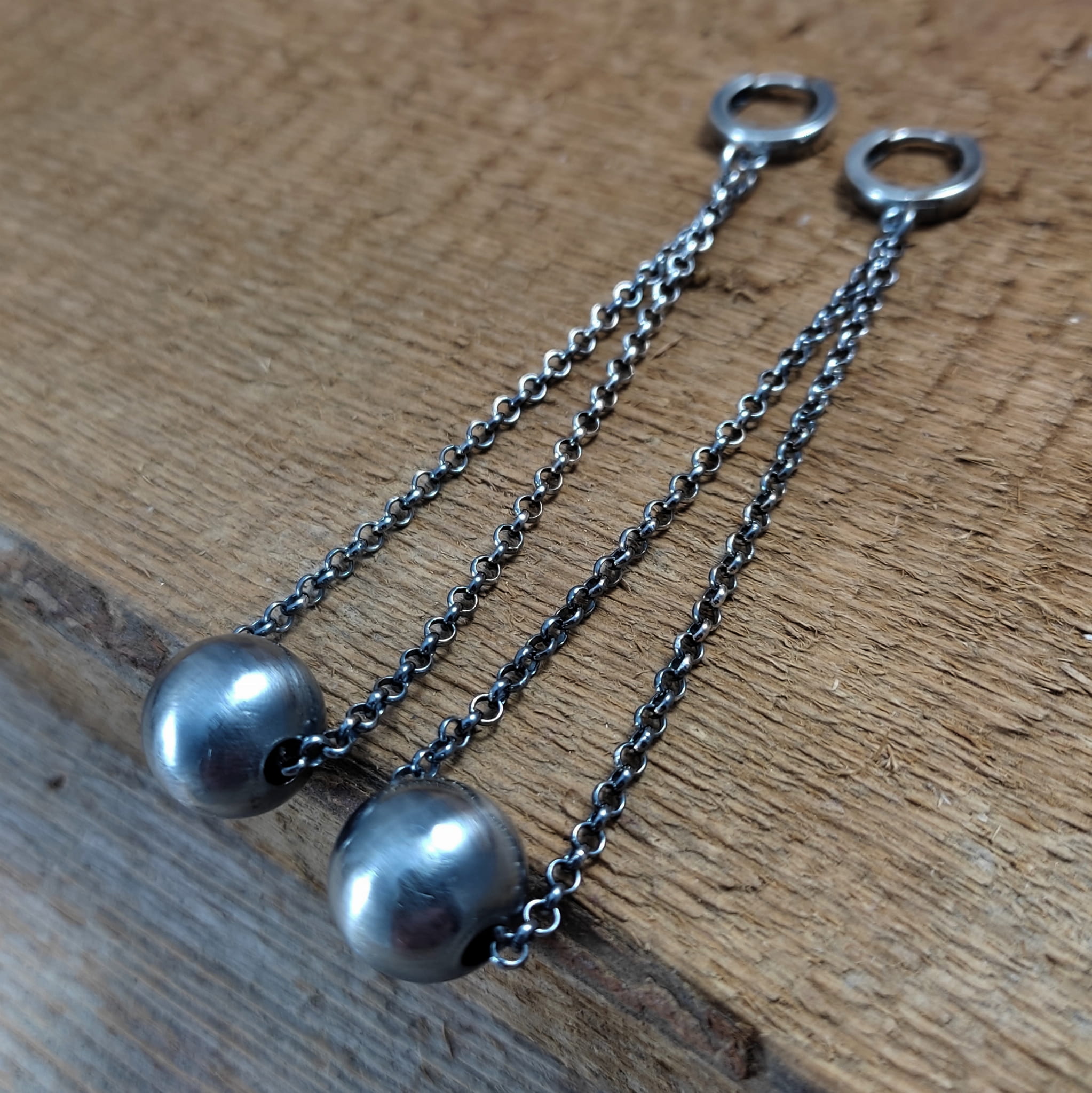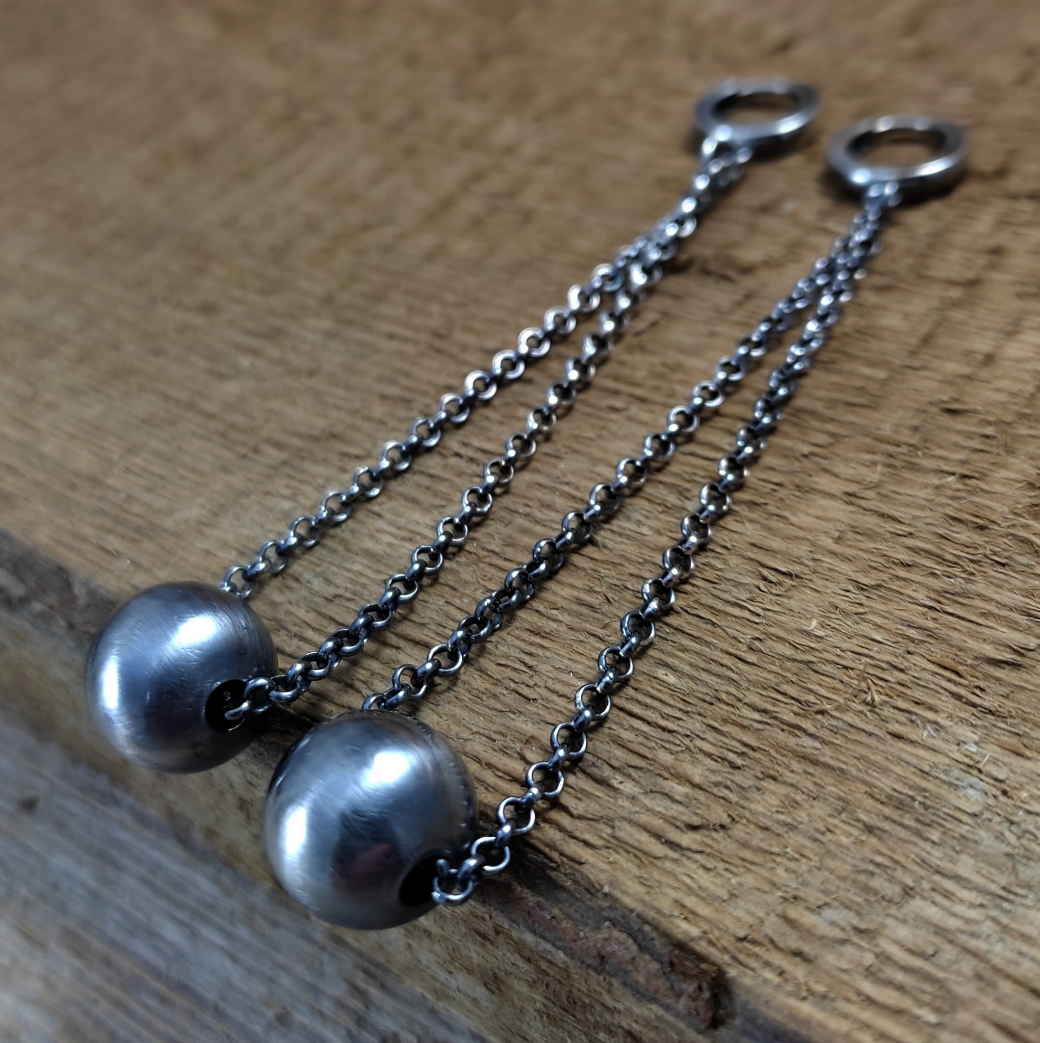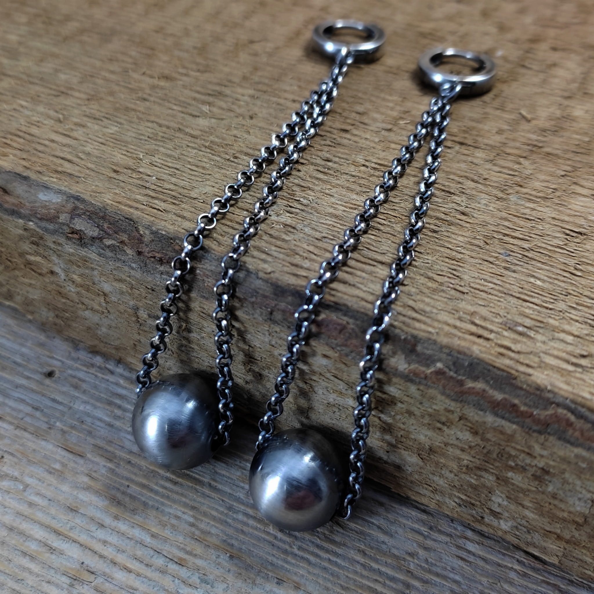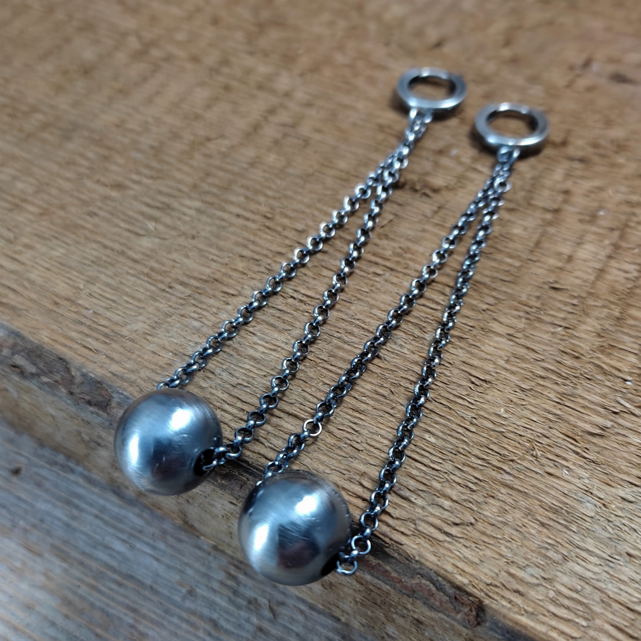 Kolczyki wykonane ze srebra 925, oksydowanego i wypolerowanego. Wielkość ozdobnej kuli ok 12 mm (lekka). Całkowita długość kolczyków wynosi ok. 9 cm. Elegancko zapakowane.