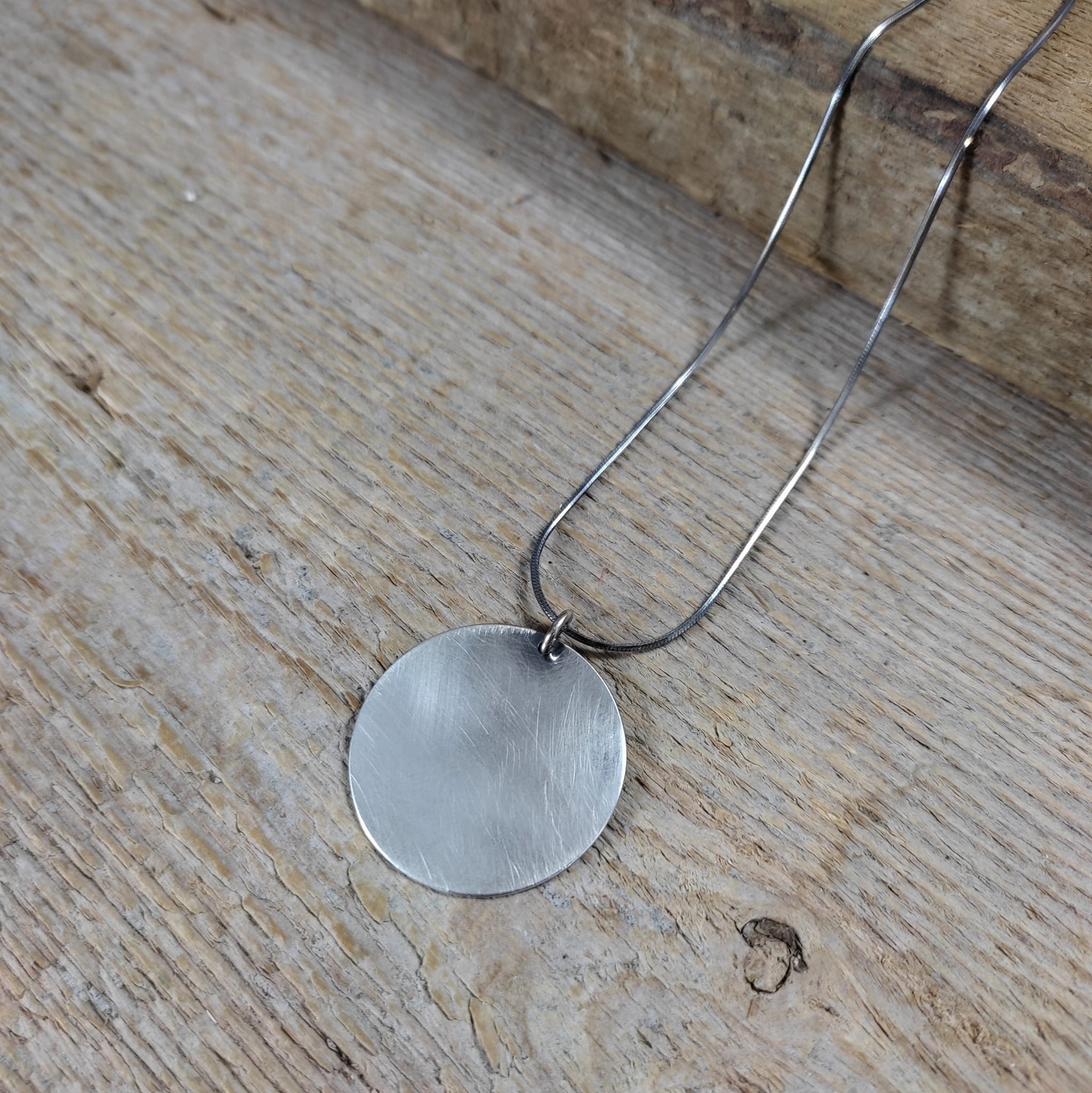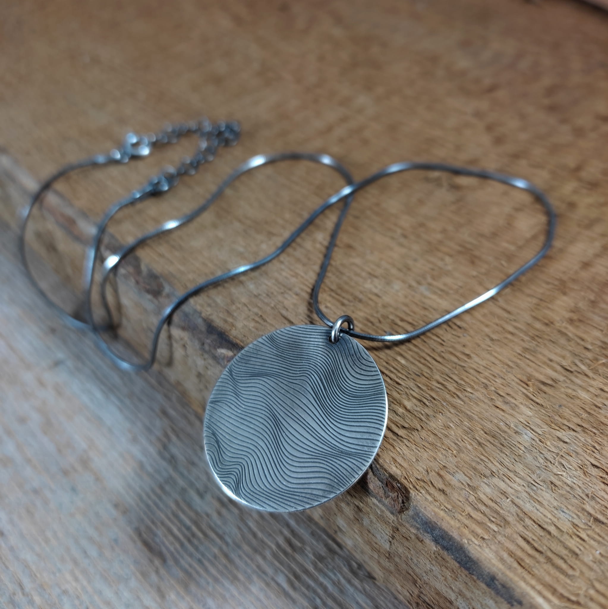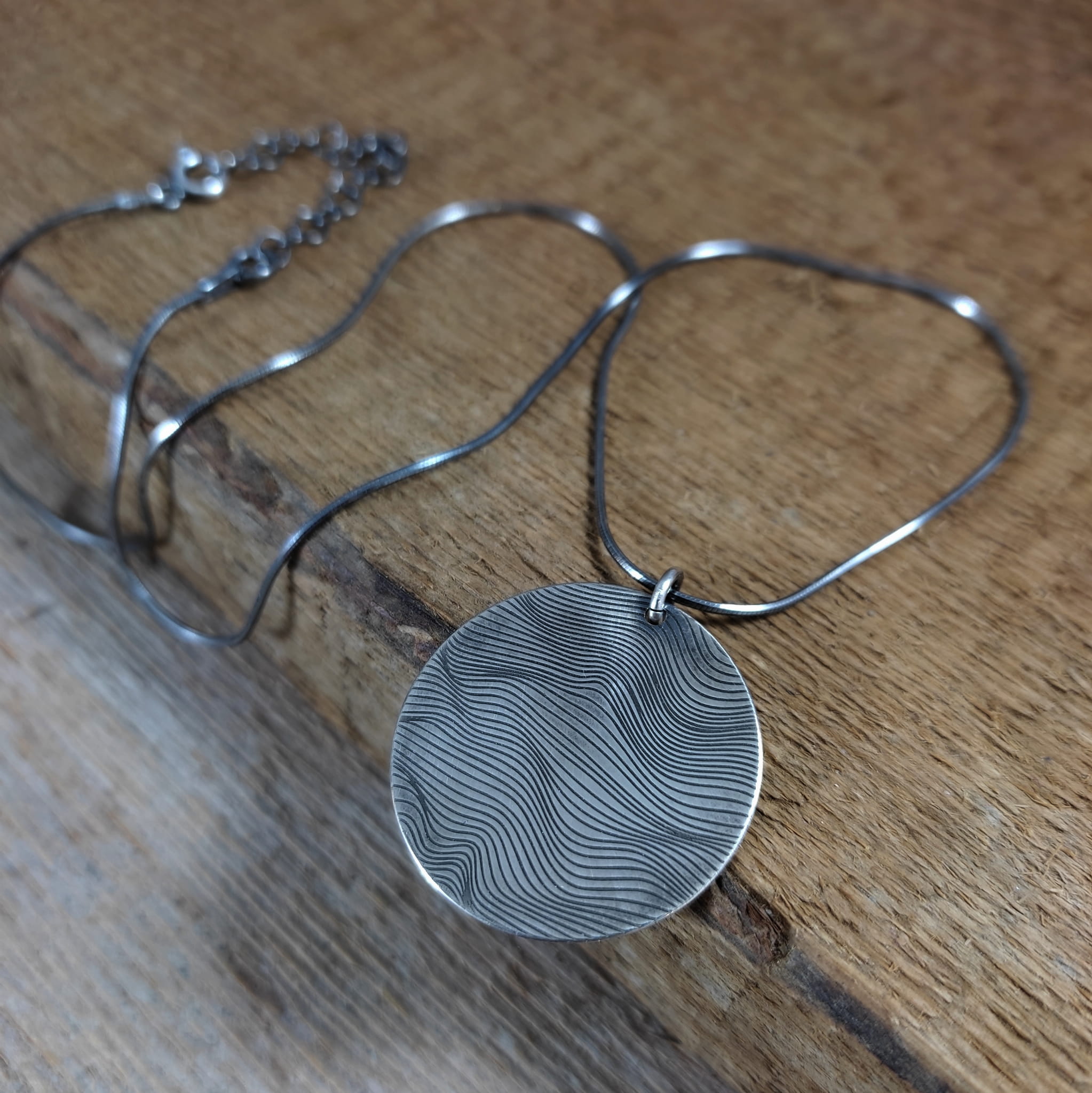Naszyjnik/wisiorek wykonany ze srebra 925, oksydowanego i wypolerowanego. Długość naszyjnika wynosi ok. 40 cm, plus łańcuszek regulacyjny 5 cm. Wielkość zawieszki/blaszki 25.9 mm. Elegancko zapakowany.