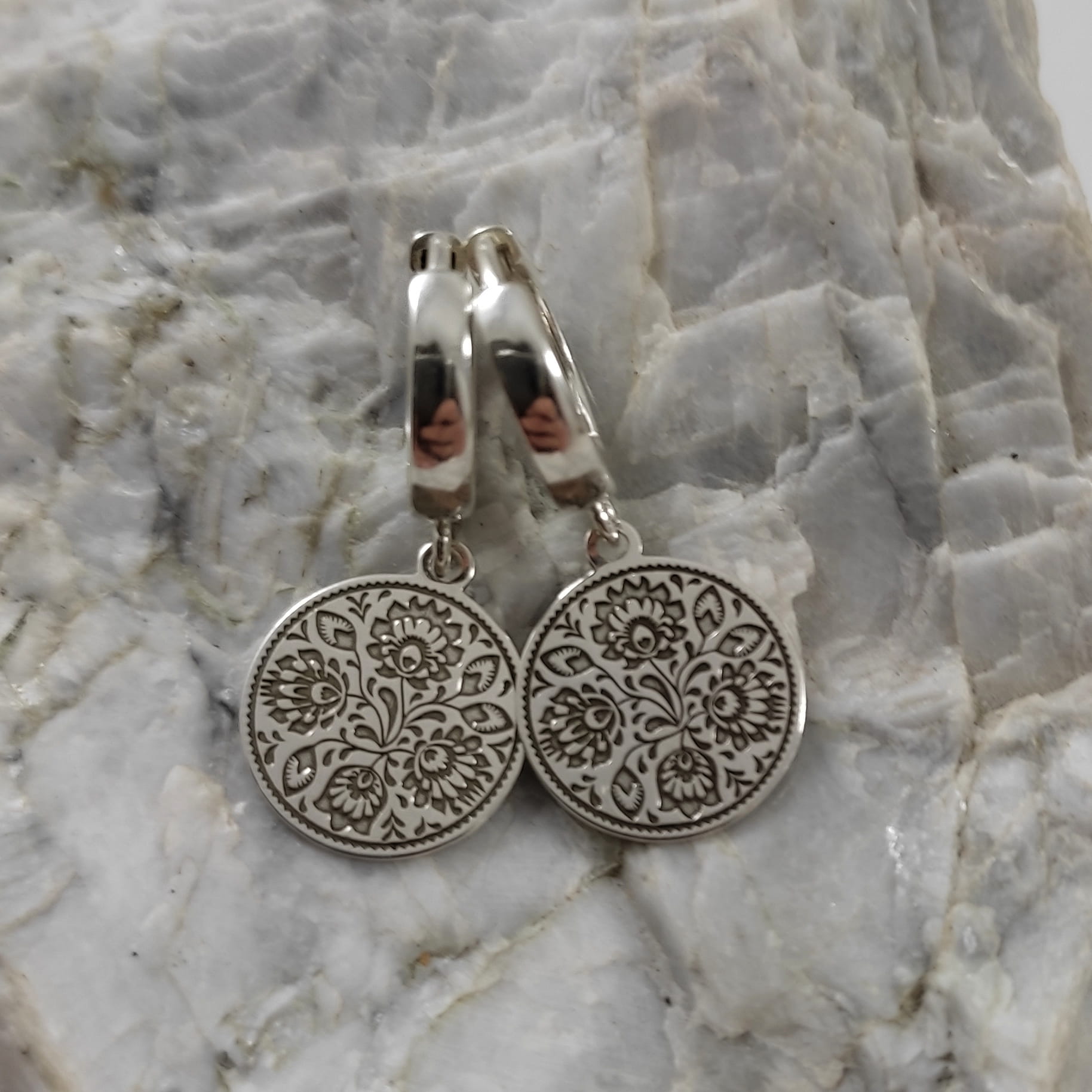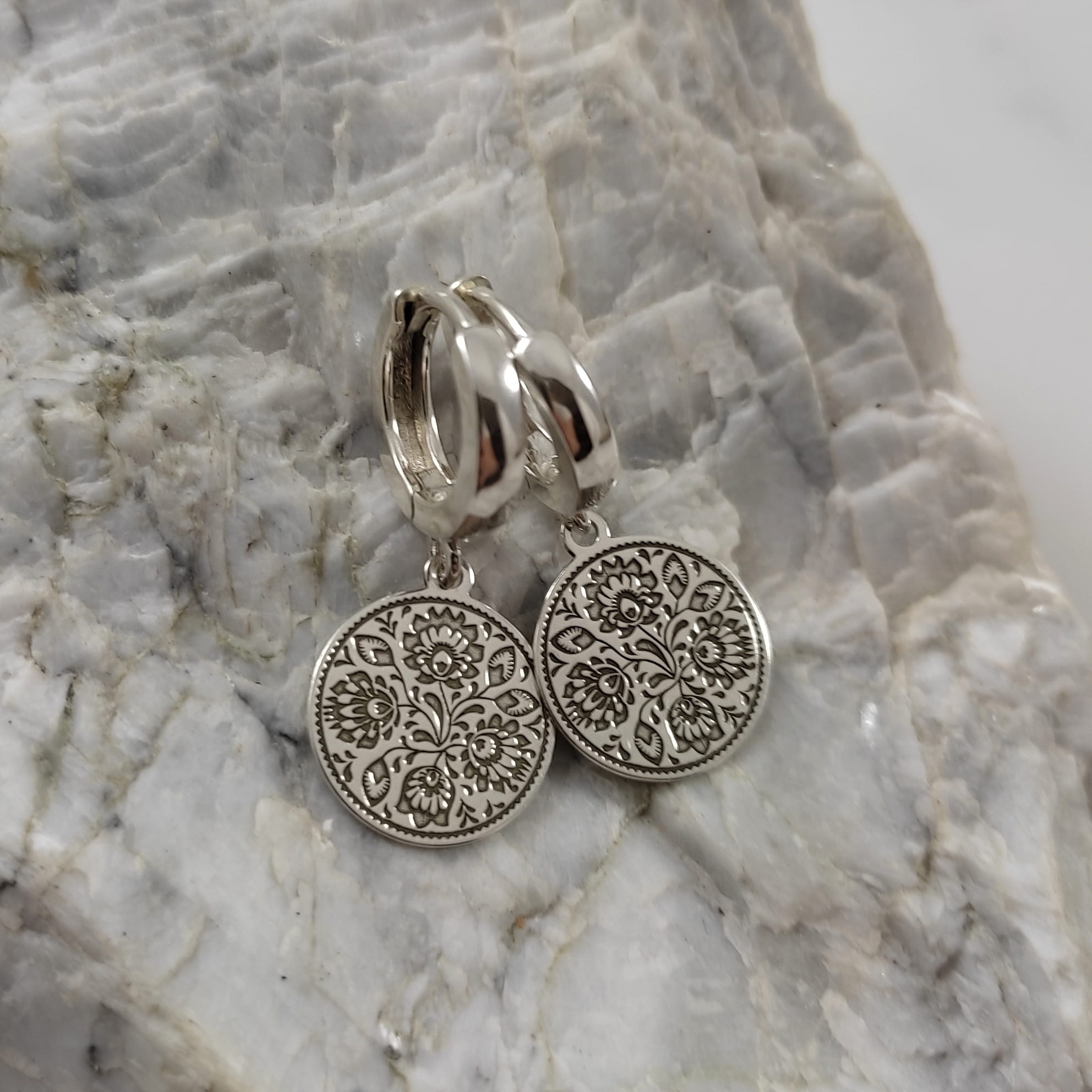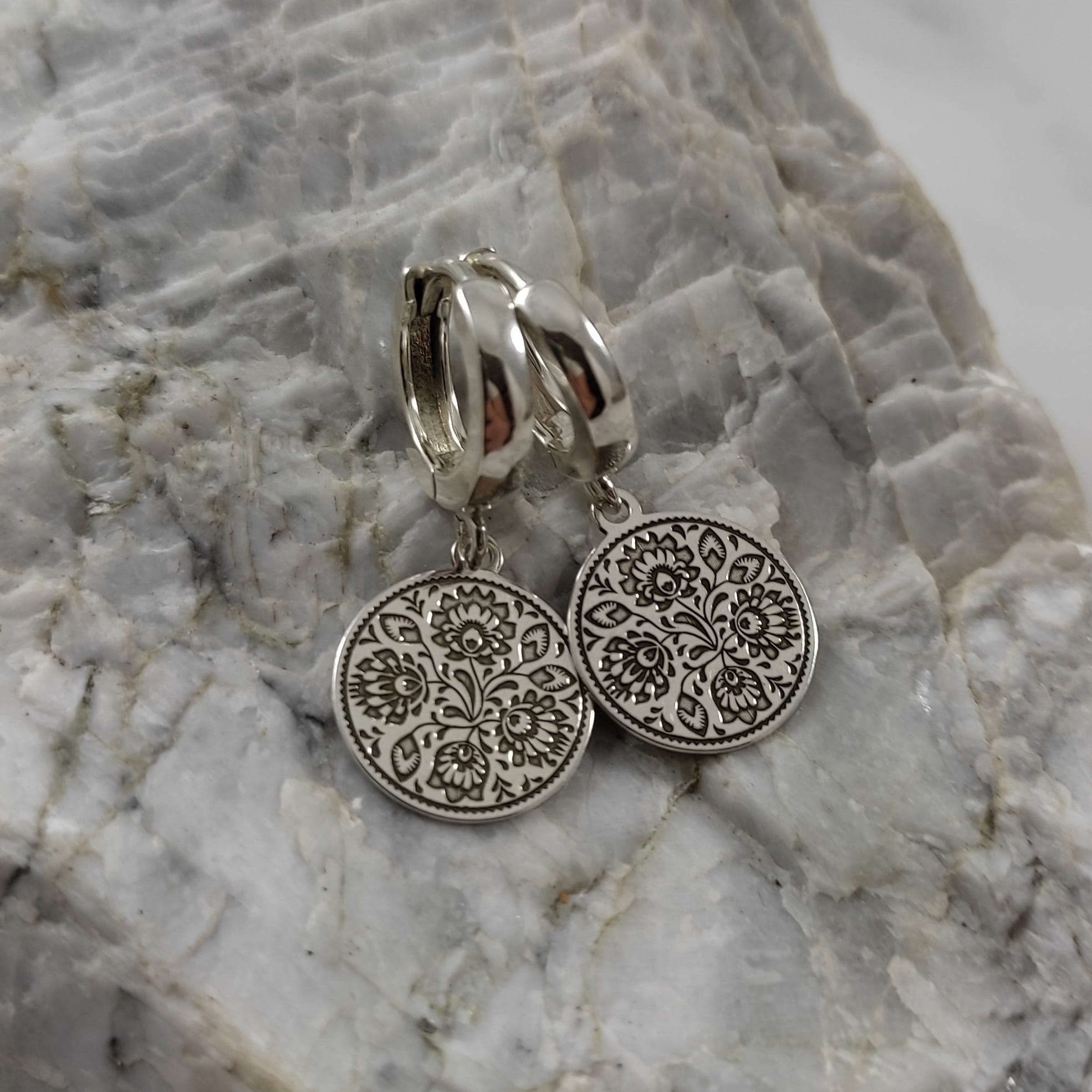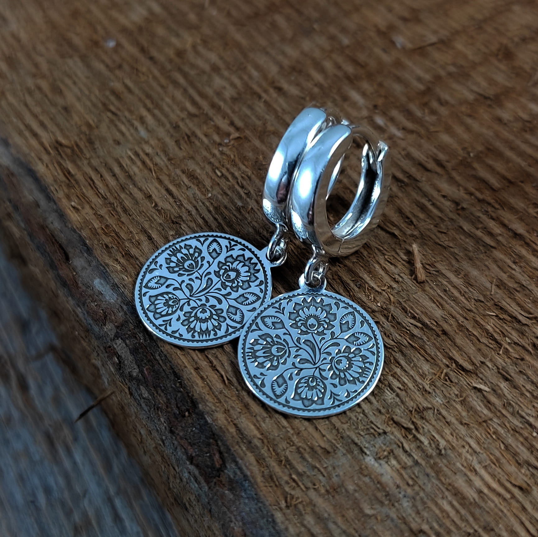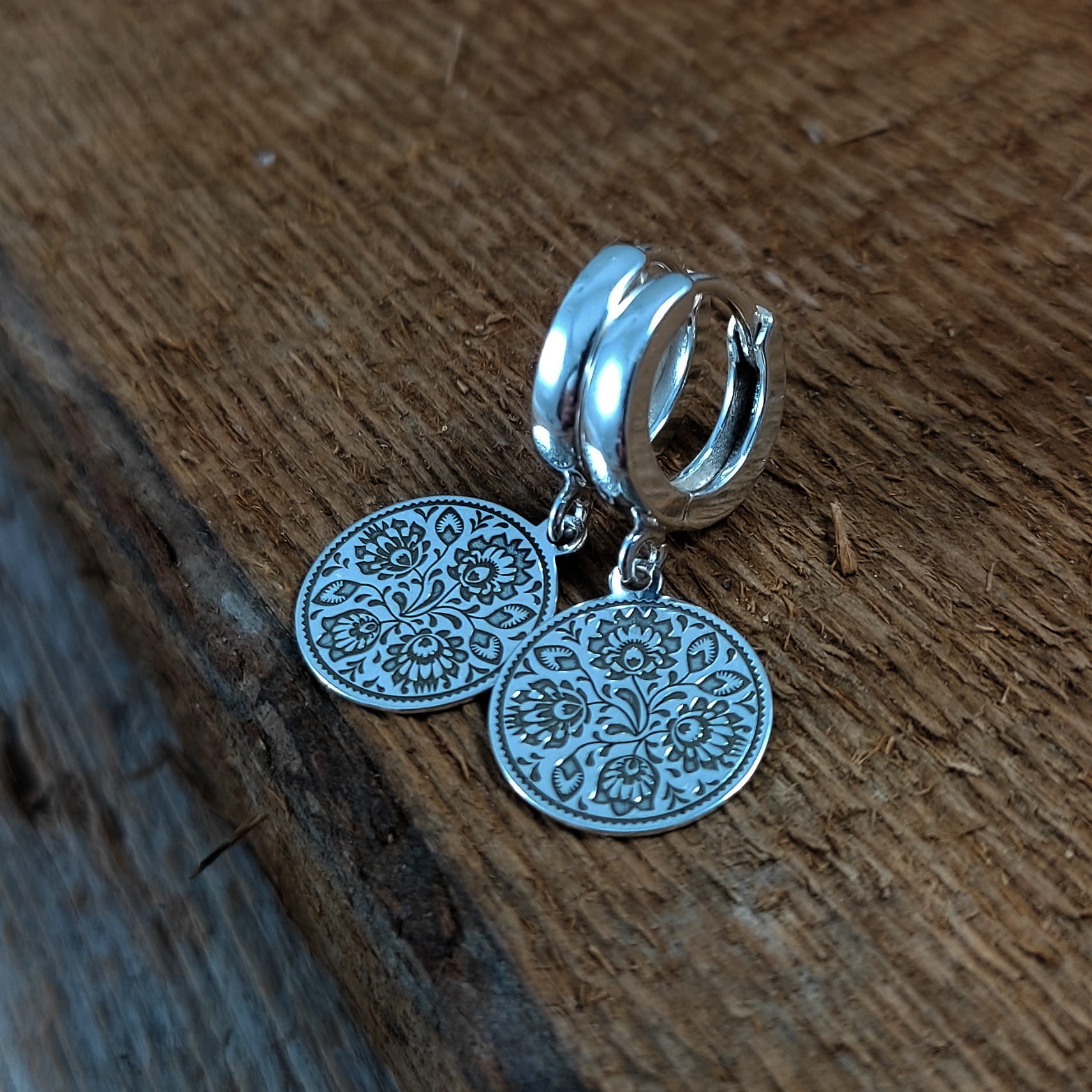 Kolczyki wykonane ze srebra 925. Wielkość blaszki z folkowym akcentem: 12 mm. Bigle typu kajdanki. Całkowita długość kolczyków wynosi ok. 27 mm. Elegancko zapakowane.
