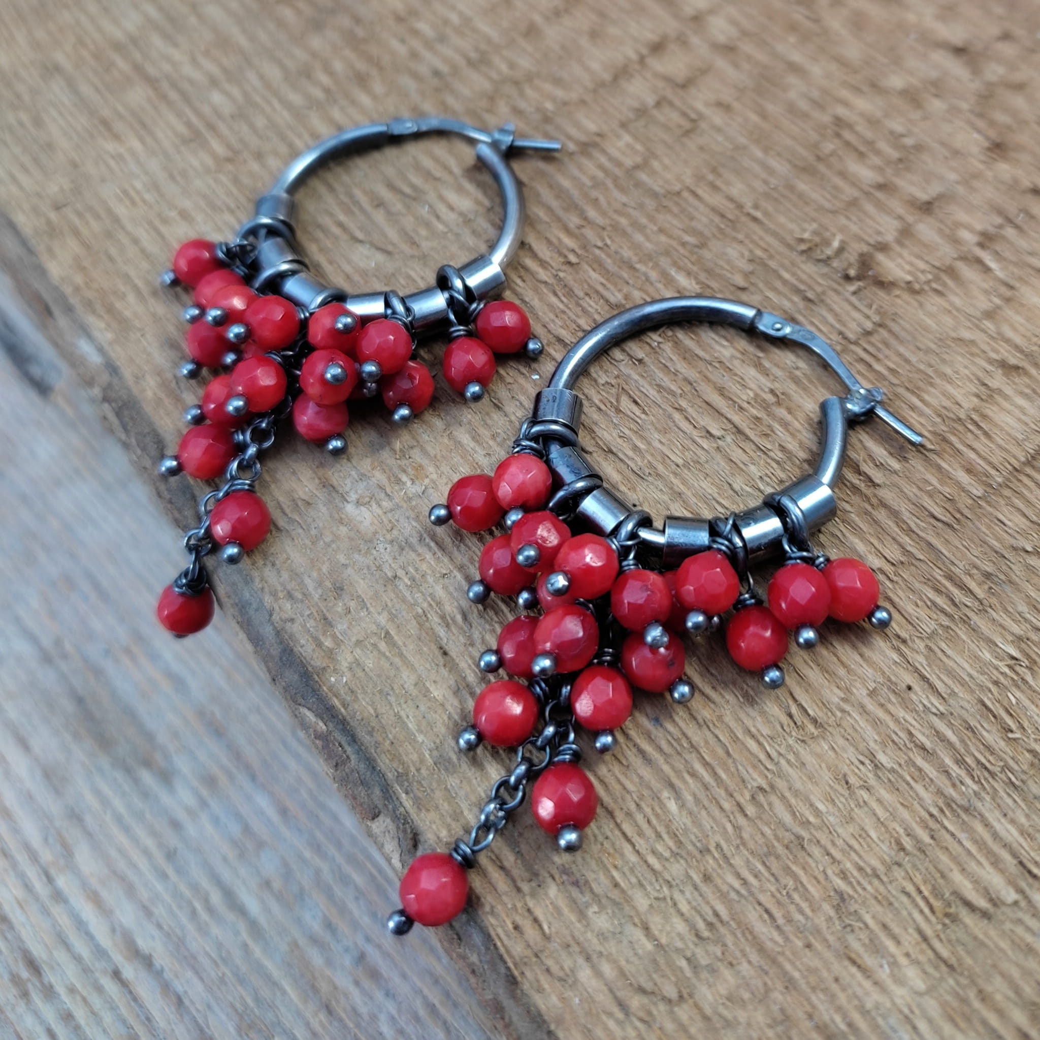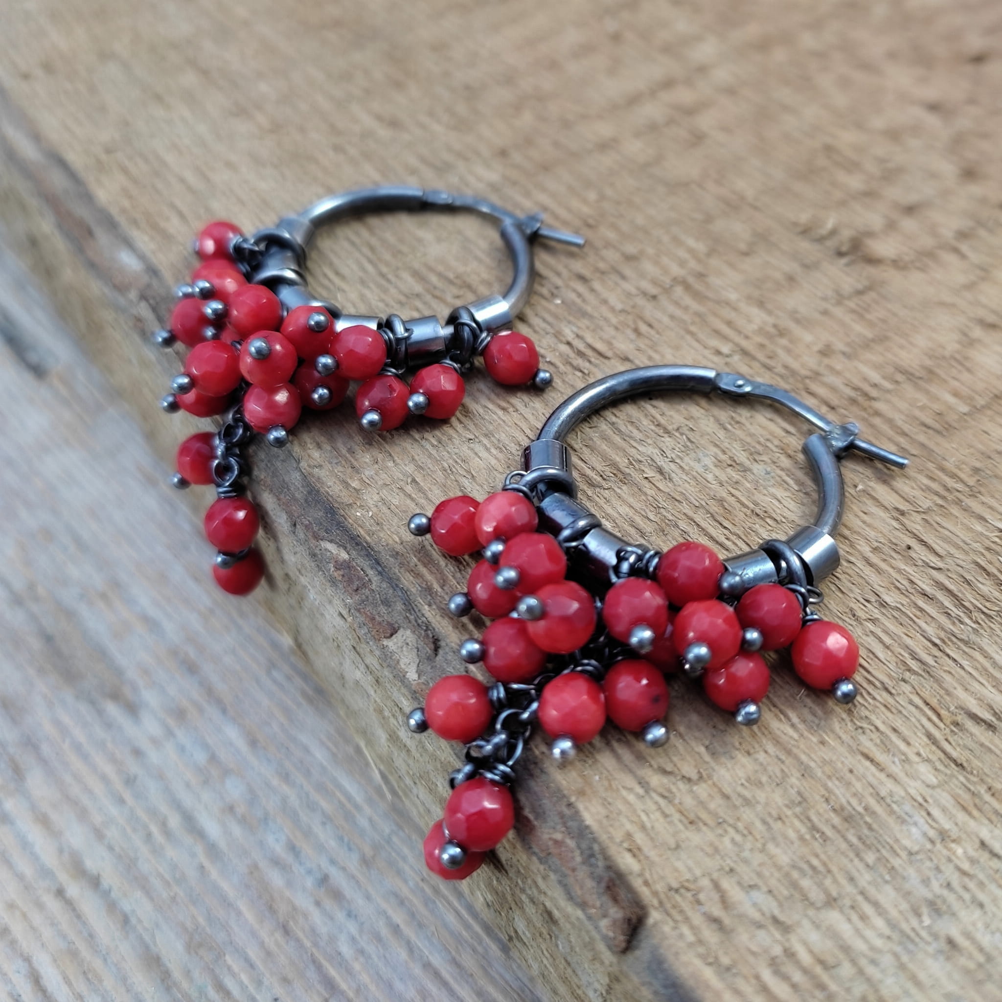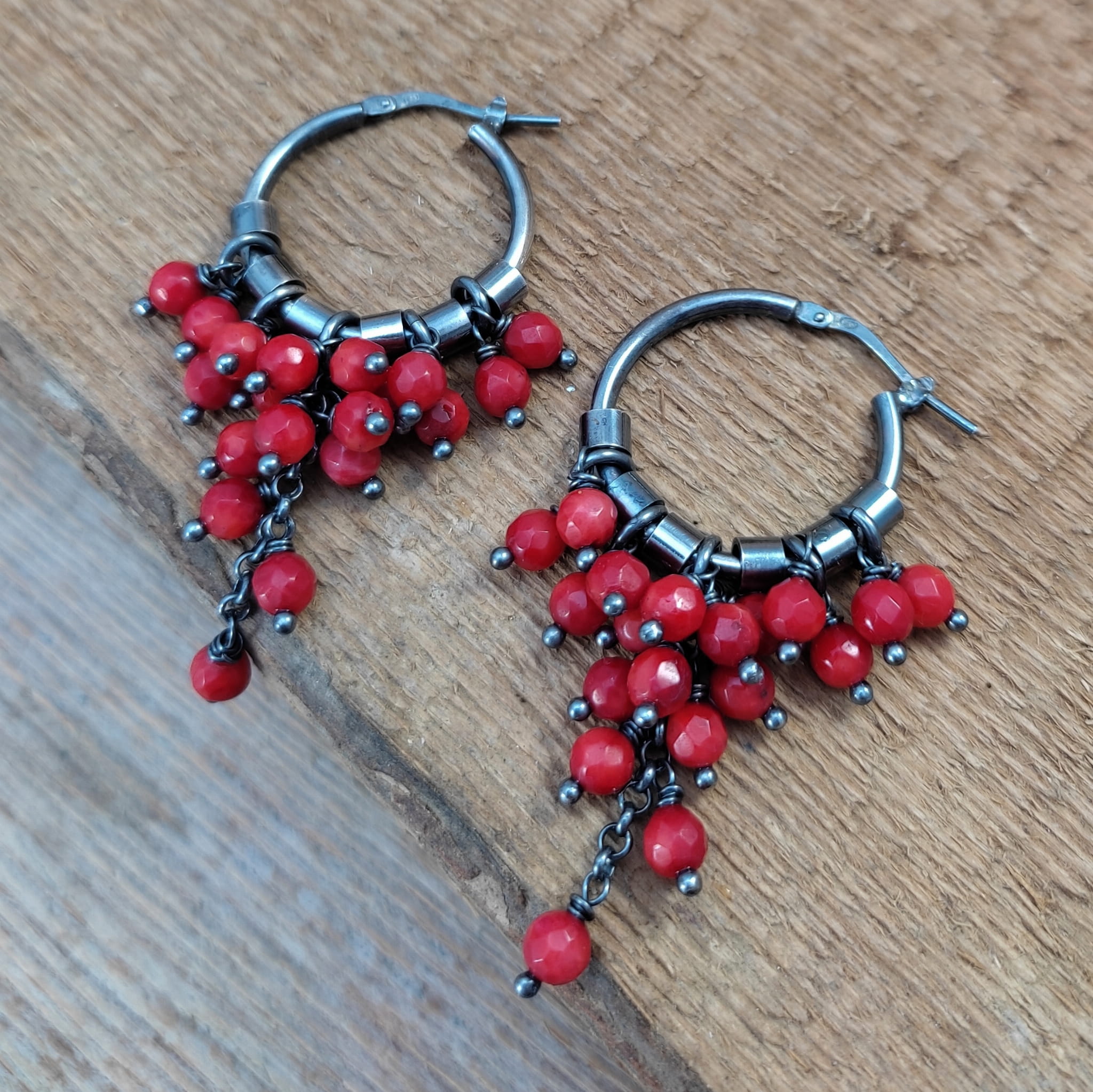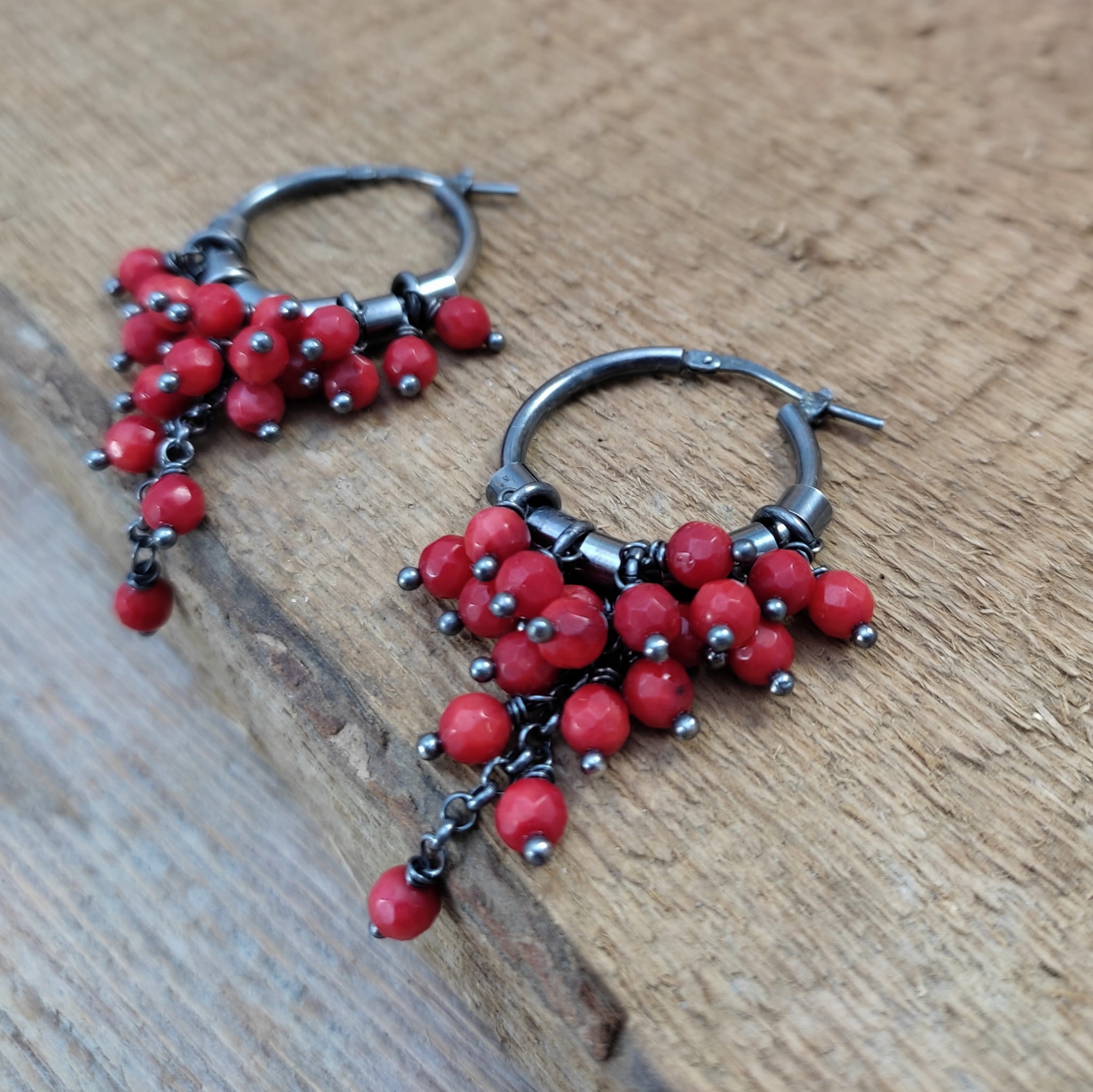 Kolczyki z kulami fasetowanego korala. Fasetowany koral o średnicy 4 mm. Kamienie posiadają niedoskonałości. Długość całkowita kolczyków wynosi ok. 53 mm. Kolczyki zostały wykonane w całości ze srebra 925, srebro oksydowane. Zapakowane w eleganckie pudełko.